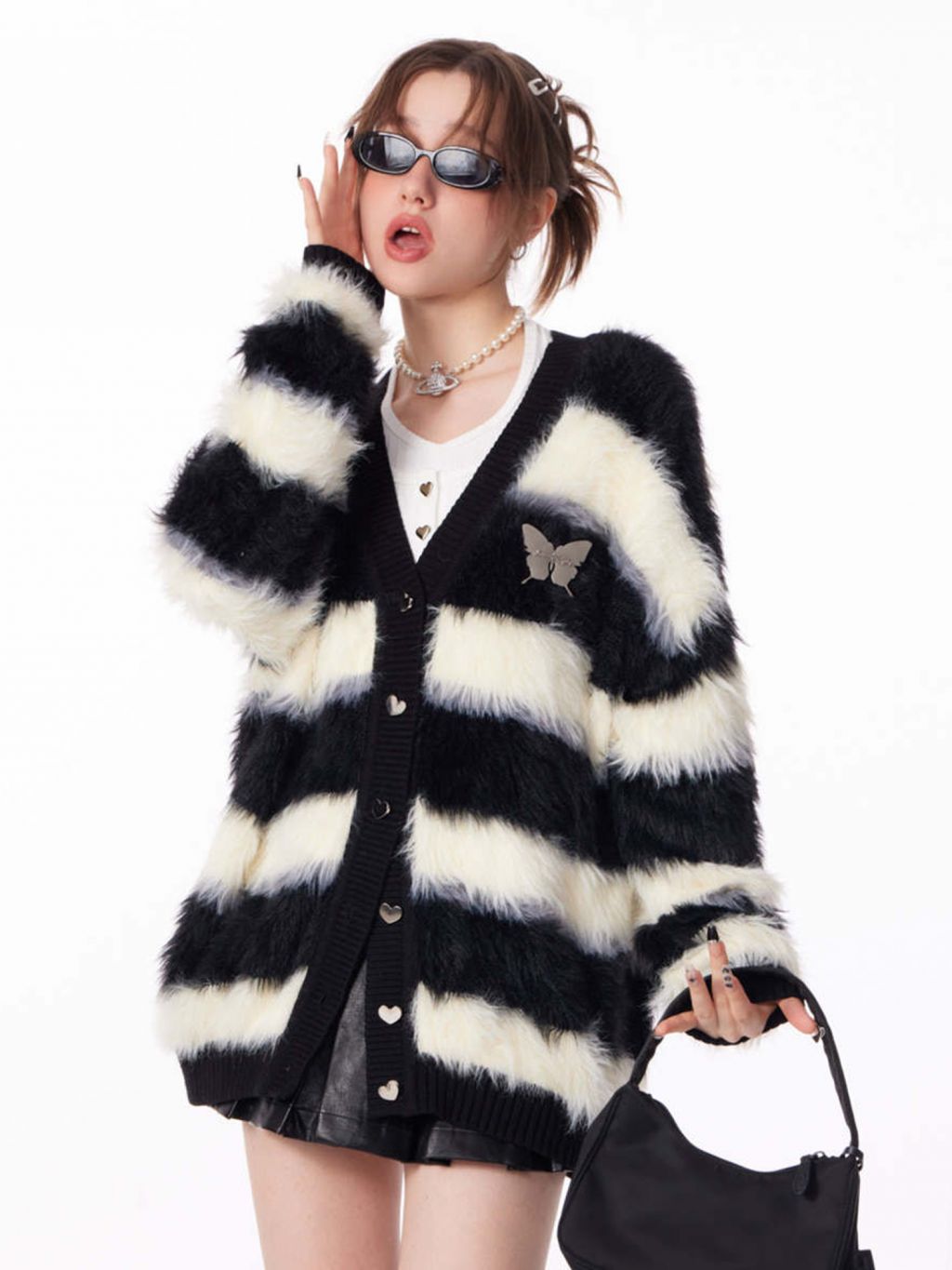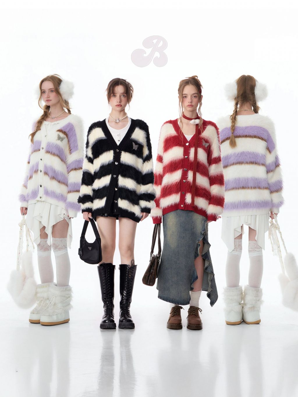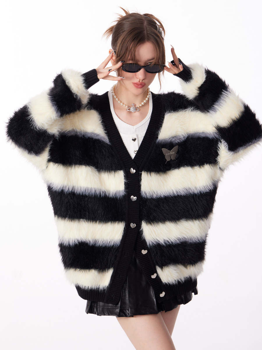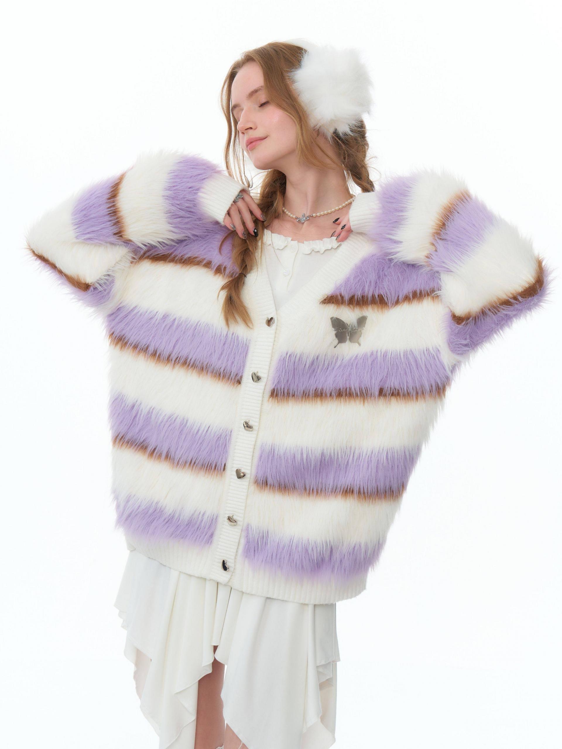 포근한 퍼 텍스처와 스트라이프 패턴이 어우러져, 러블리하면서도 빈티지한 무드를 완성하는 가디건입니다.