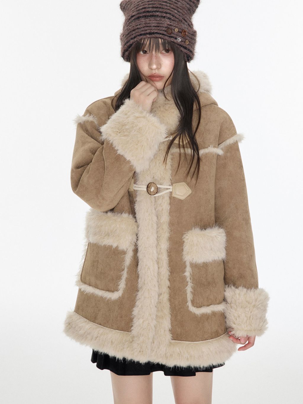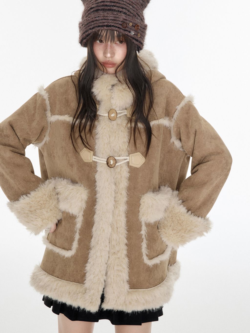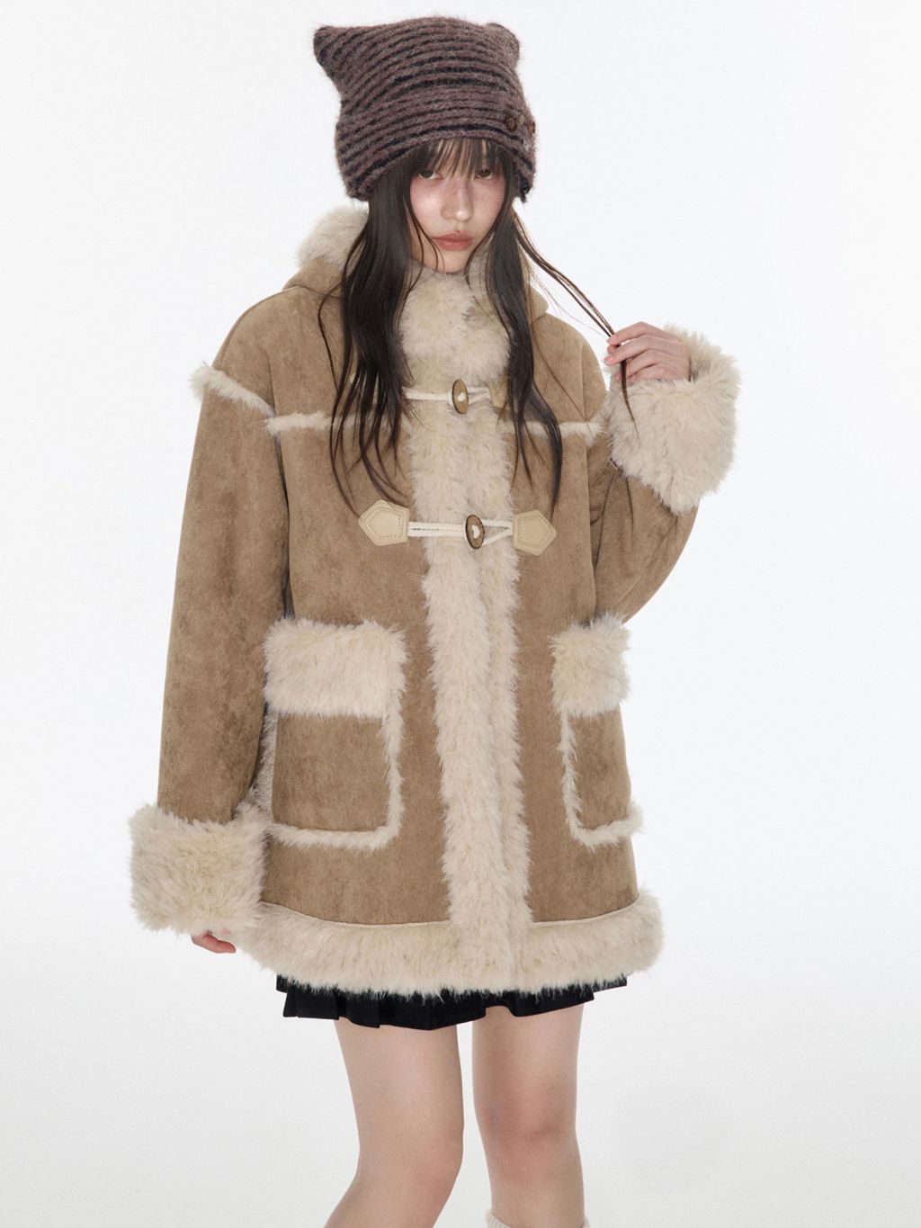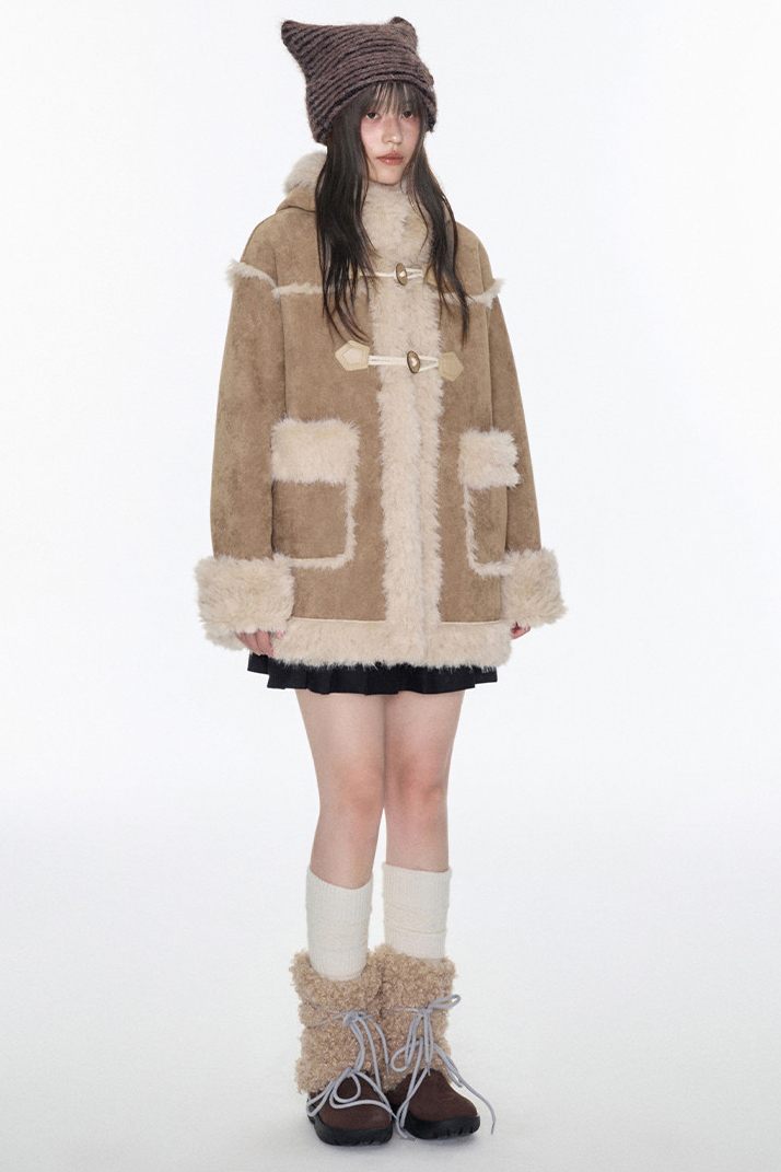 부드러운 테디 퍼 텍스처와 토글 디테일을 더해 겨울 무드의 포근함과 빈티지 감성을 동시에 담아낸 미드 기장의 시어링 코트입니다.