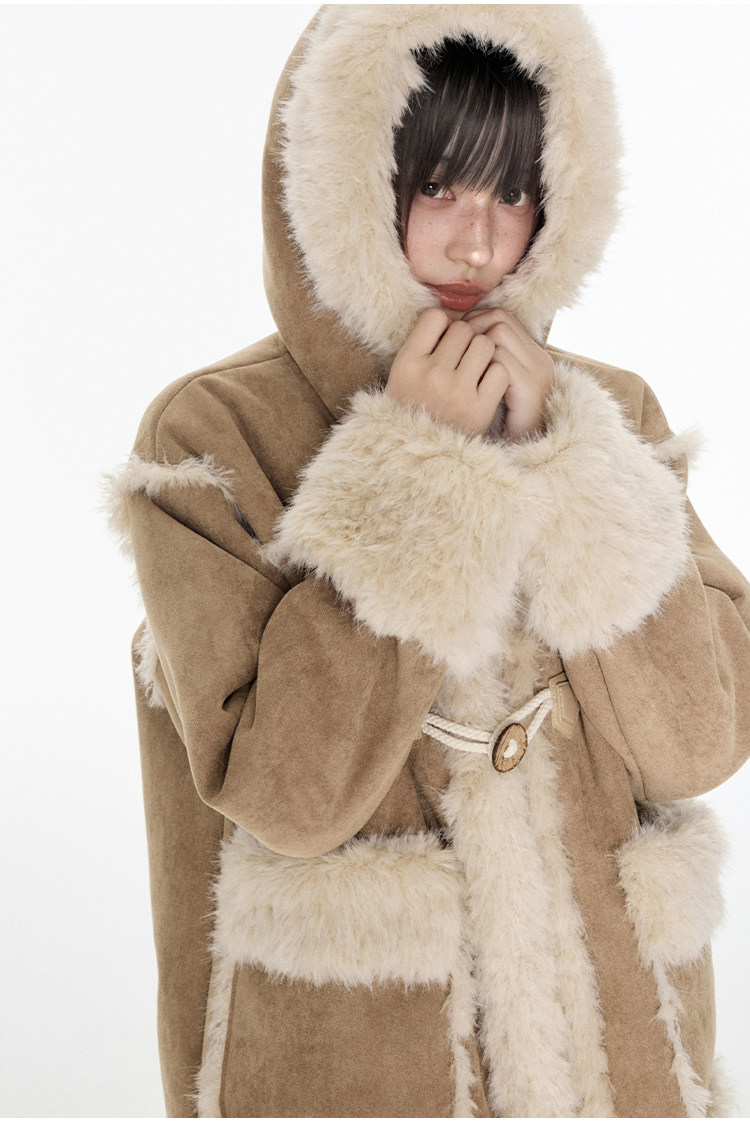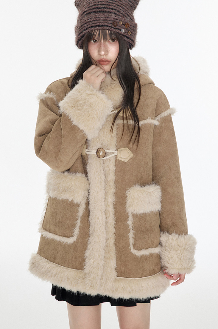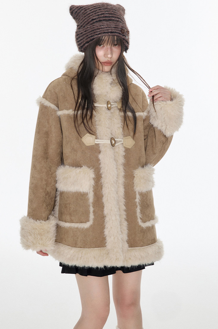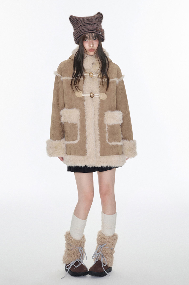부드러운 테디 퍼 텍스처와 토글 디테일을 더해 겨울 무드의 포근함과 빈티지 감성을 동시에 담아낸 미드 기장의 시어링 코트입니다.