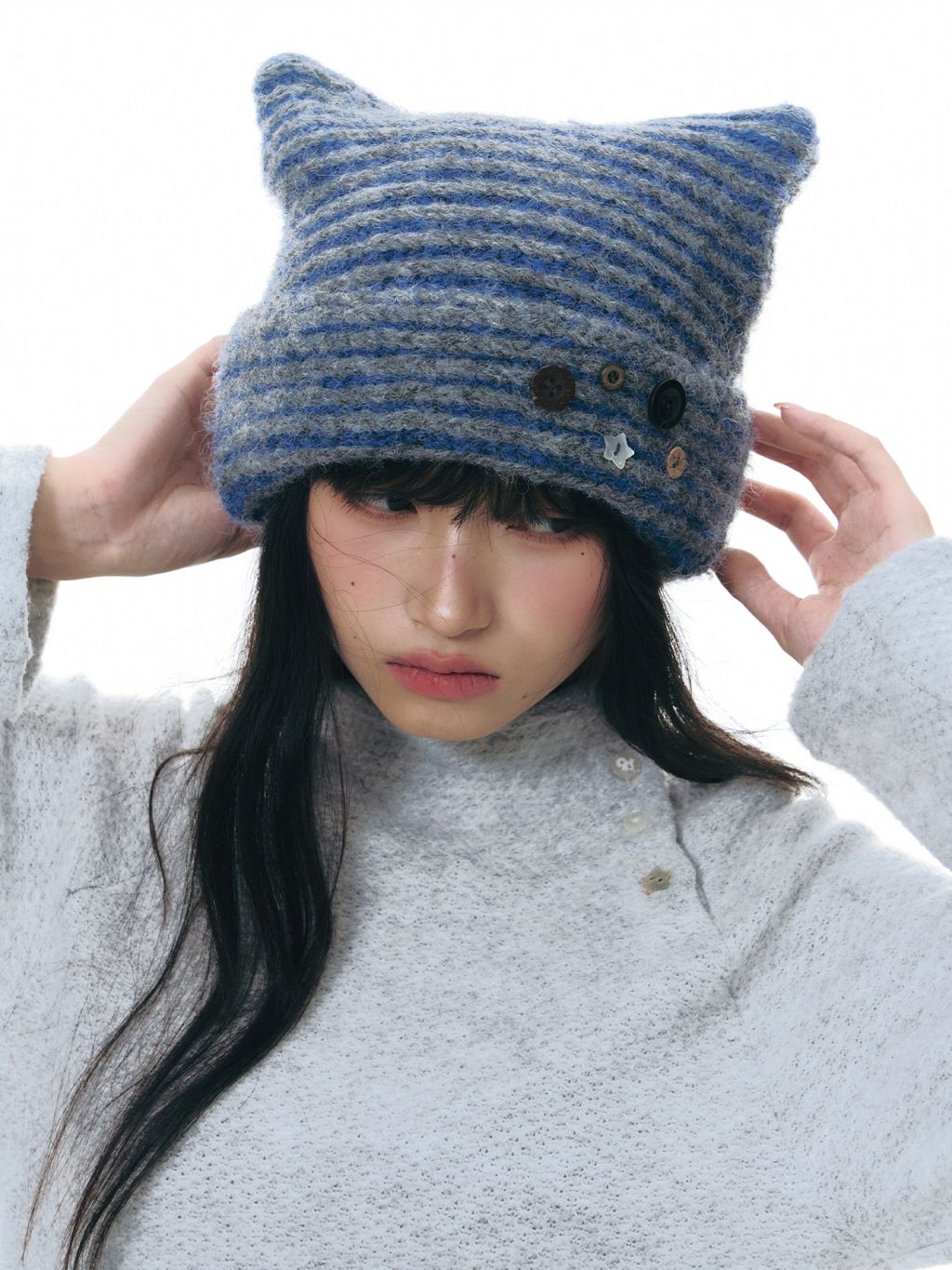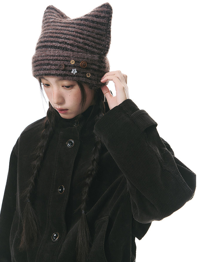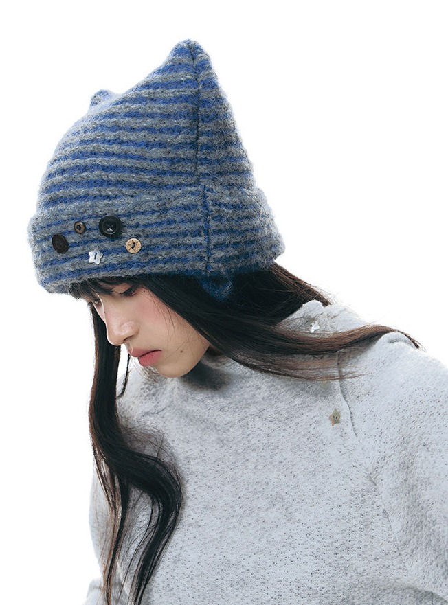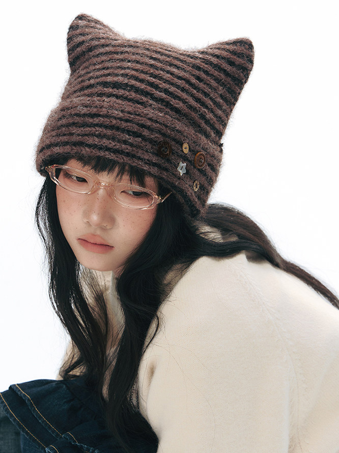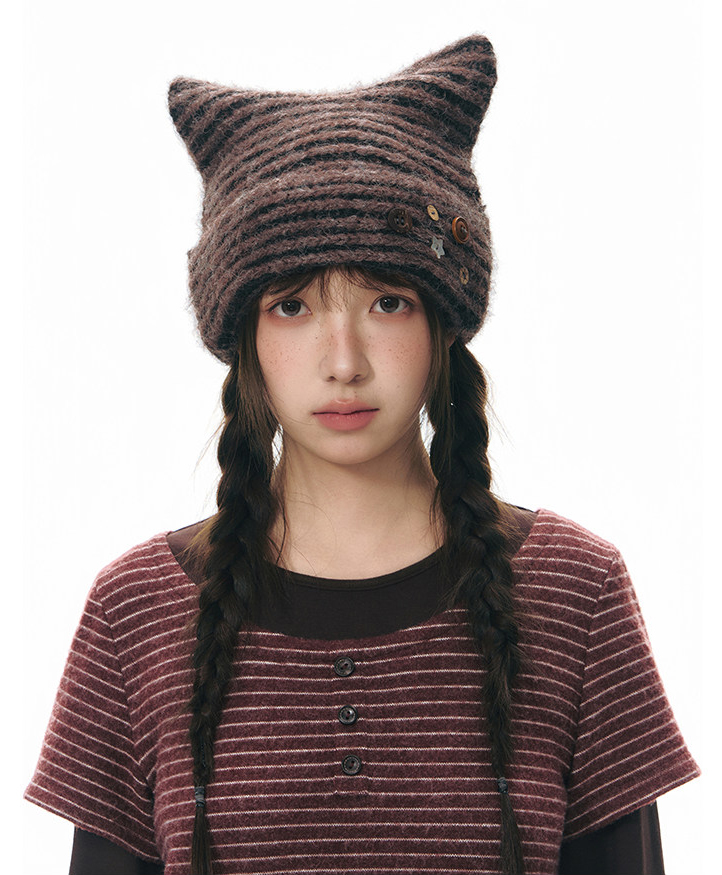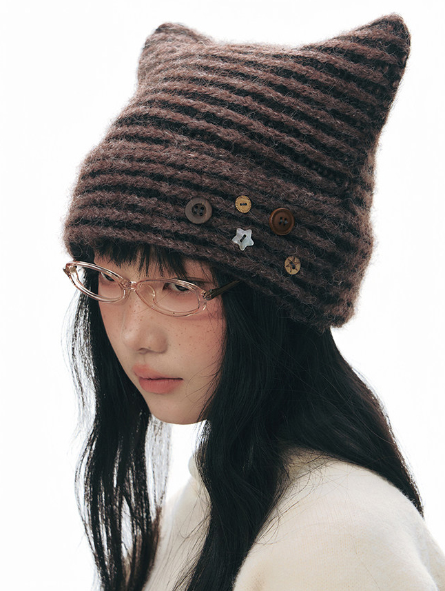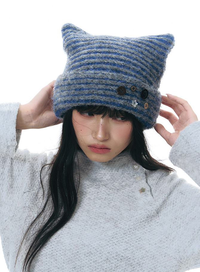 고양이 귀 실루엣과 버튼 디테일로 위트를 더한 스트라이프 니트 비니입니다.