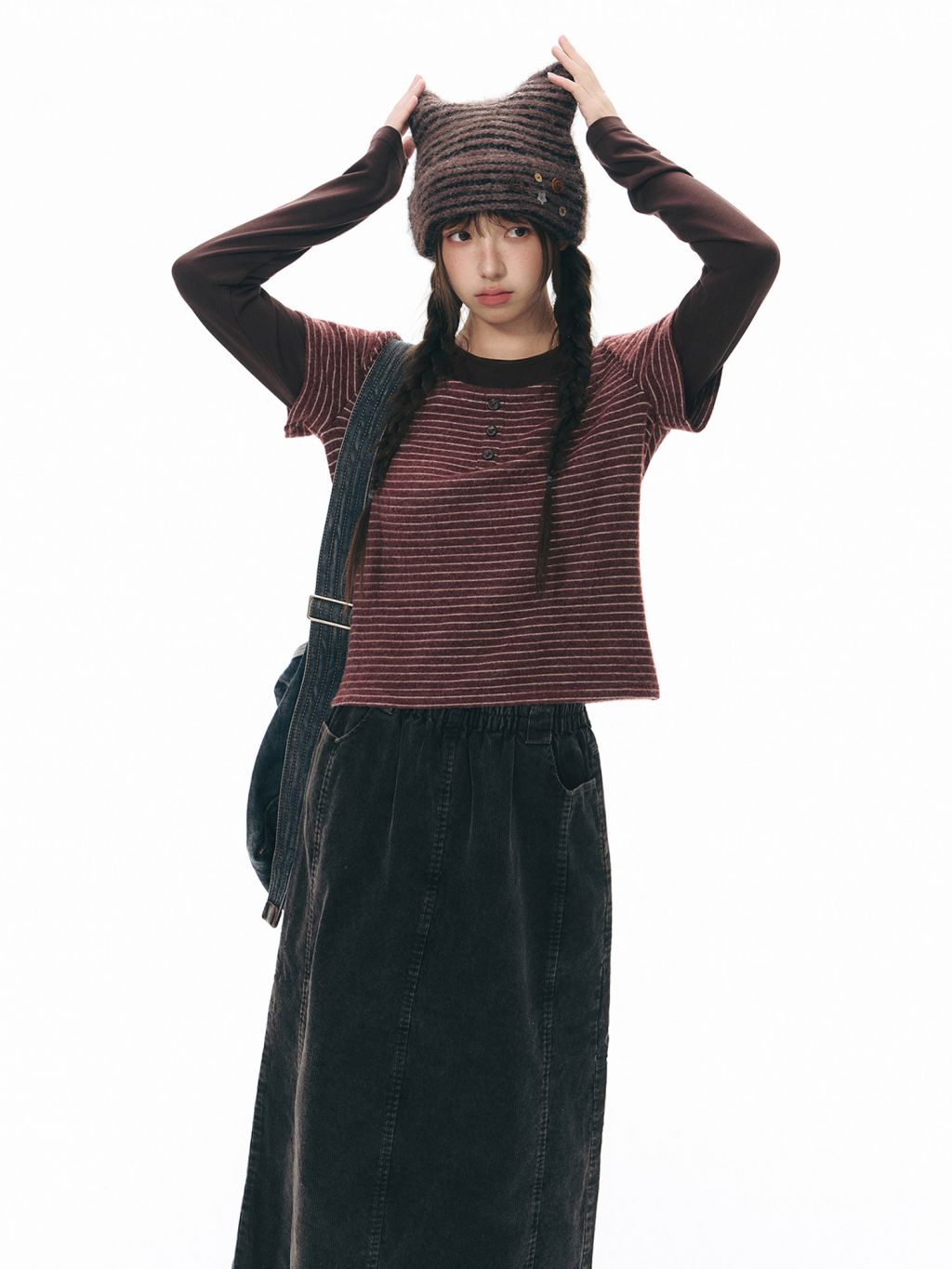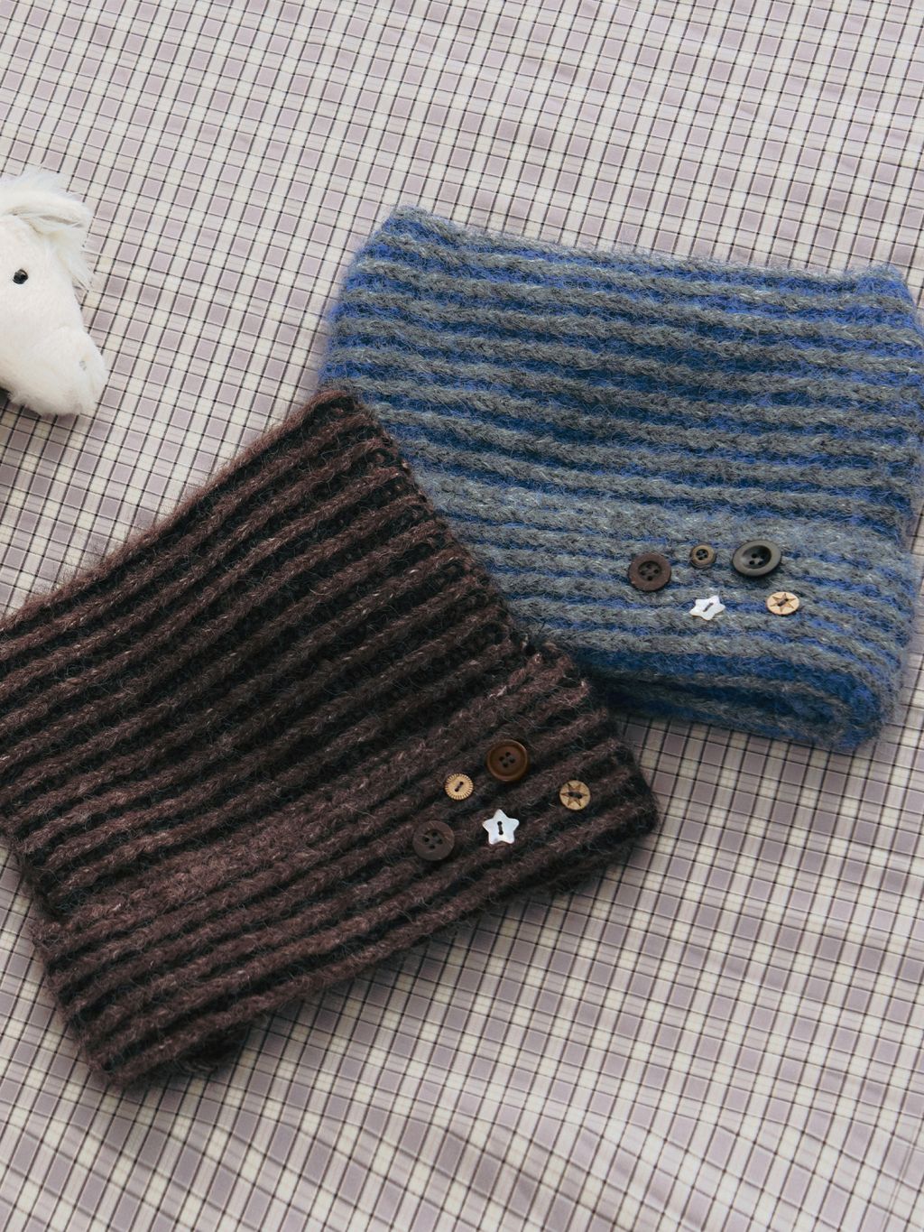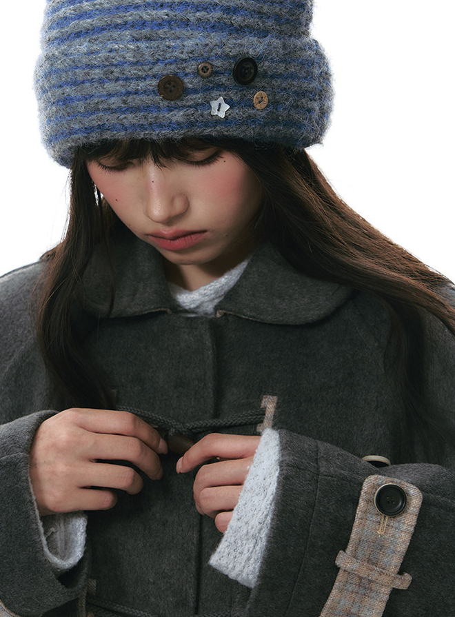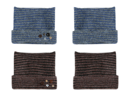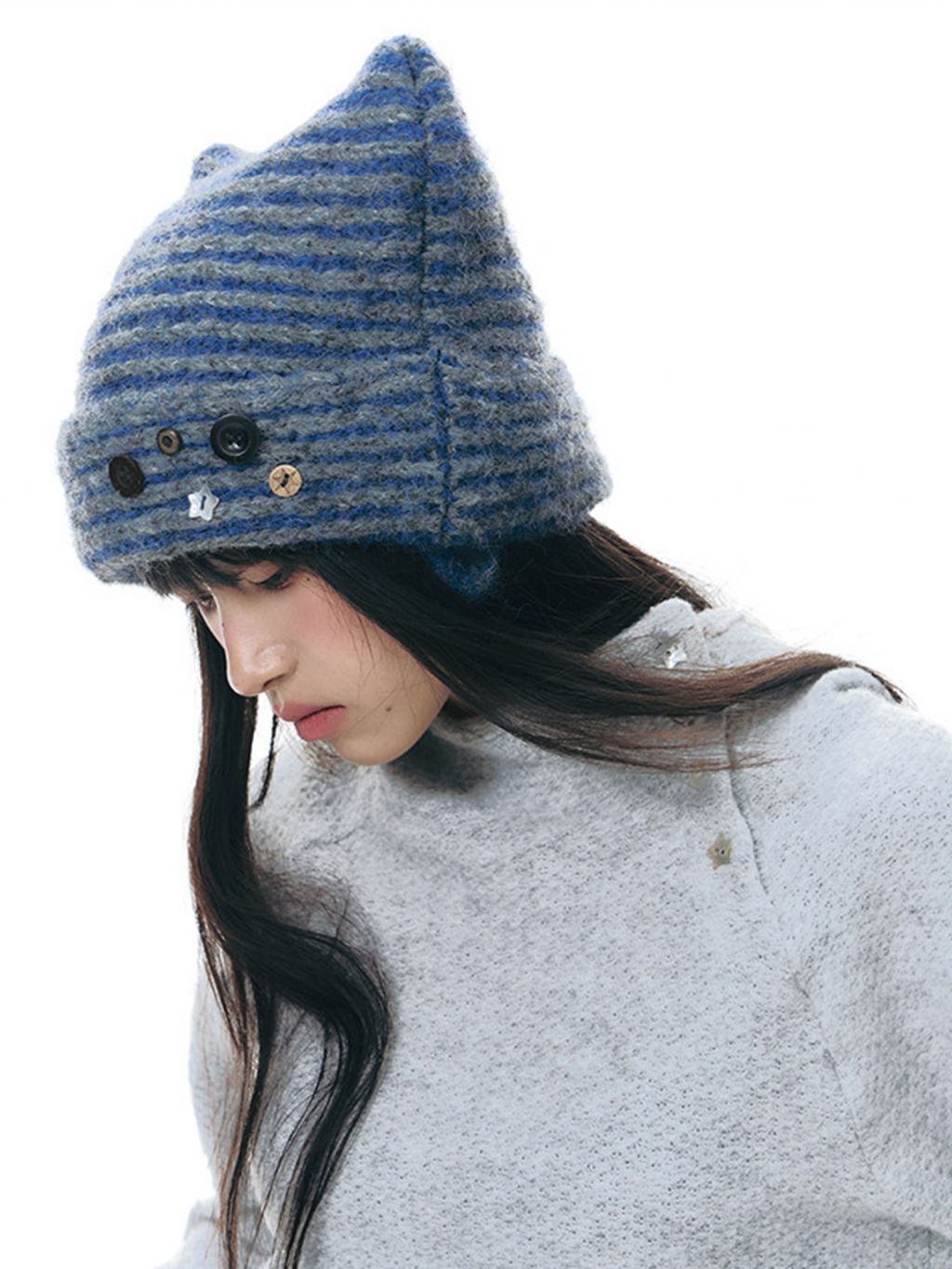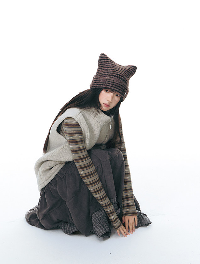 고양이 귀 실루엣과 버튼 디테일로 위트를 더한 스트라이프 니트 비니입니다.
