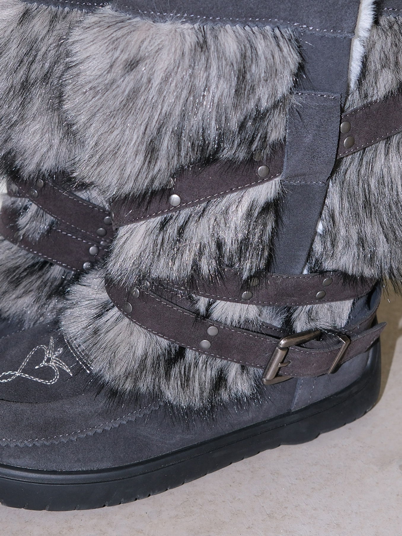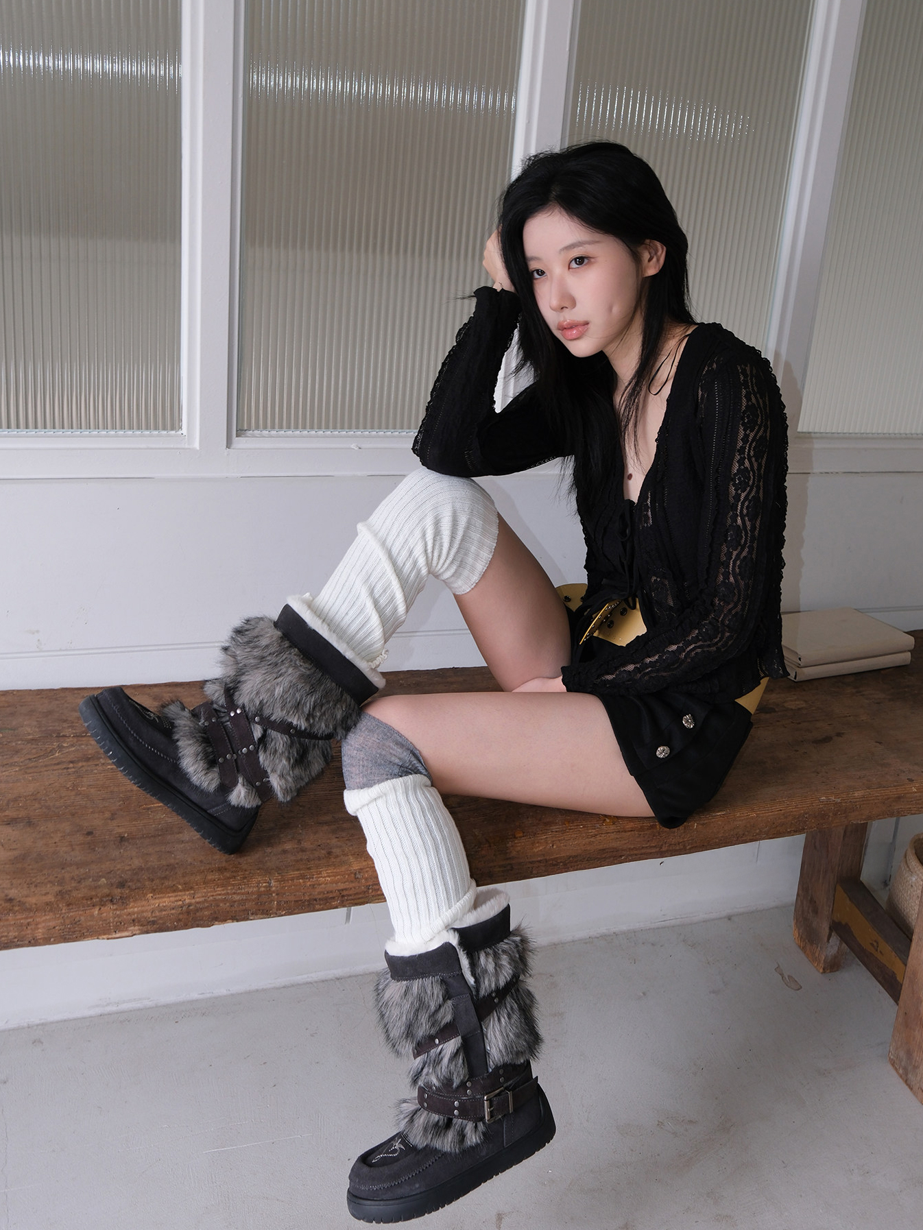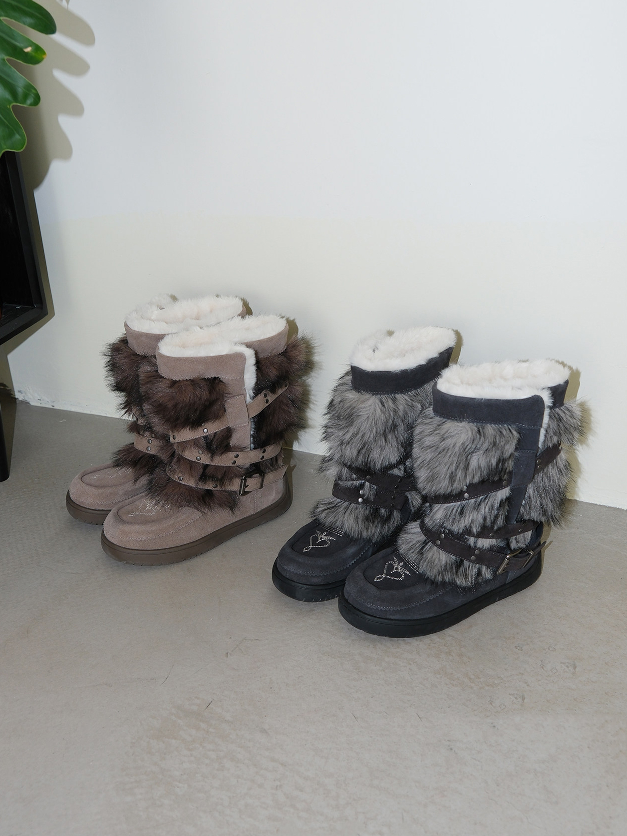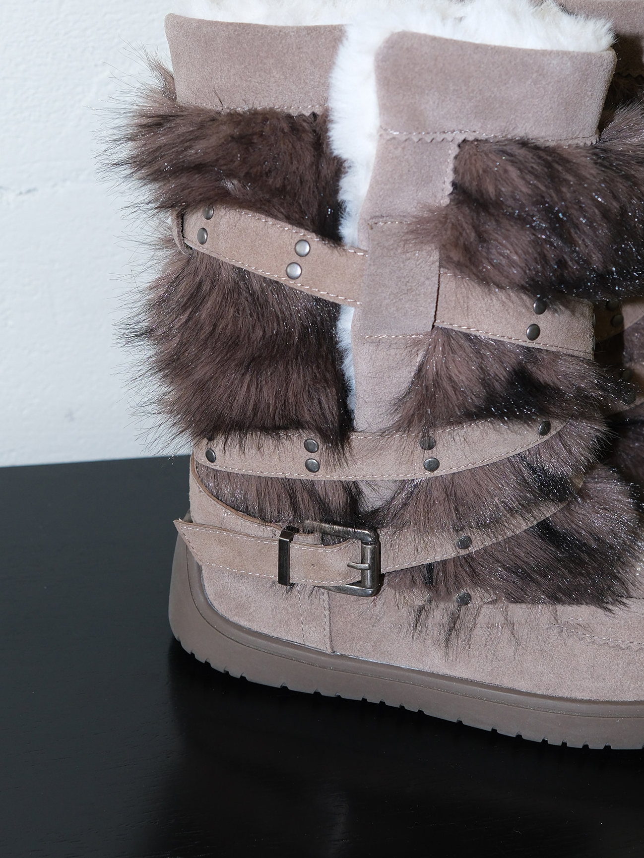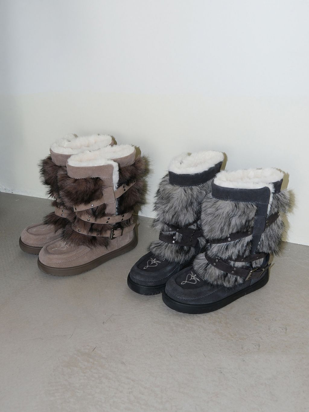 풍성한 퍼 디테일과 스트랩 포인트로 트라이벌 무드를 완성하는 퍼 부츠입니다.