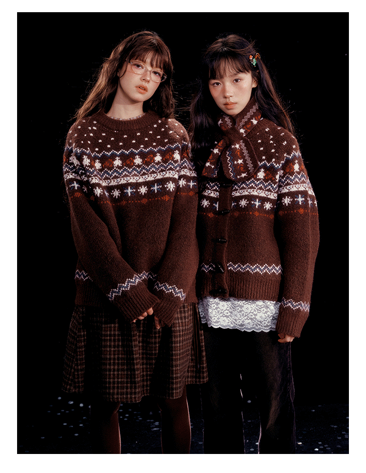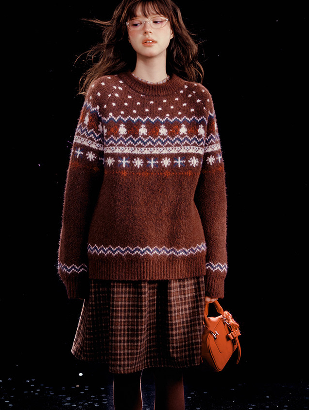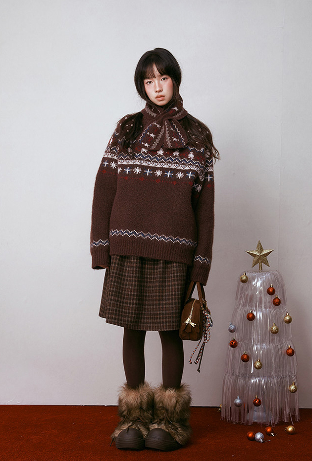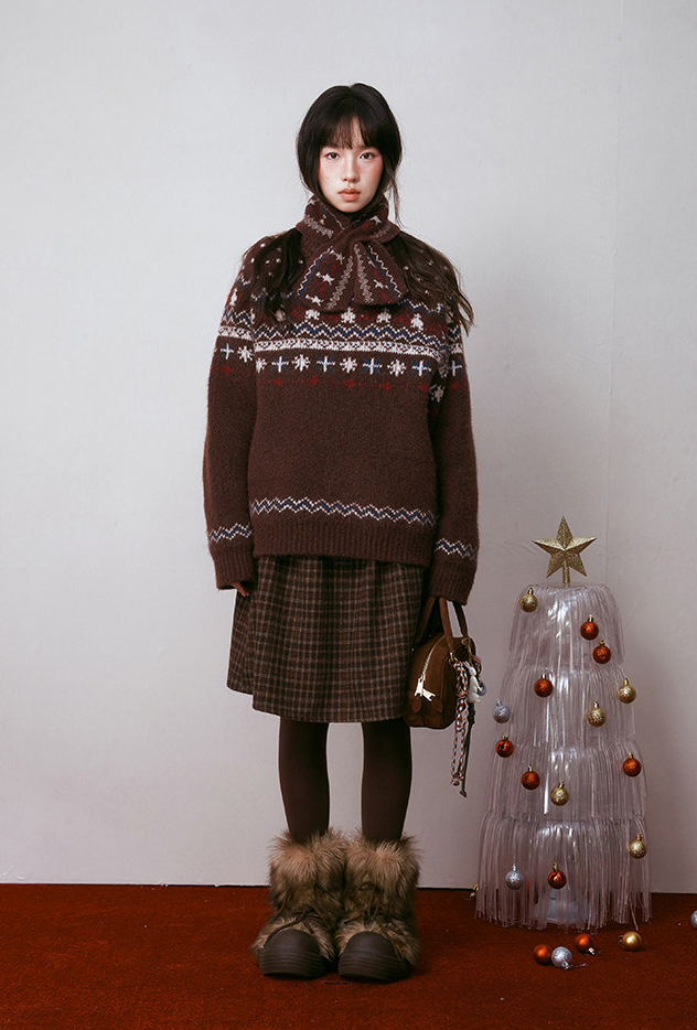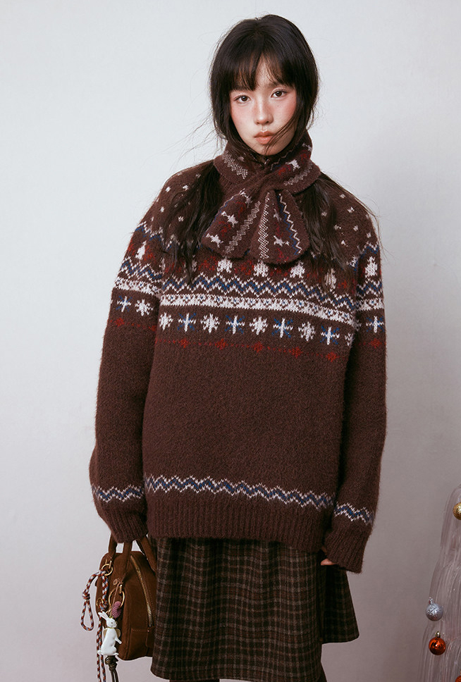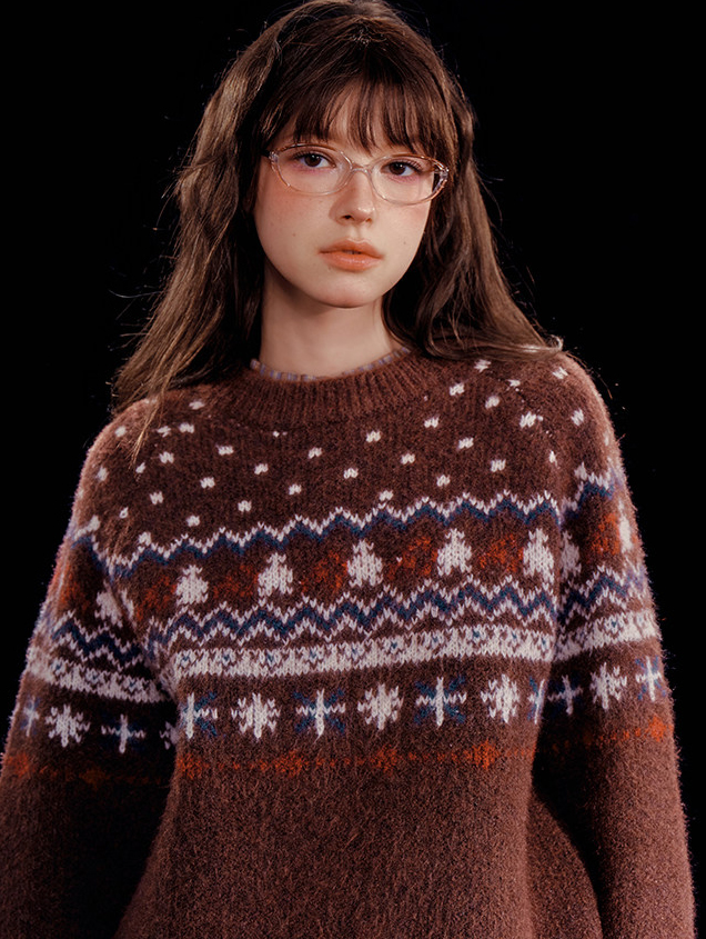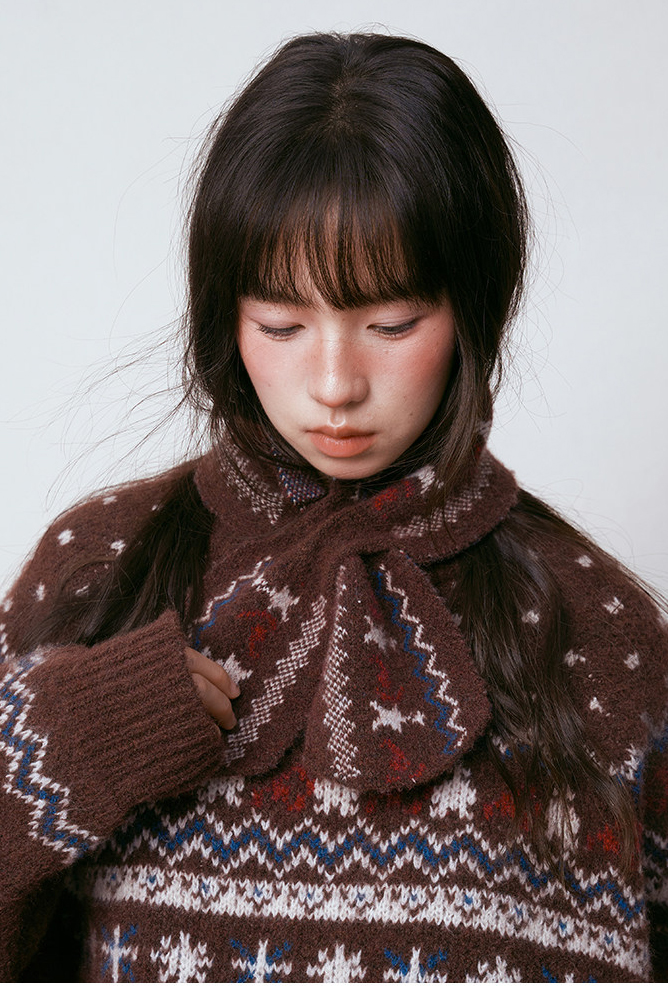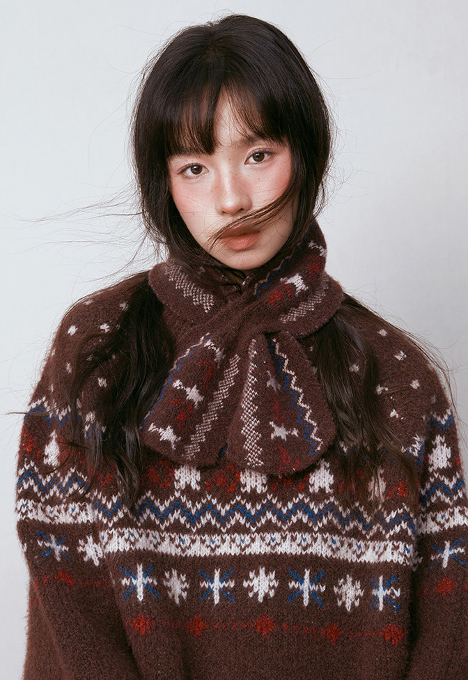 - 전통적인 페어아일 패턴을 브라운 톤으로 재해석한 빈티지 감성 니트