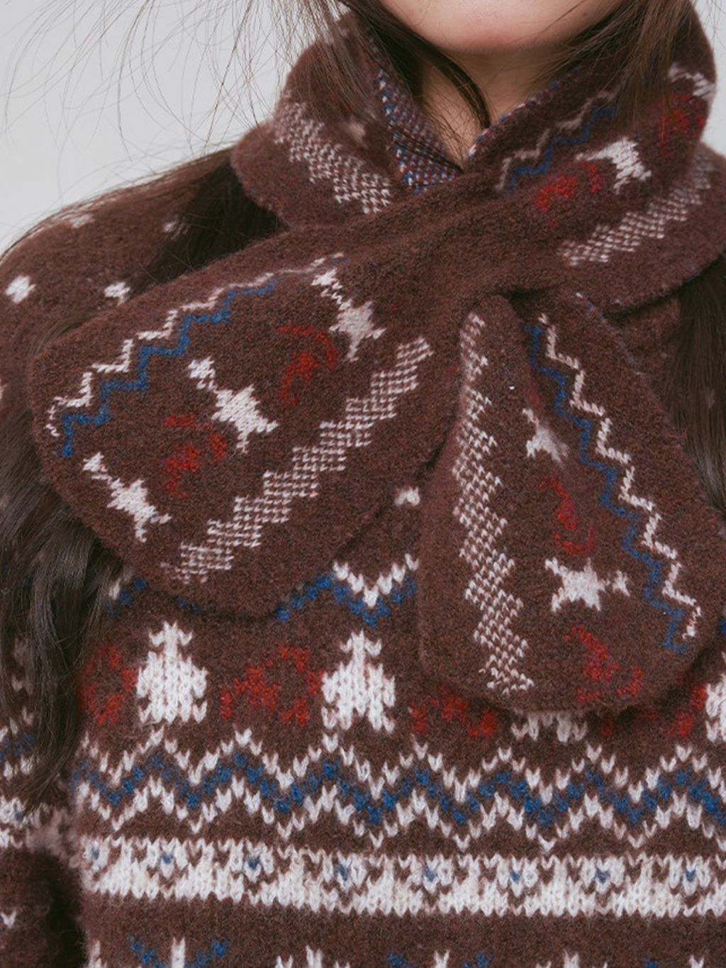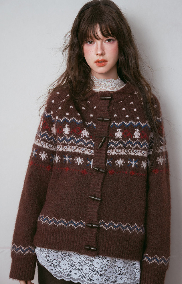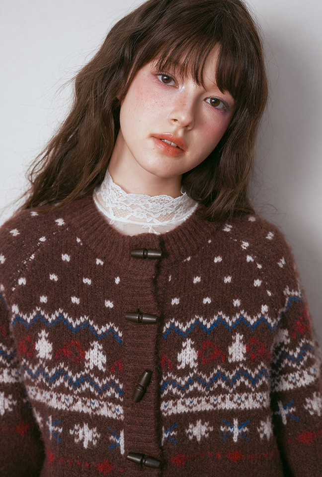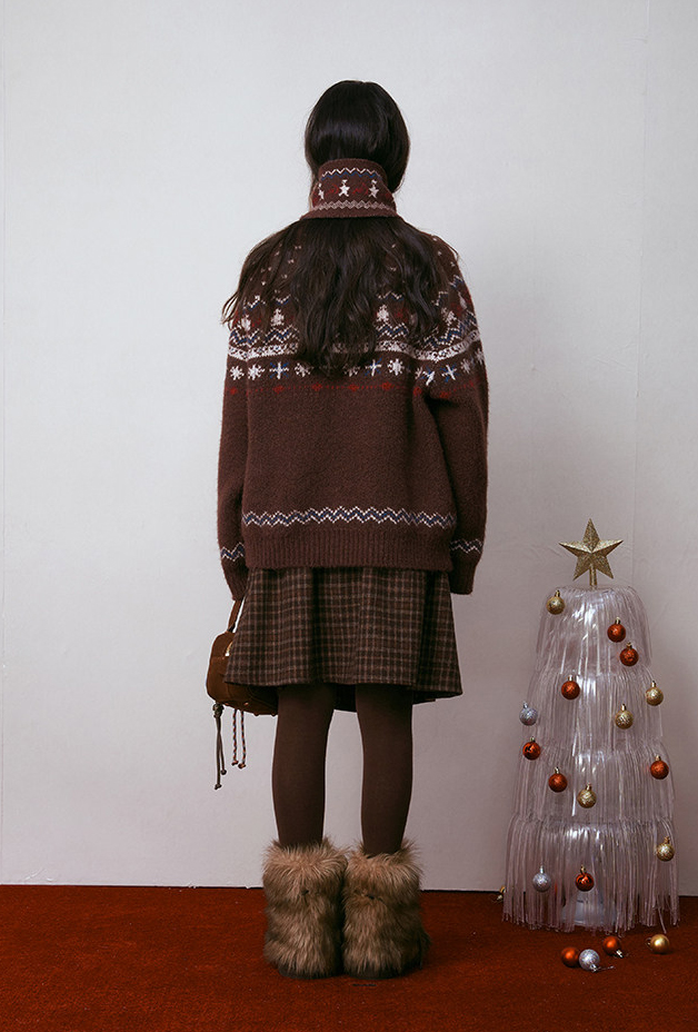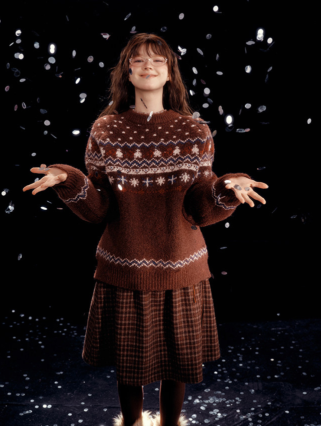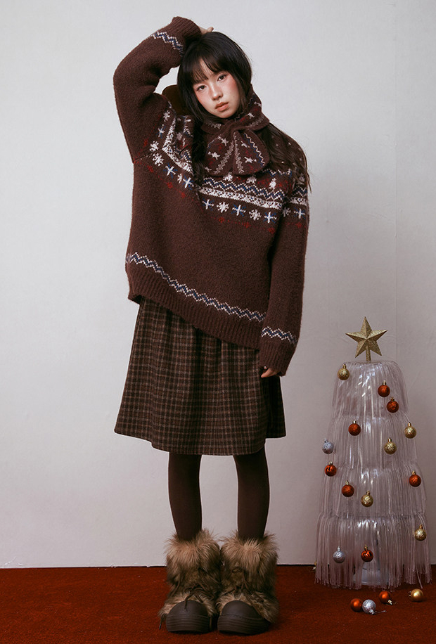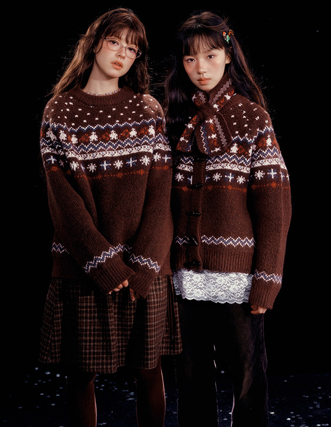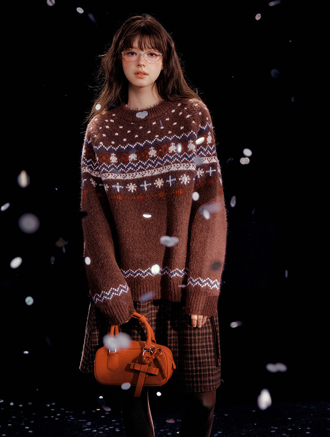 - 전통적인 페어아일 패턴을 브라운 톤으로 재해석한 빈티지 감성 니트