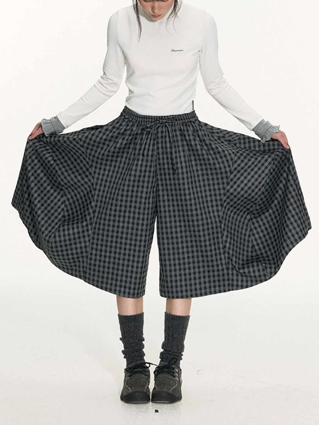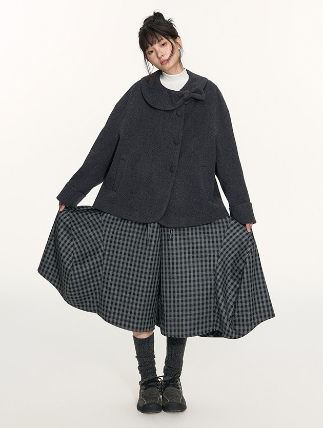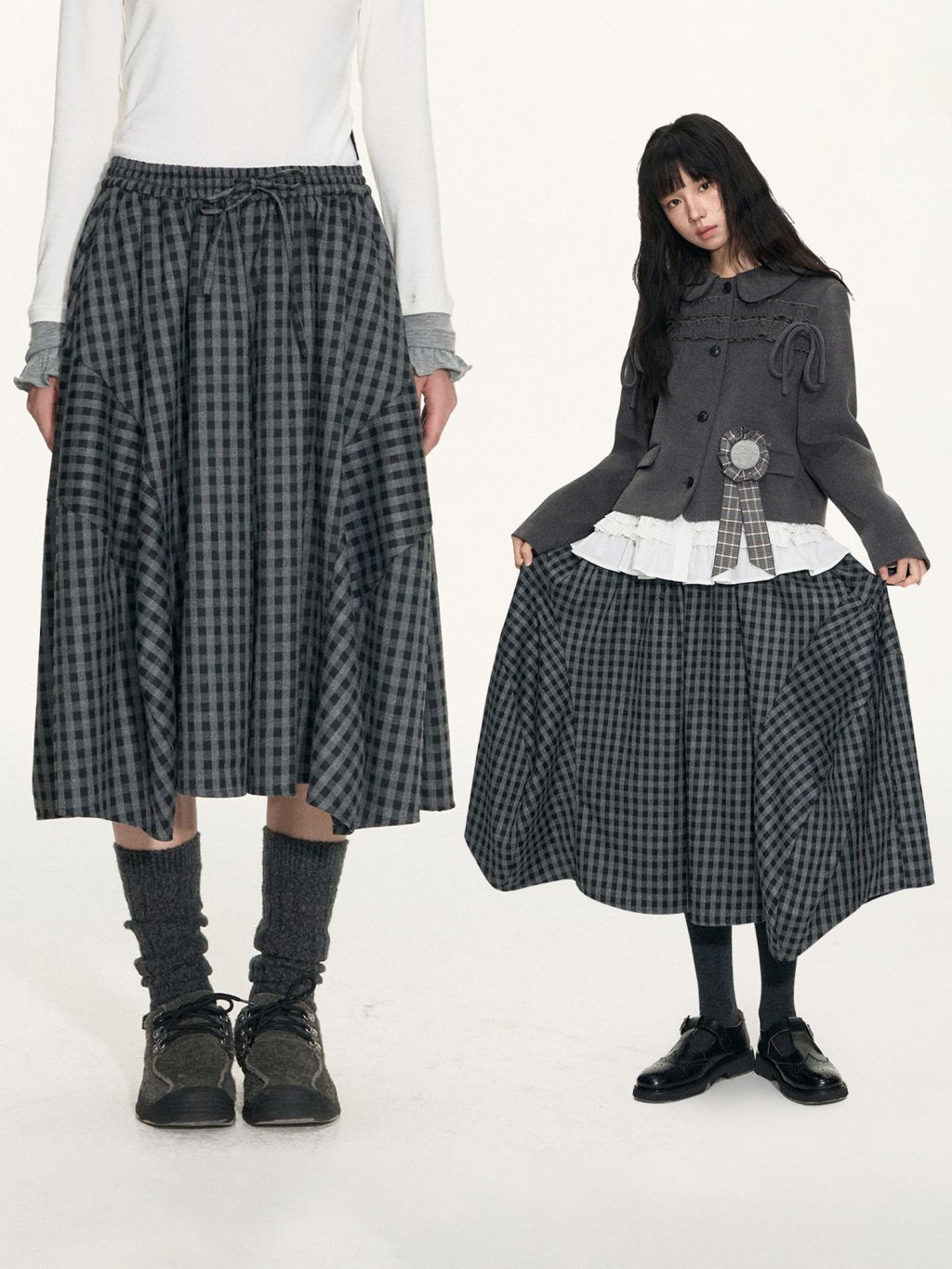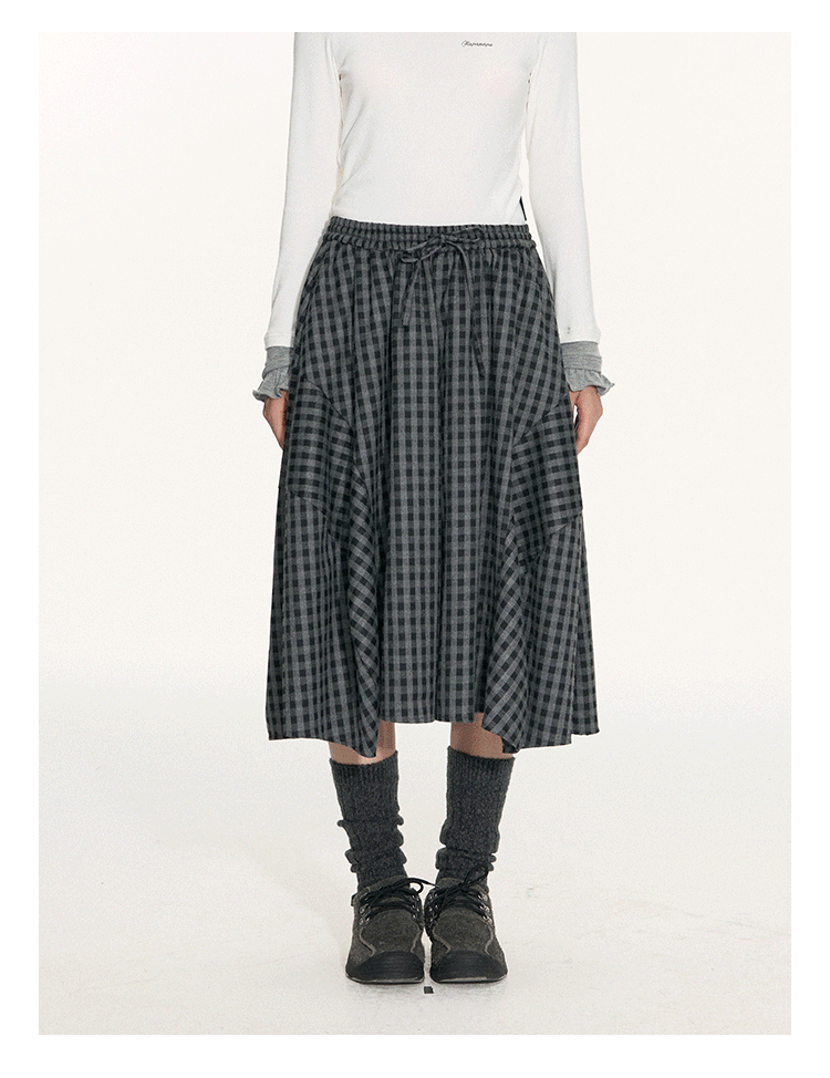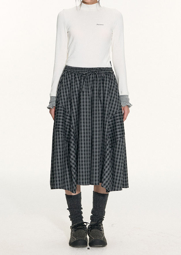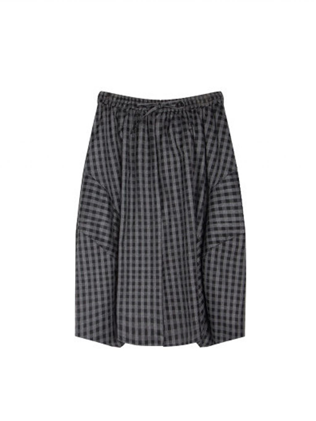 잔잔한 체크 패턴과 자연스럽게 퍼지는 실루엣이 어우러진 스커트형 스커트로, 움직임에 따라 리듬감 있는 분위기를 완성하는 아이템입니다.