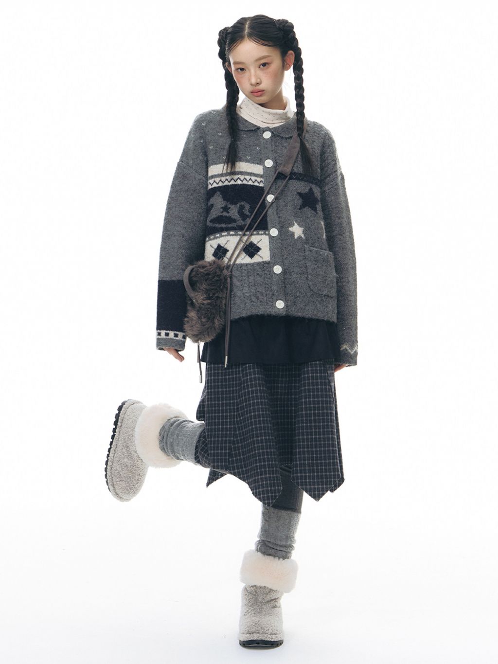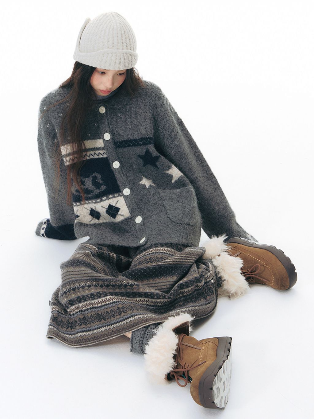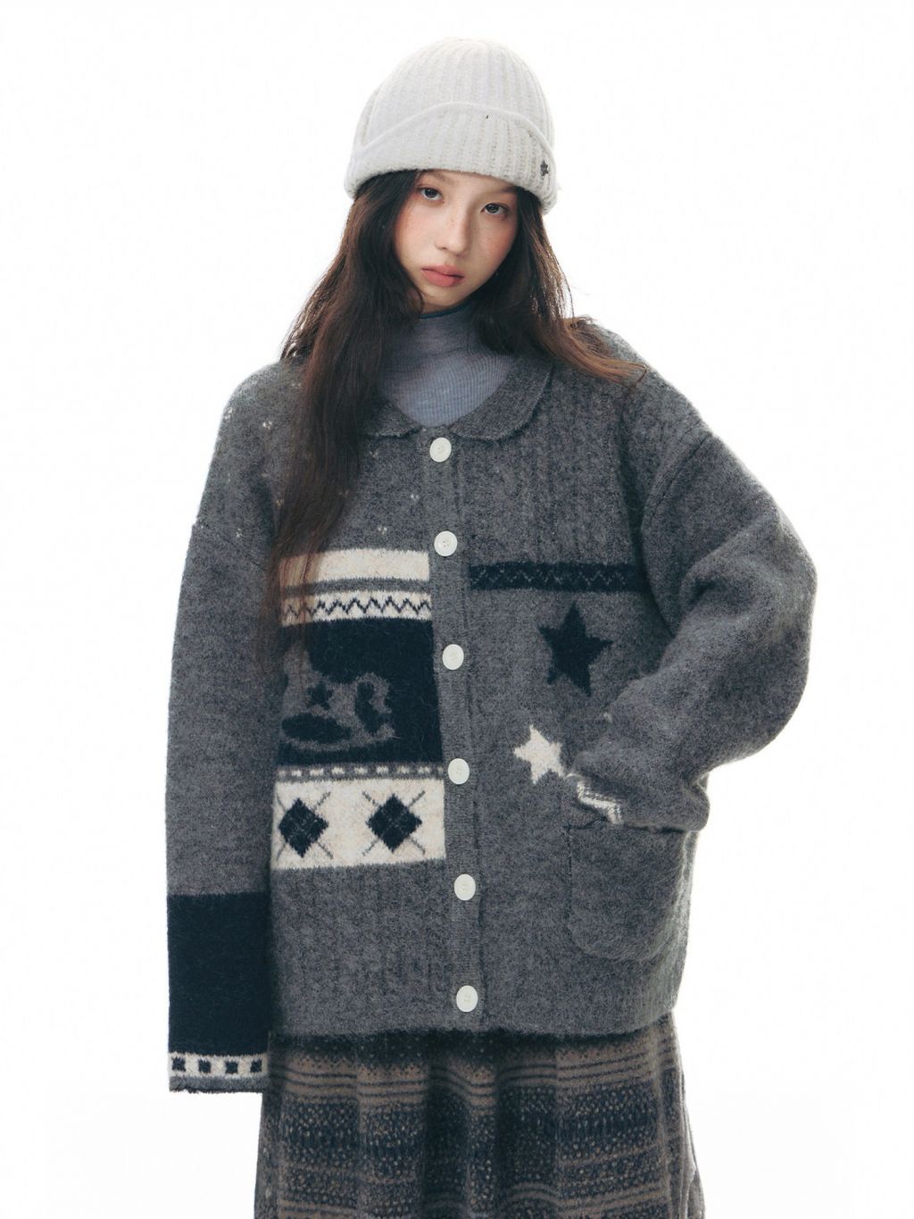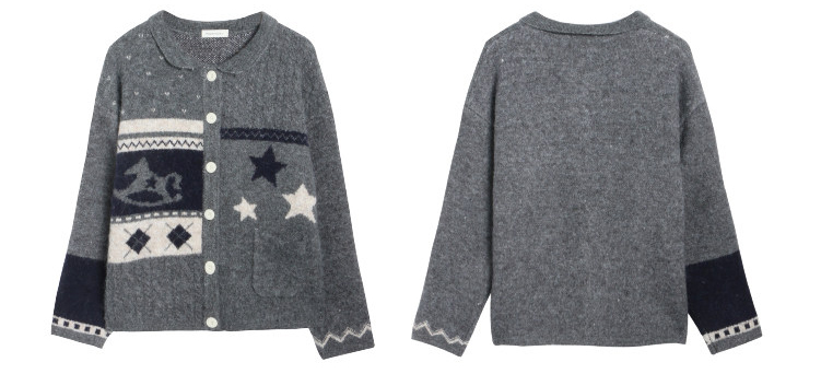 빈티지한 자카드 패턴과 차분한 그레이 톤이 어우러진, 겨울 무드의 포인트 가디건입니다.