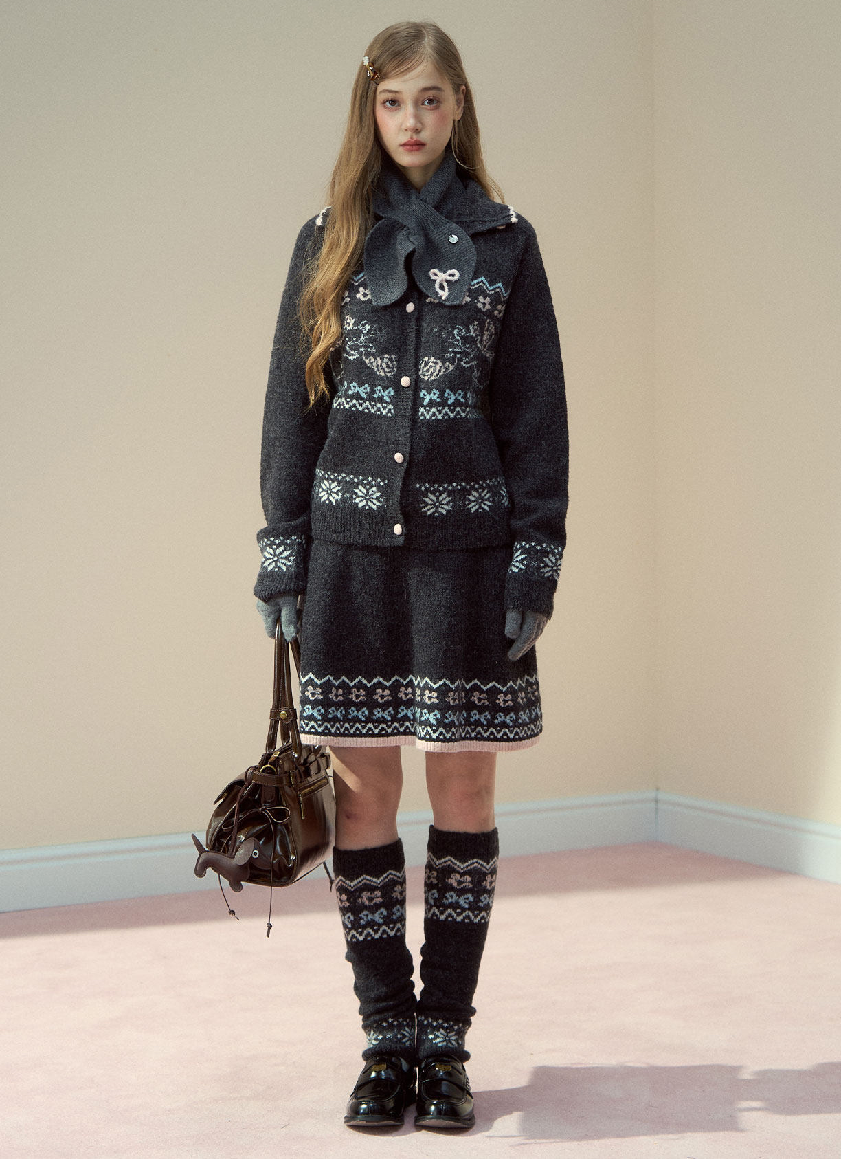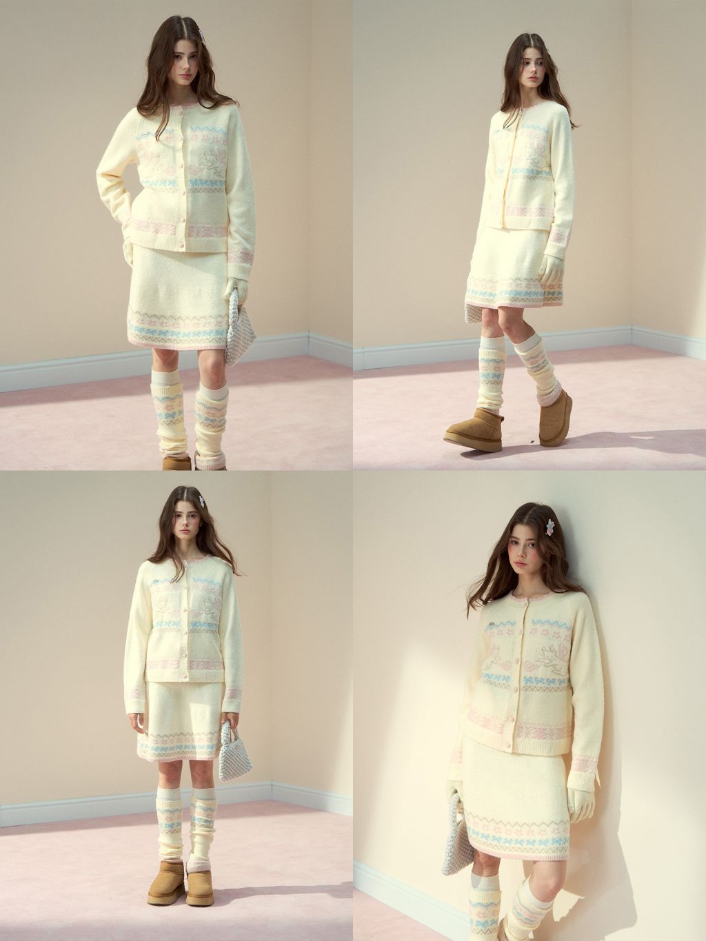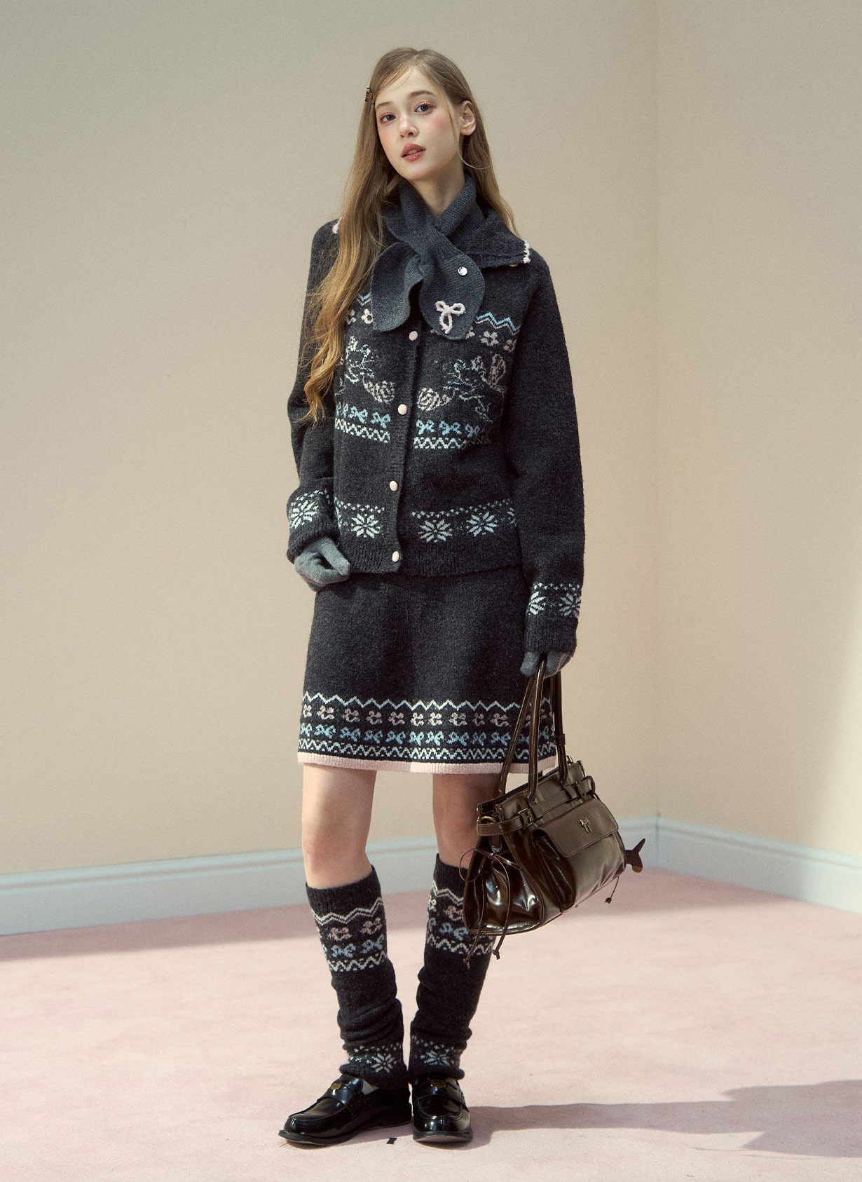 엔젤 키티 모티프와 페어아일 패턴이 어우러진 니트 셋업으로, 빈티지하면서도 사랑스러운 겨울 무드를 완성합니다.