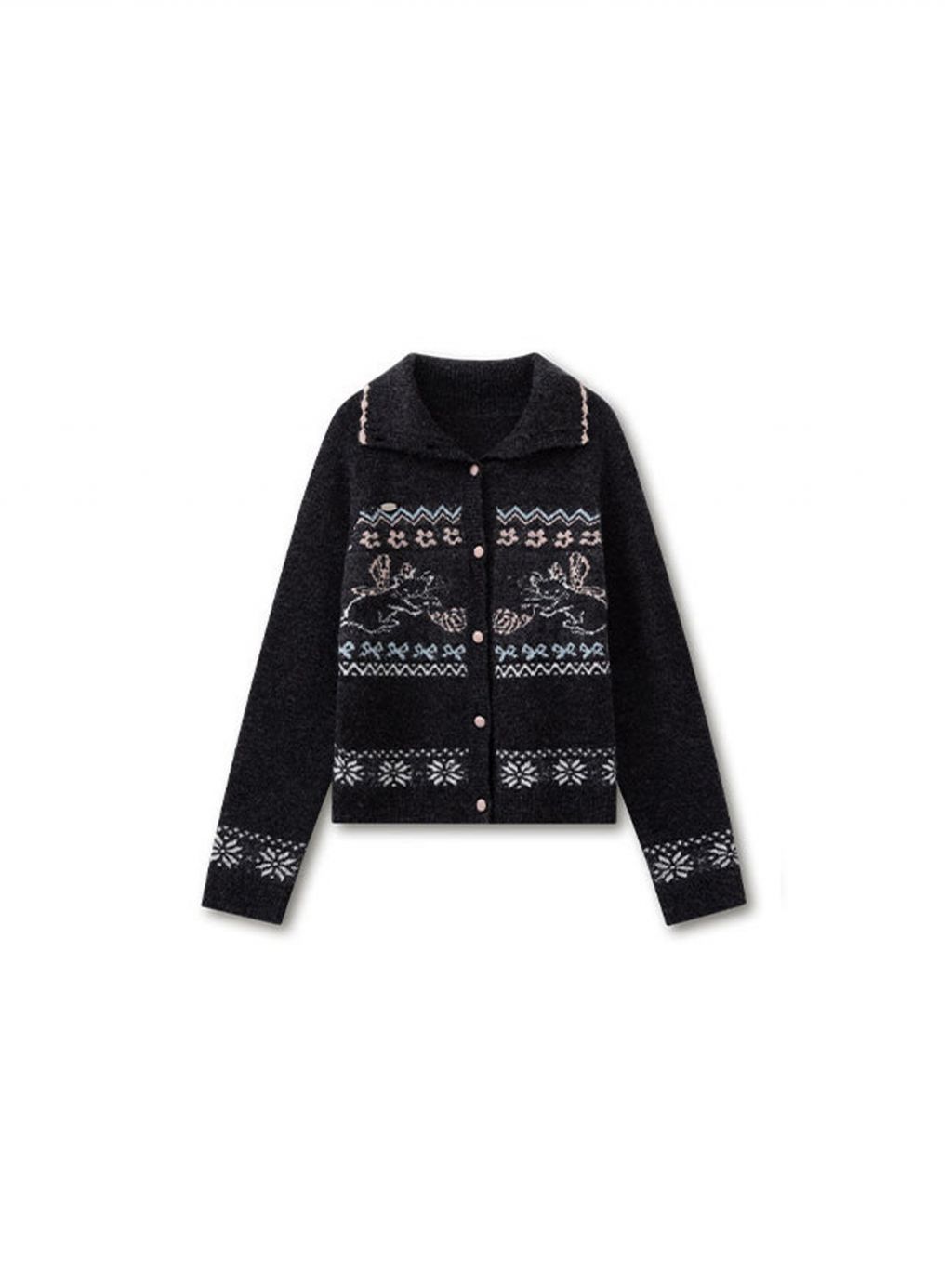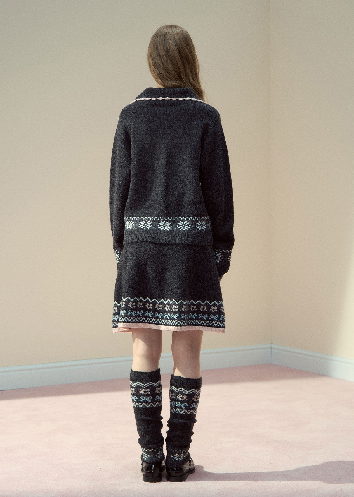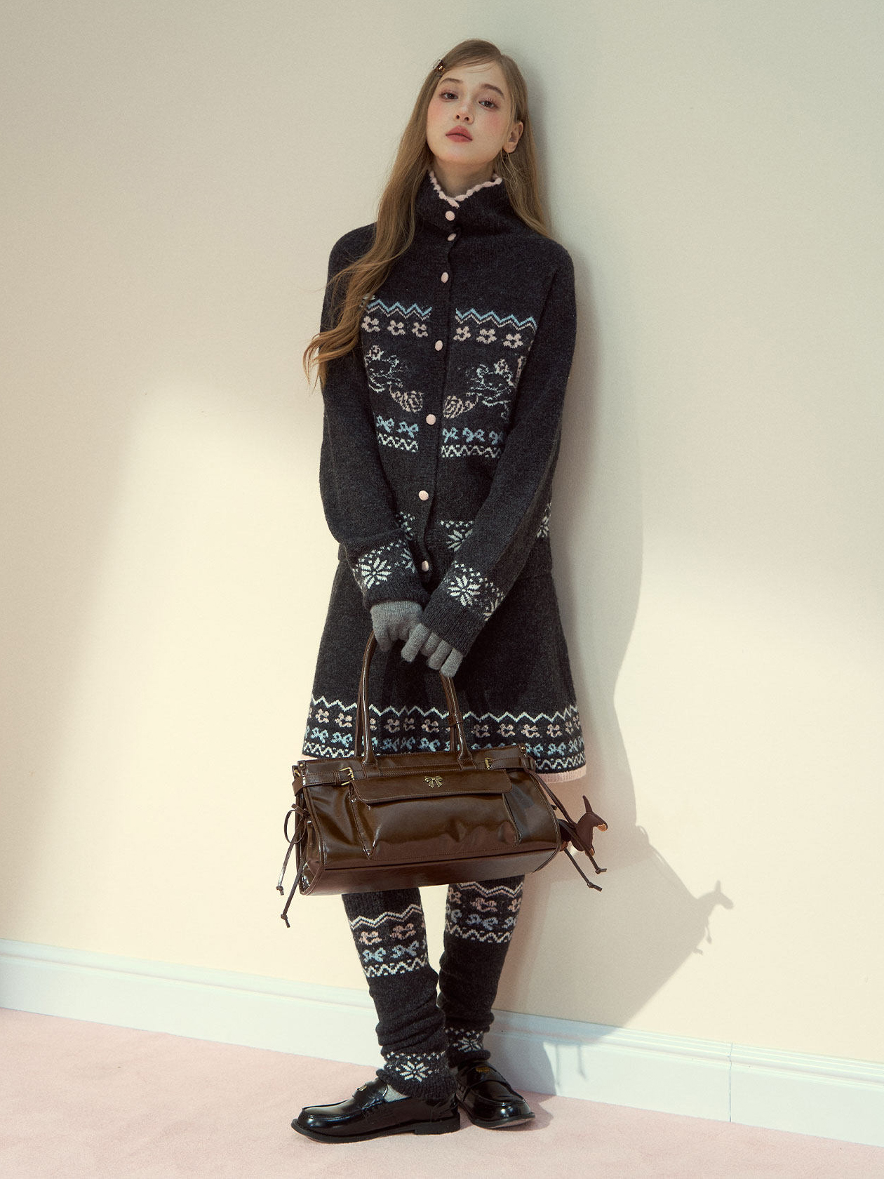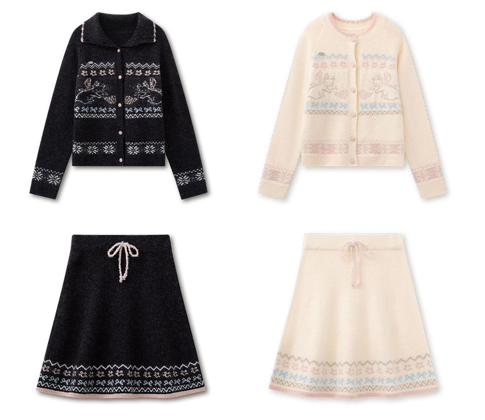 엔젤 키티 모티프와 페어아일 패턴이 어우러진 니트 셋업으로, 빈티지하면서도 사랑스러운 겨울 무드를 완성합니다.