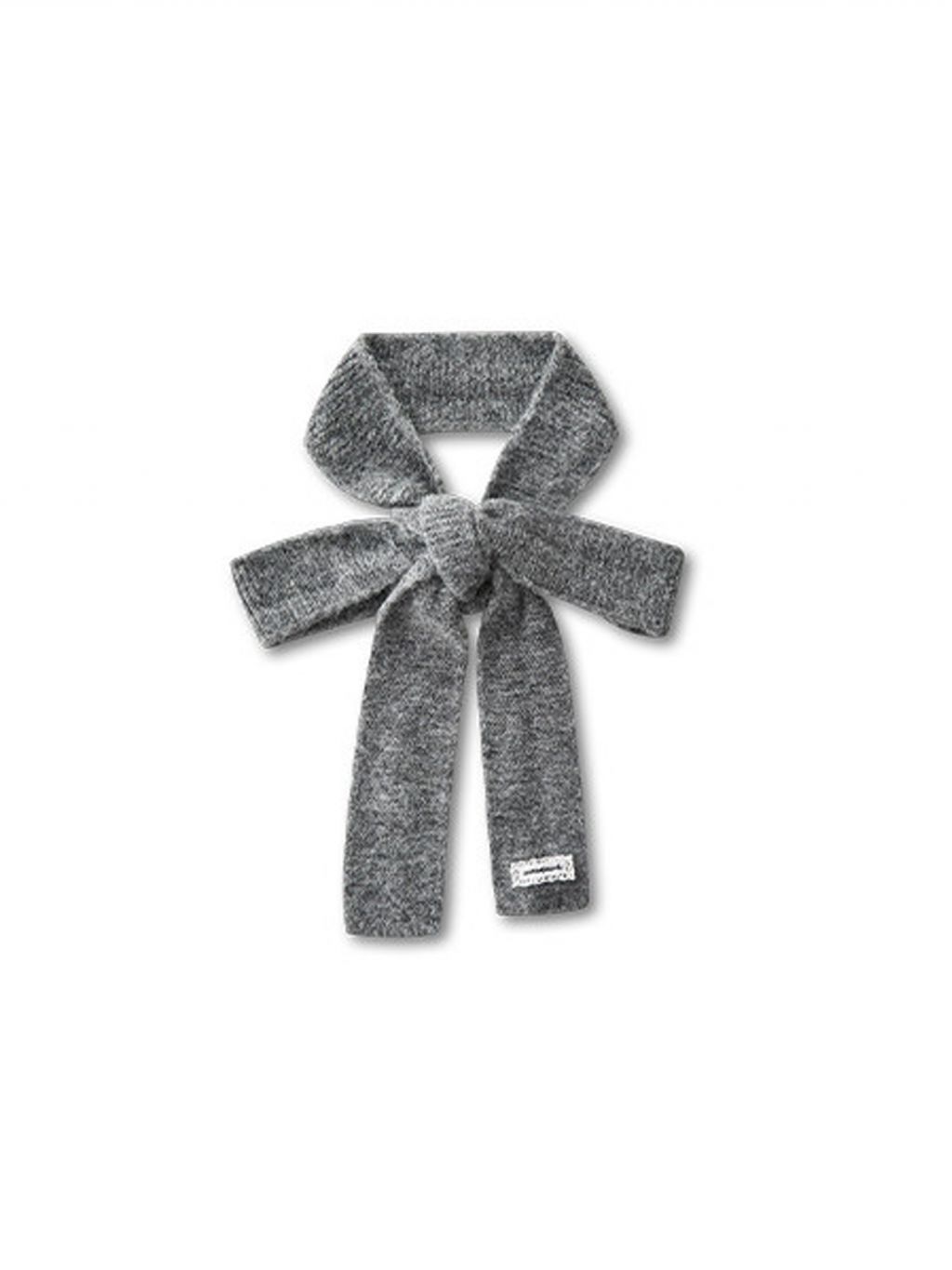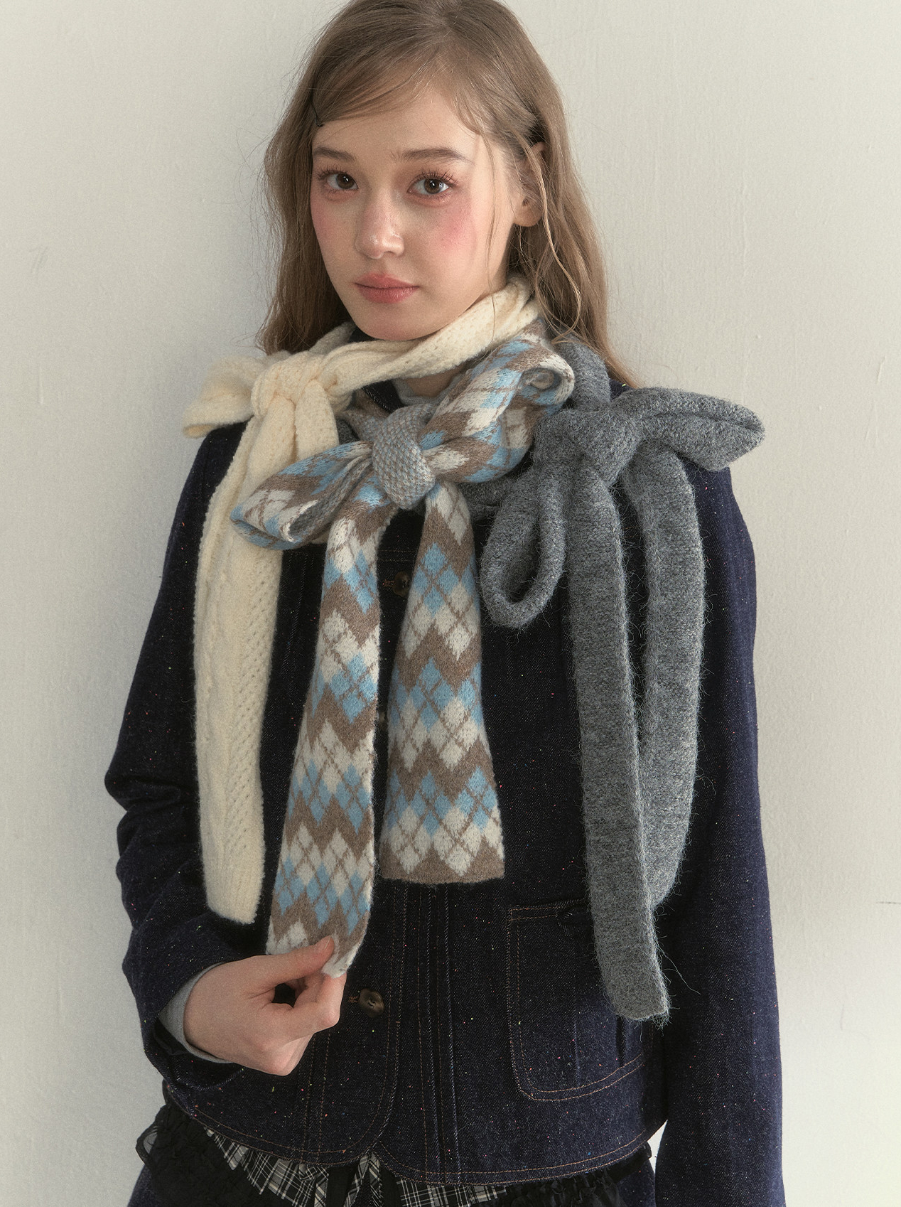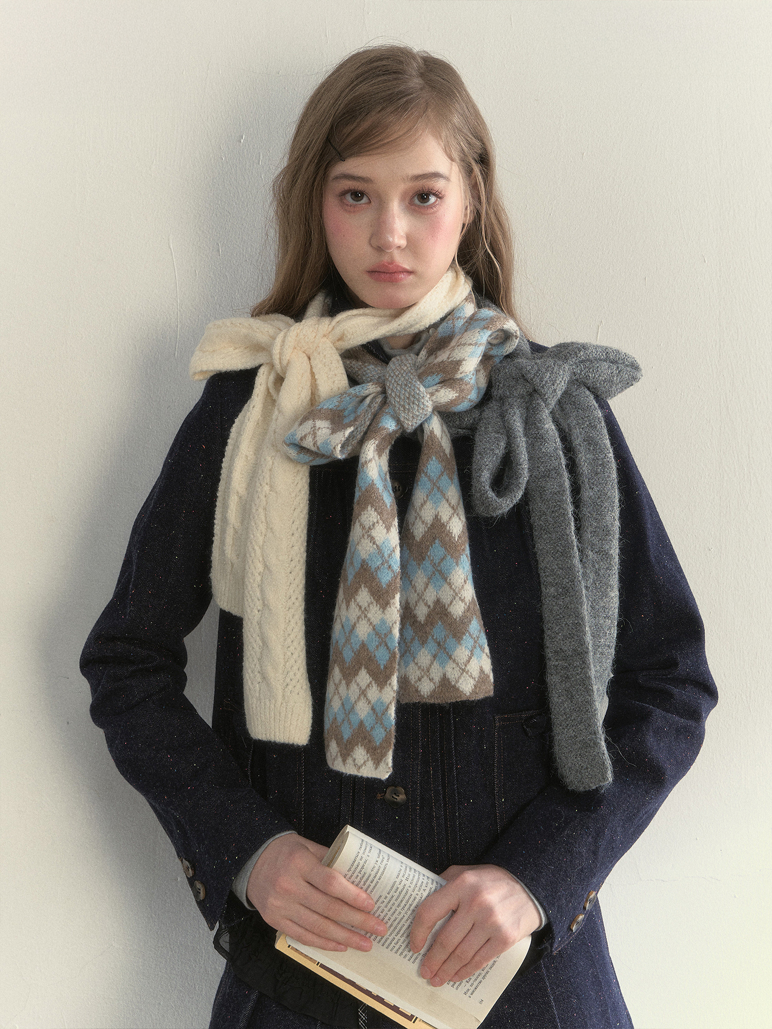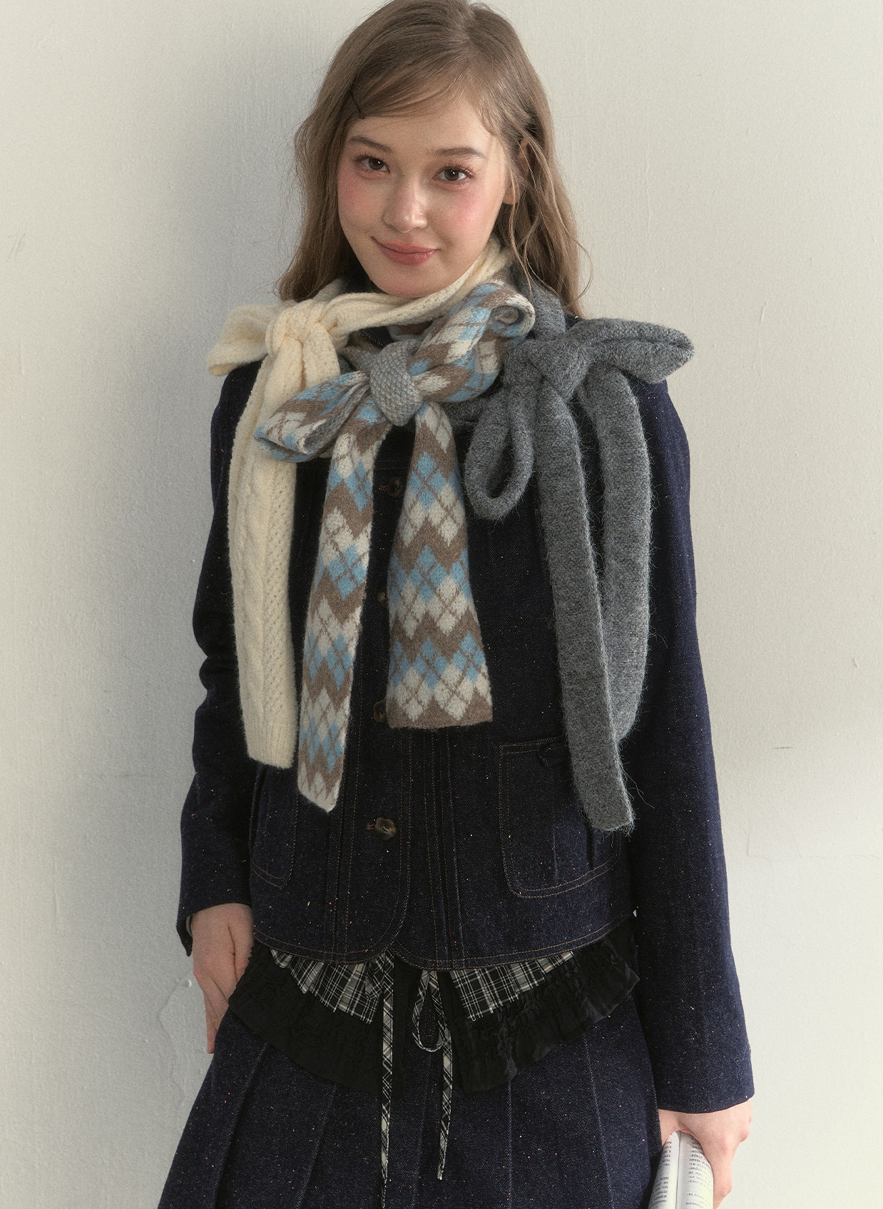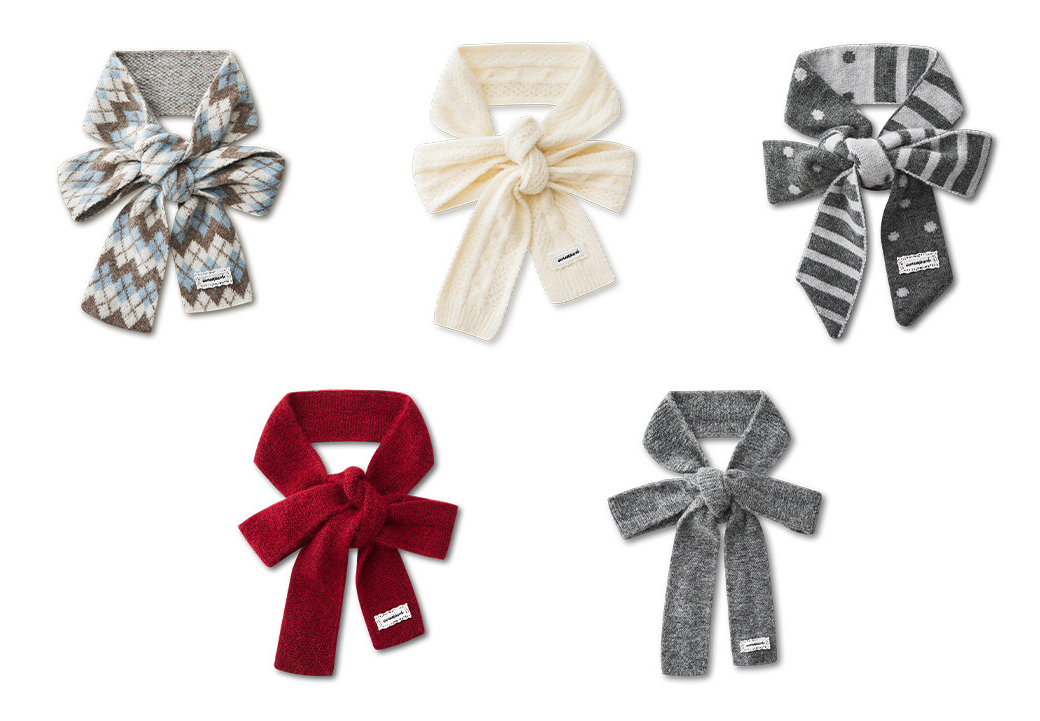 리본처럼 묶어 연출하는 니트 스카프로, 클래식한 룩에 사랑스러운 포인트를 더해줍니다.