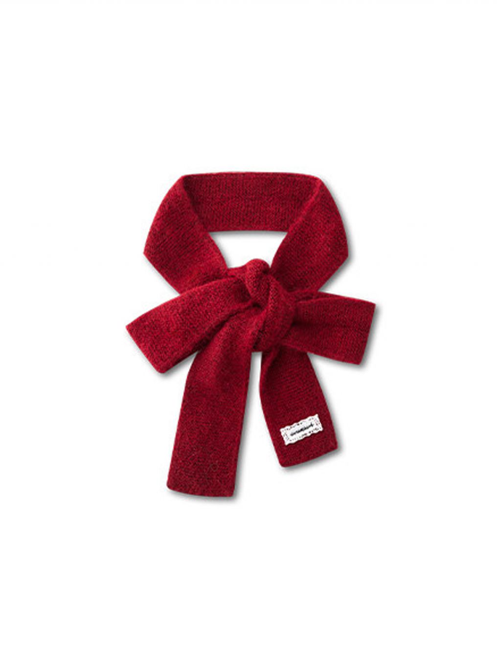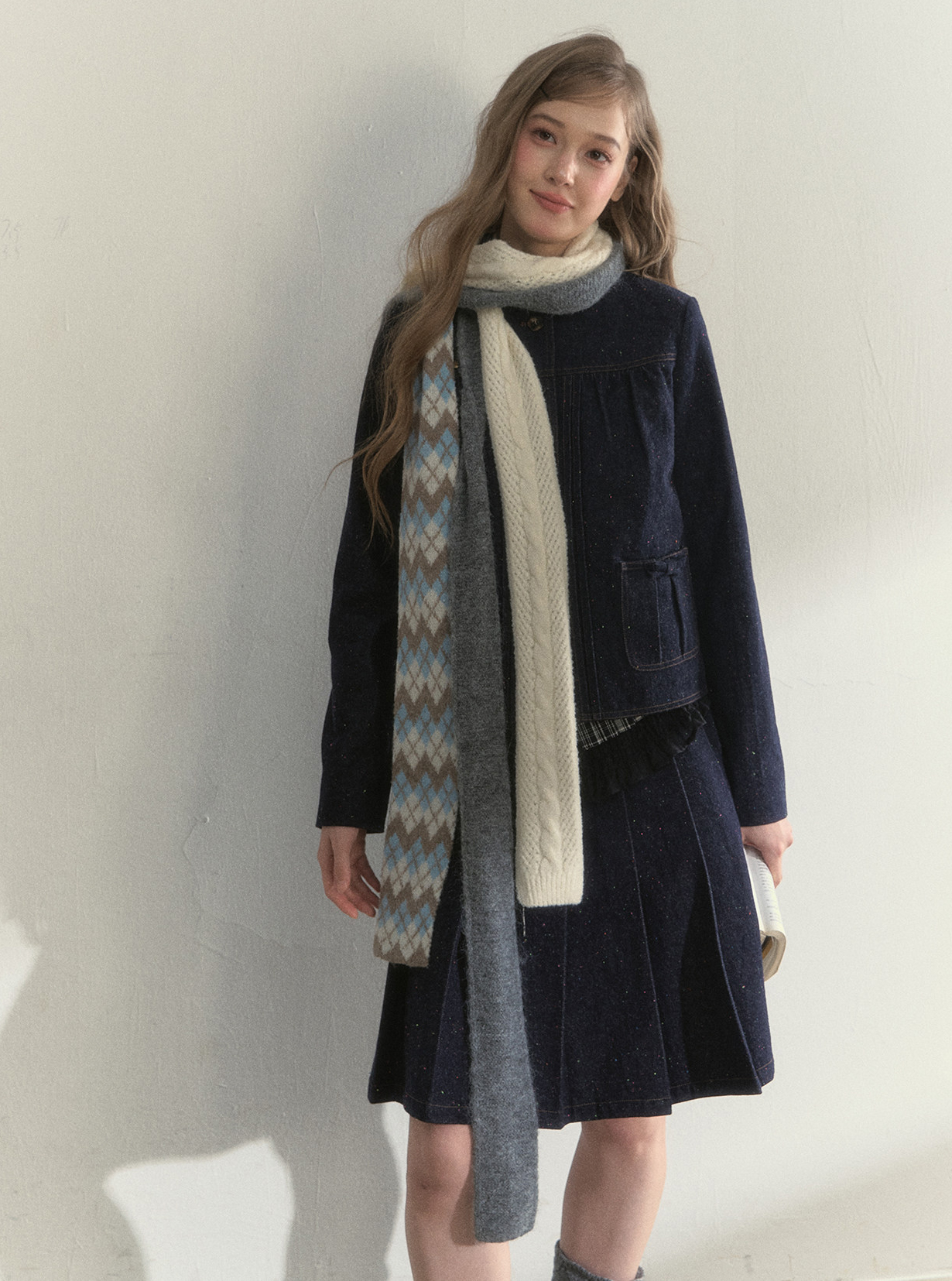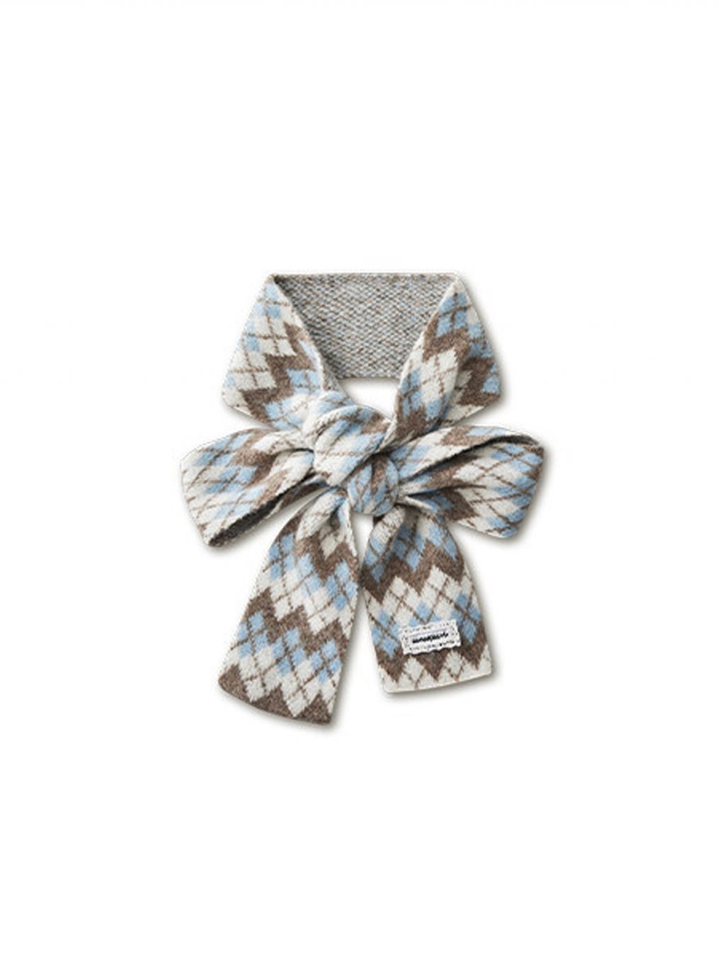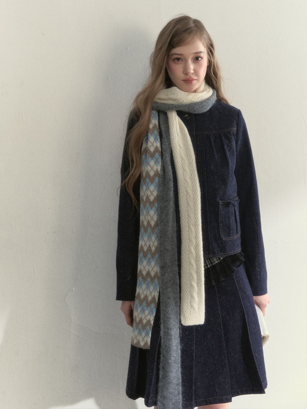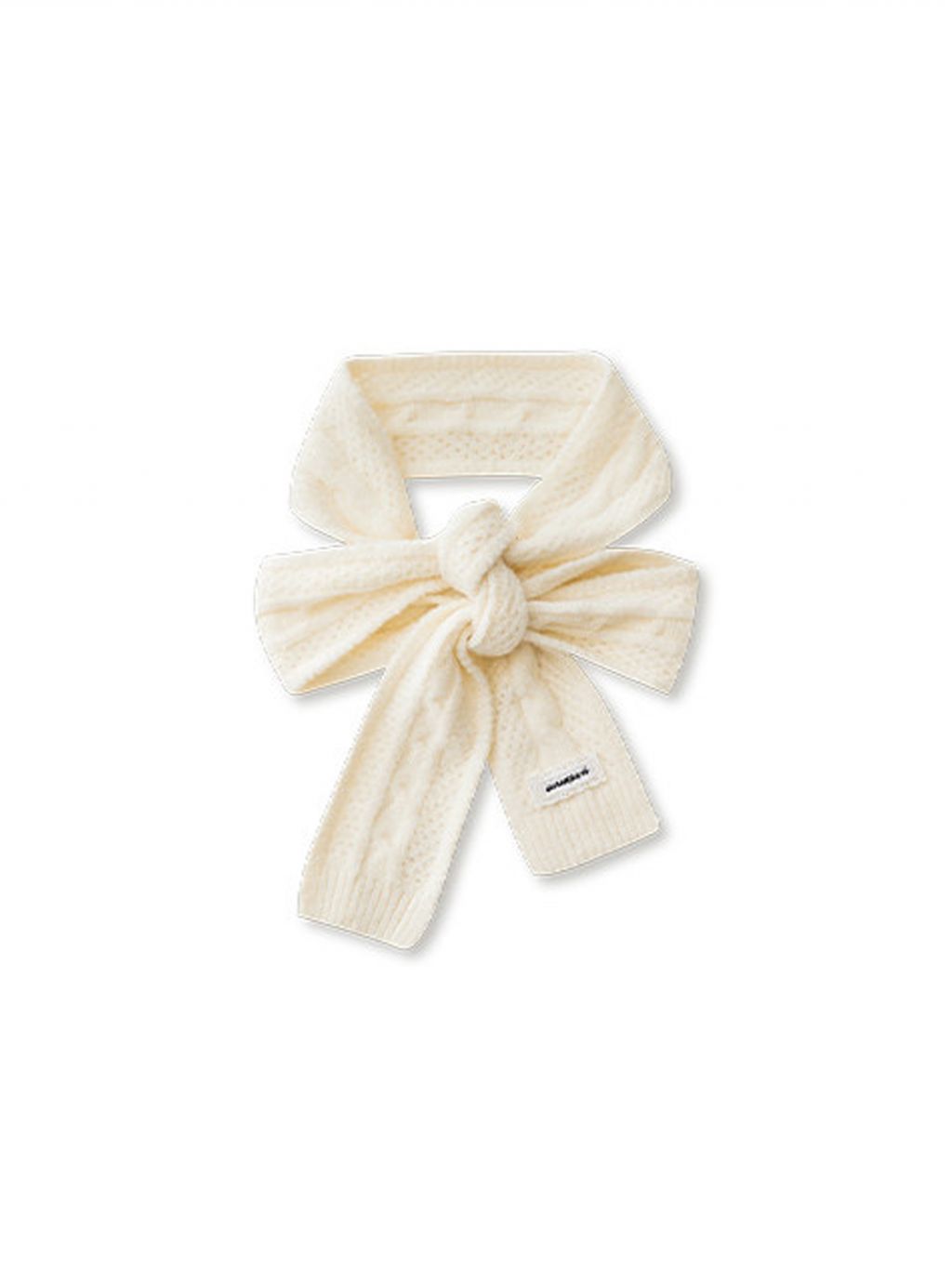 리본처럼 묶어 연출하는 니트 스카프로, 클래식한 룩에 사랑스러운 포인트를 더해줍니다.
