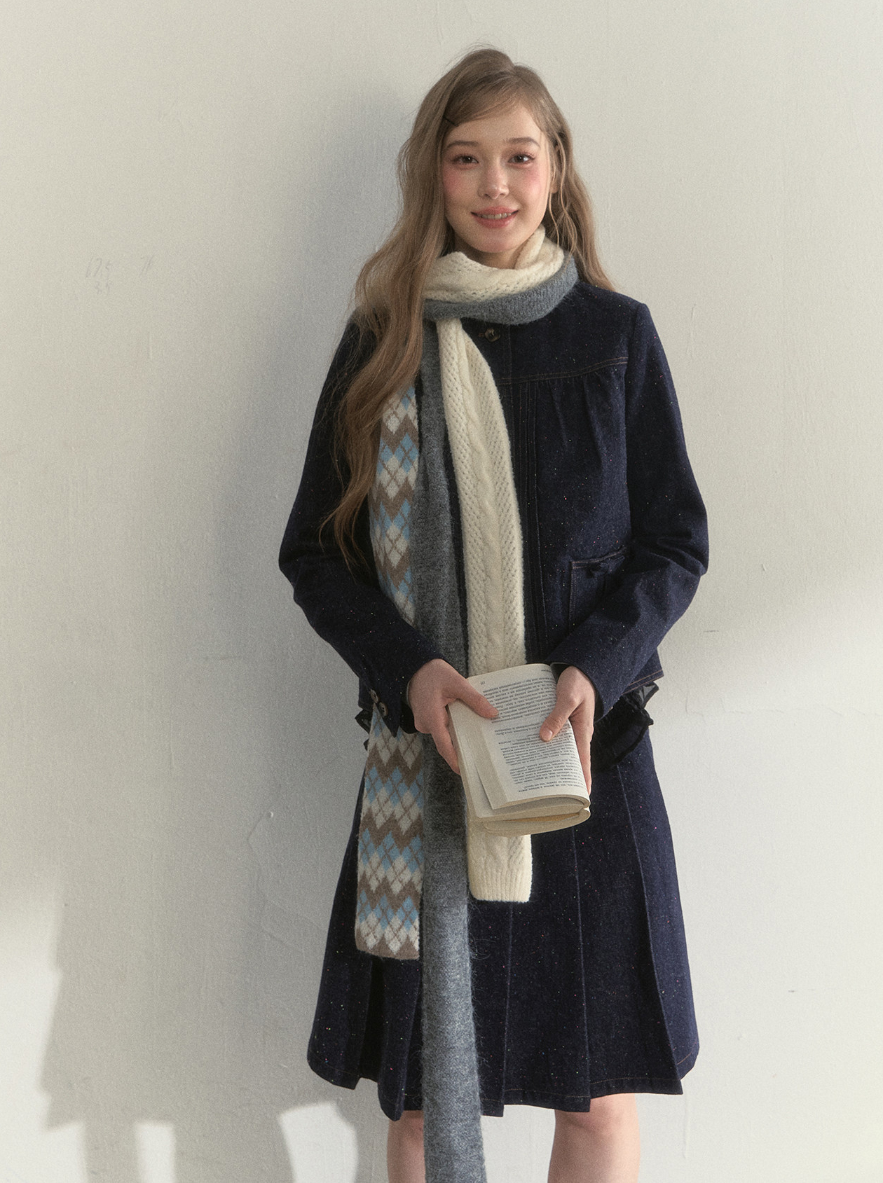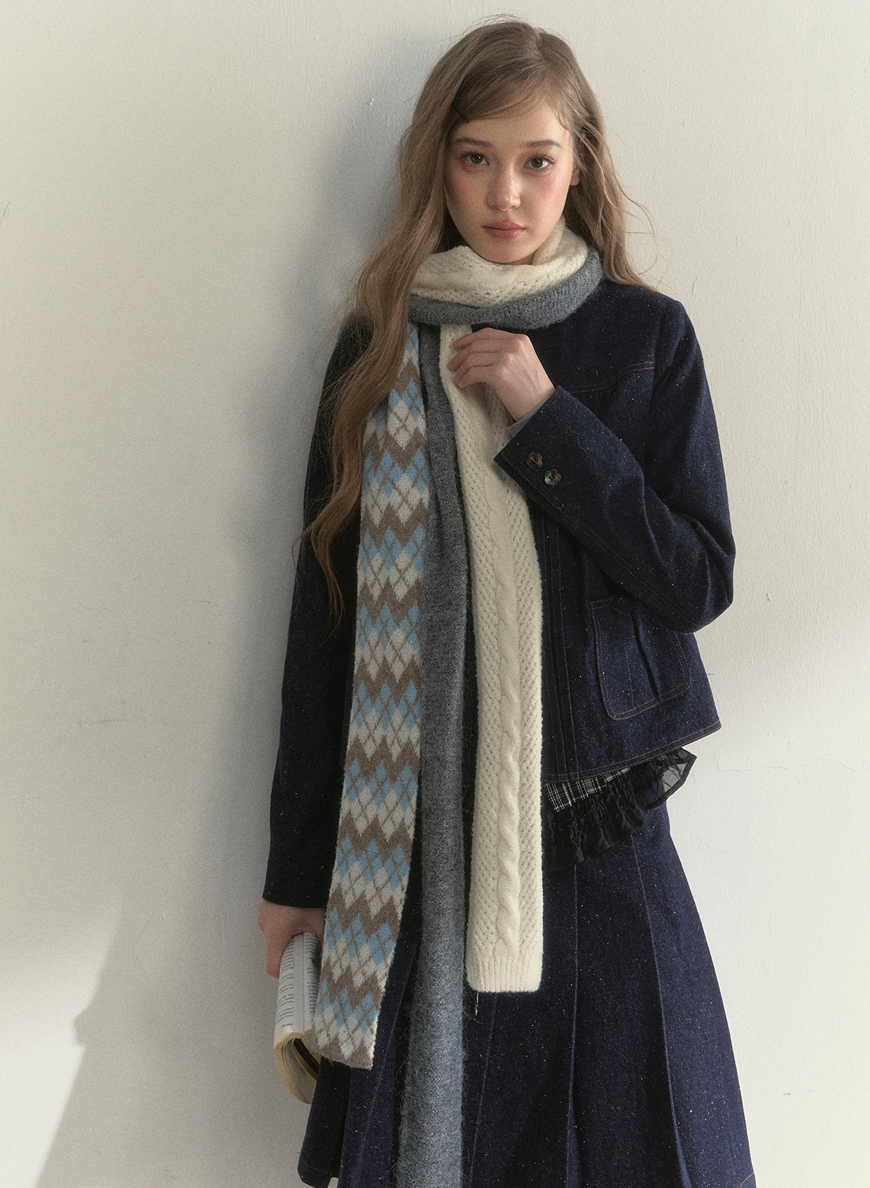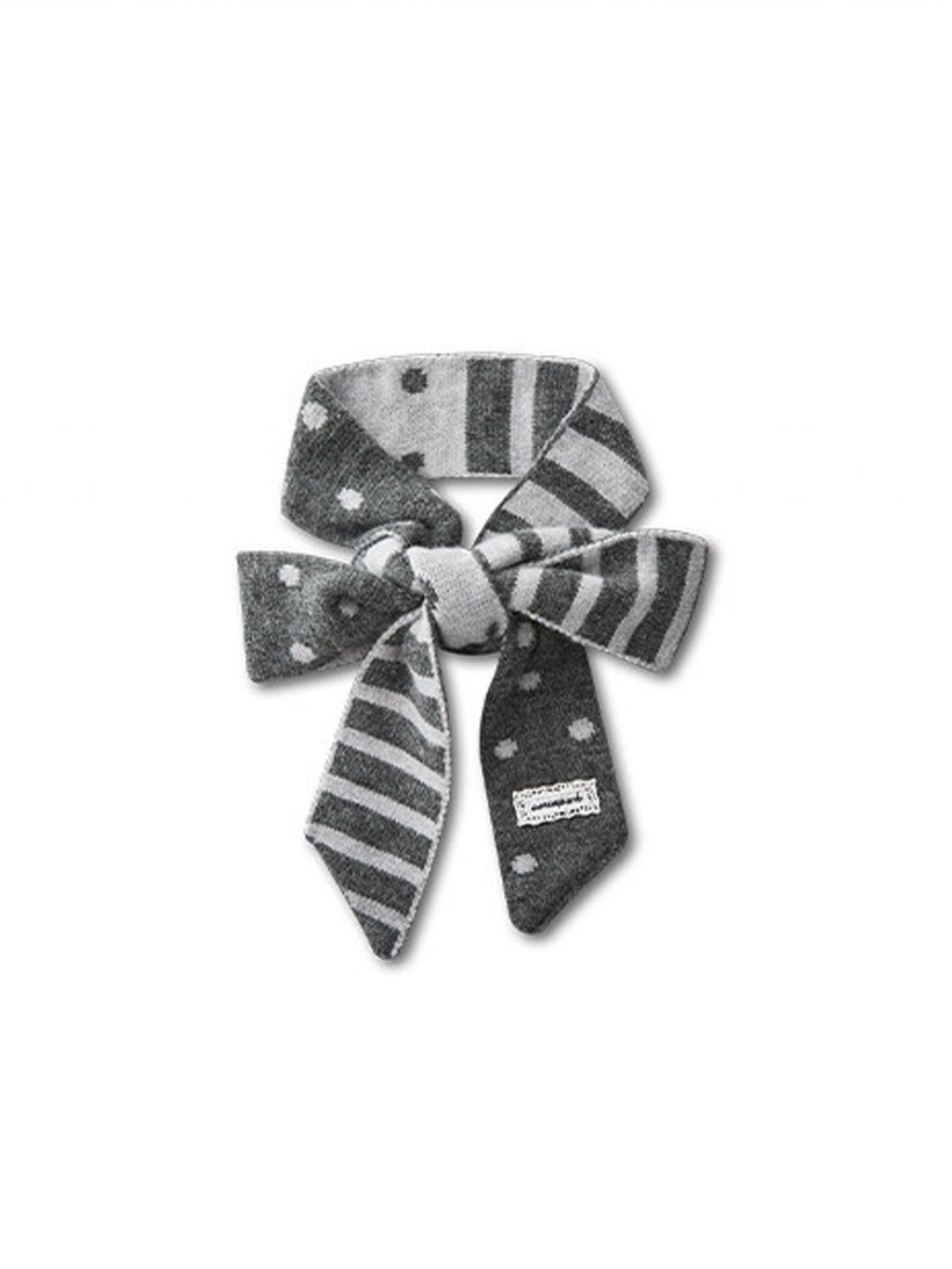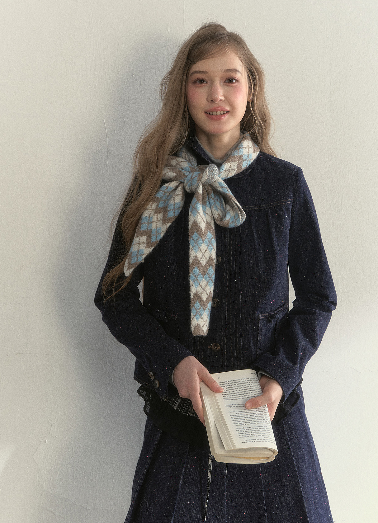 리본처럼 묶어 연출하는 니트 스카프로, 클래식한 룩에 사랑스러운 포인트를 더해줍니다.