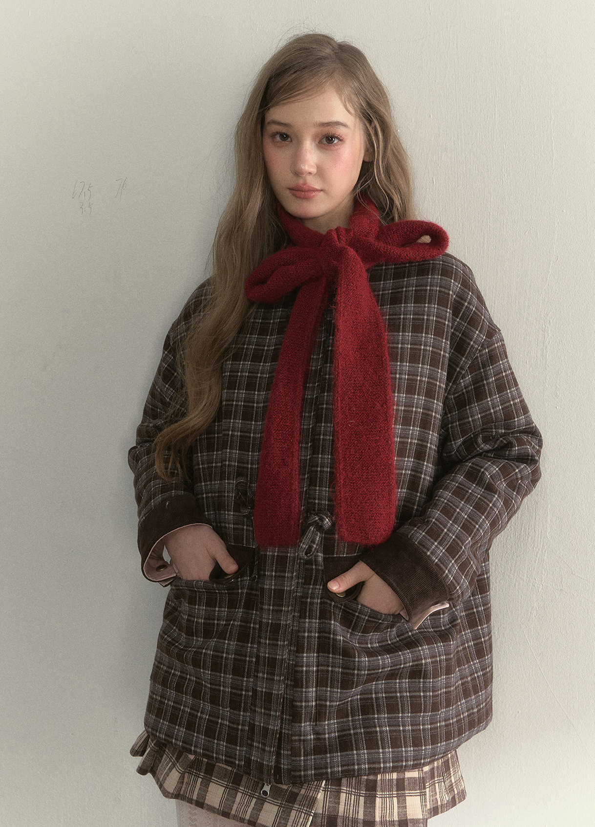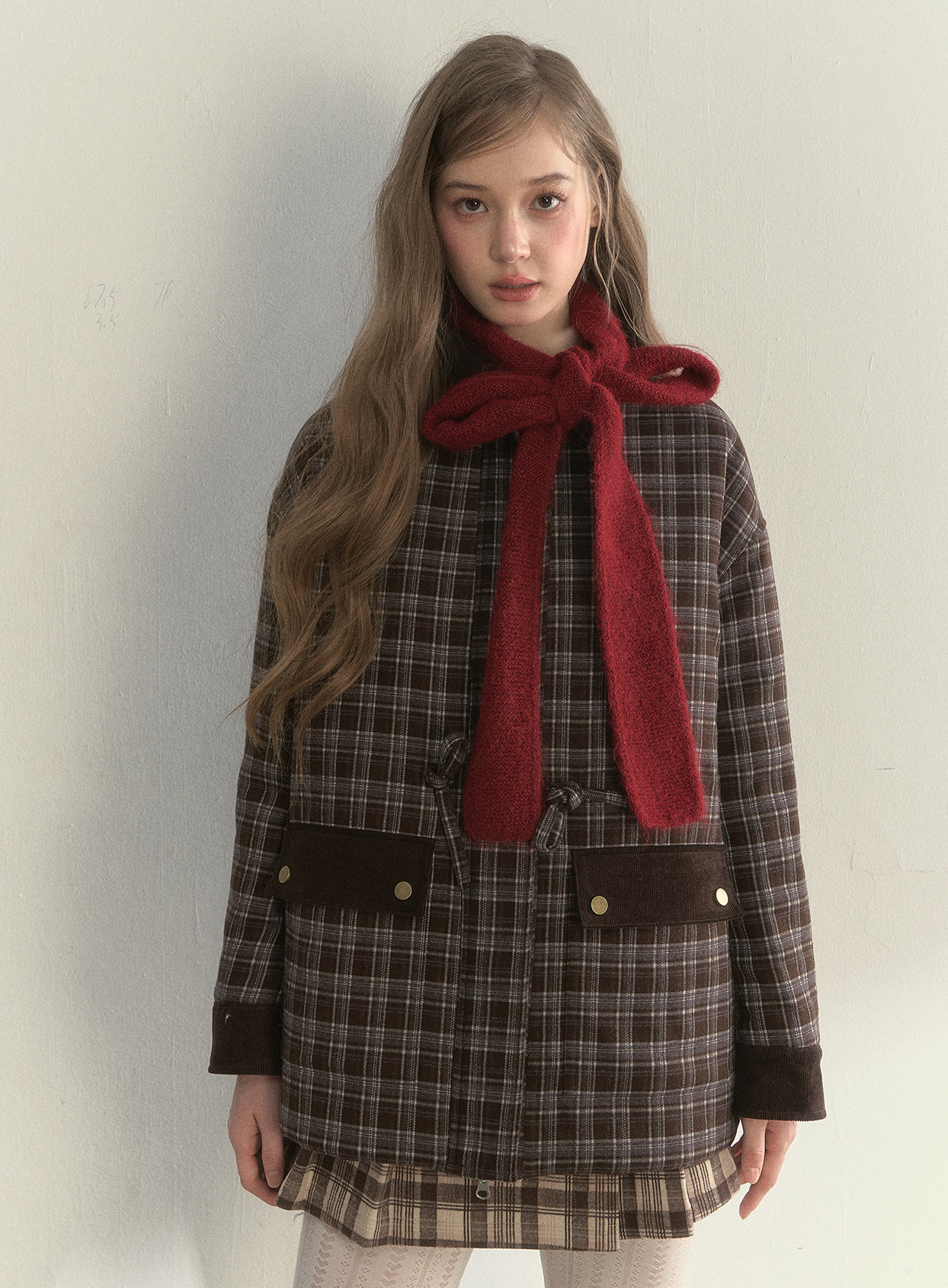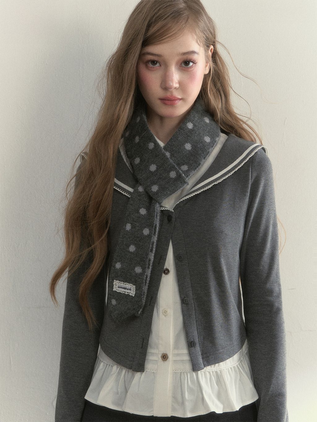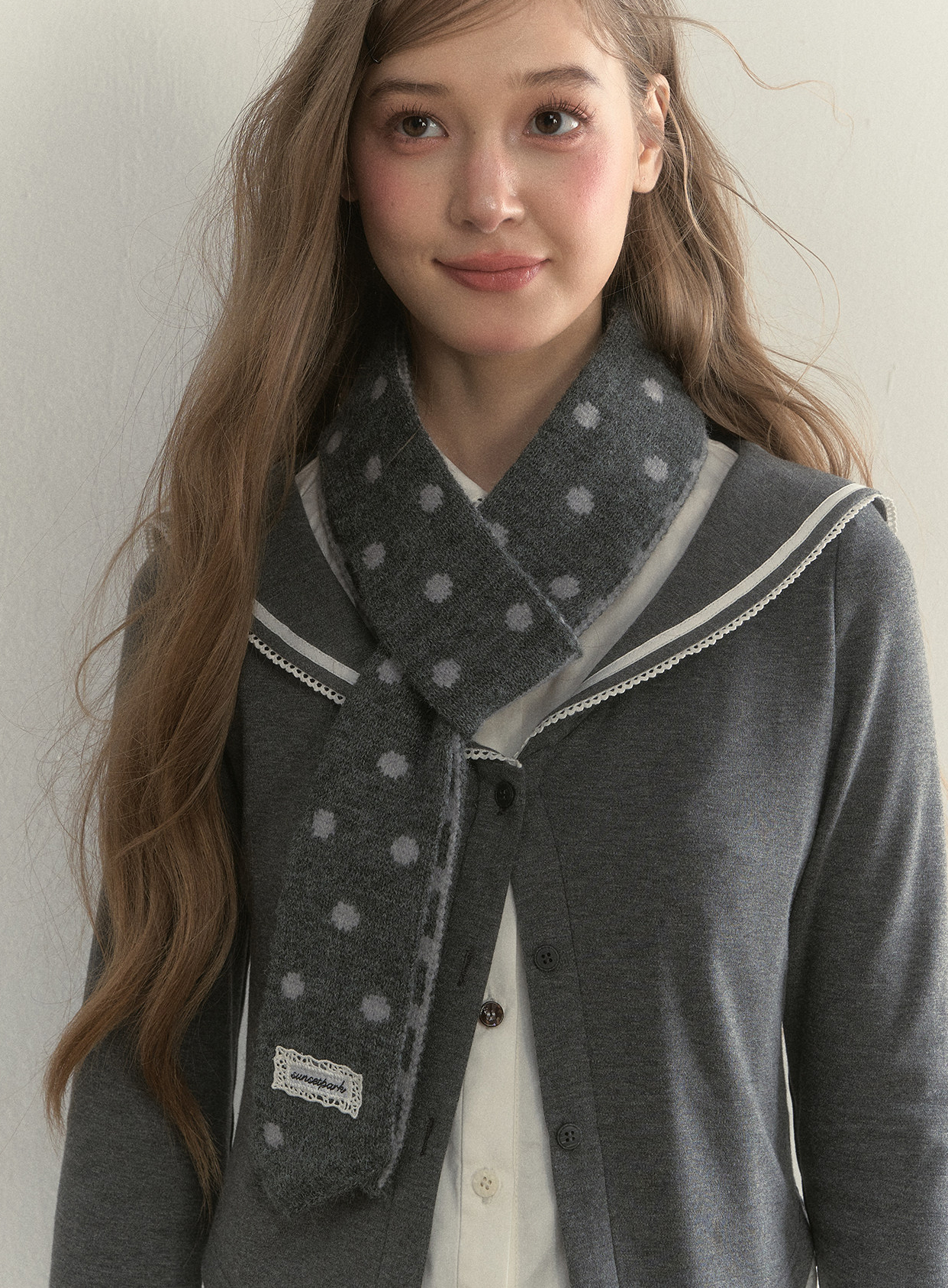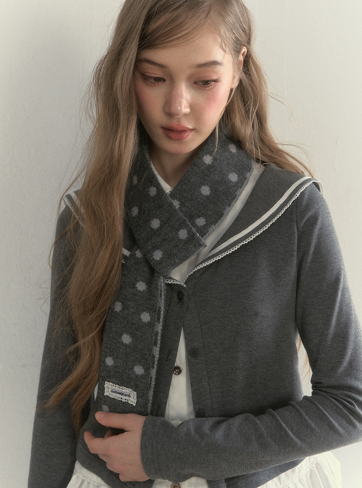리본처럼 묶어 연출하는 니트 스카프로, 클래식한 룩에 사랑스러운 포인트를 더해줍니다.