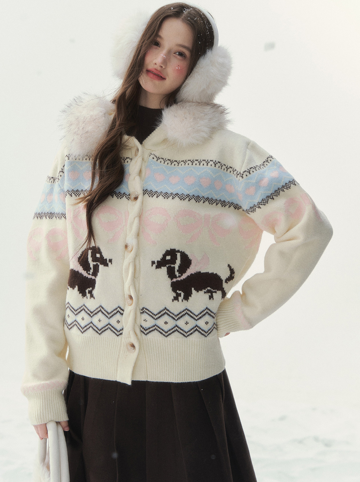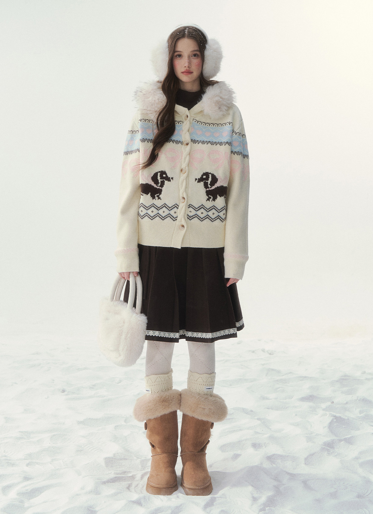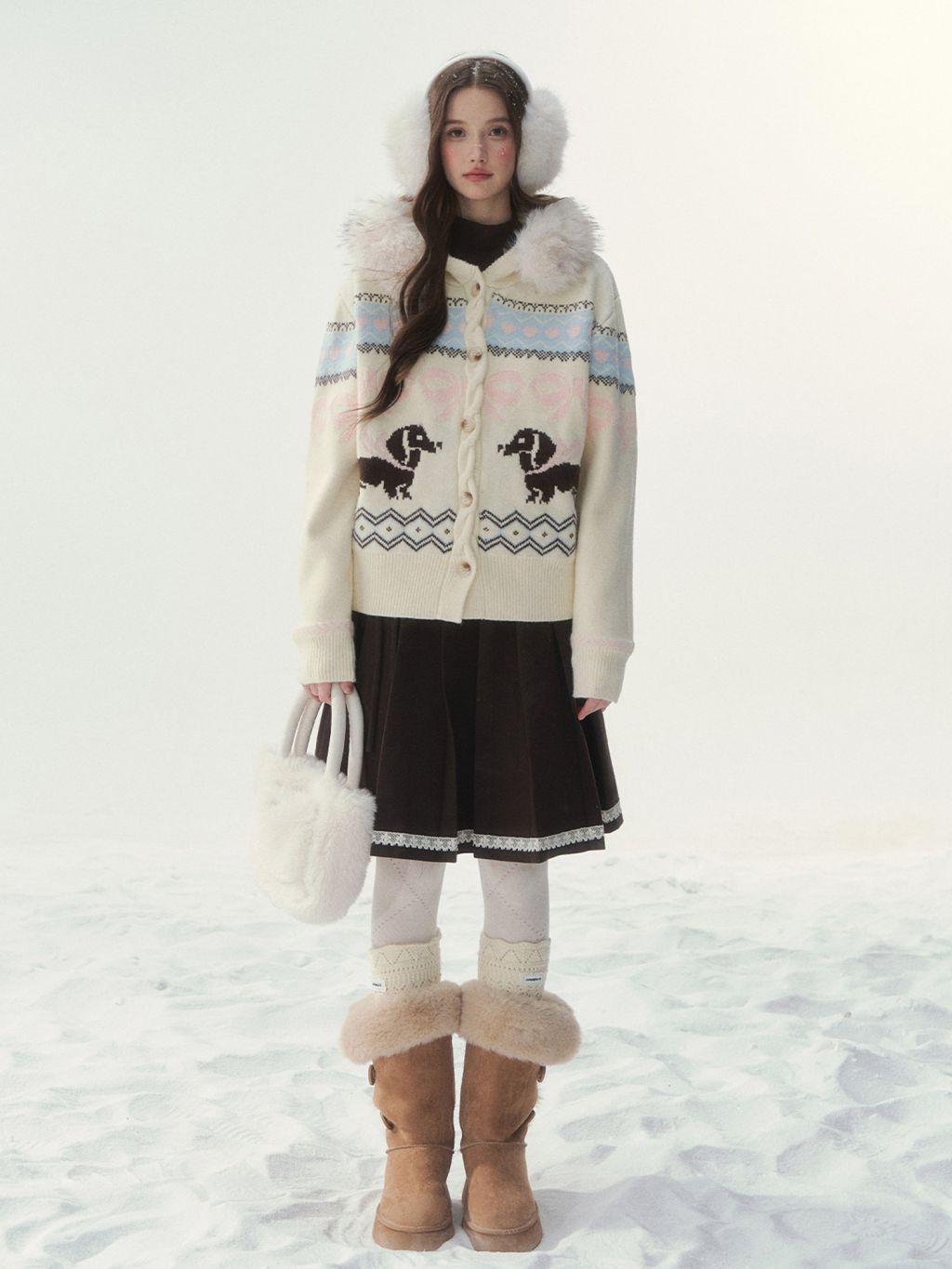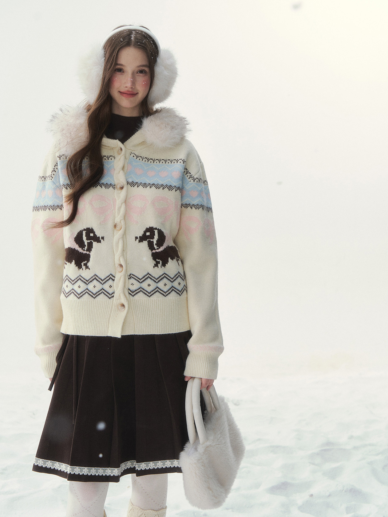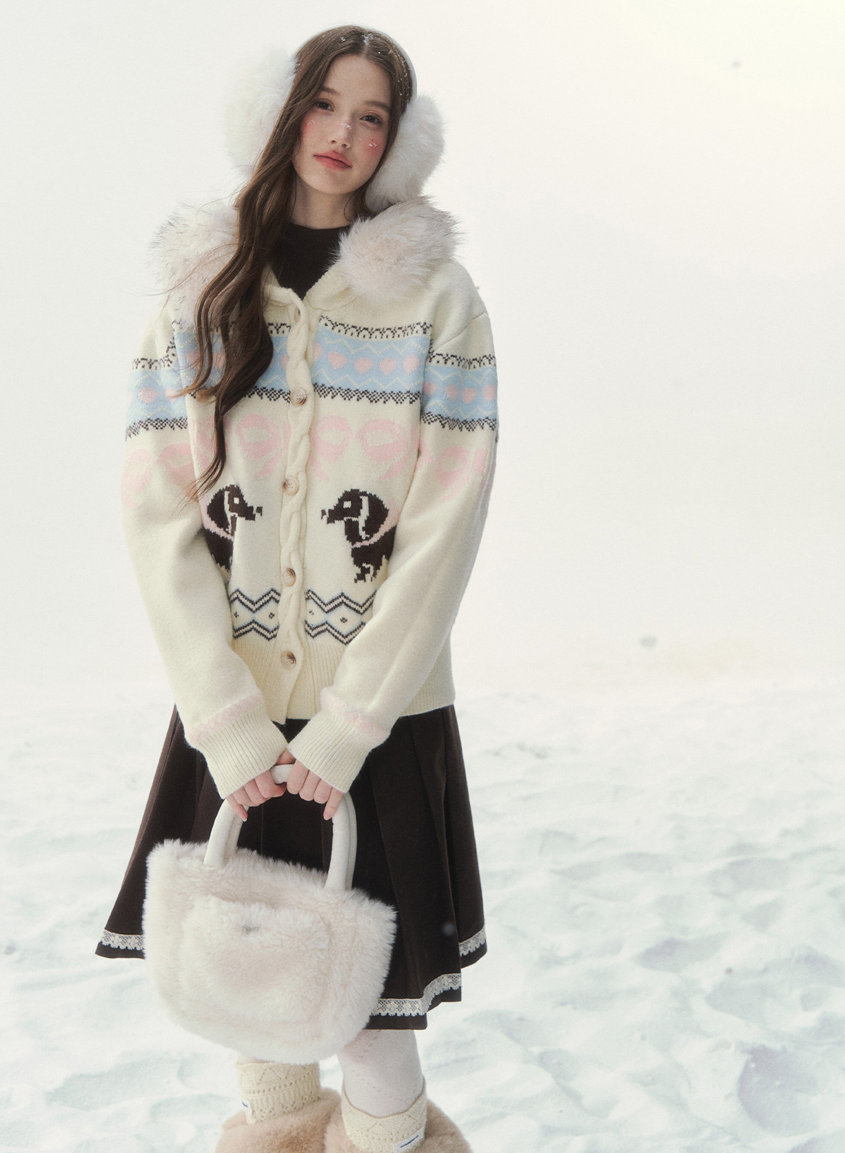 플러피 퍼 칼라와 닥스 그래픽이 어우러진 가디건으로, 포근하고 사랑스러운 윈터 무드를 완성합니다.