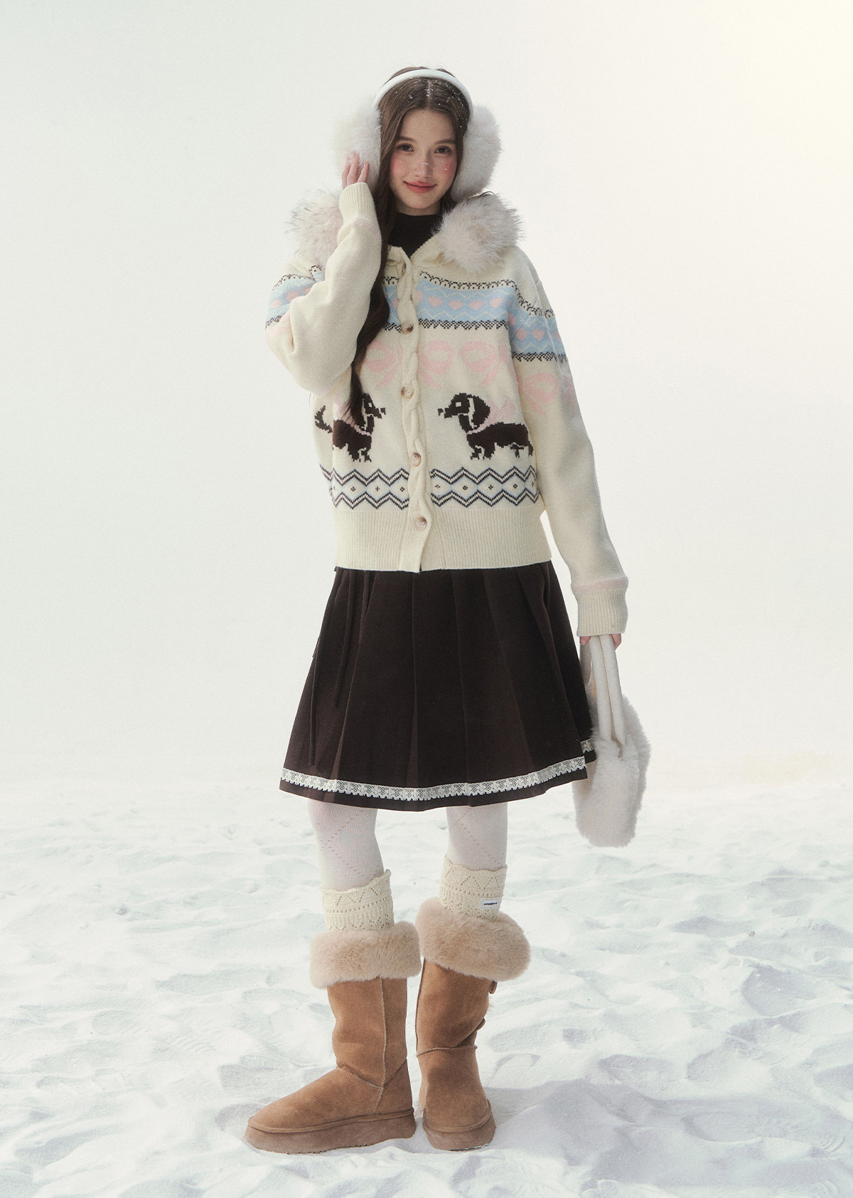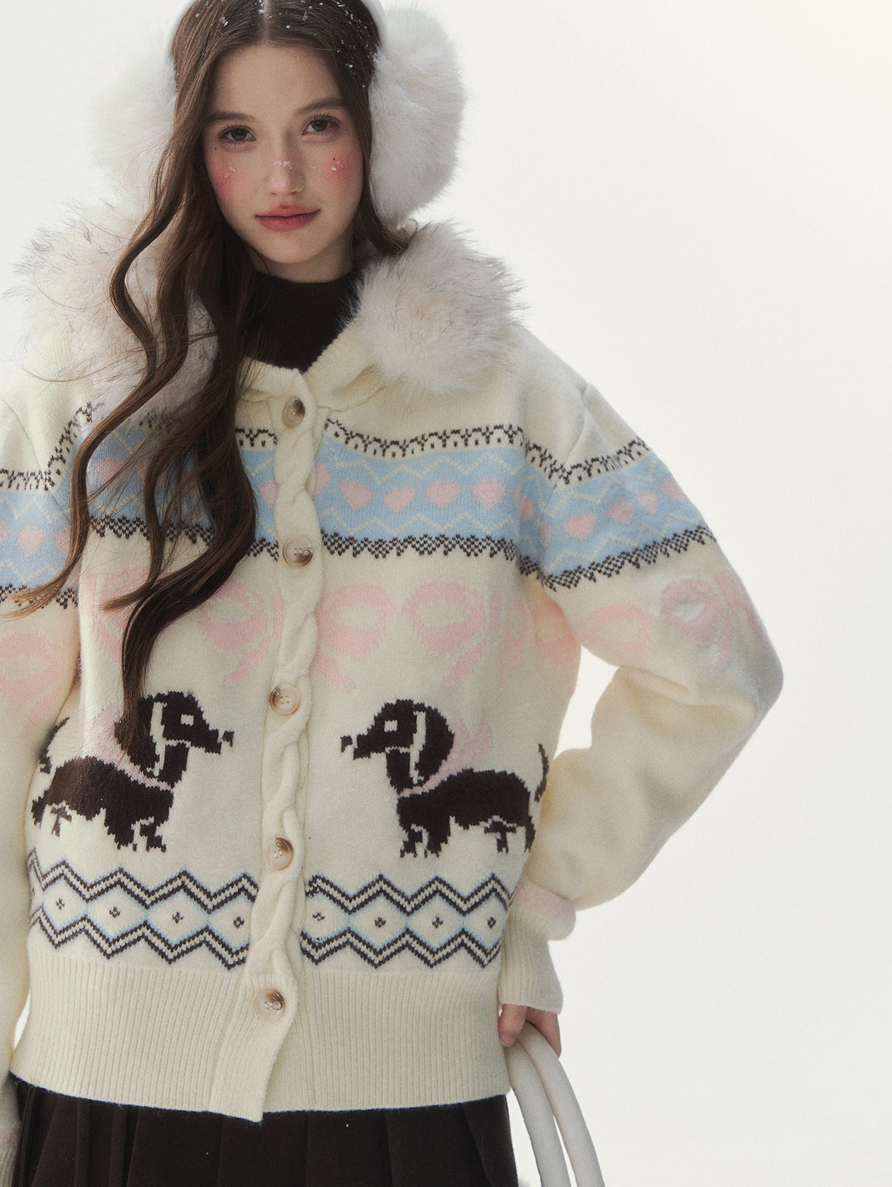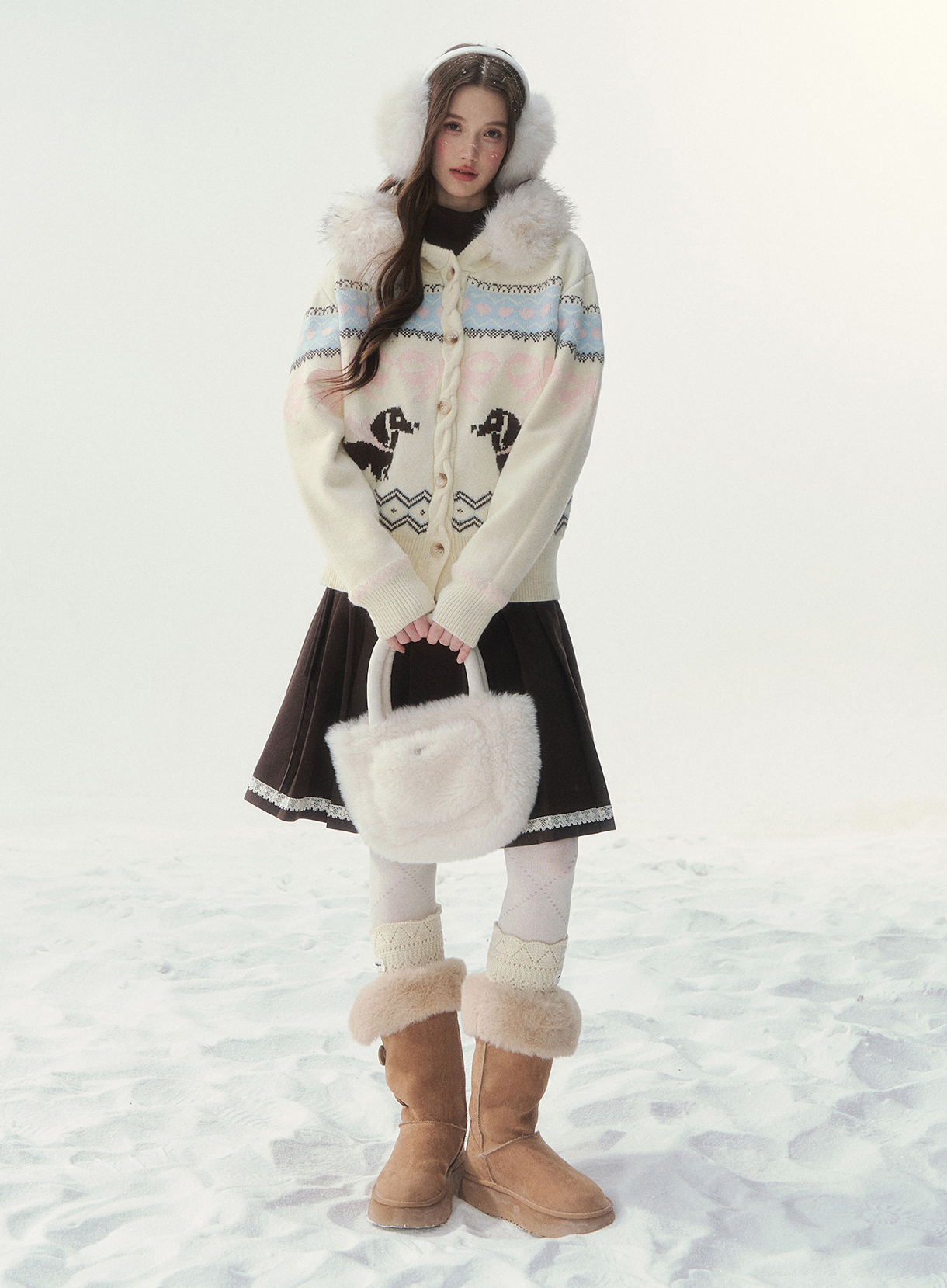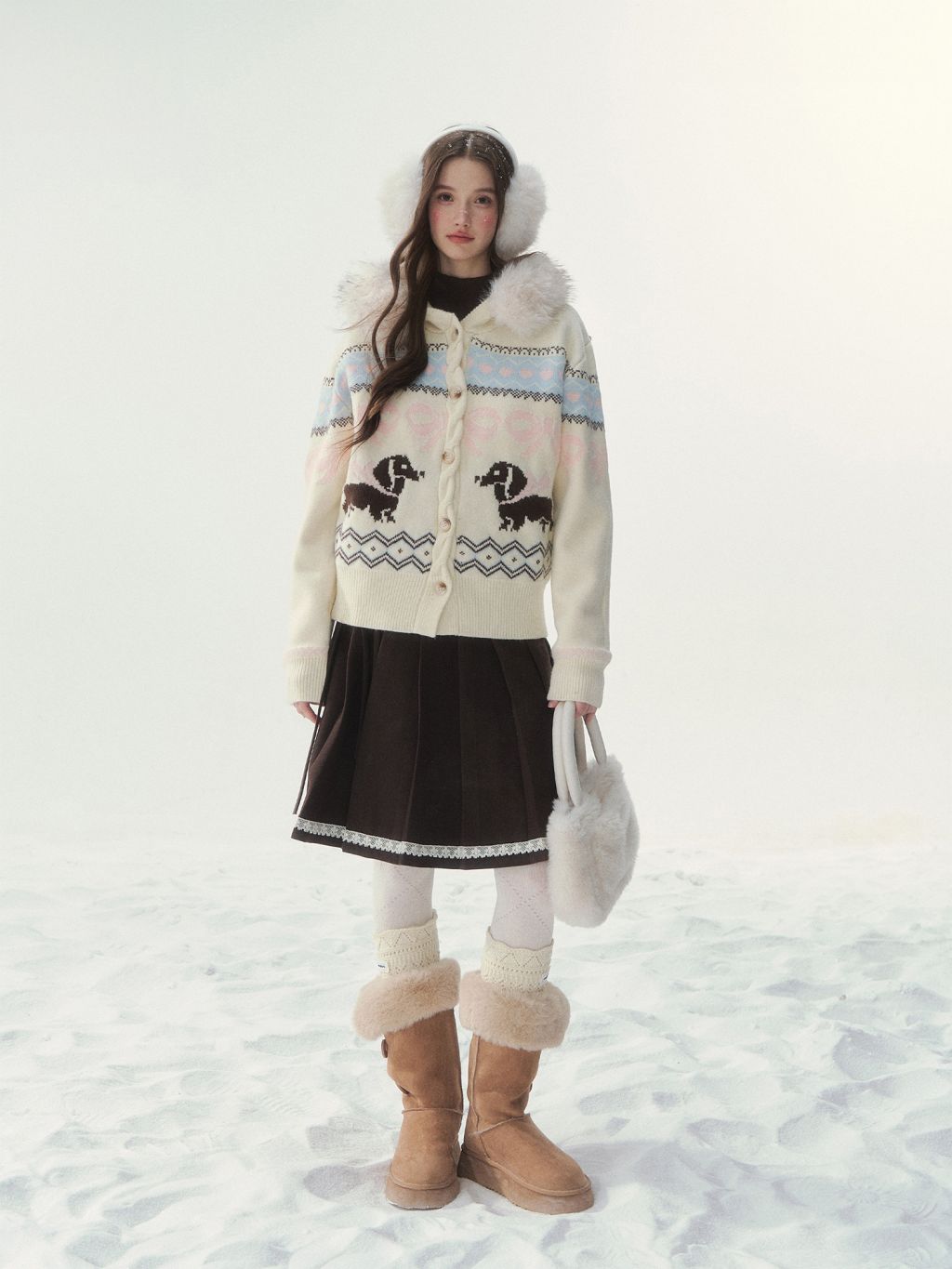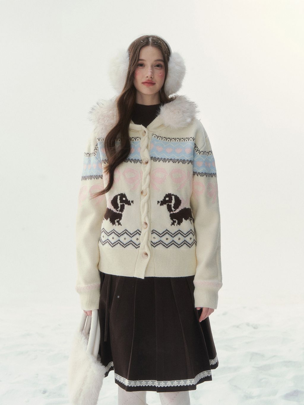 플러피 퍼 칼라와 닥스 그래픽이 어우러진 가디건으로, 포근하고 사랑스러운 윈터 무드를 완성합니다.