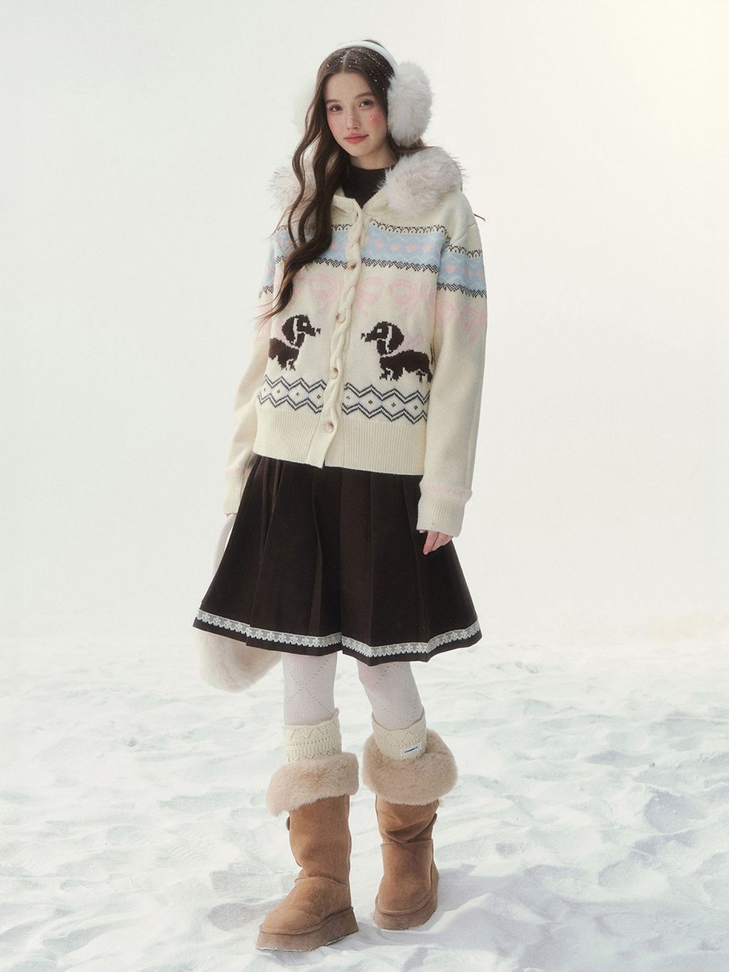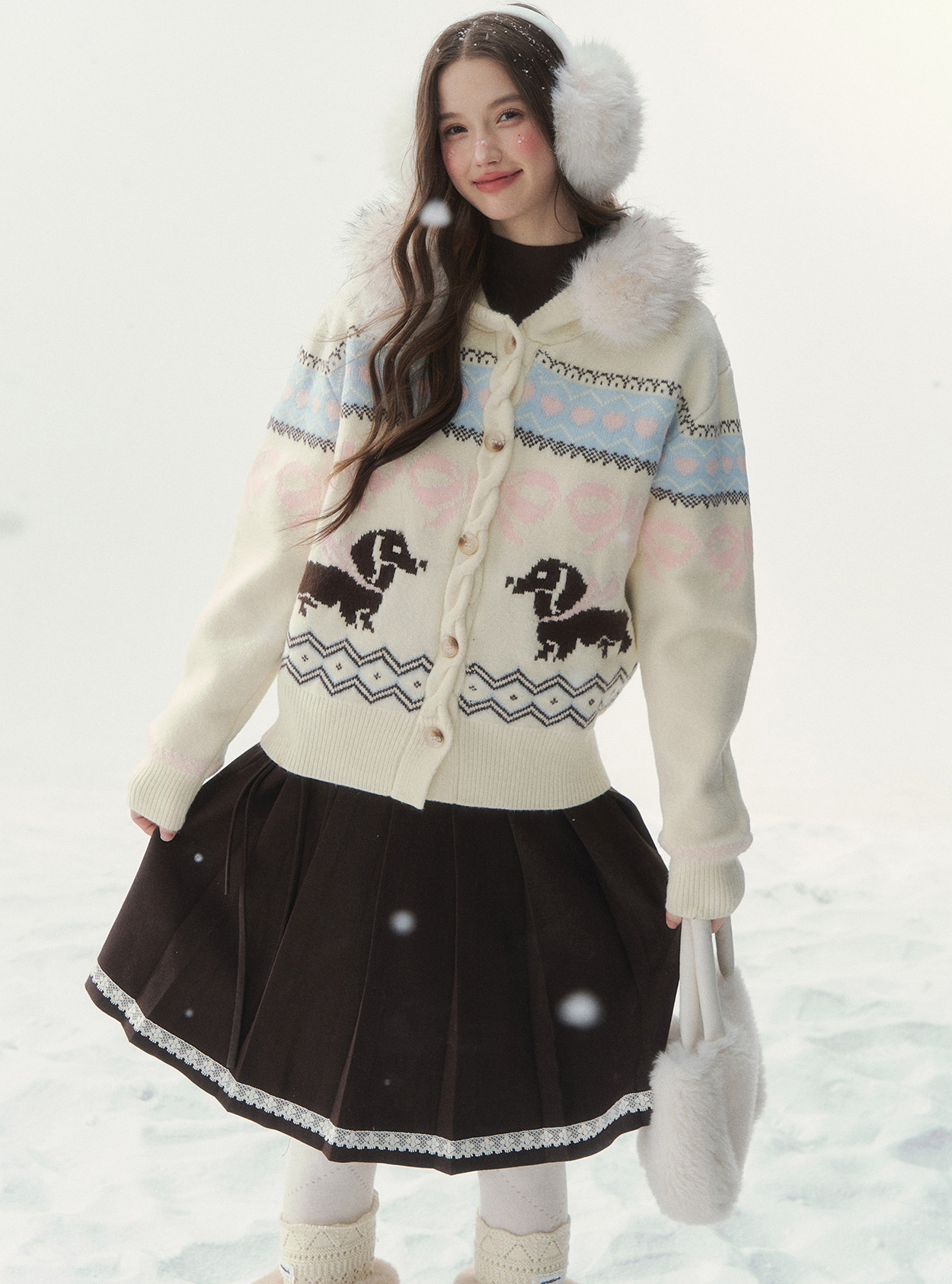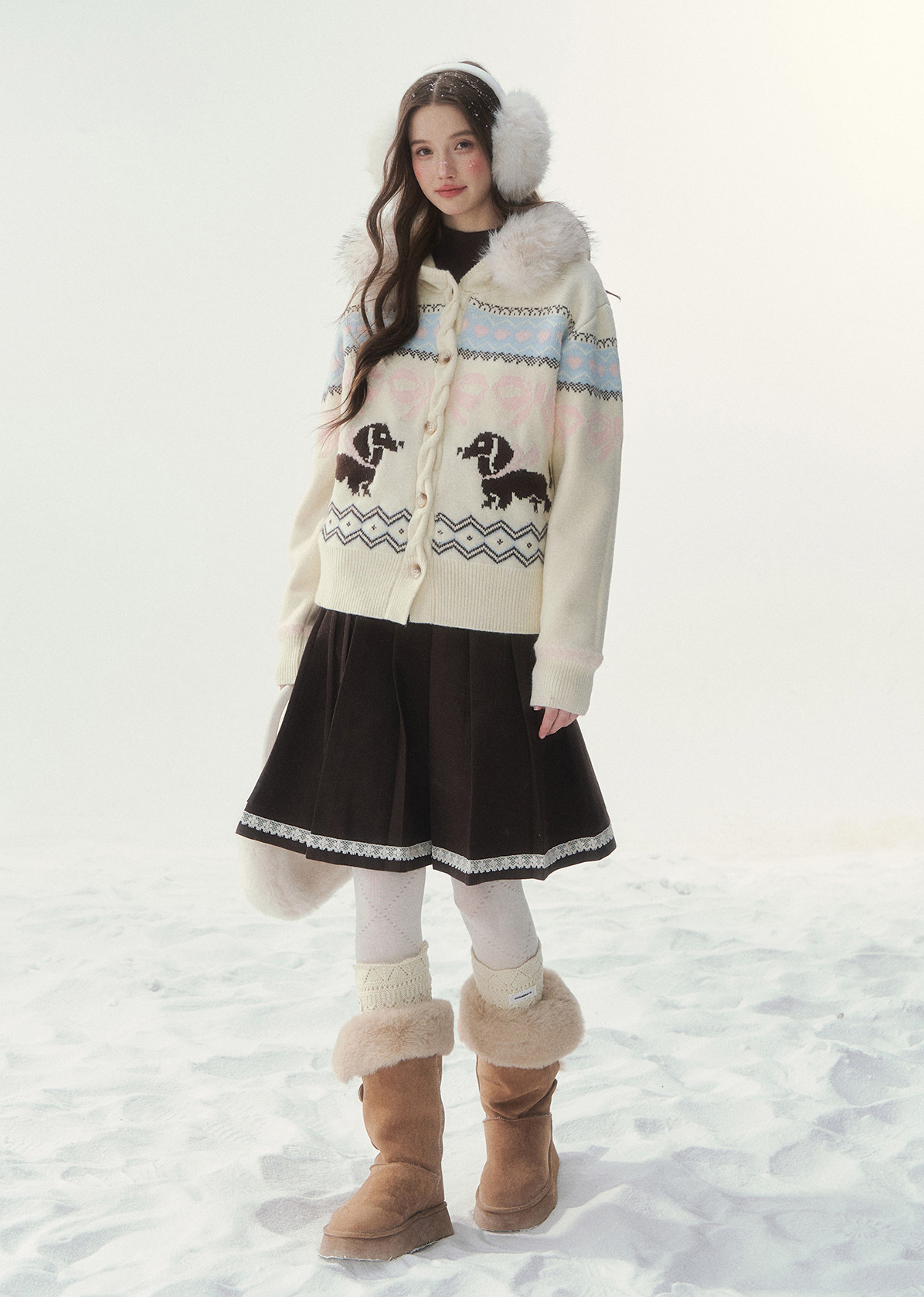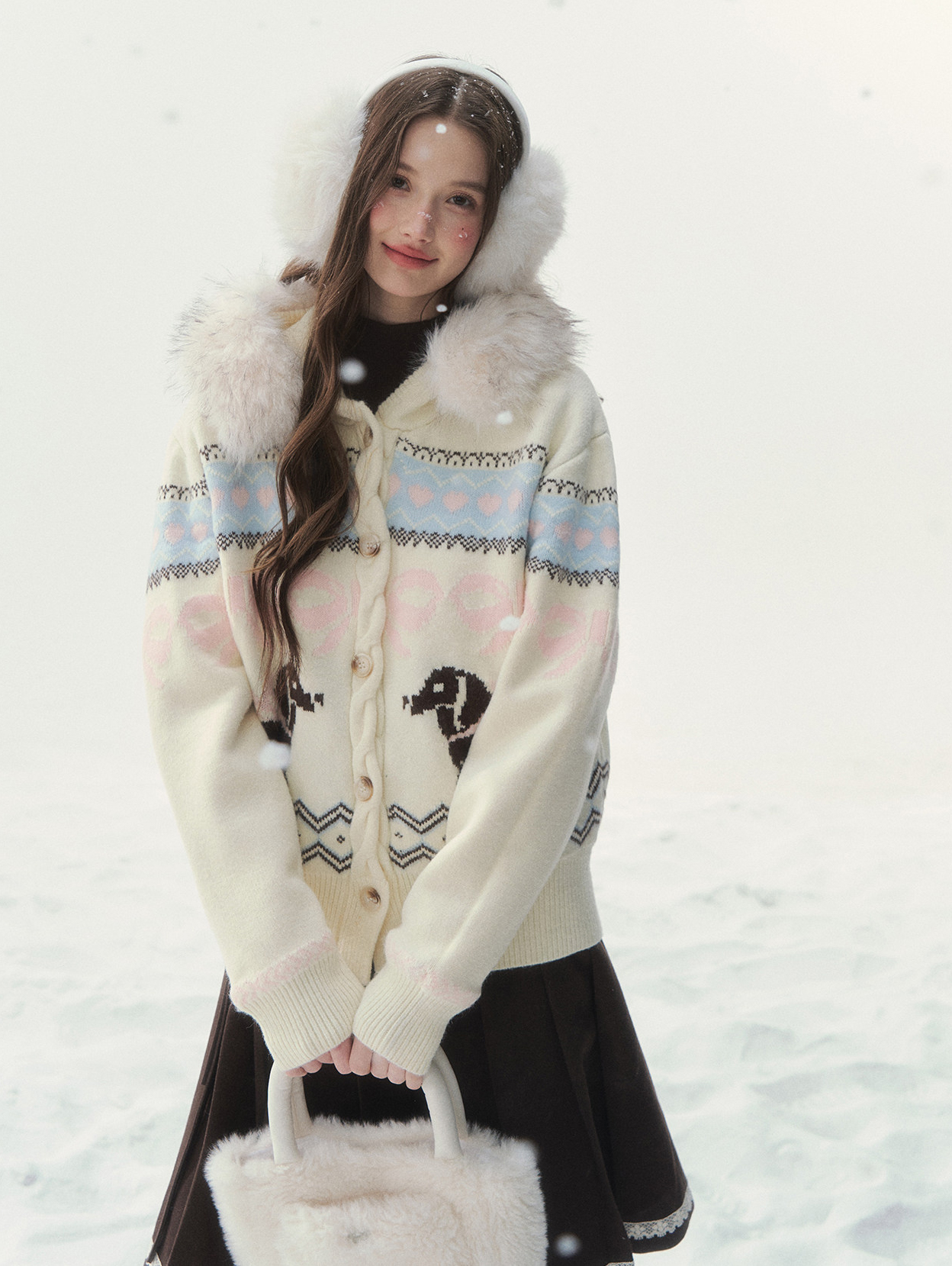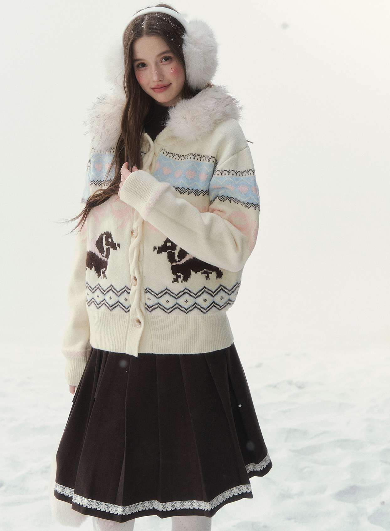 플러피 퍼 칼라와 닥스 그래픽이 어우러진 가디건으로, 포근하고 사랑스러운 윈터 무드를 완성합니다.