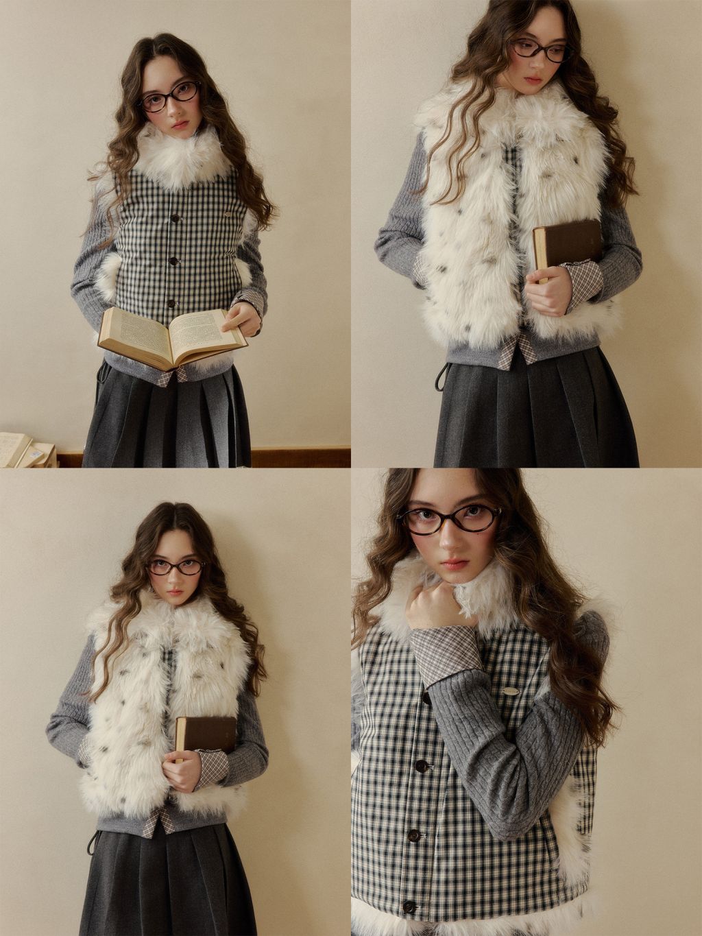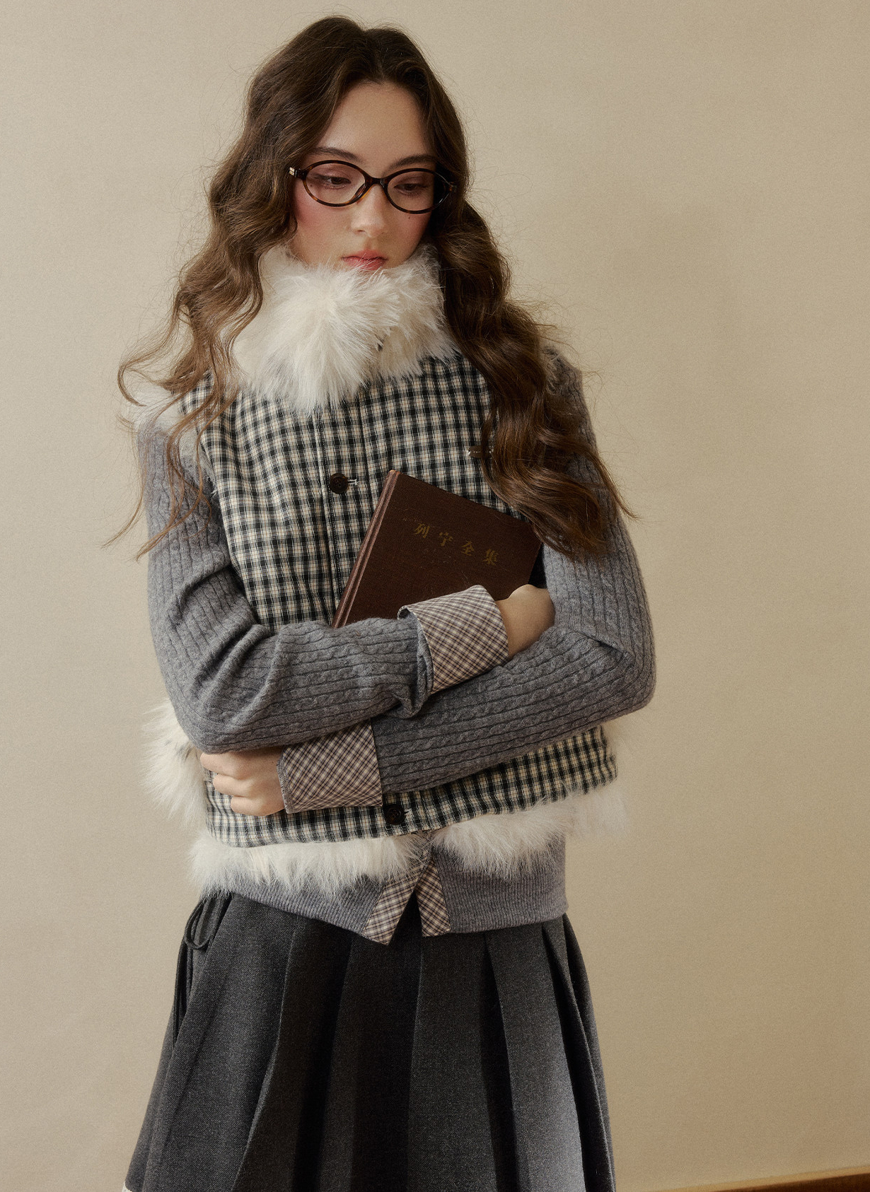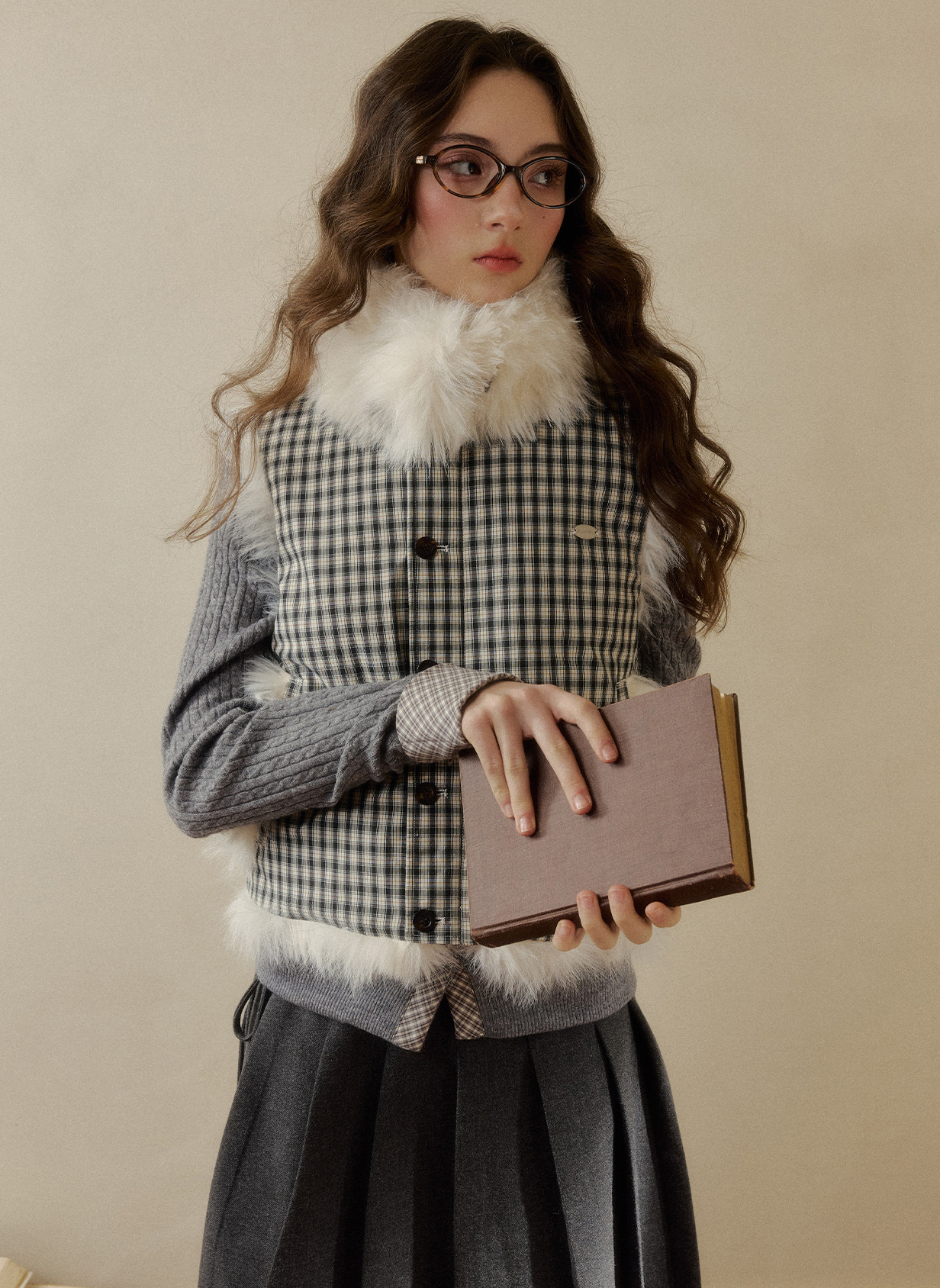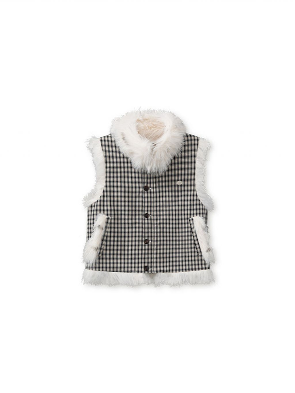 밀크 톤 퍼와 체크 텍스처를 리버서블로 즐기는 베스트로, 겨울 레이어드에 포근한 포인트를 더합니다.