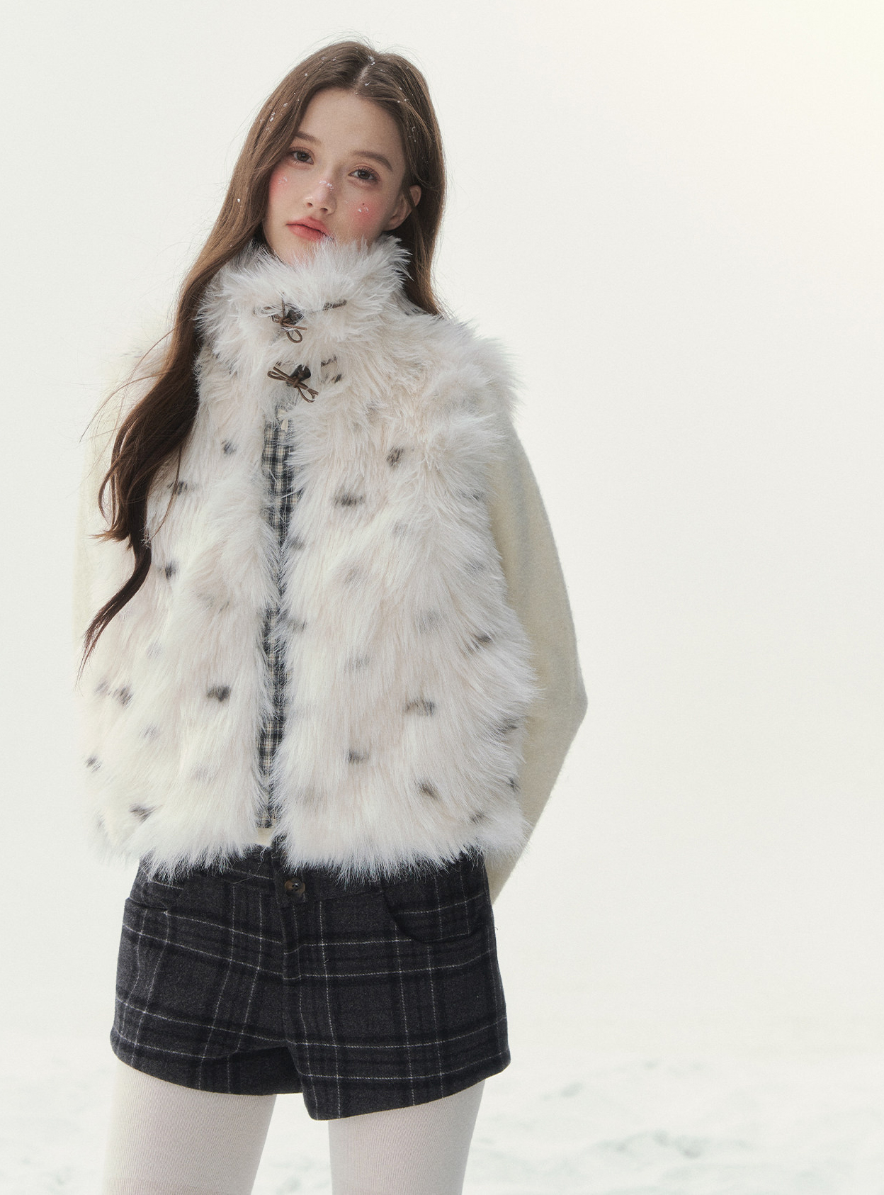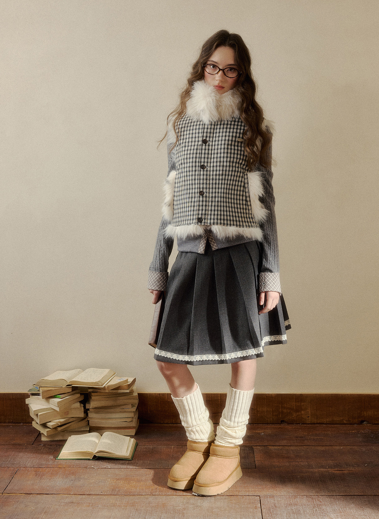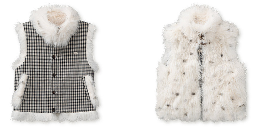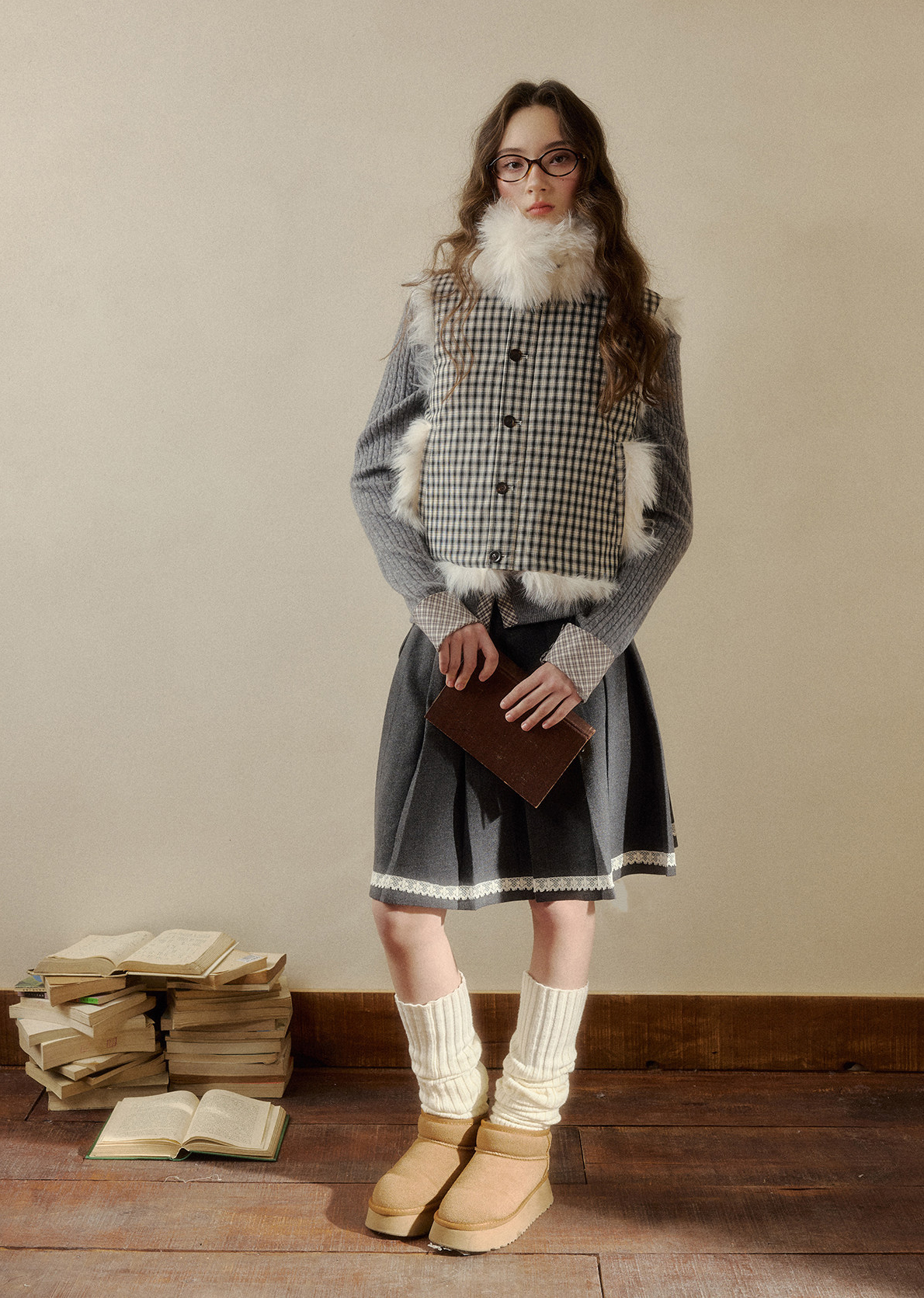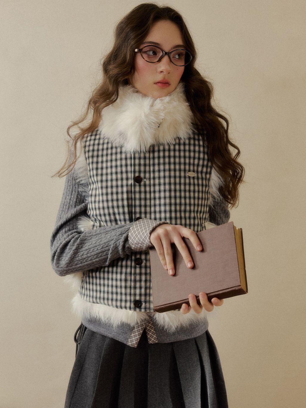 밀크 톤 퍼와 체크 텍스처를 리버서블로 즐기는 베스트로, 겨울 레이어드에 포근한 포인트를 더합니다.