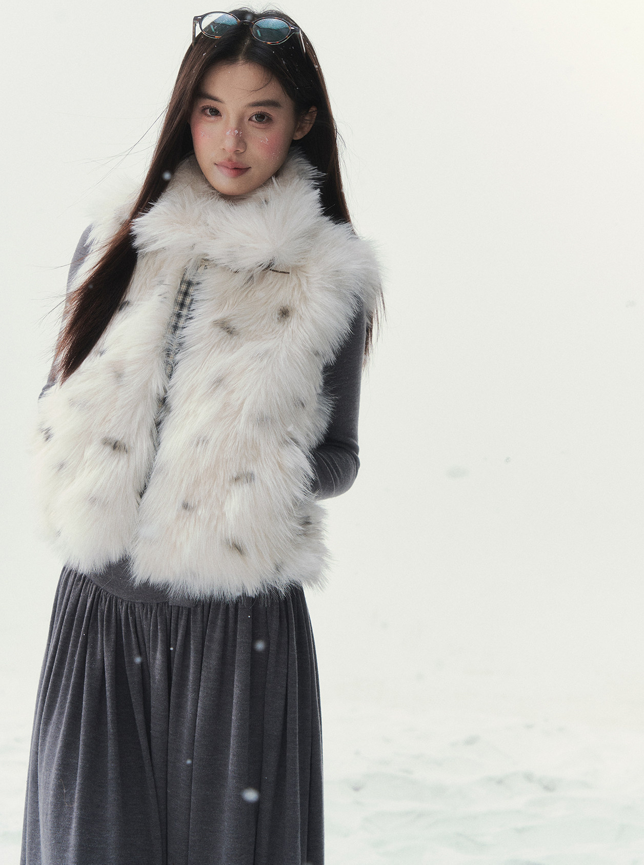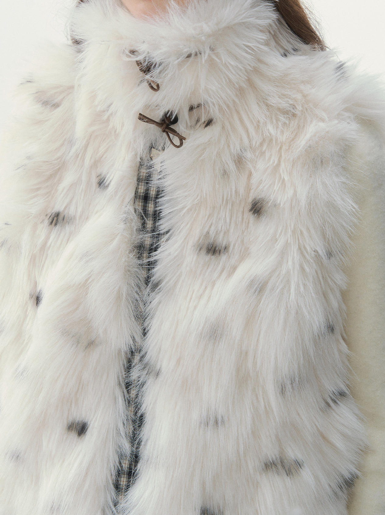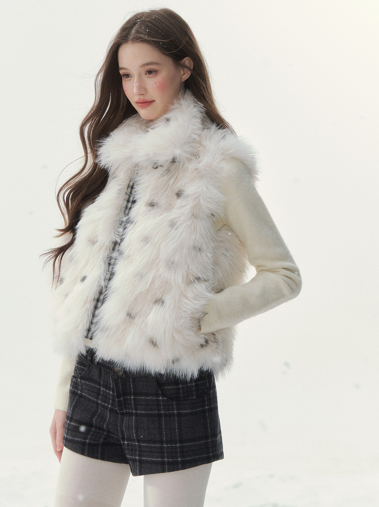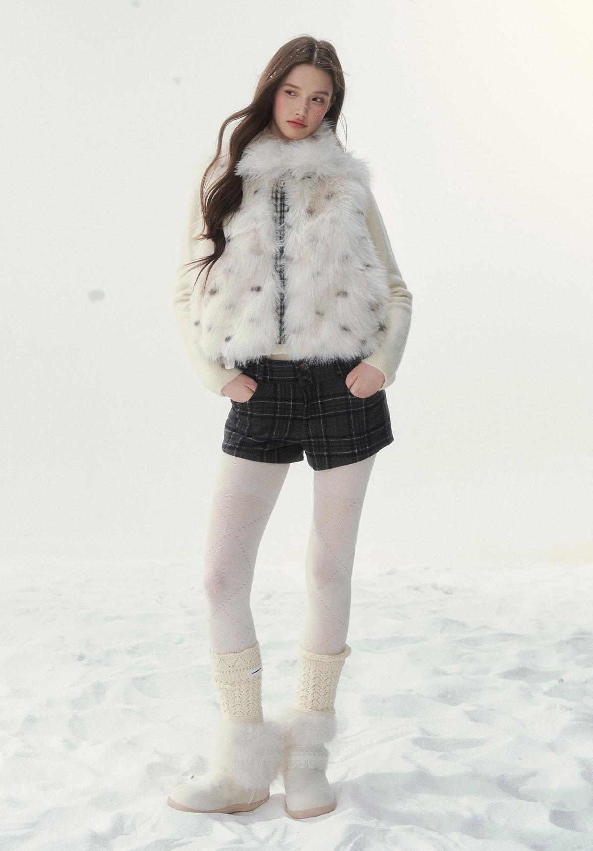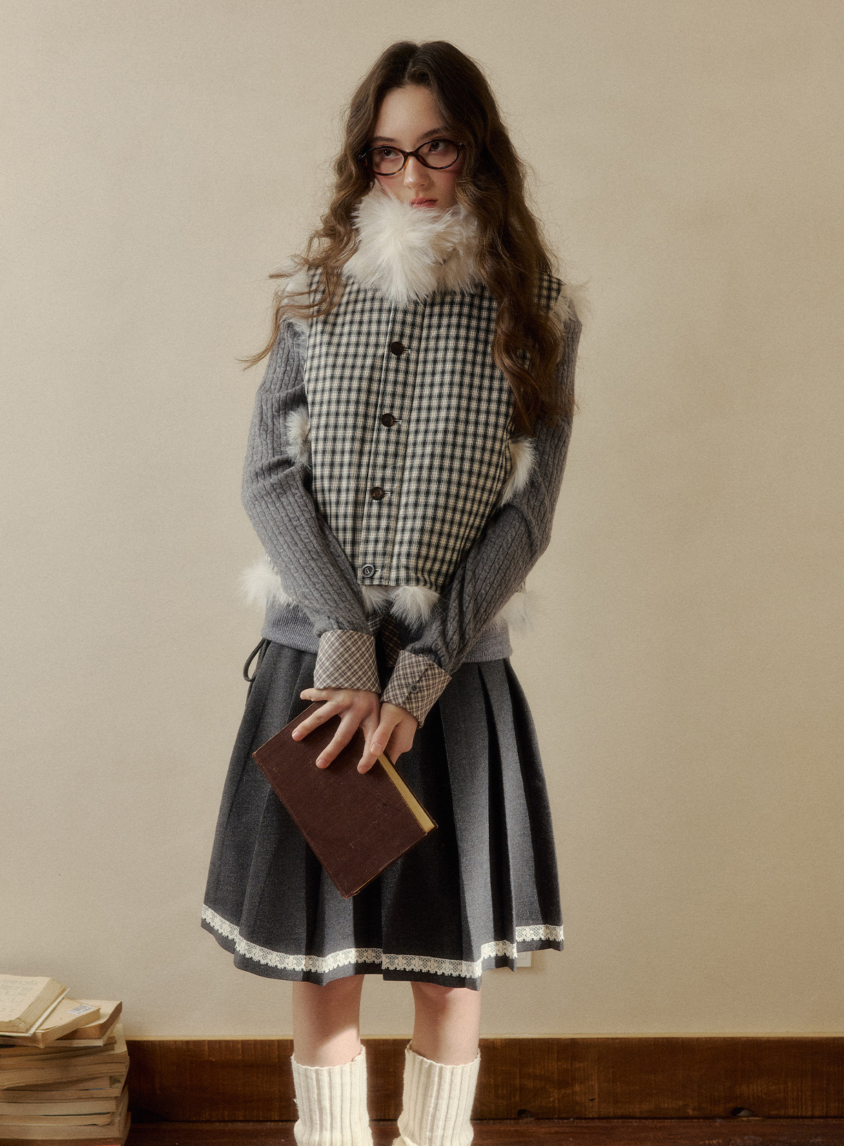 밀크 톤 퍼와 체크 텍스처를 리버서블로 즐기는 베스트로, 겨울 레이어드에 포근한 포인트를 더합니다.