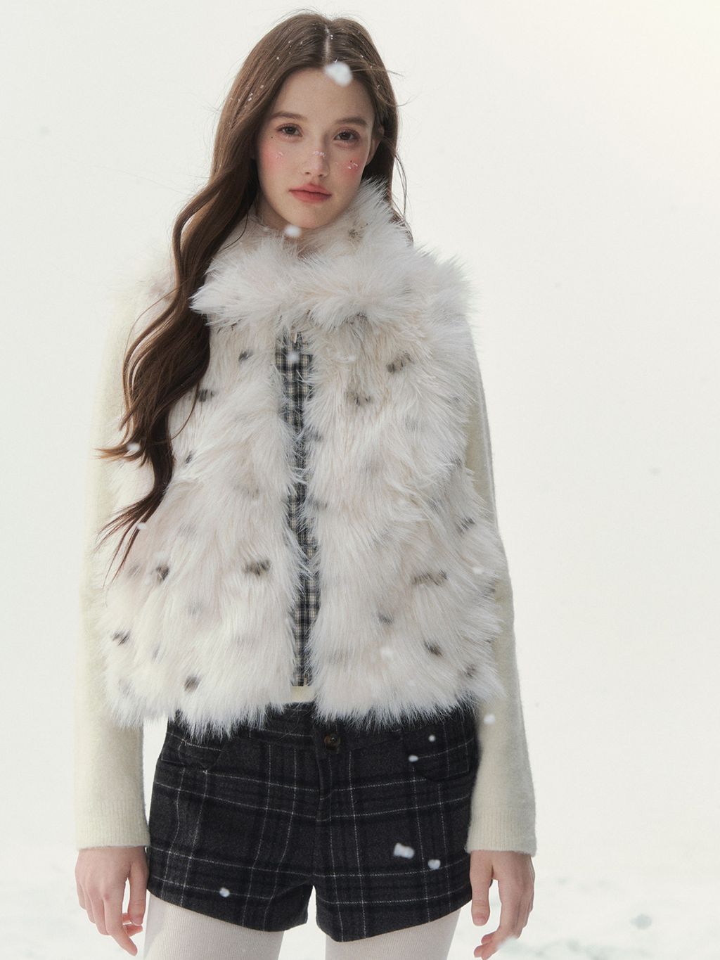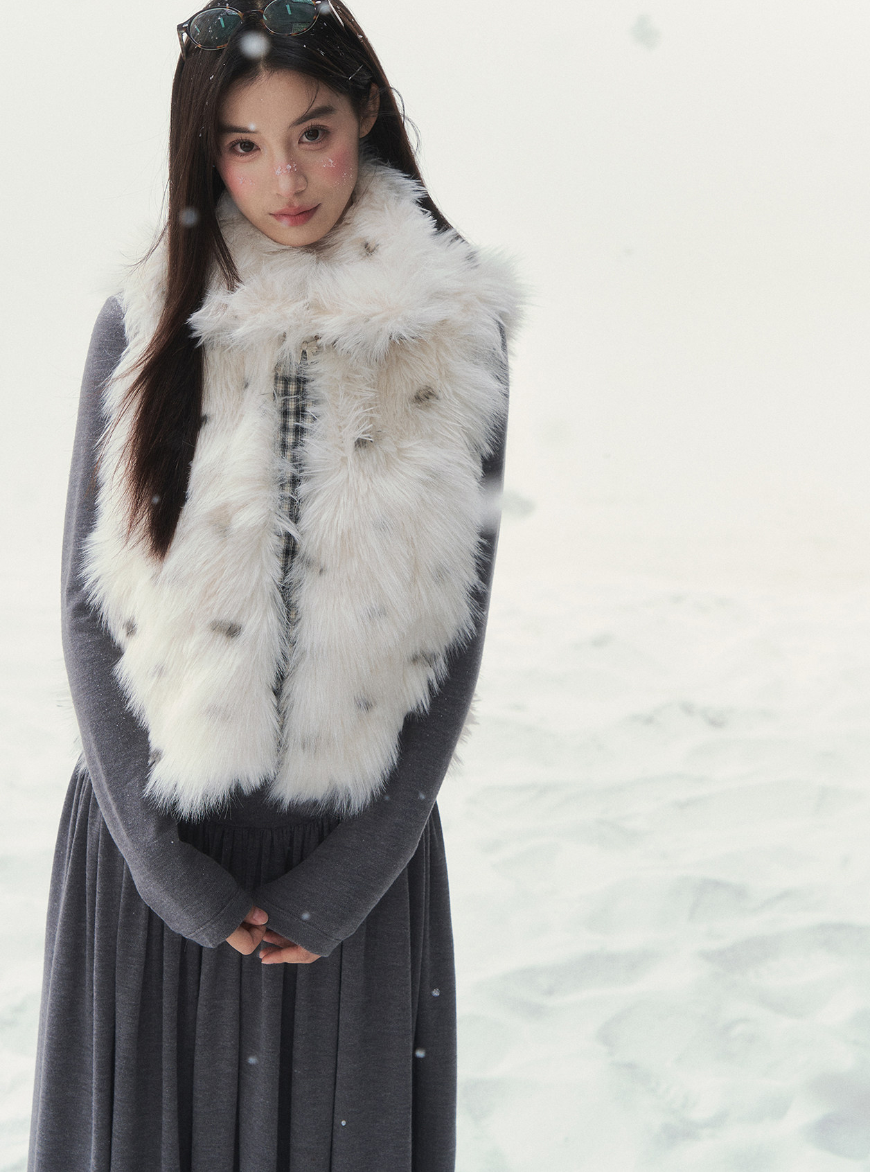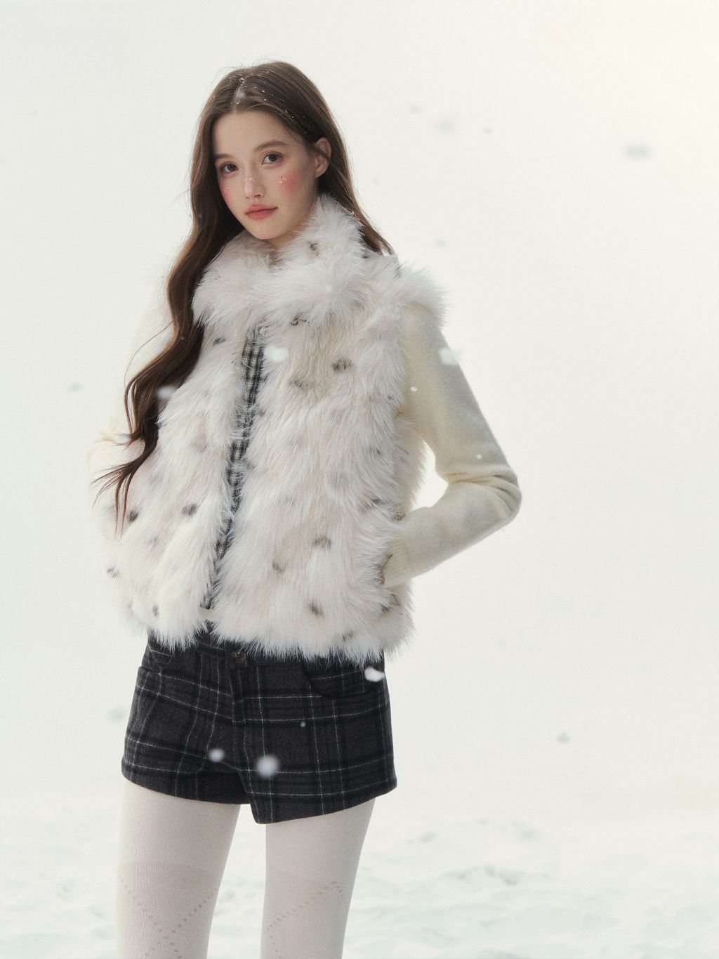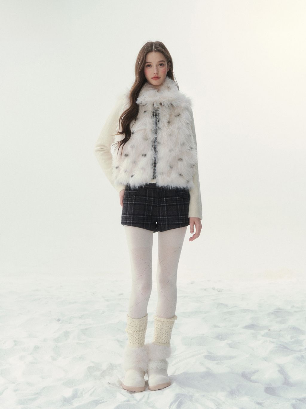 밀크 톤 퍼와 체크 텍스처를 리버서블로 즐기는 베스트로, 겨울 레이어드에 포근한 포인트를 더합니다.