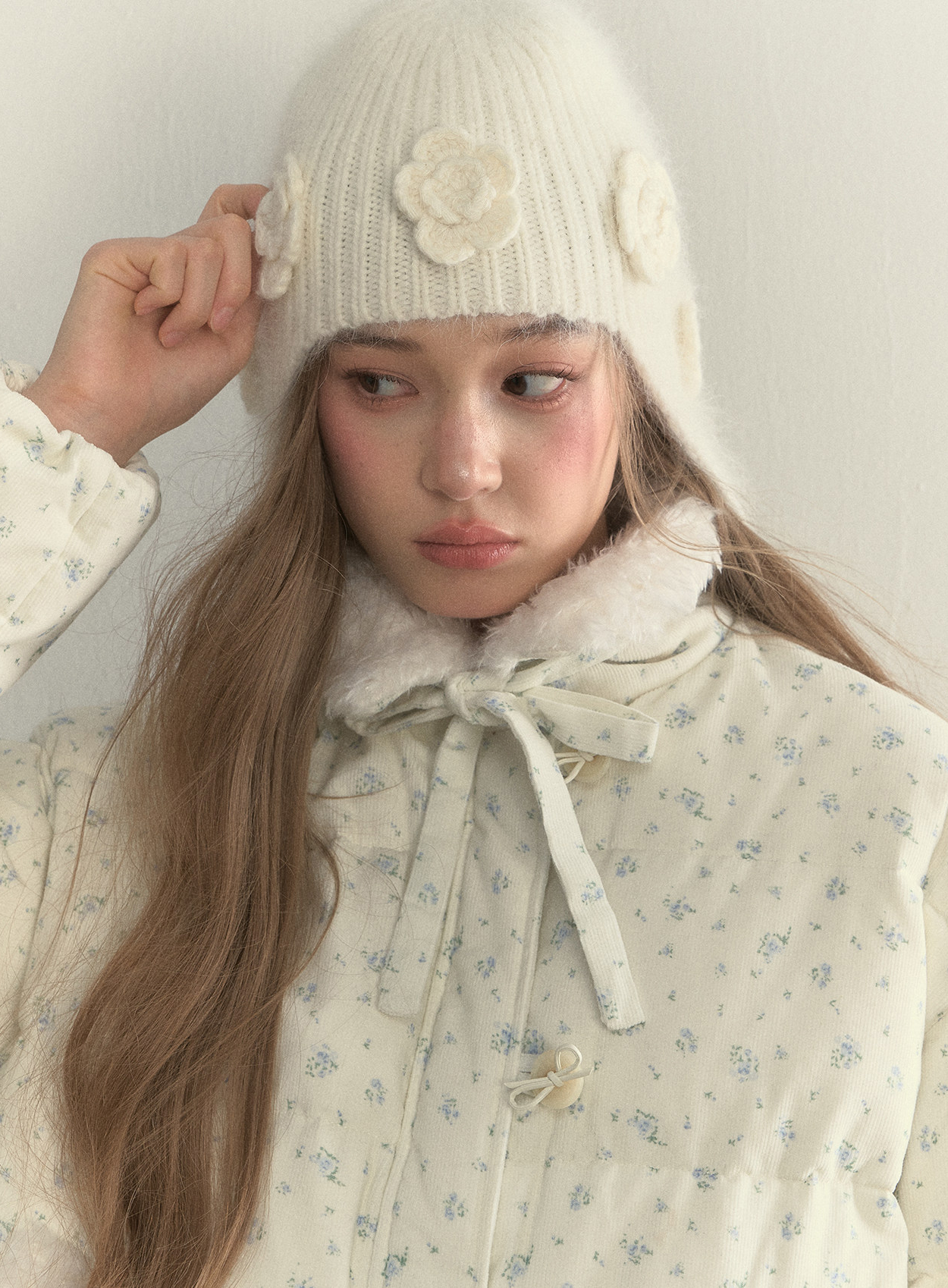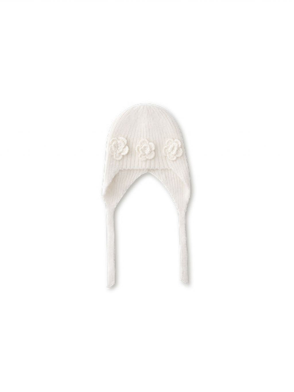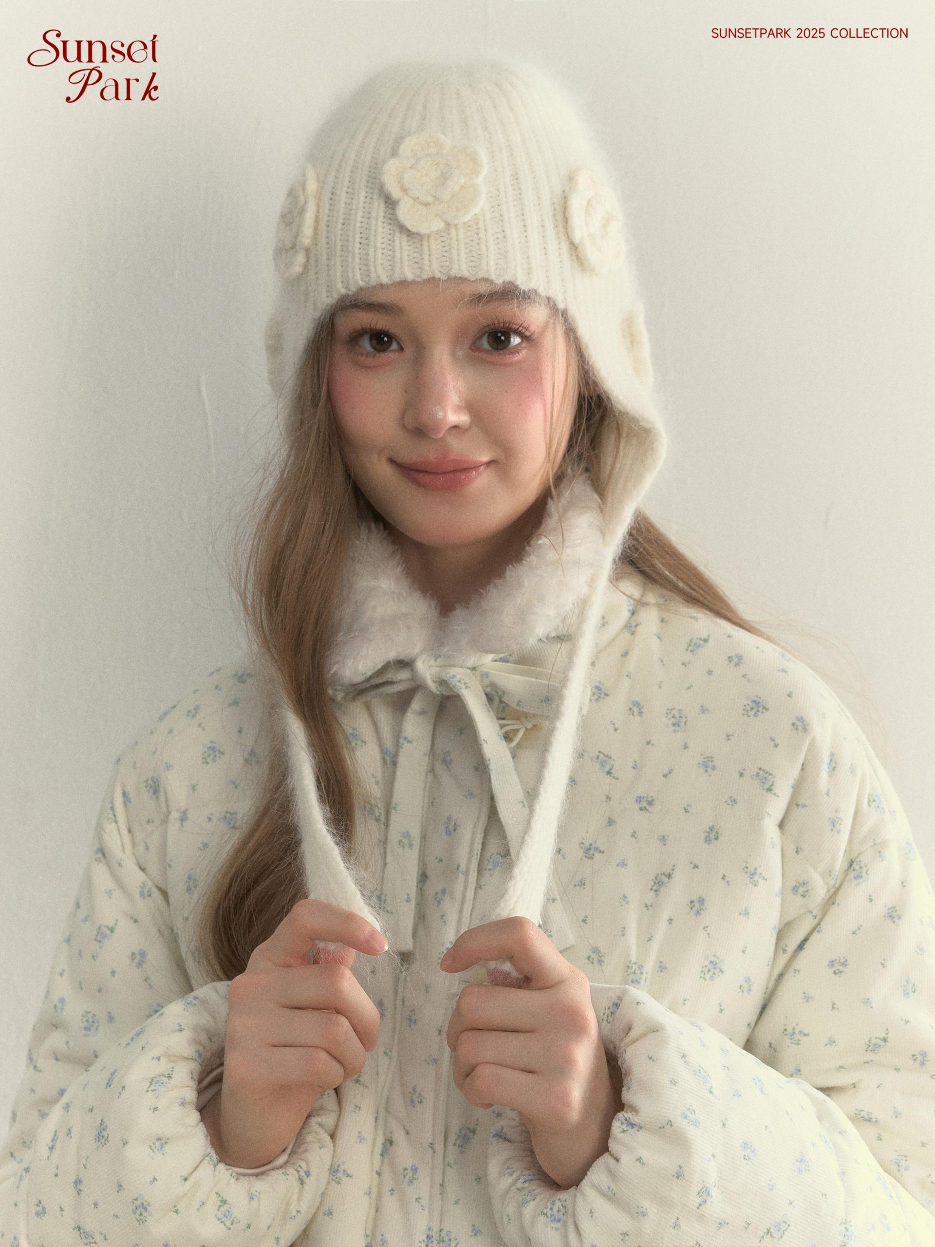입체 플라워 니트와 귀를 감싸는 트래퍼 실루엣으로, 겨울의 온기를 사랑스럽게 담은 니트 햇입니다.
