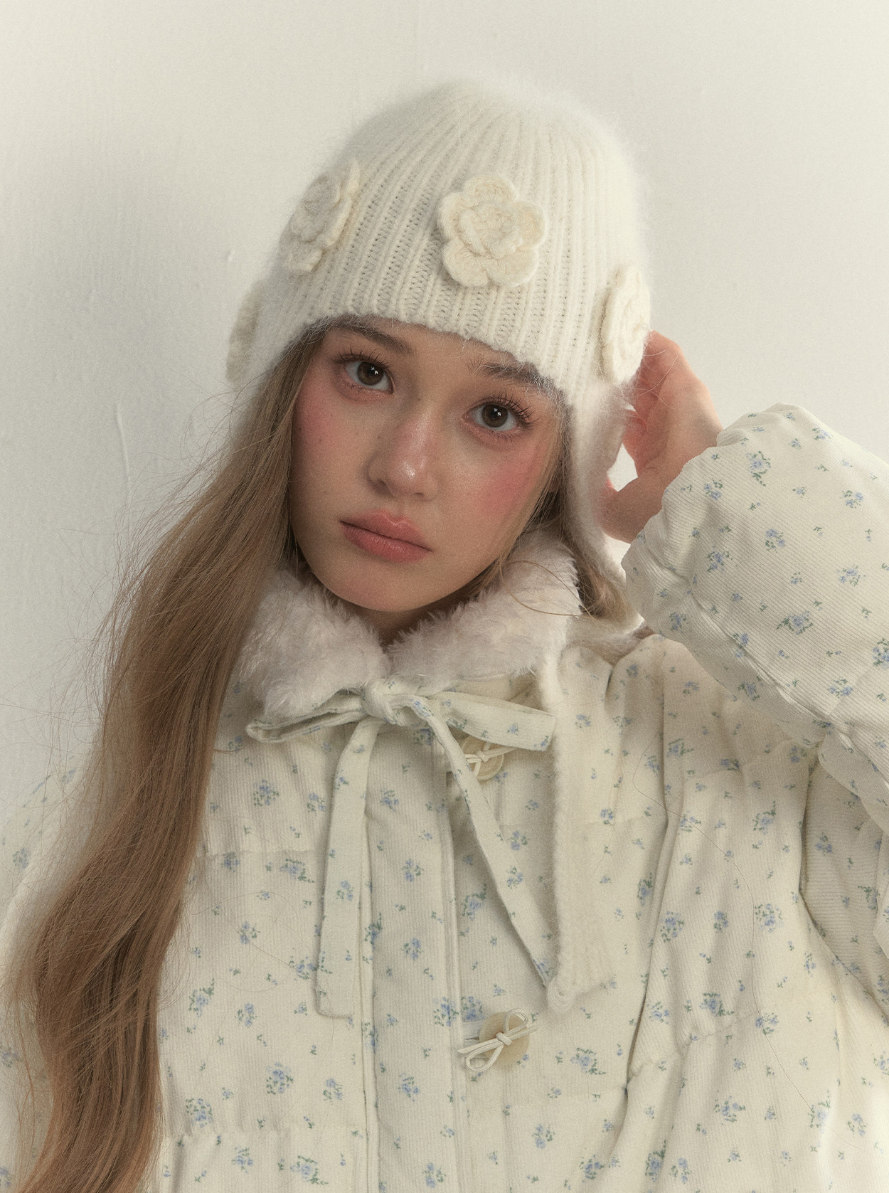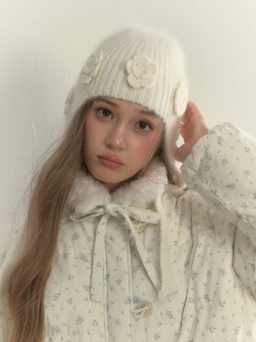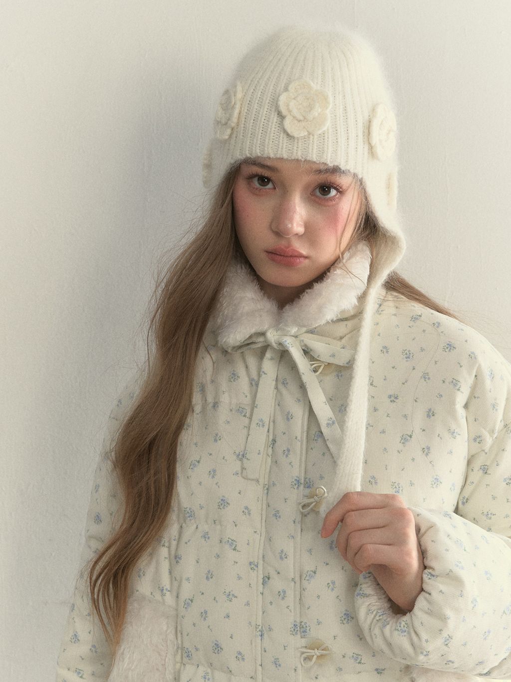 입체 플라워 니트와 귀를 감싸는 트래퍼 실루엣으로, 겨울의 온기를 사랑스럽게 담은 니트 햇입니다.