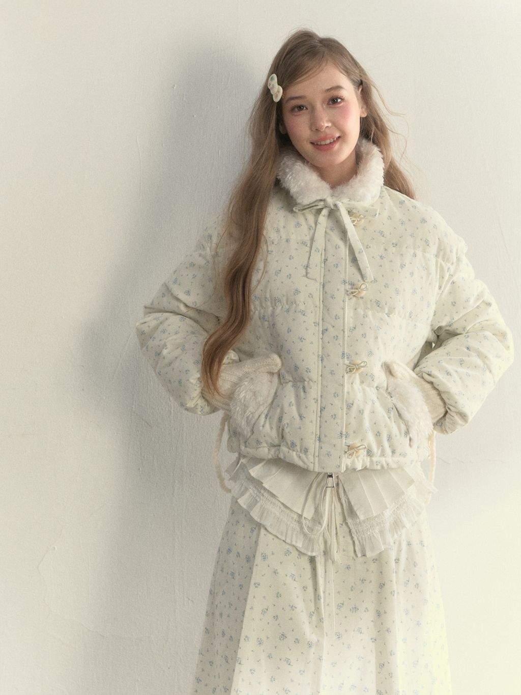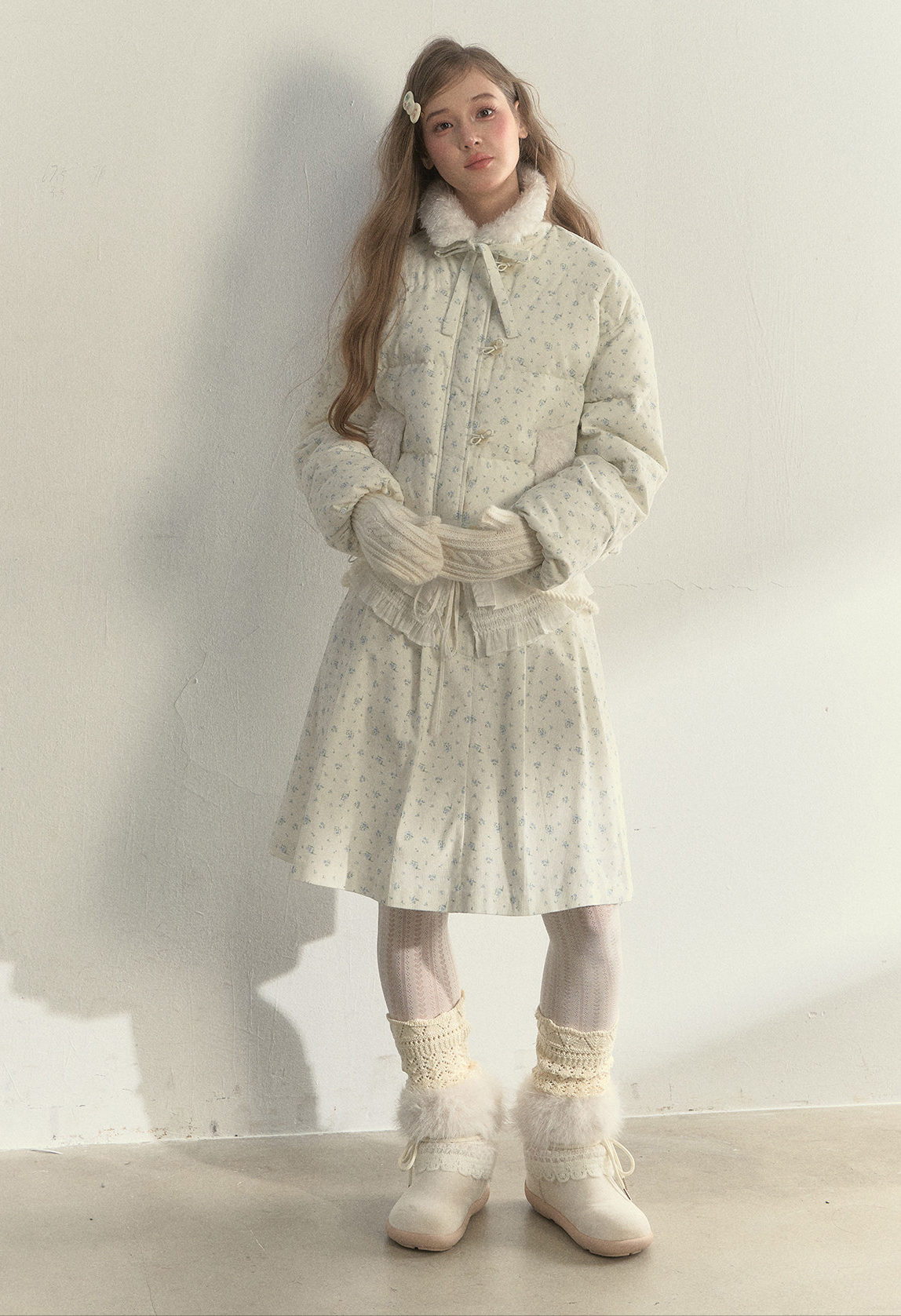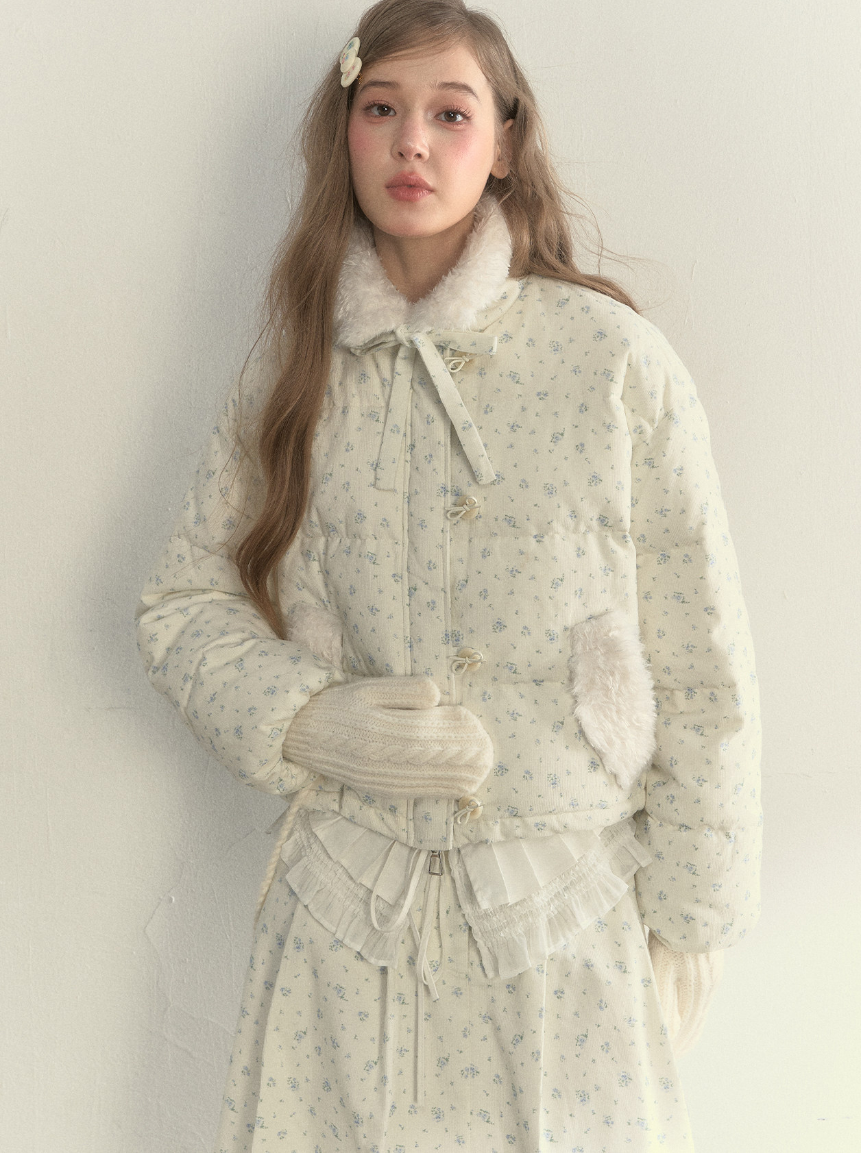 블루벨 플로럴 패턴과 소프트 퍼프 실루엣이 어우러진 트리오 셋업으로, 겨울의 온기를 소녀적인 감성으로 풀어냈습니다.