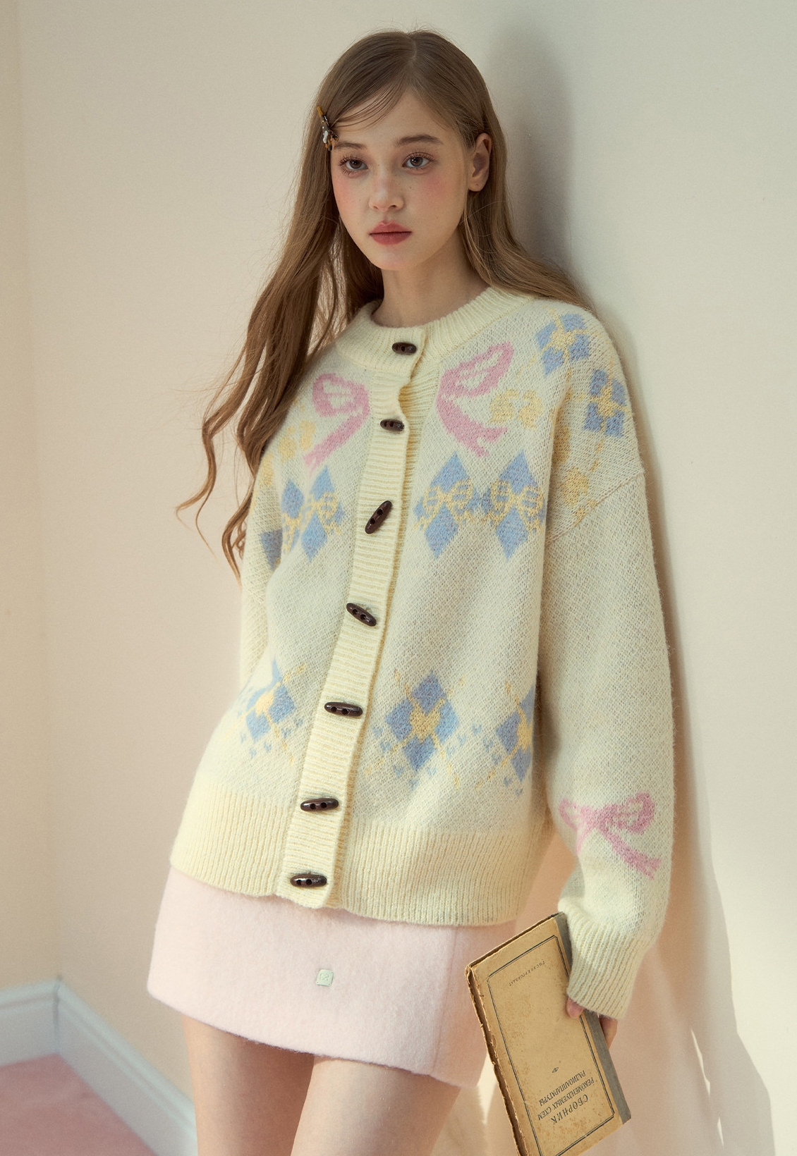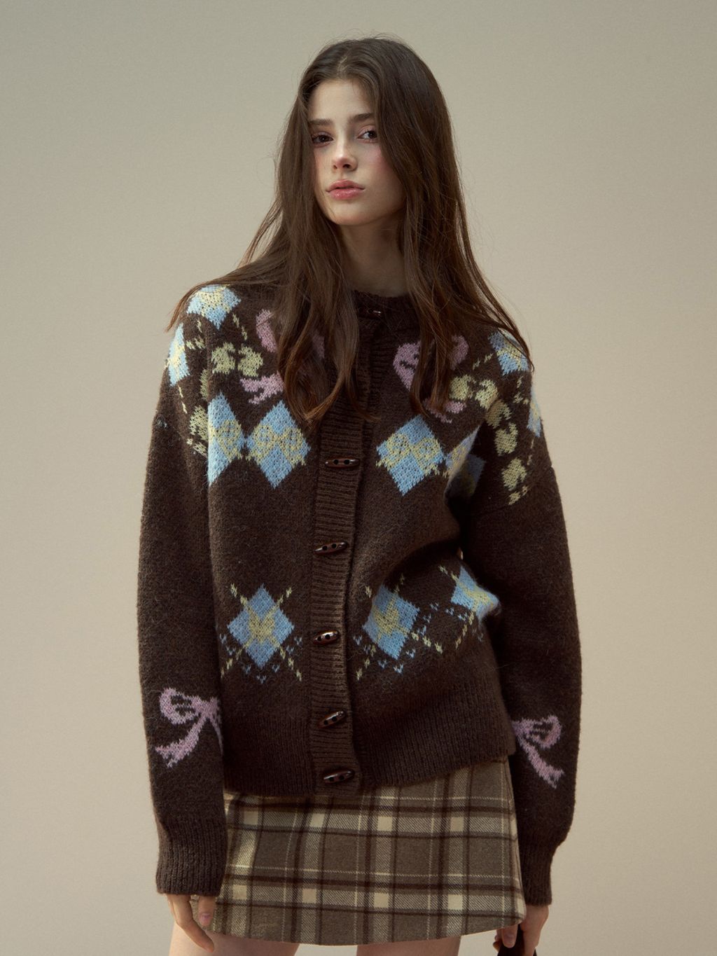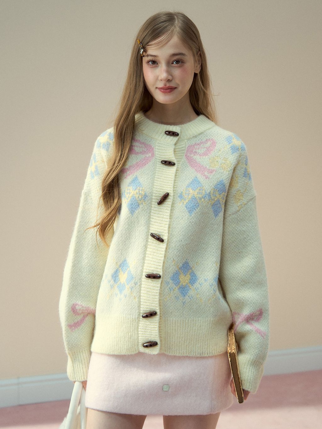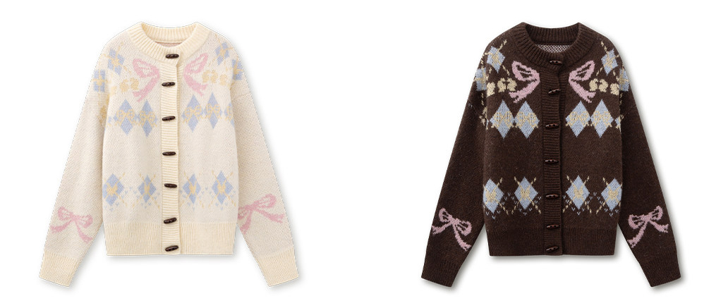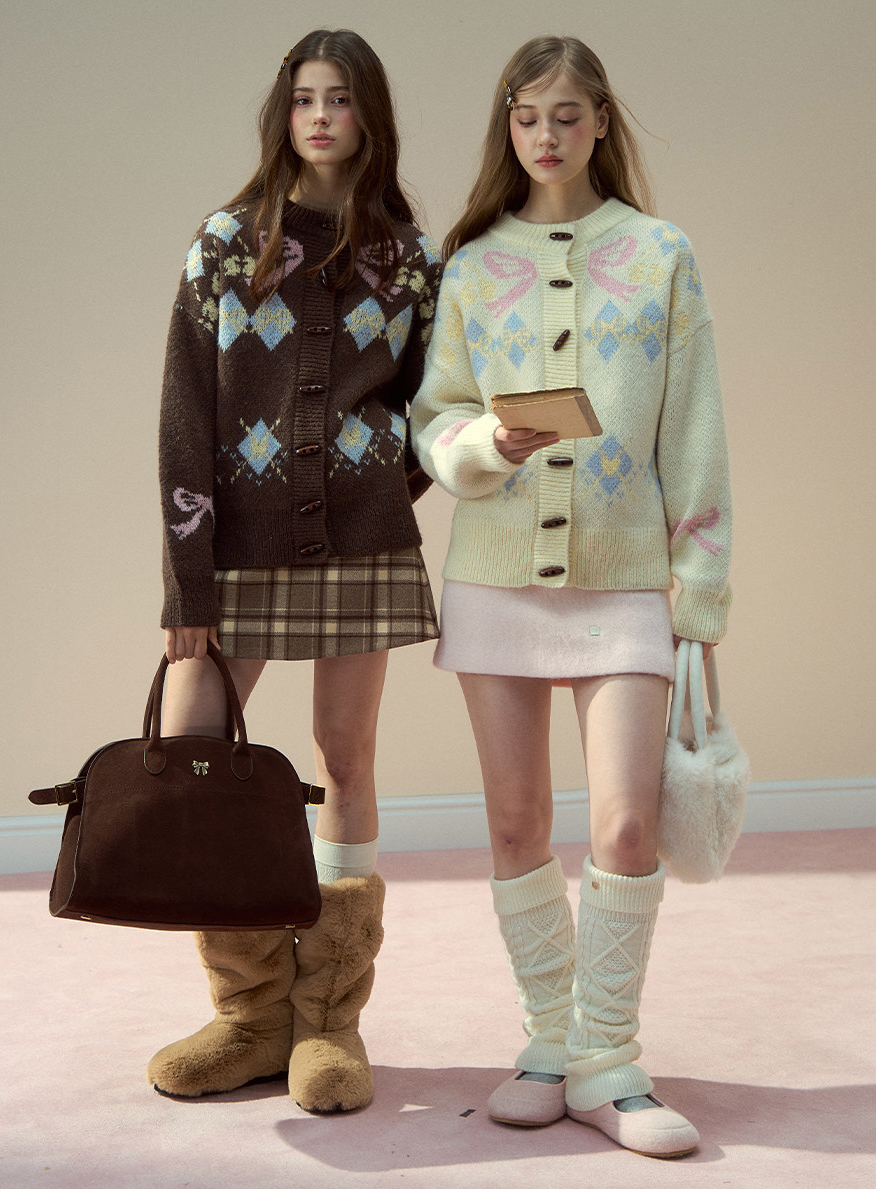리본 모티브와 아가일 패턴이 어우러진 니트 가디건으로, 달콤한 빈티지 무드를 포근하게 담아냈습니다.