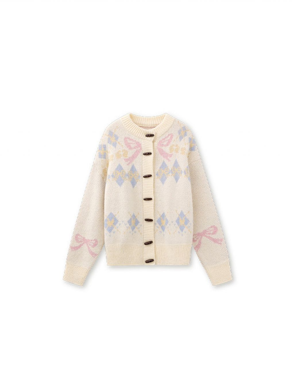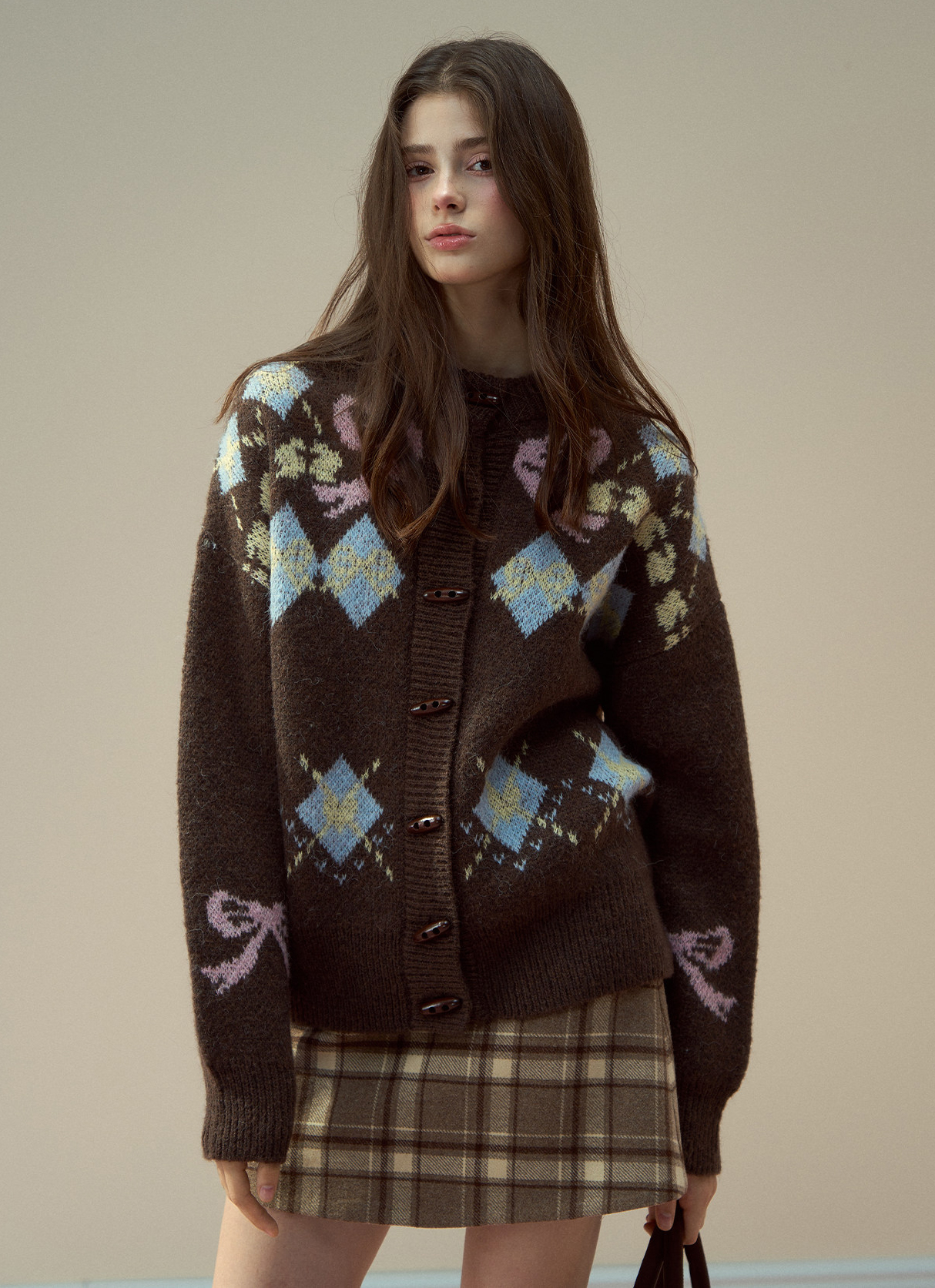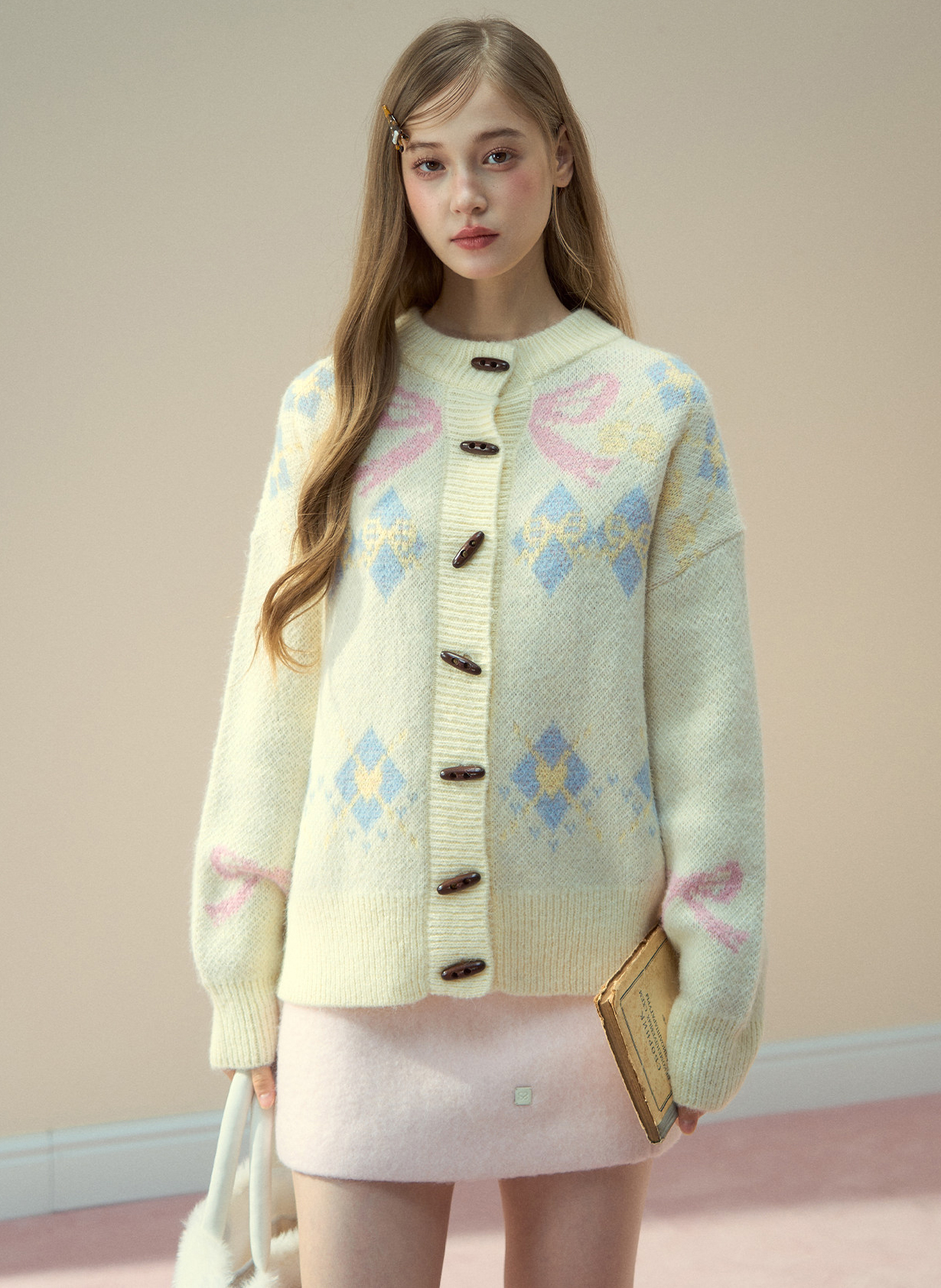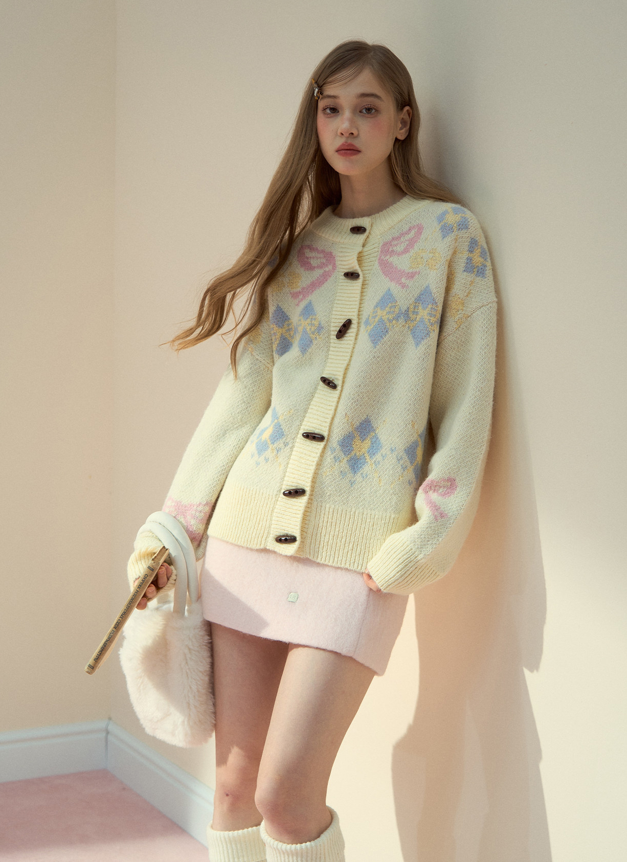 리본 모티브와 아가일 패턴이 어우러진 니트 가디건으로, 달콤한 빈티지 무드를 포근하게 담아냈습니다.
