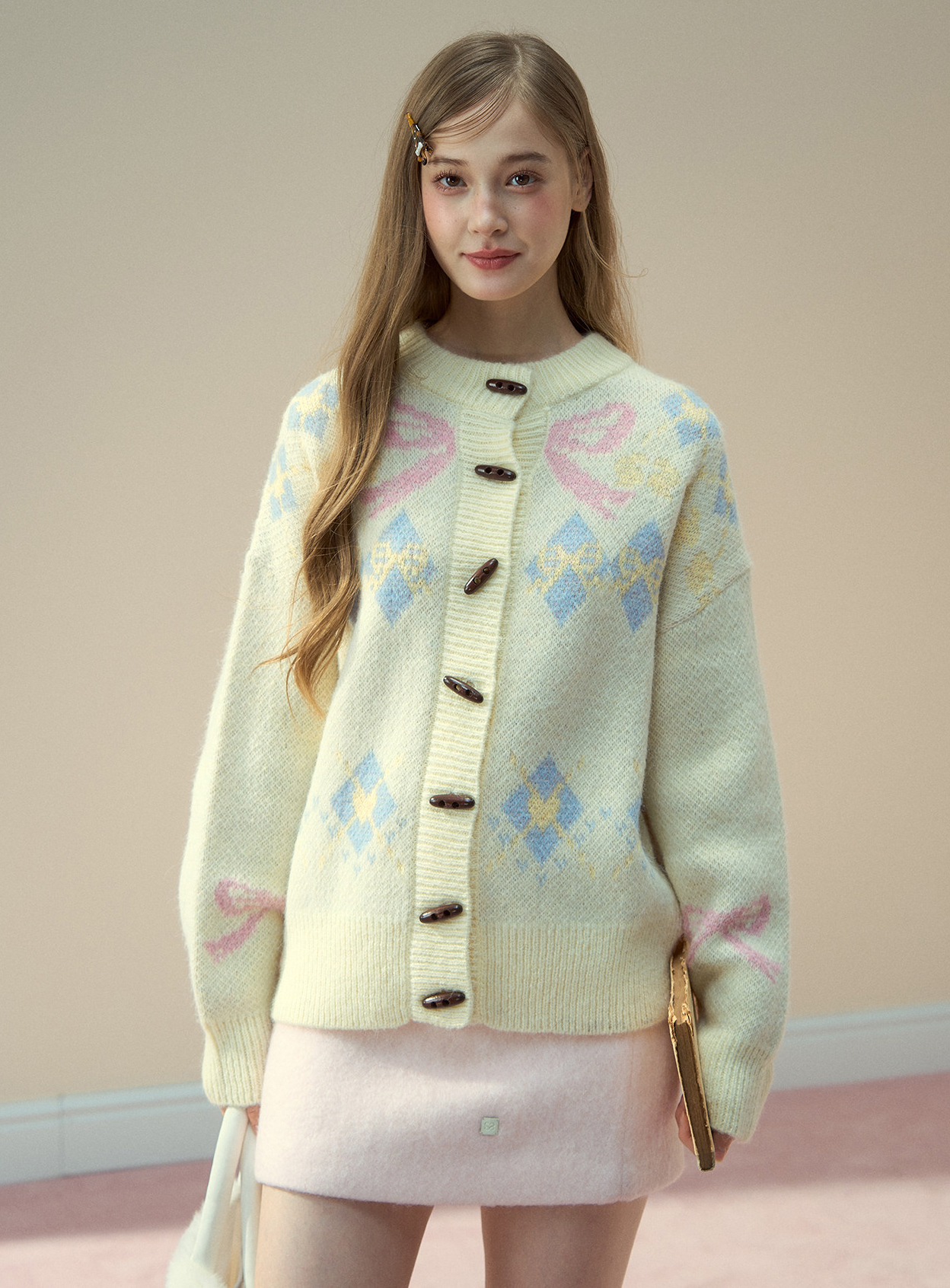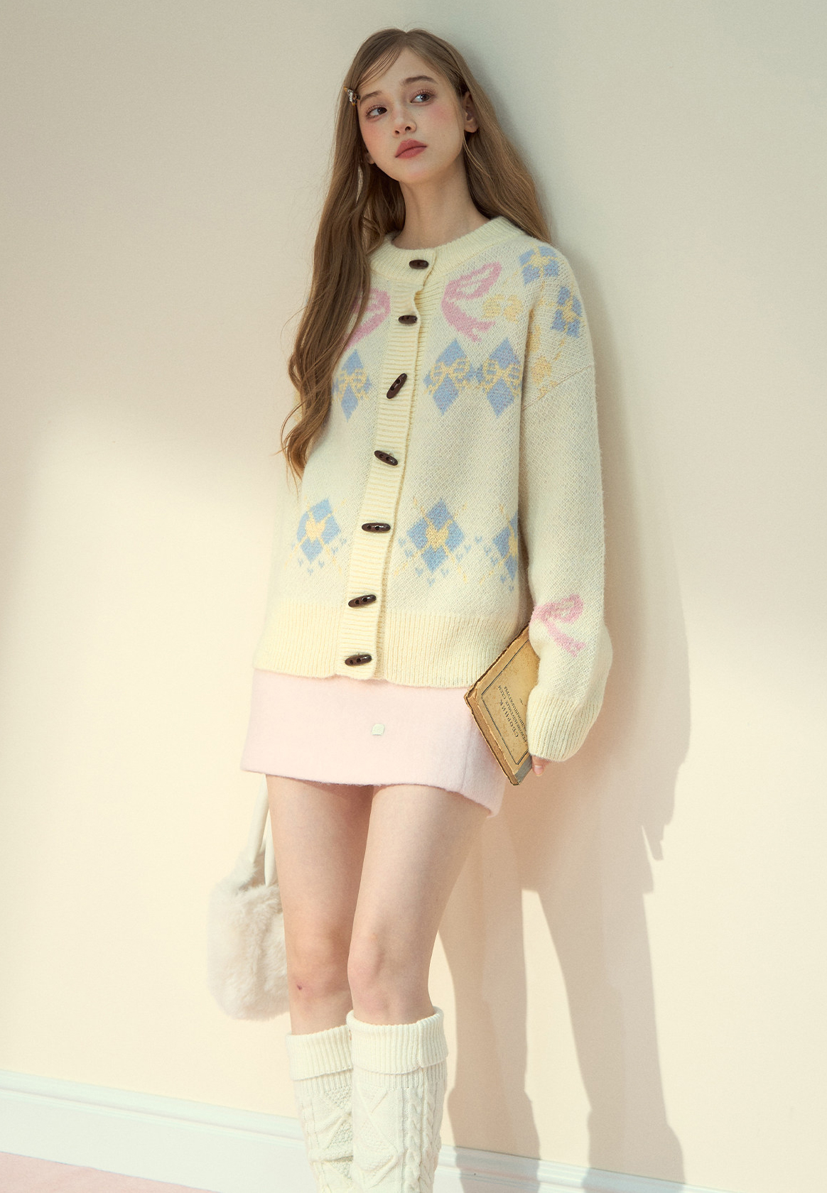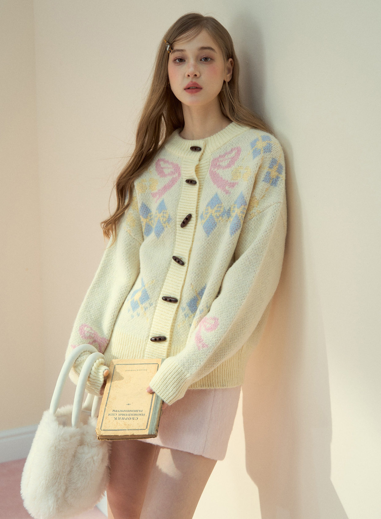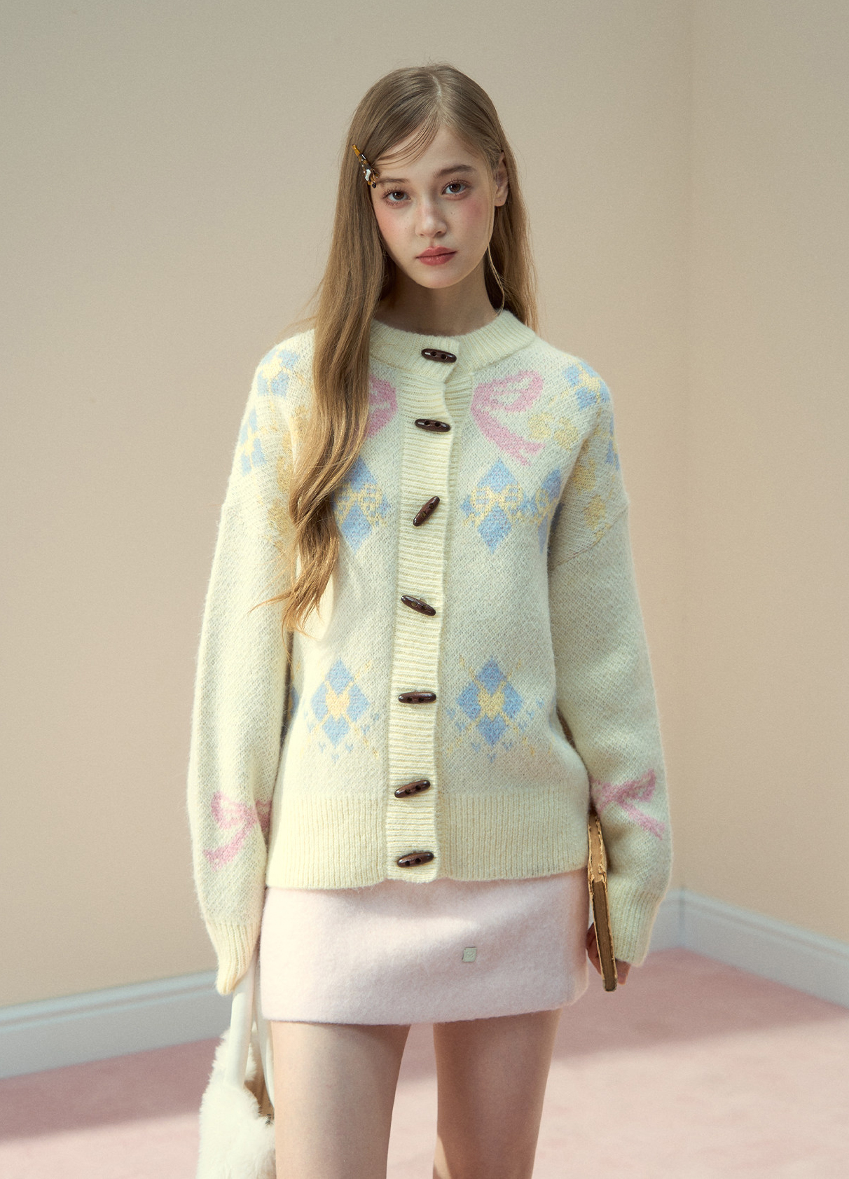 리본 모티브와 아가일 패턴이 어우러진 니트 가디건으로, 달콤한 빈티지 무드를 포근하게 담아냈습니다.