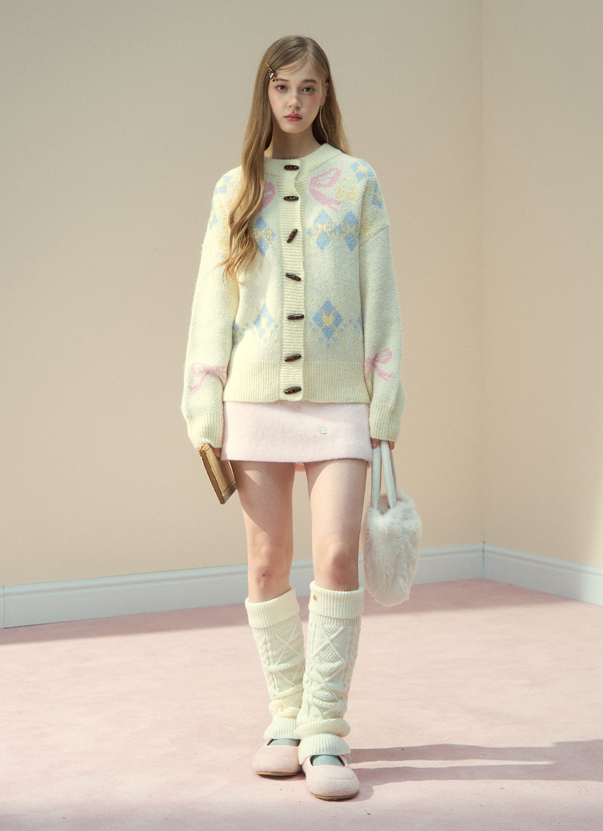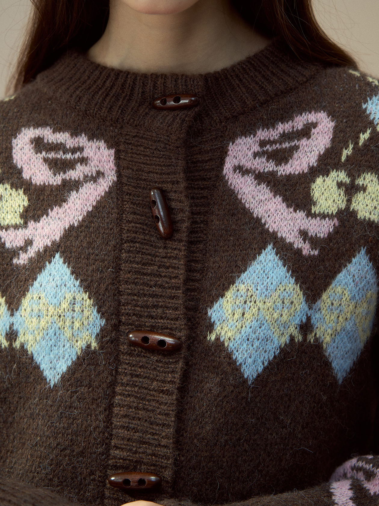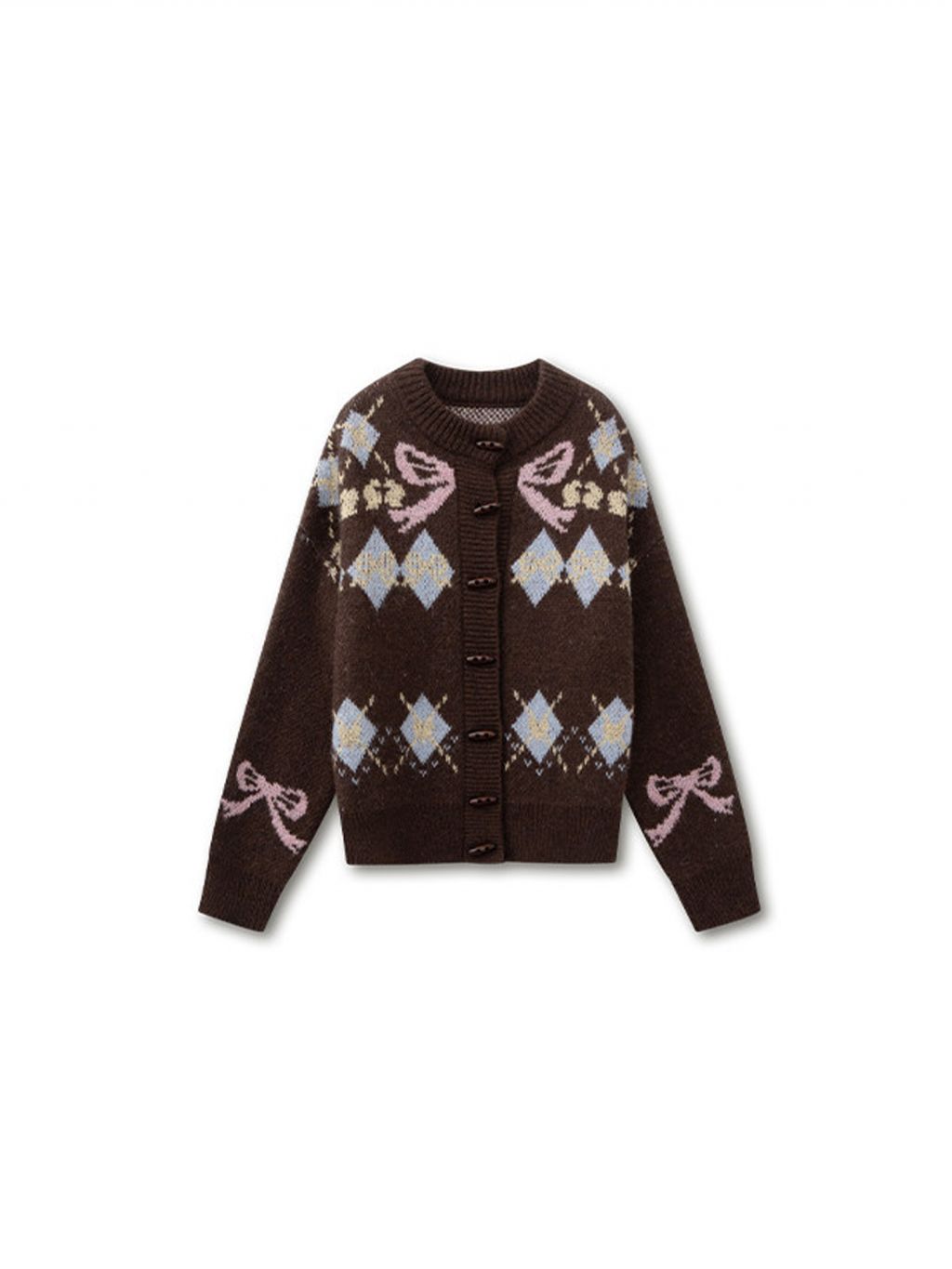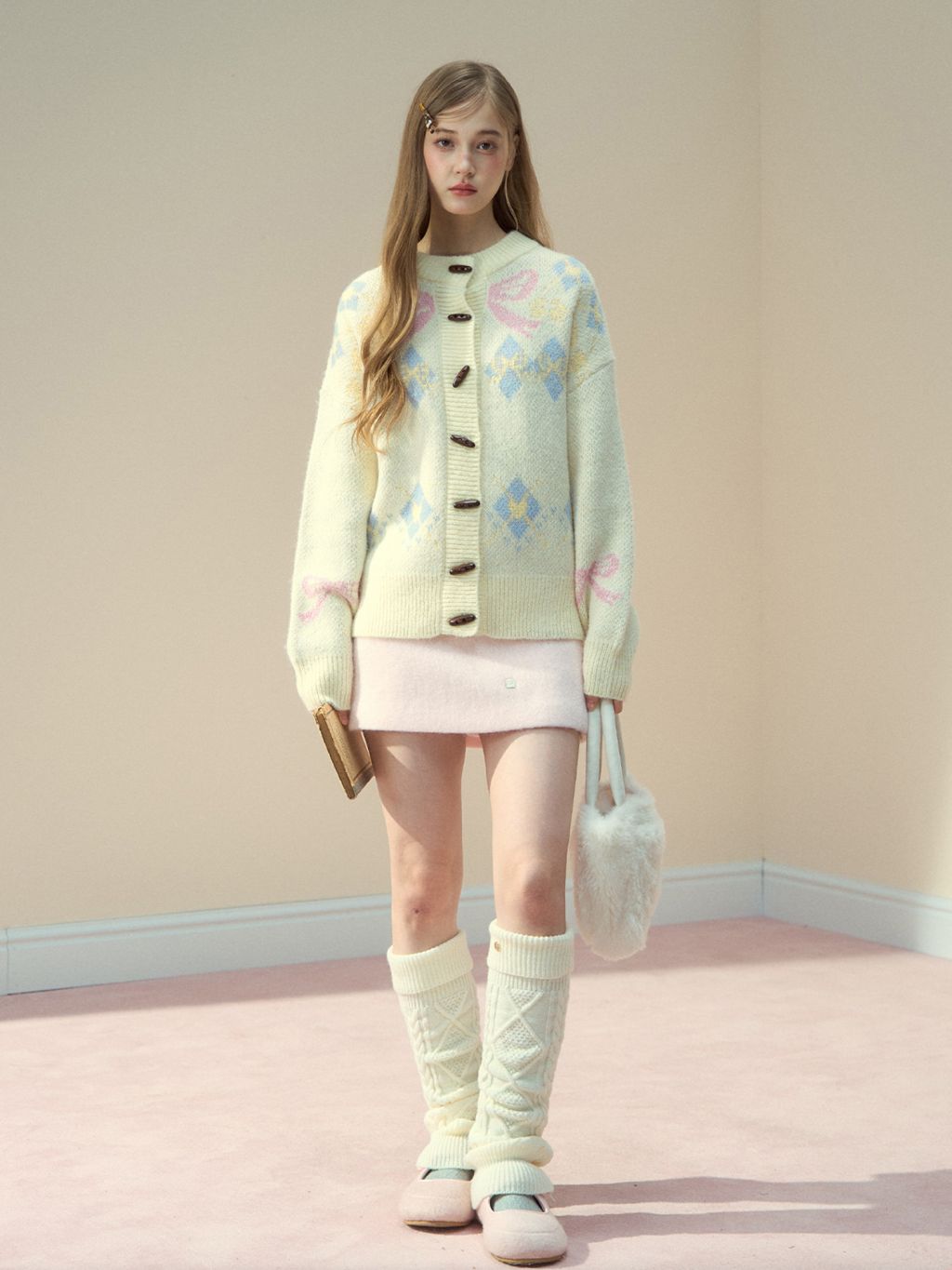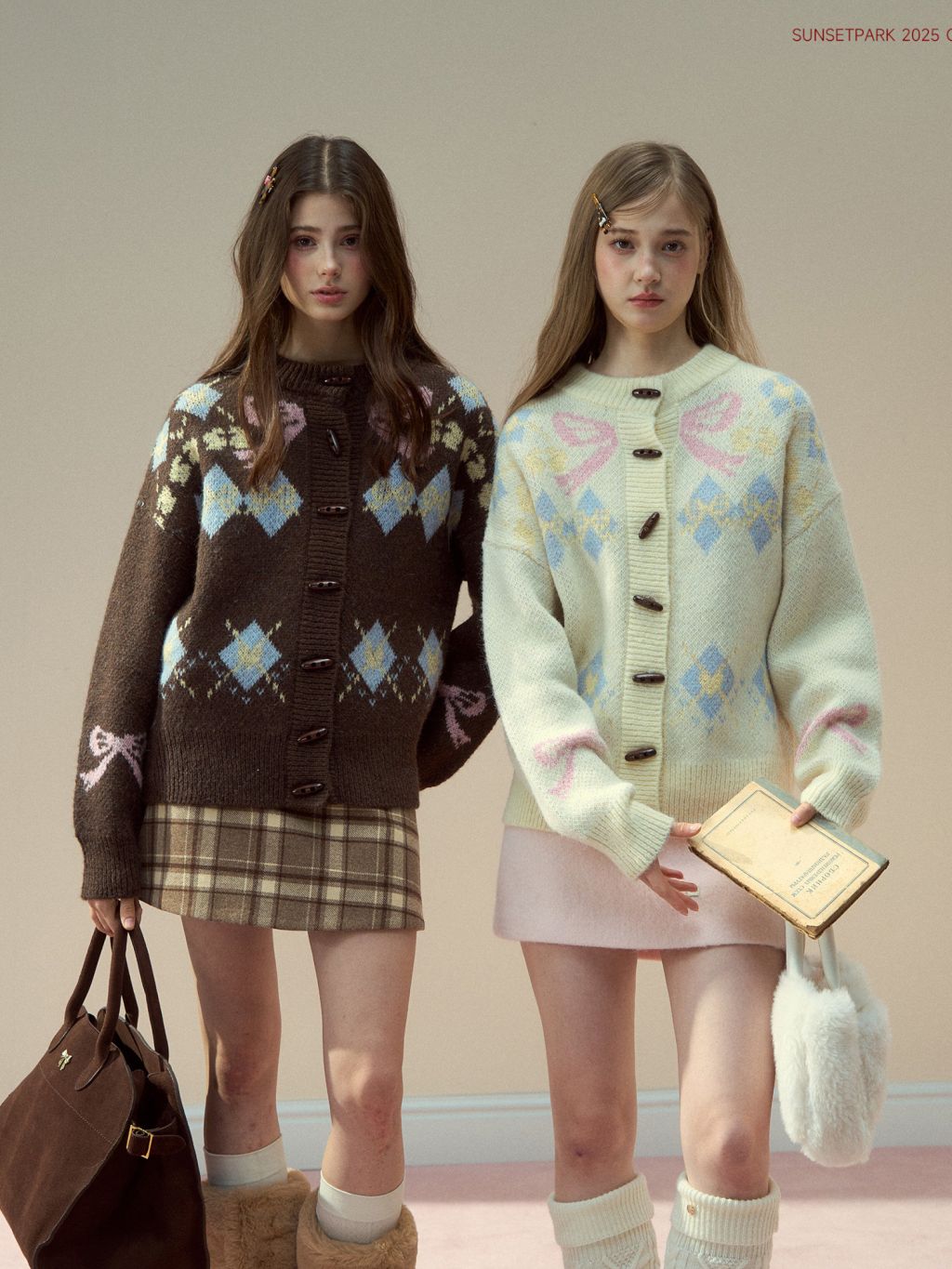 리본 모티브와 아가일 패턴이 어우러진 니트 가디건으로, 달콤한 빈티지 무드를 포근하게 담아냈습니다.