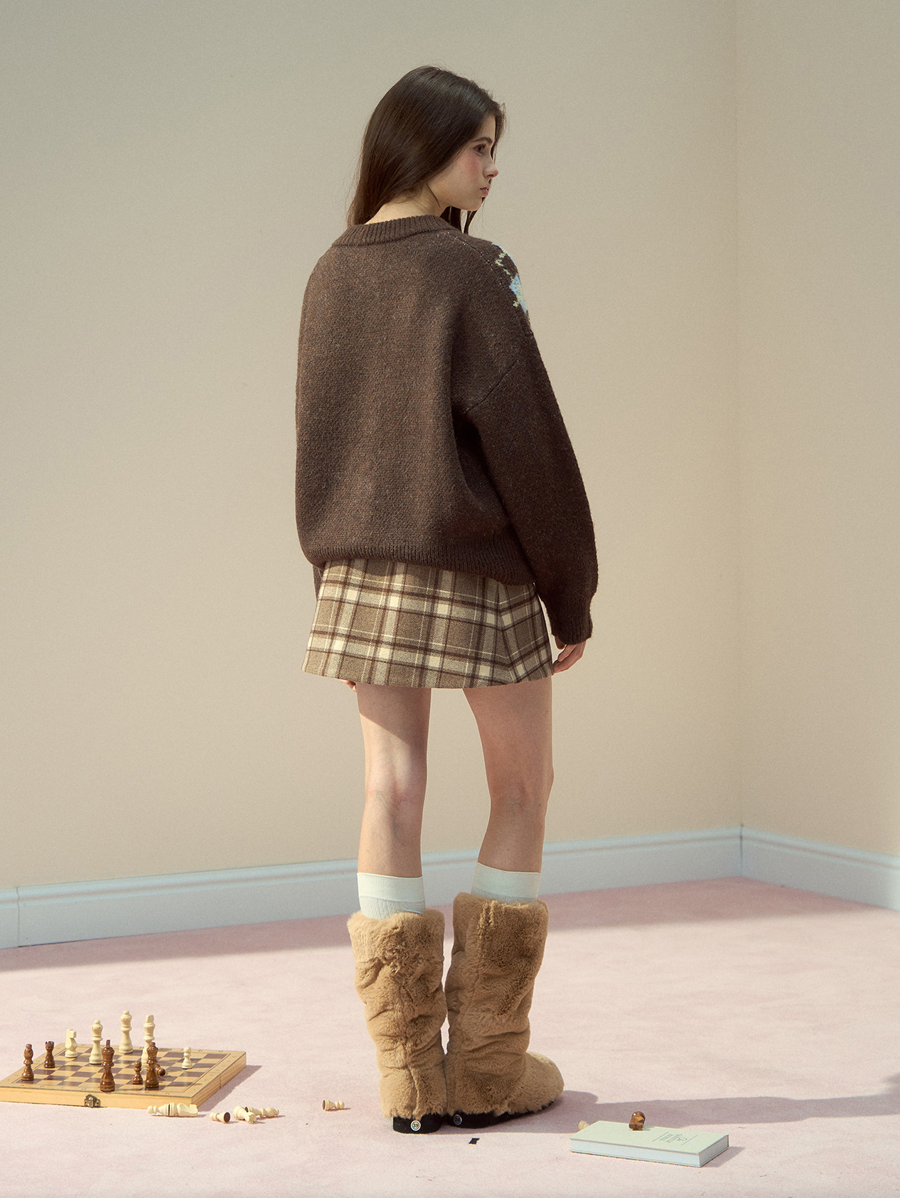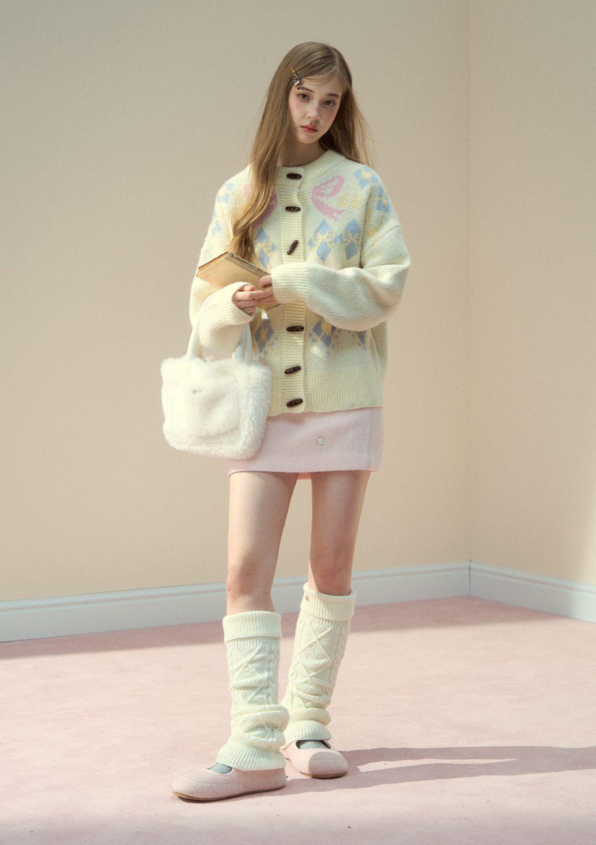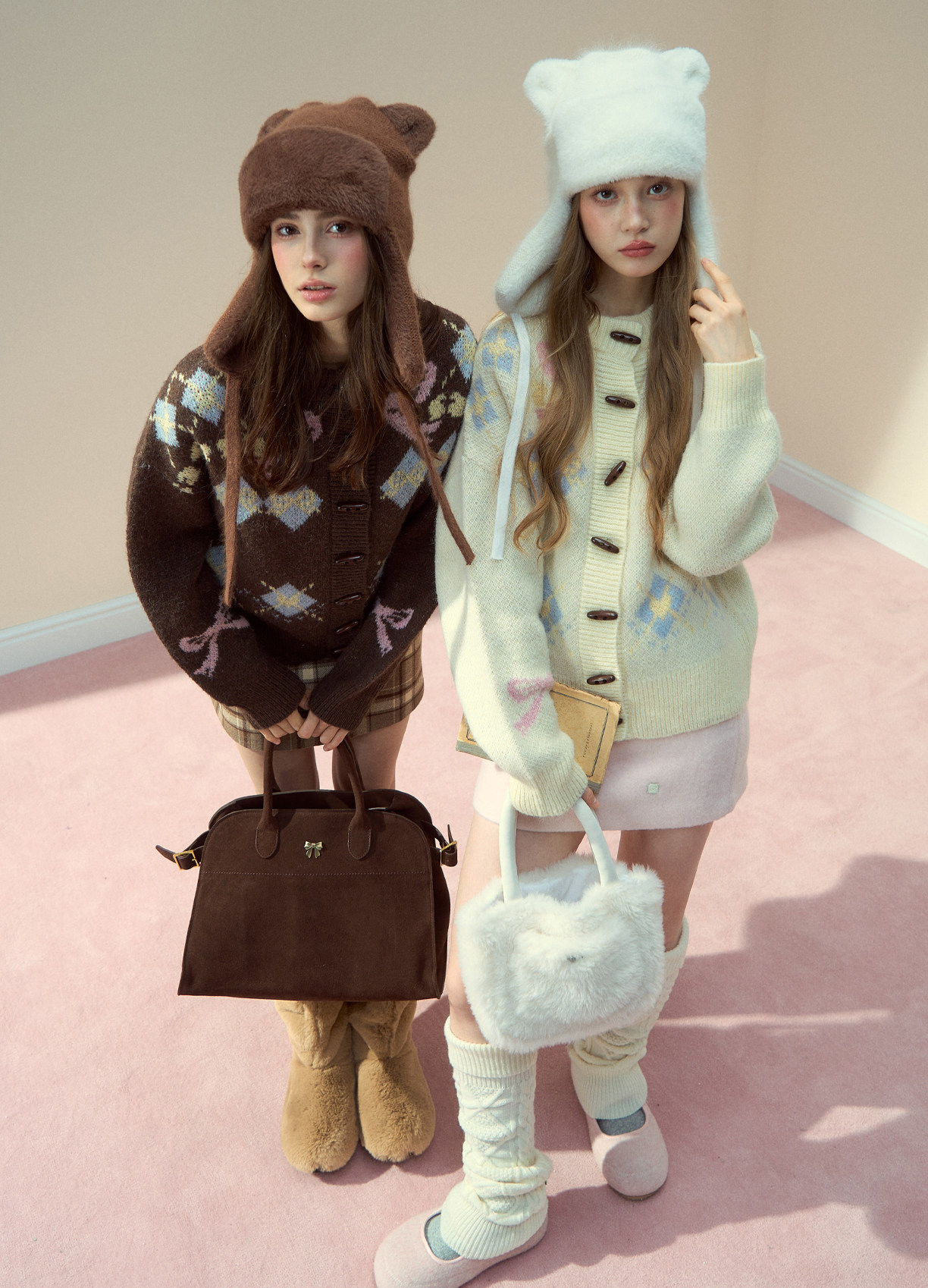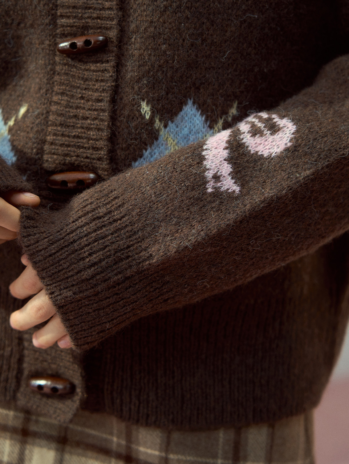 리본 모티브와 아가일 패턴이 어우러진 니트 가디건으로, 달콤한 빈티지 무드를 포근하게 담아냈습니다.