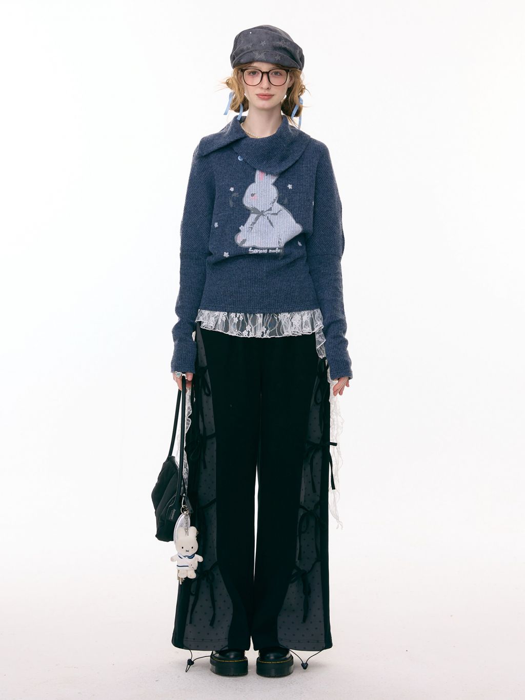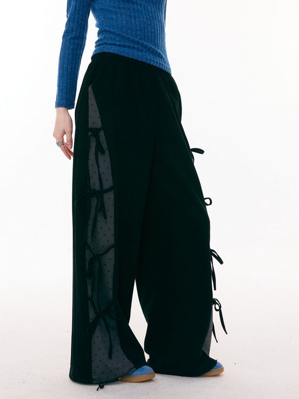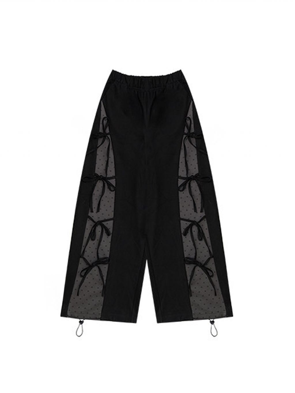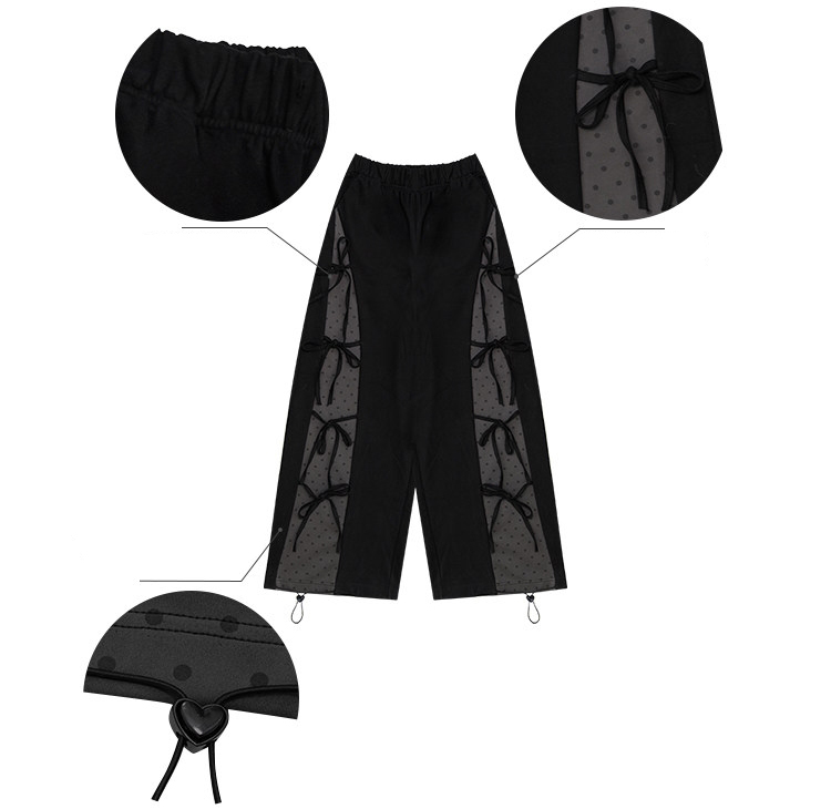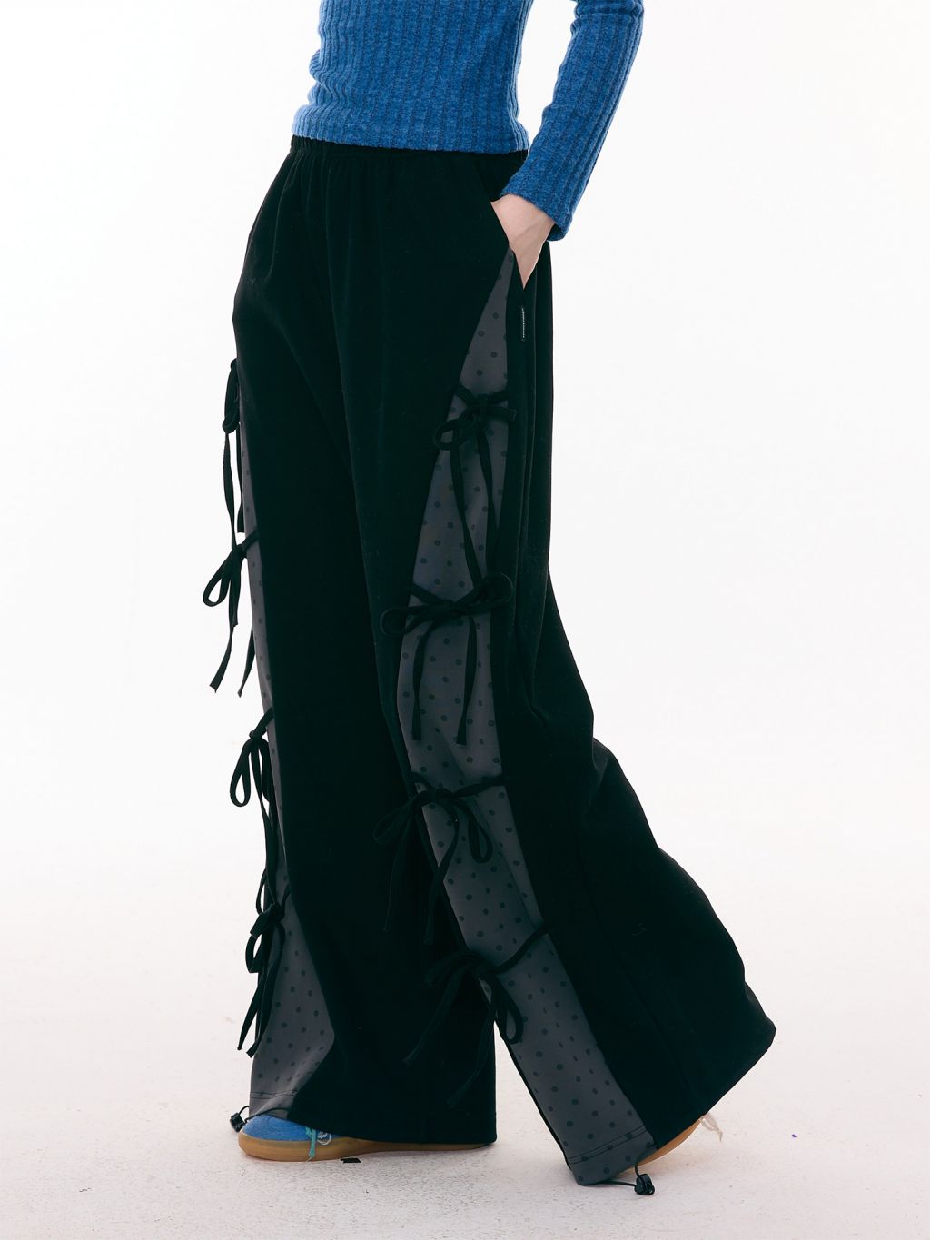 사이드 도트 시스루 패널과 리본 타이 디테일로, 블랙 팬츠 하나만으로도 치키하고 러블리한 무드가 완성되는 아이템입니다. 와이드 실루엣에 포인트가 되며, 데일리룩으로 포인트를 더하기 좋은 팬츠 입니다.