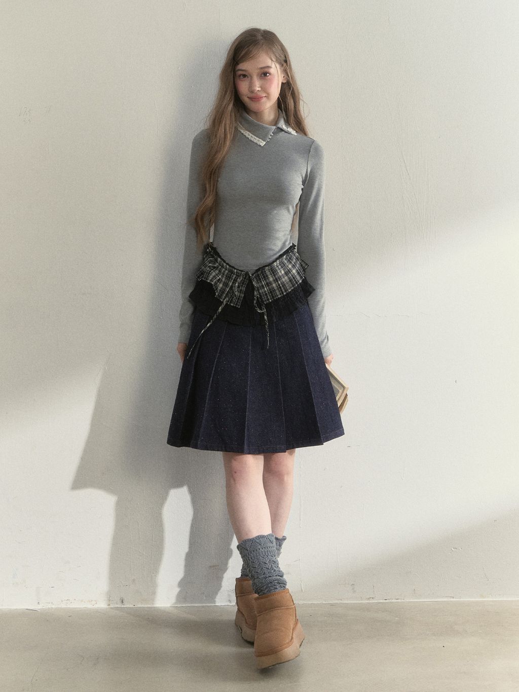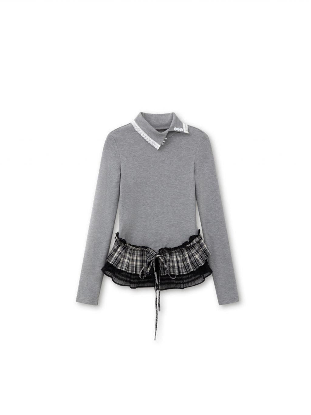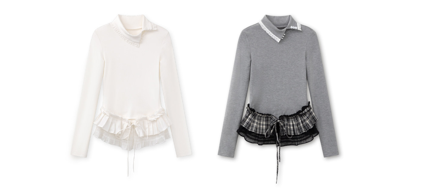 레이스 버튼 카라 디테일에 체크 러플 페플럼을 더해, 하나만 입어도 레이어드한 듯 룩이 완성되는 탑입니다. 러블리한데 가볍지 않은 ‘치키 무드’ 포인트로 시즌 내내 손이 가요.
