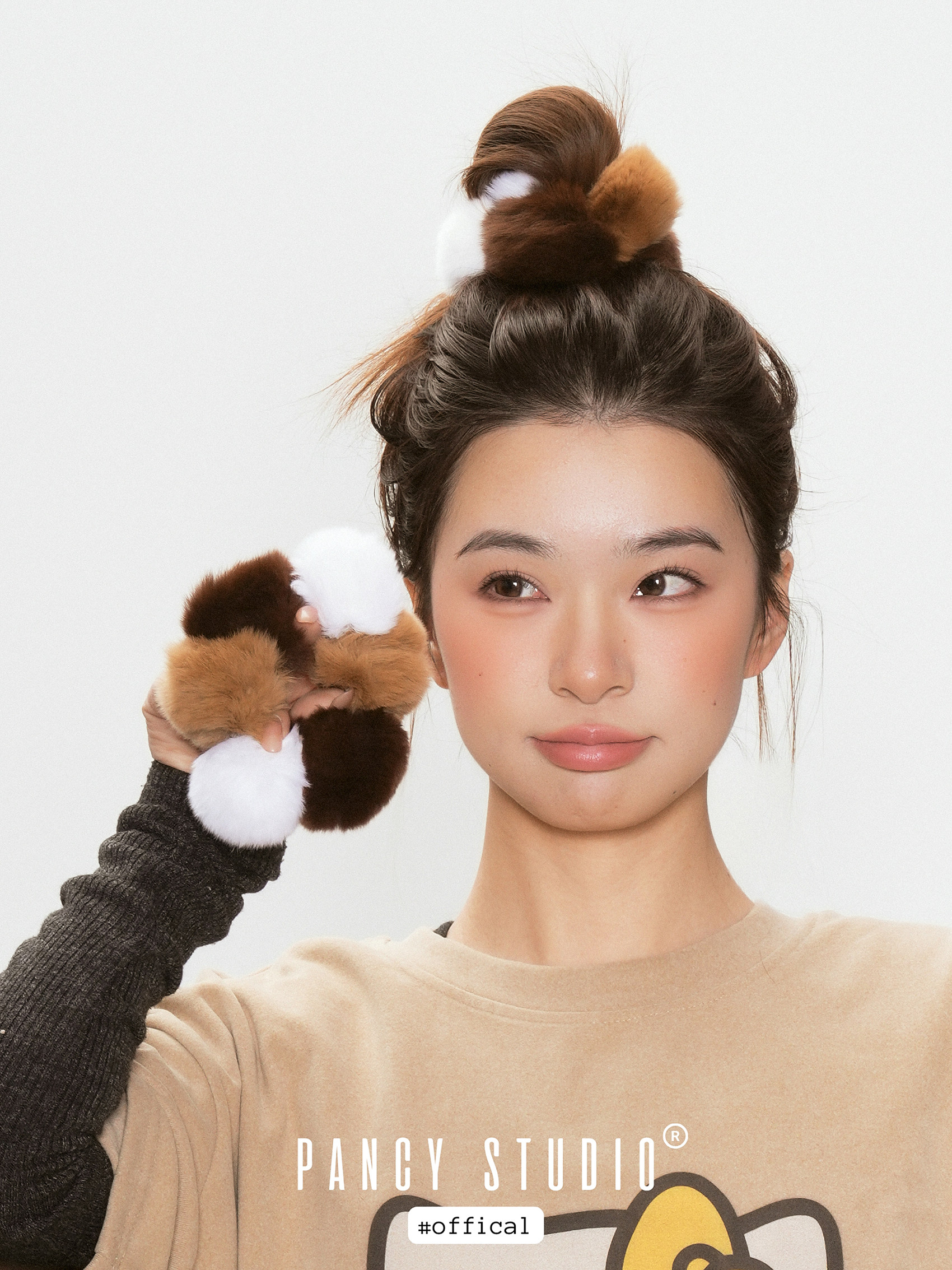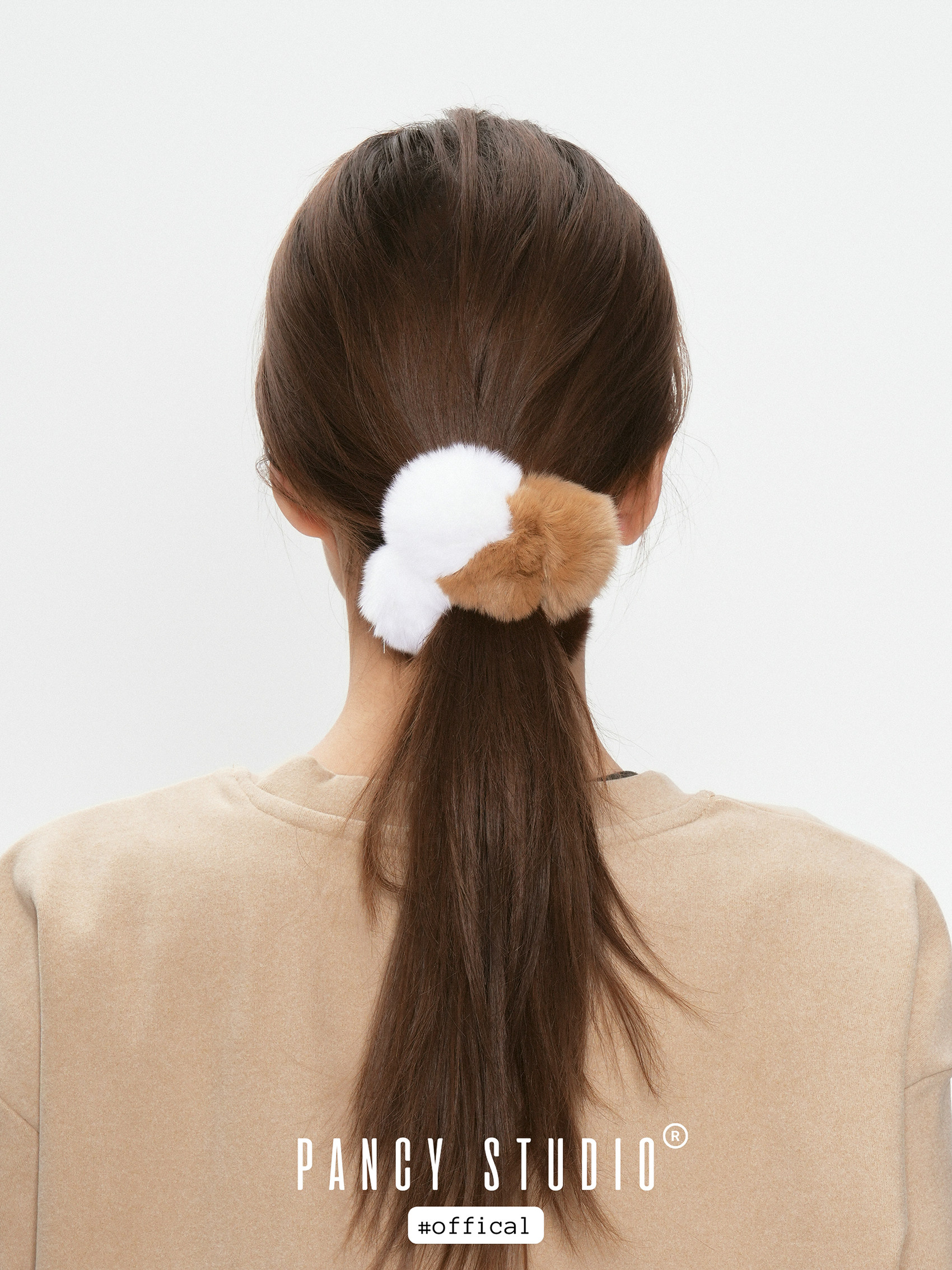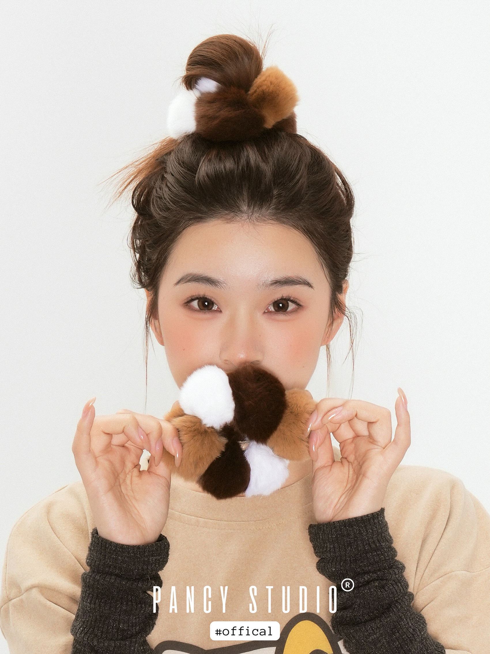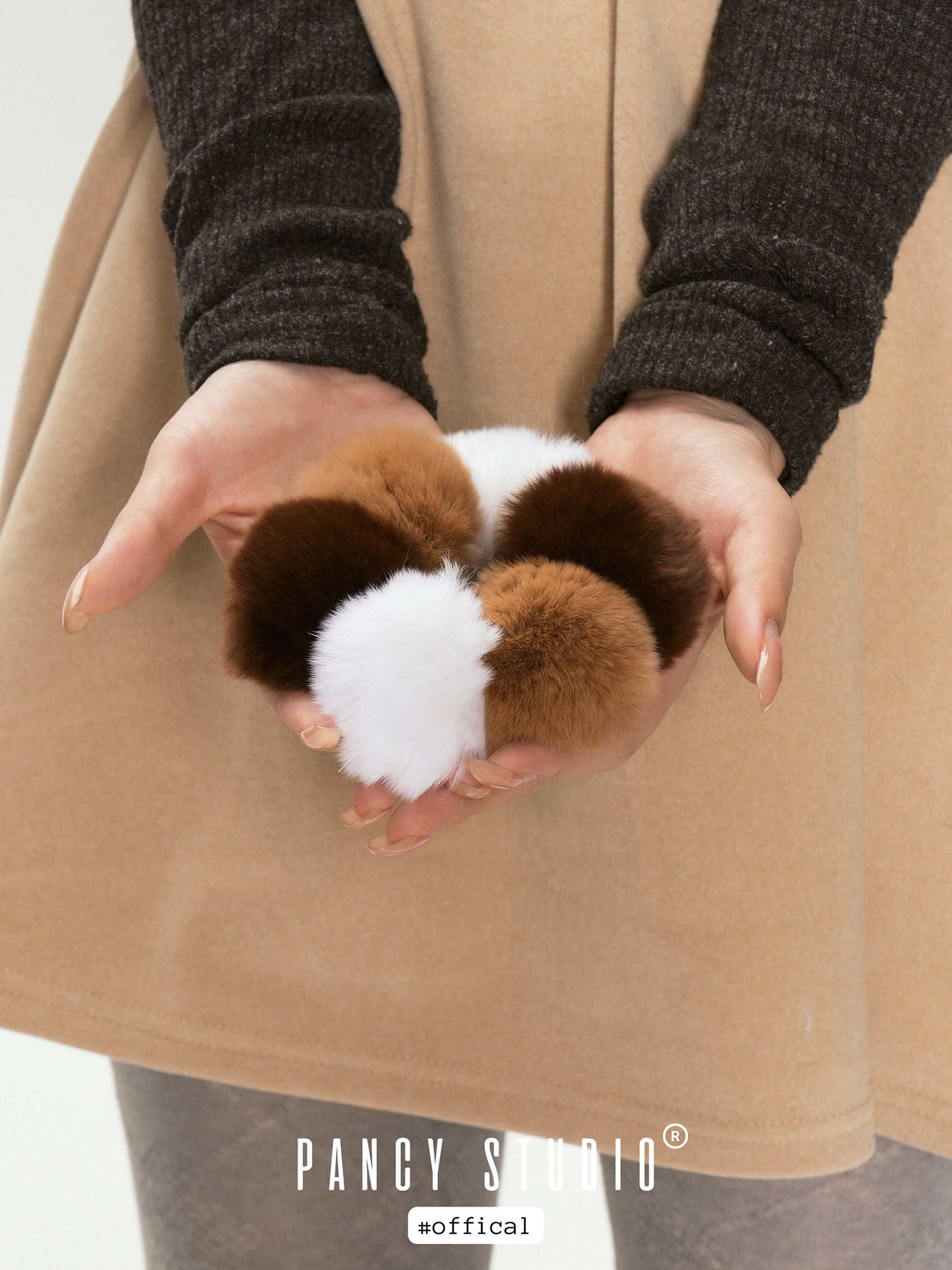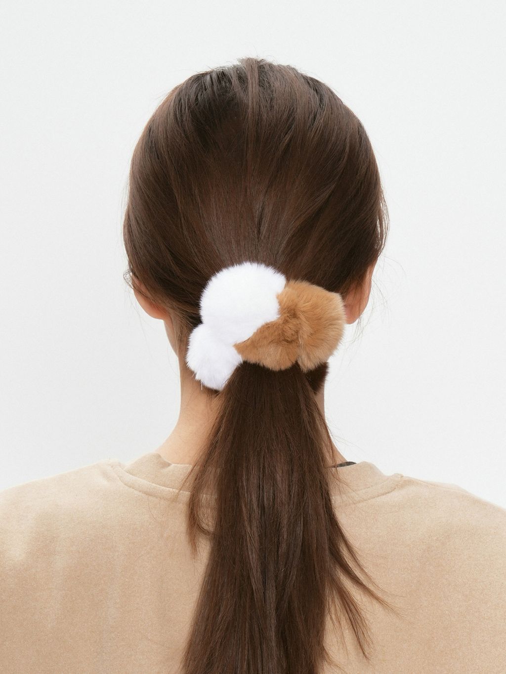 세 가지 톤의 삼색고양이 컬러 퍼 폼폼이 한 번에 포인트가 되는 헤어 스크런치입니다. 보송한 볼륨감이 헤어 번/포니테일을 더 귀엽고 스타일리시하게 완성해줘요.