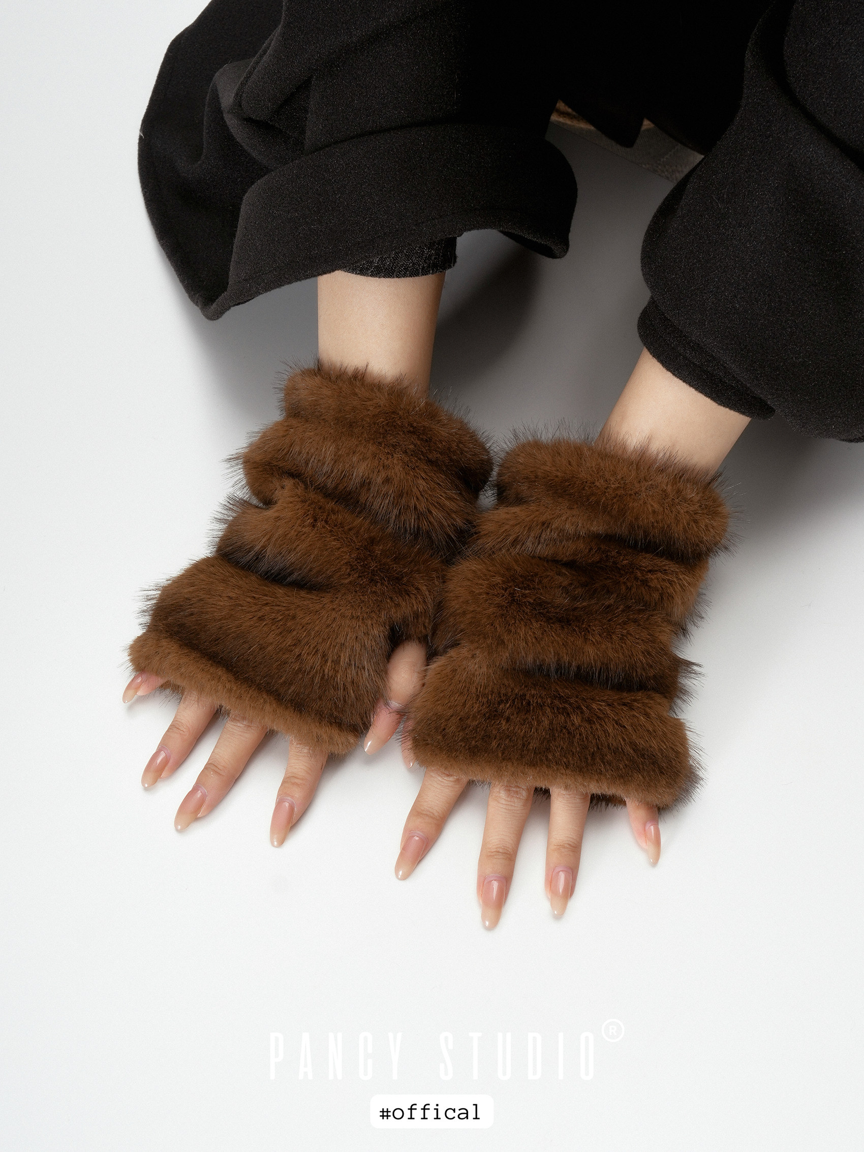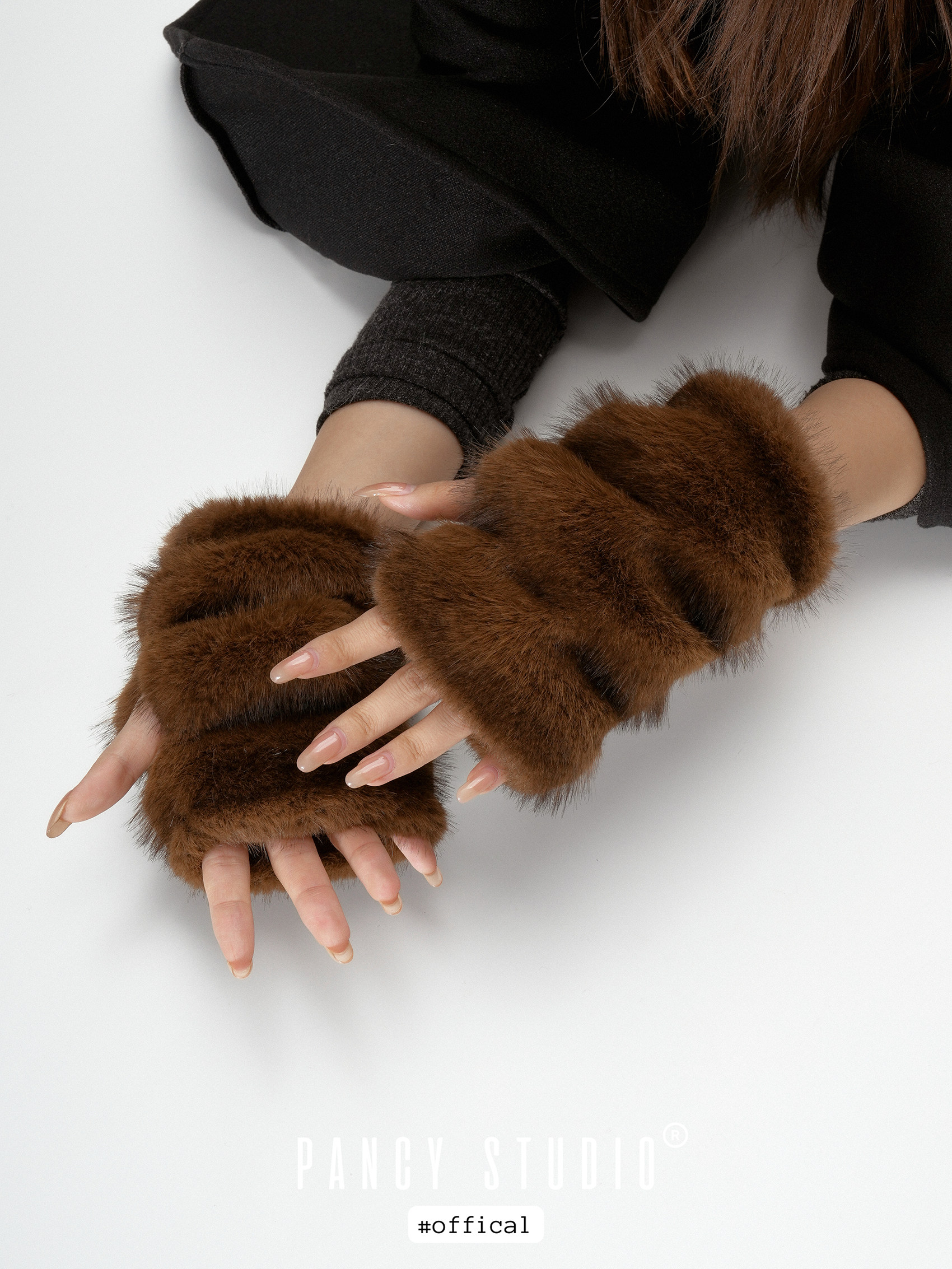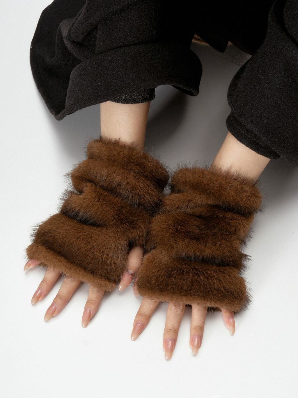 진한 초콜릿 브라운 퍼 텍스처가 손끝을 포근하게 감싸는 핸드워머로, 겨울 룩에 고급스러운 볼륨 포인트를 더해줍니다. 손목까지 길게 올라오는 니트 시보리가 보온감과 착용감을 동시에 챙겨줍니다.