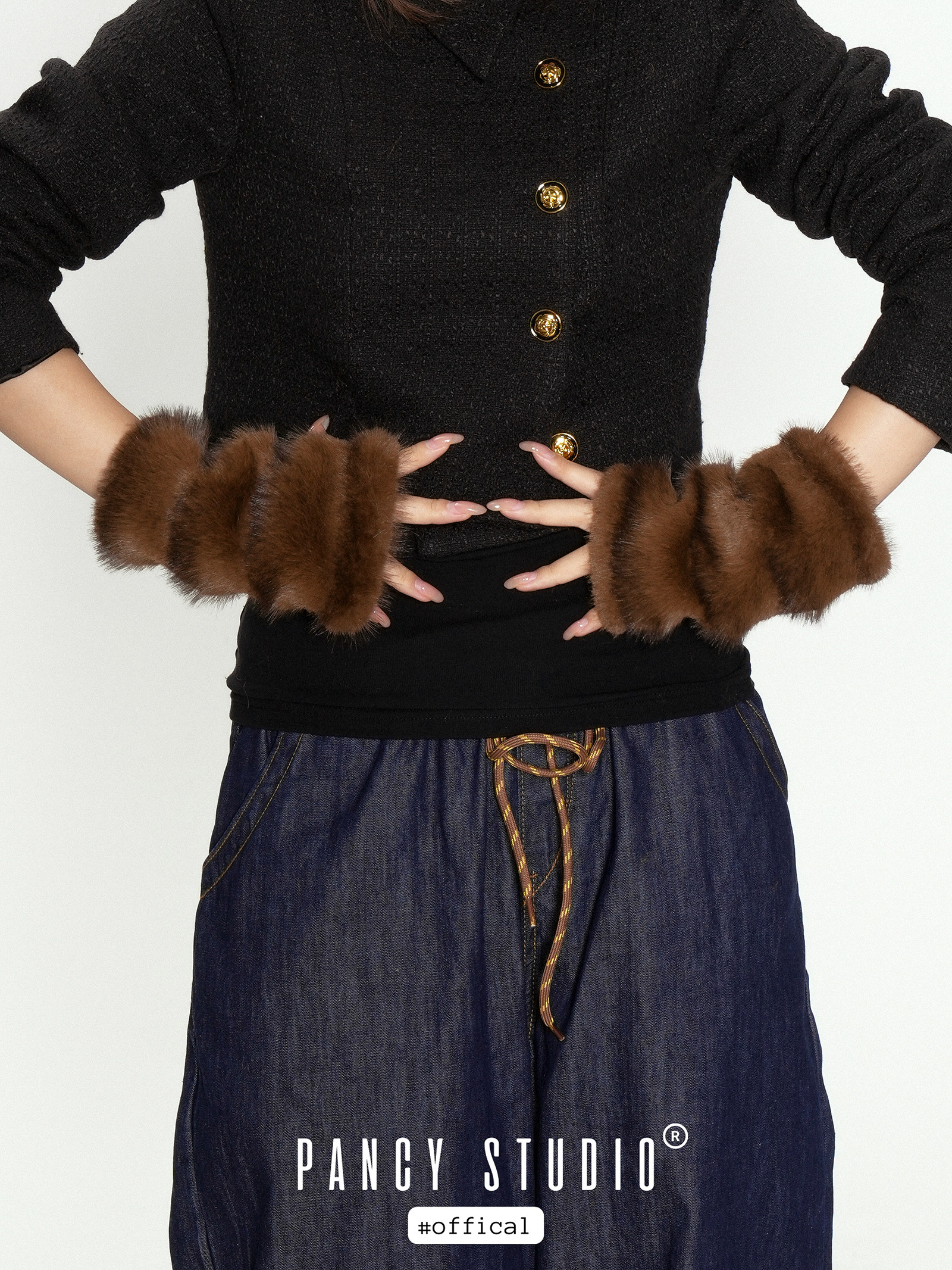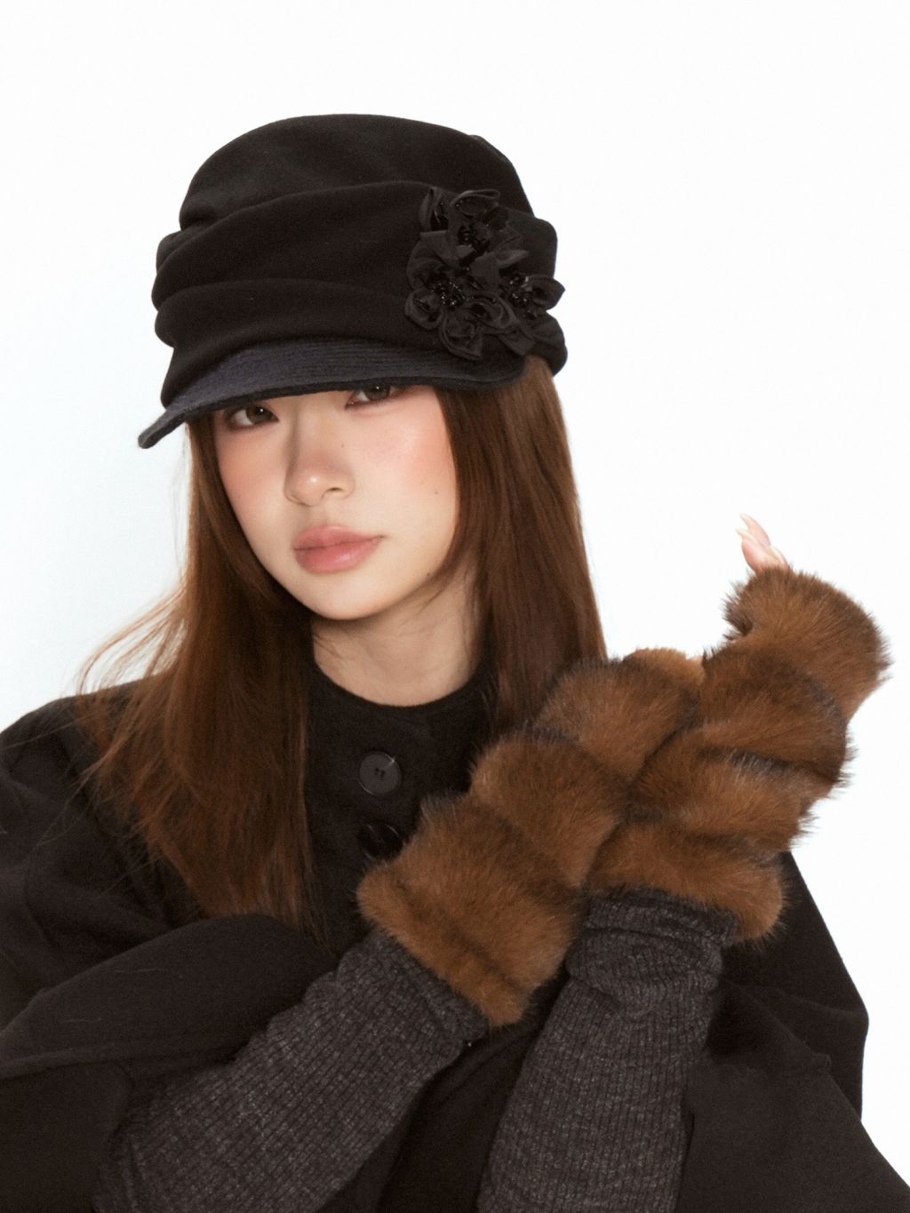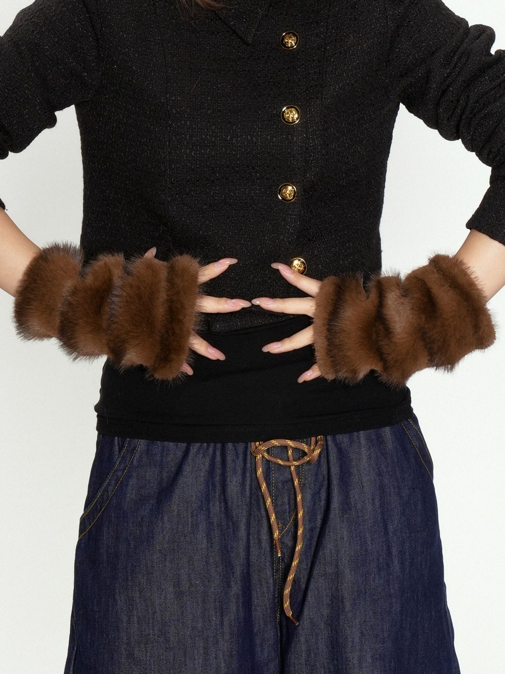 진한 초콜릿 브라운 퍼 텍스처가 손끝을 포근하게 감싸는 핸드워머로, 겨울 룩에 고급스러운 볼륨 포인트를 더해줍니다. 손목까지 길게 올라오는 니트 시보리가 보온감과 착용감을 동시에 챙겨줍니다.
