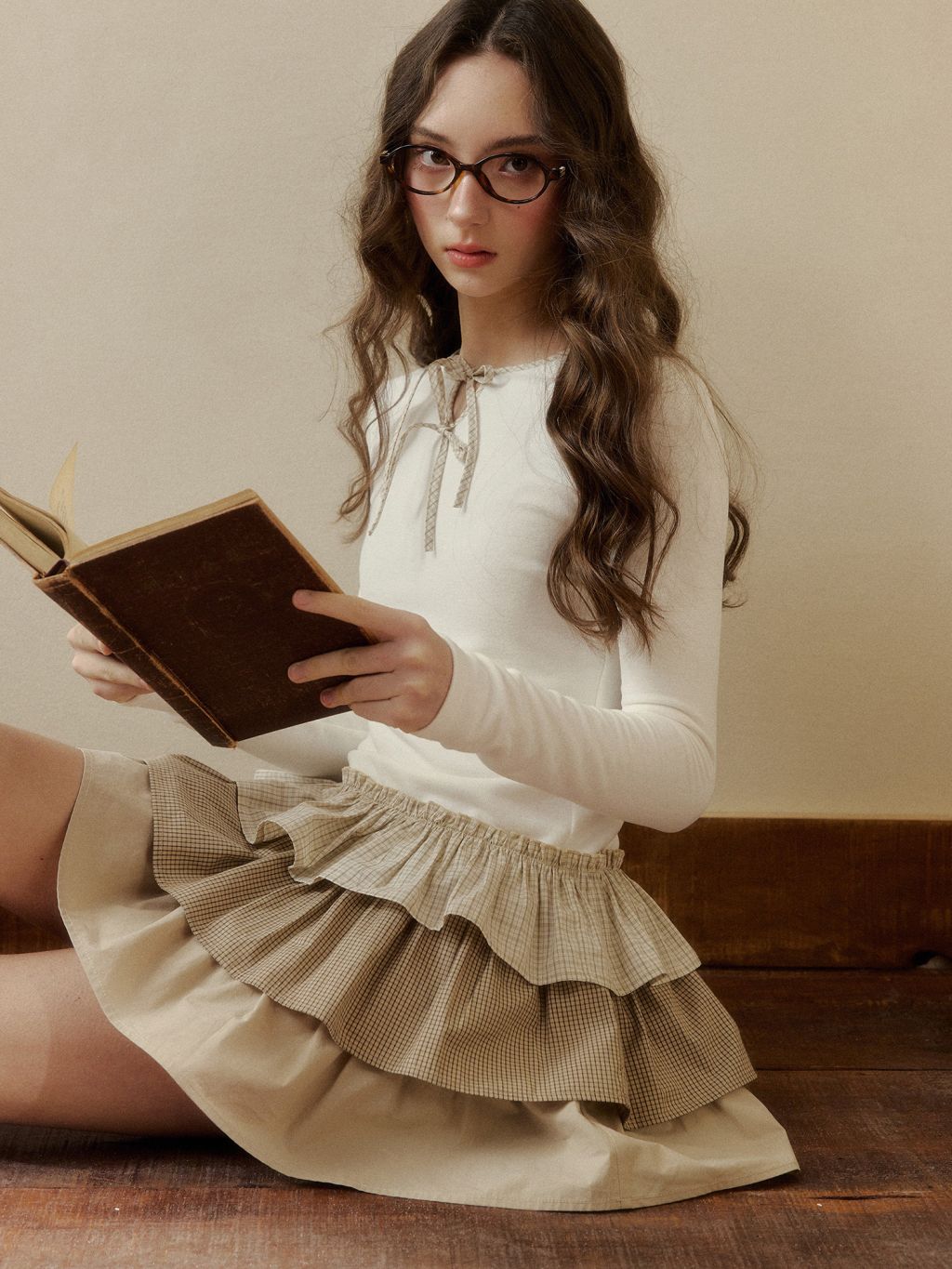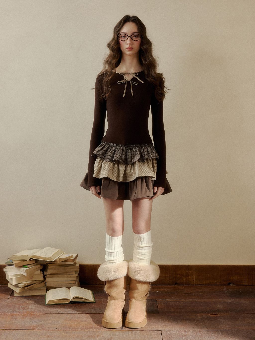- 니트 톱 + 3단 러플 스커트로 코디 고민 없이 완성도 높은 실루엣