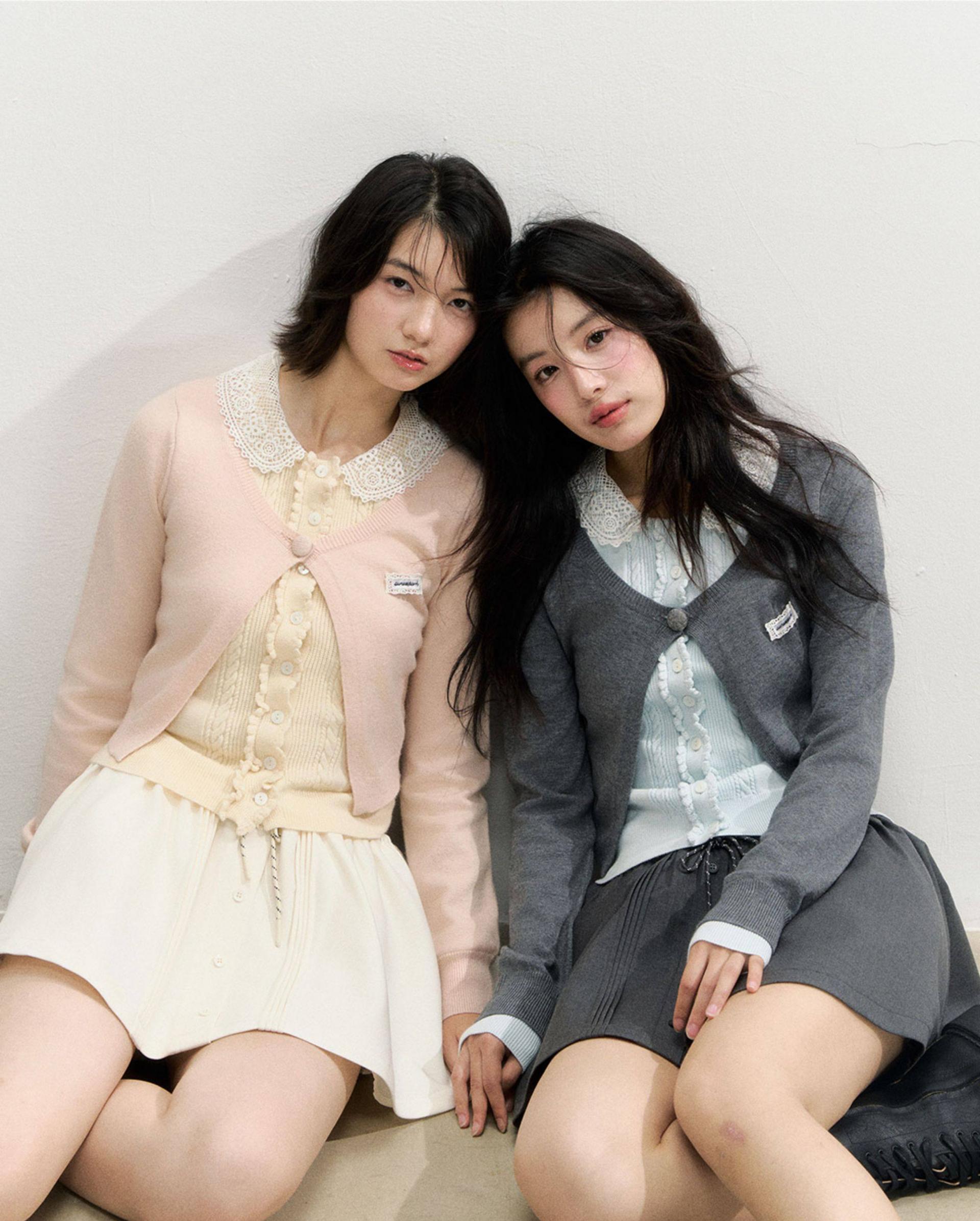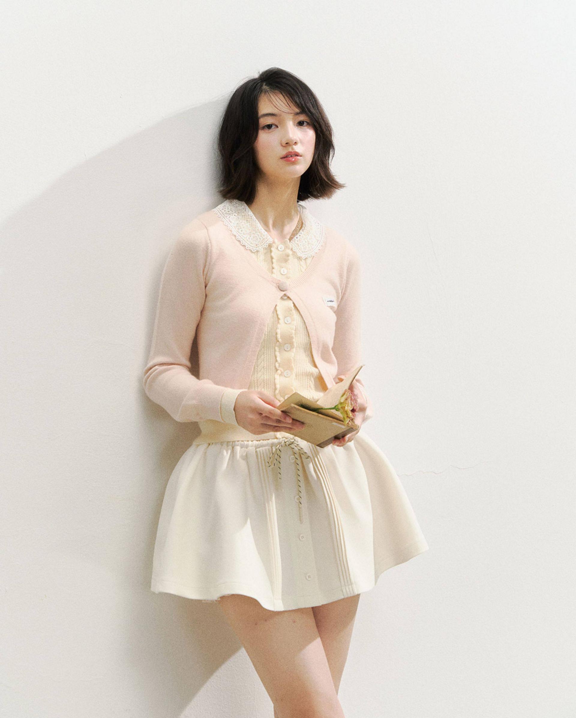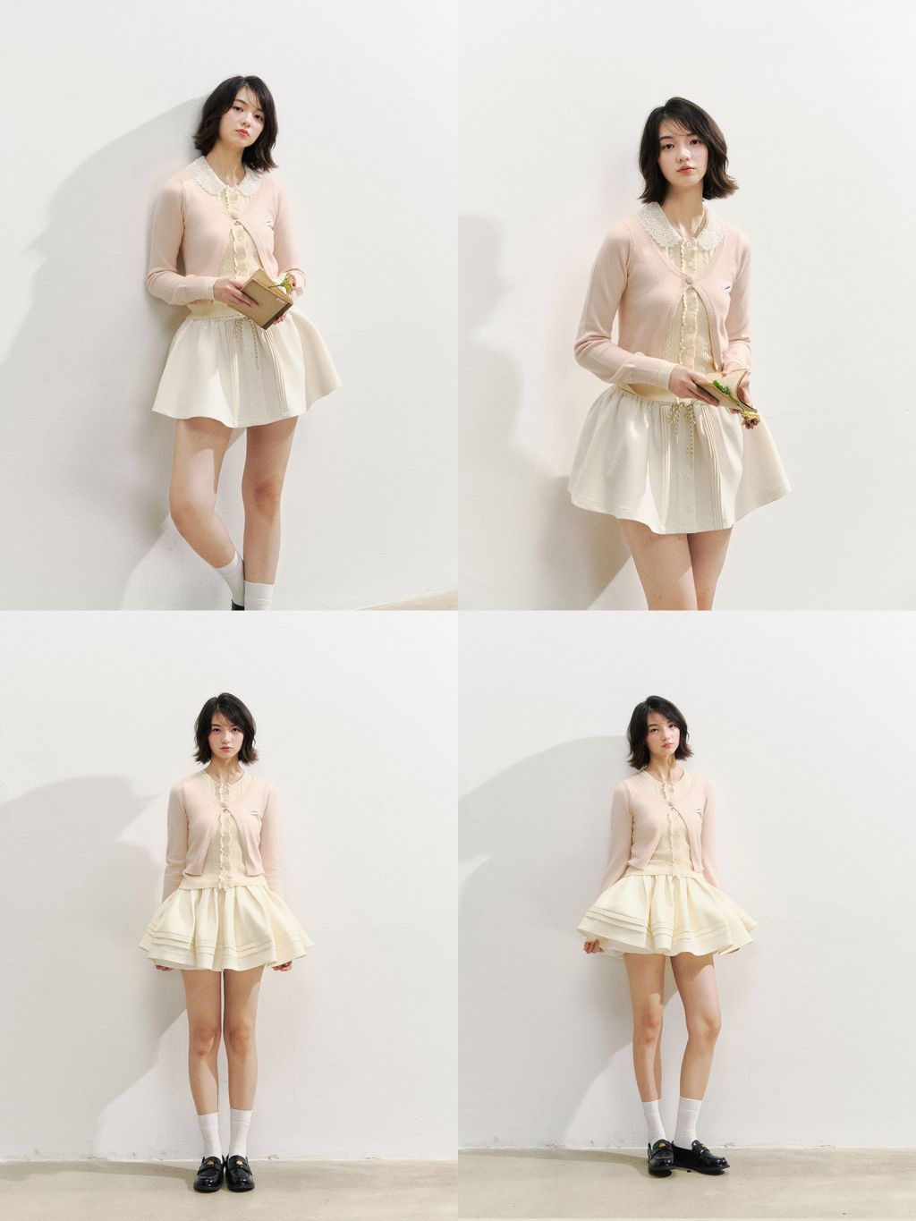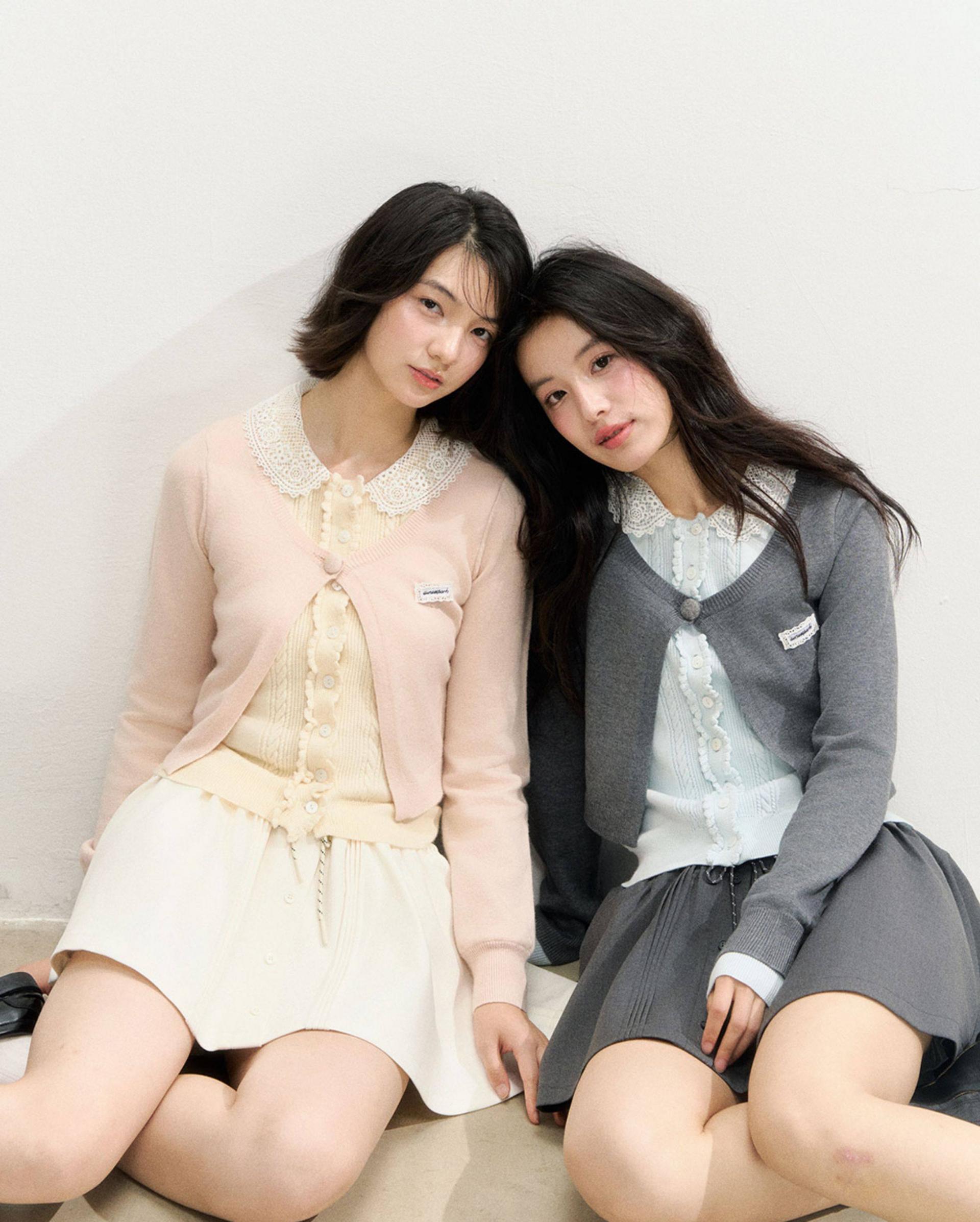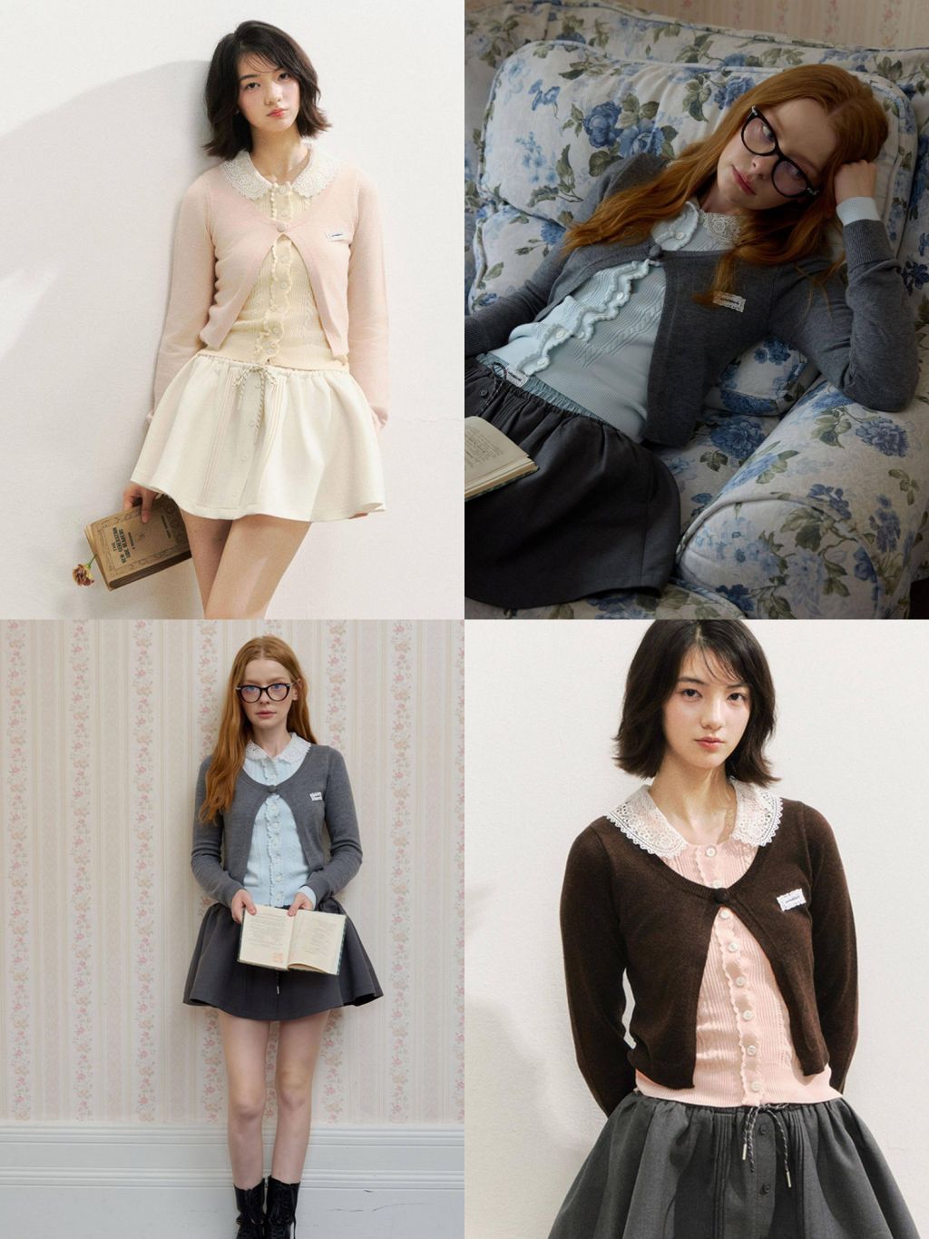 레이스 카라 블라우스를 레이어드한 듯한 ‘페이크 투피스’ 디자인으로, 단정한 프레피 무드를 한 번에 완성하는 가디건입니다. 슬림한 바디핏과 짧은 기장감이 스커트/하이웨이스트와 특히 예쁘게 떨어집니다.