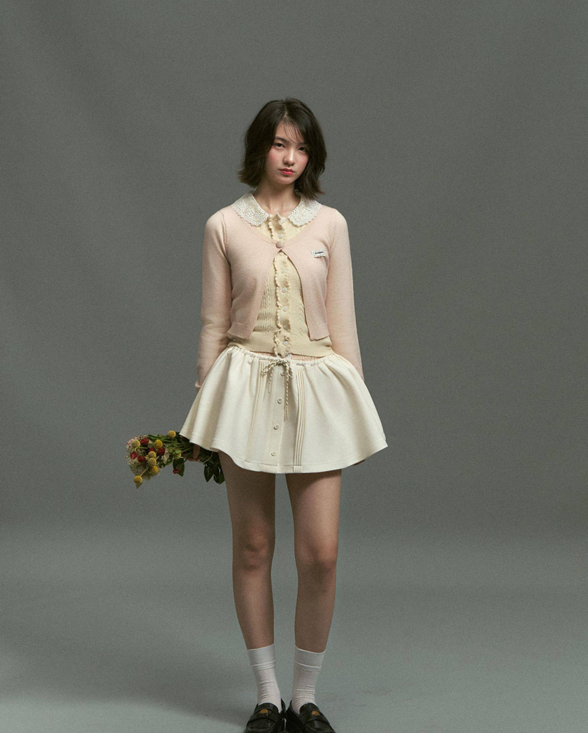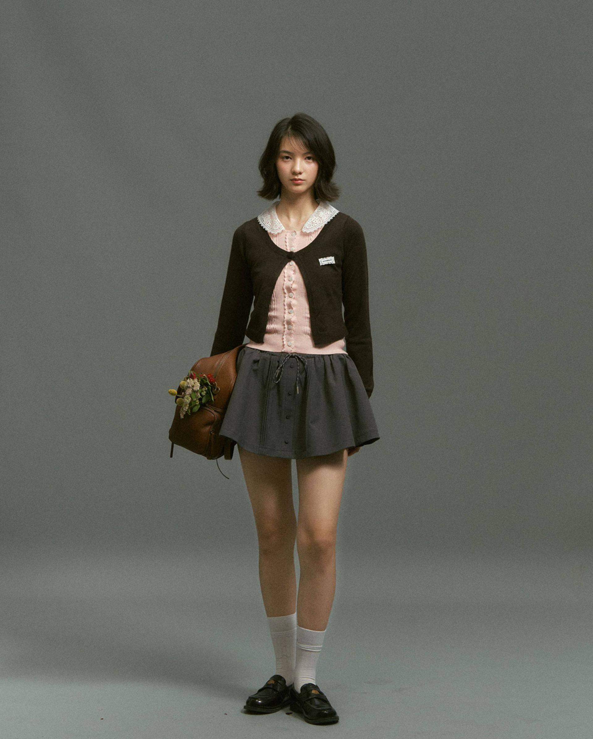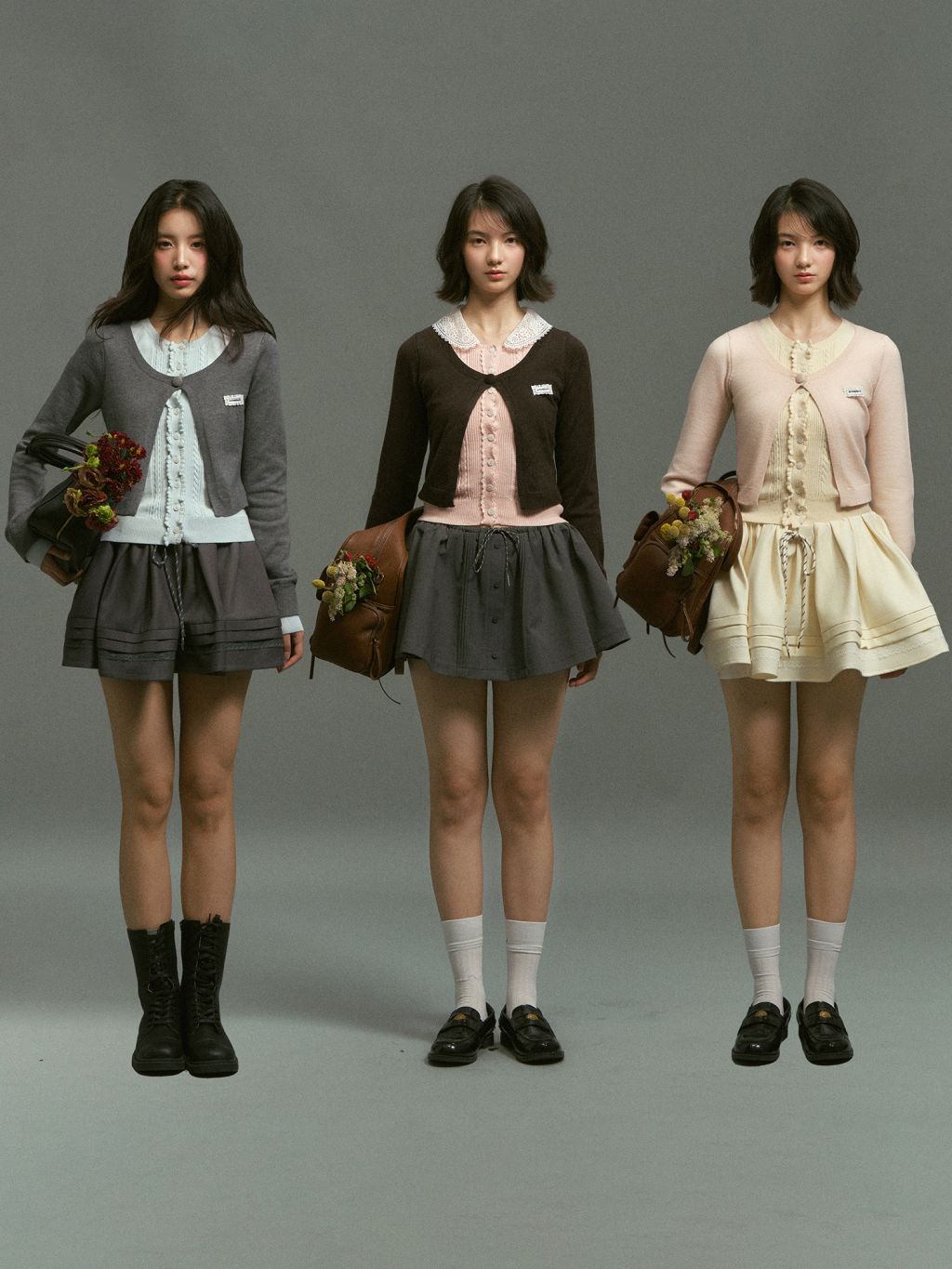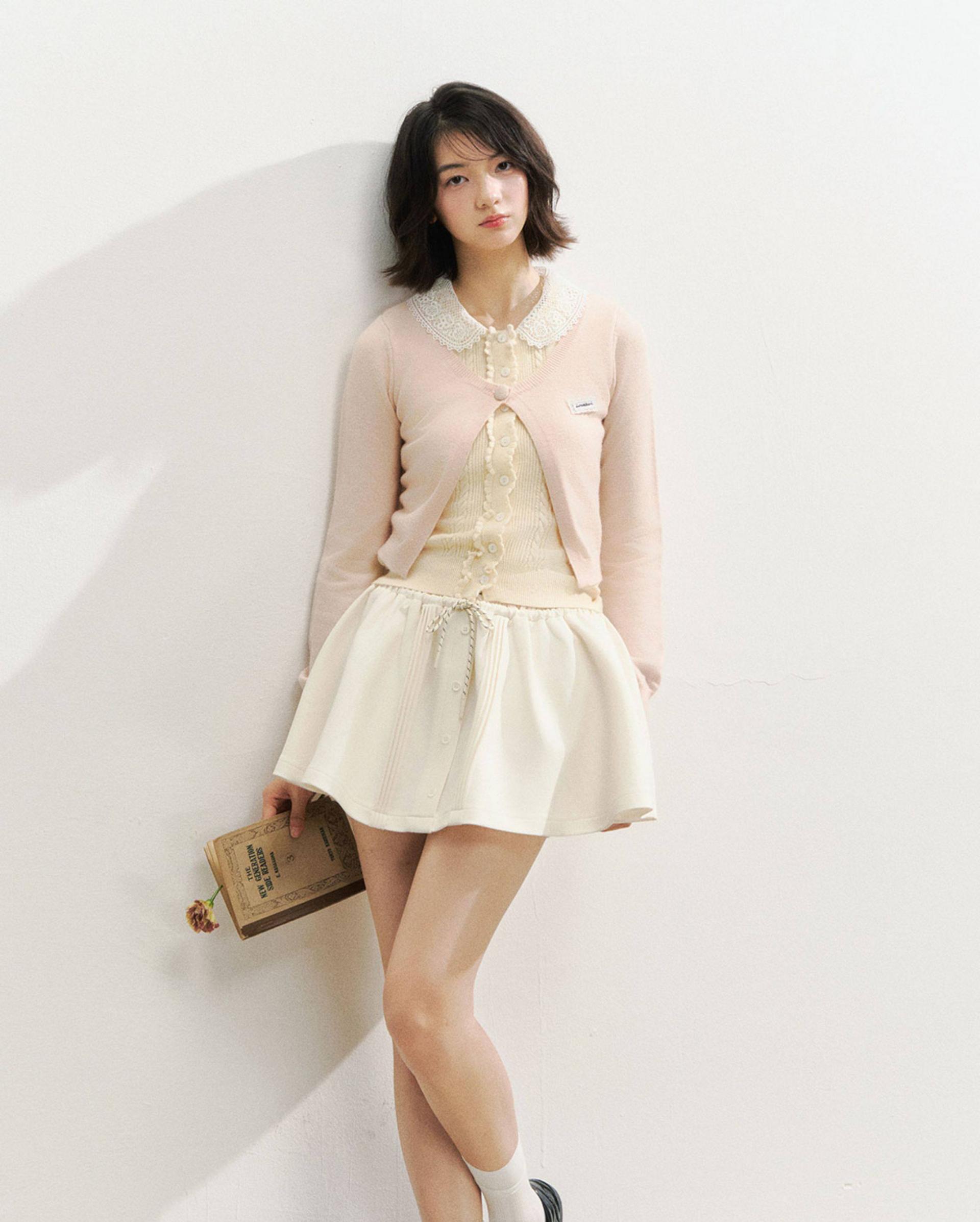 레이스 카라 블라우스를 레이어드한 듯한 ‘페이크 투피스’ 디자인으로, 단정한 프레피 무드를 한 번에 완성하는 가디건입니다. 슬림한 바디핏과 짧은 기장감이 스커트/하이웨이스트와 특히 예쁘게 떨어집니다.