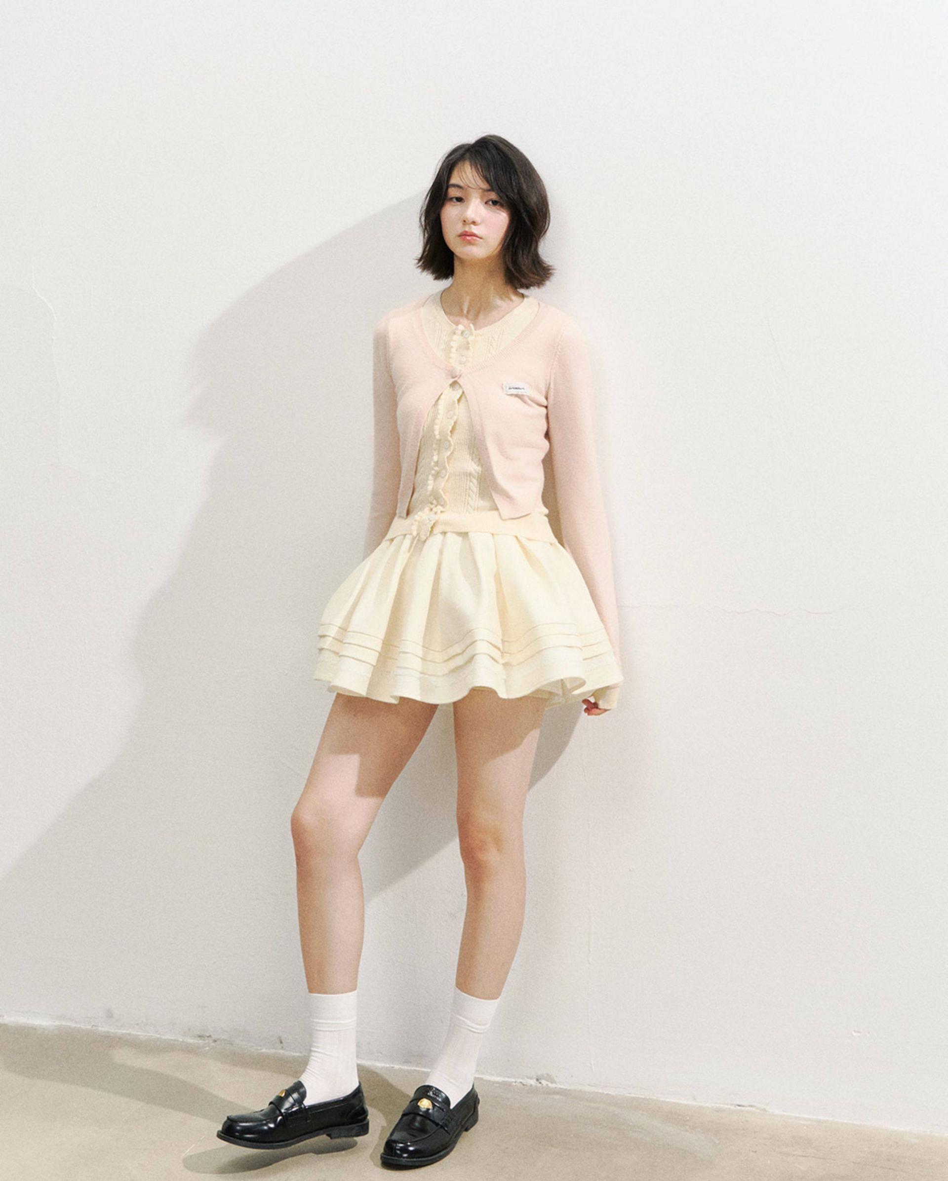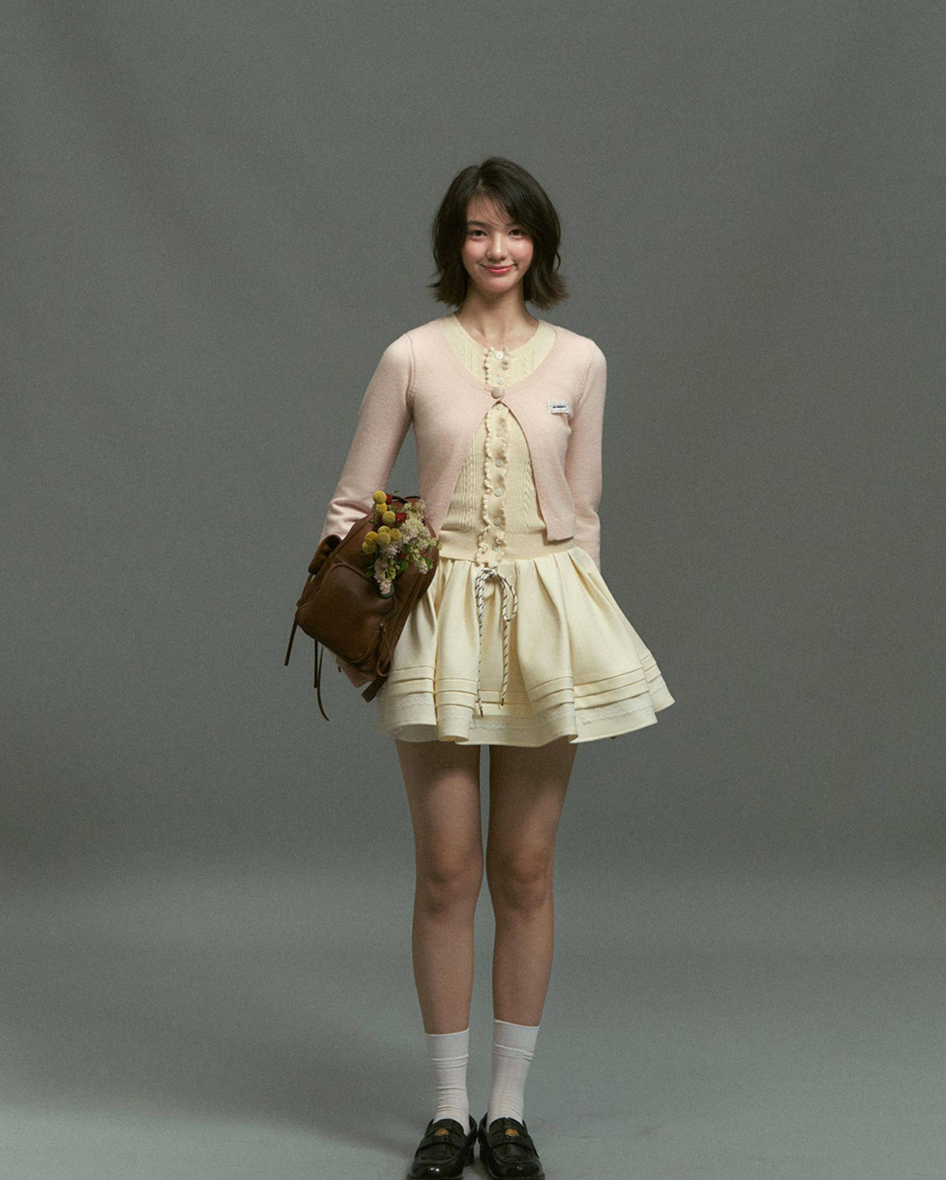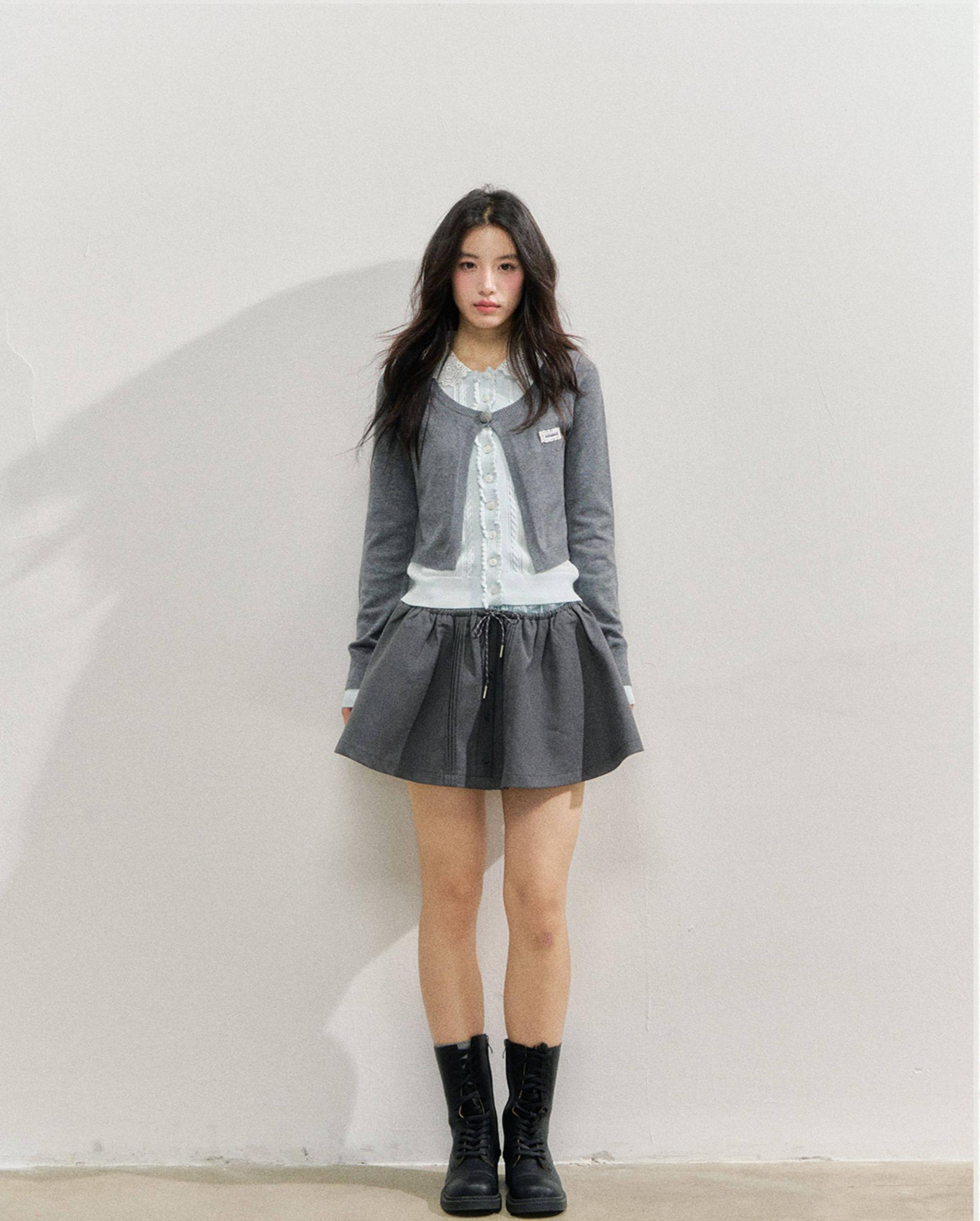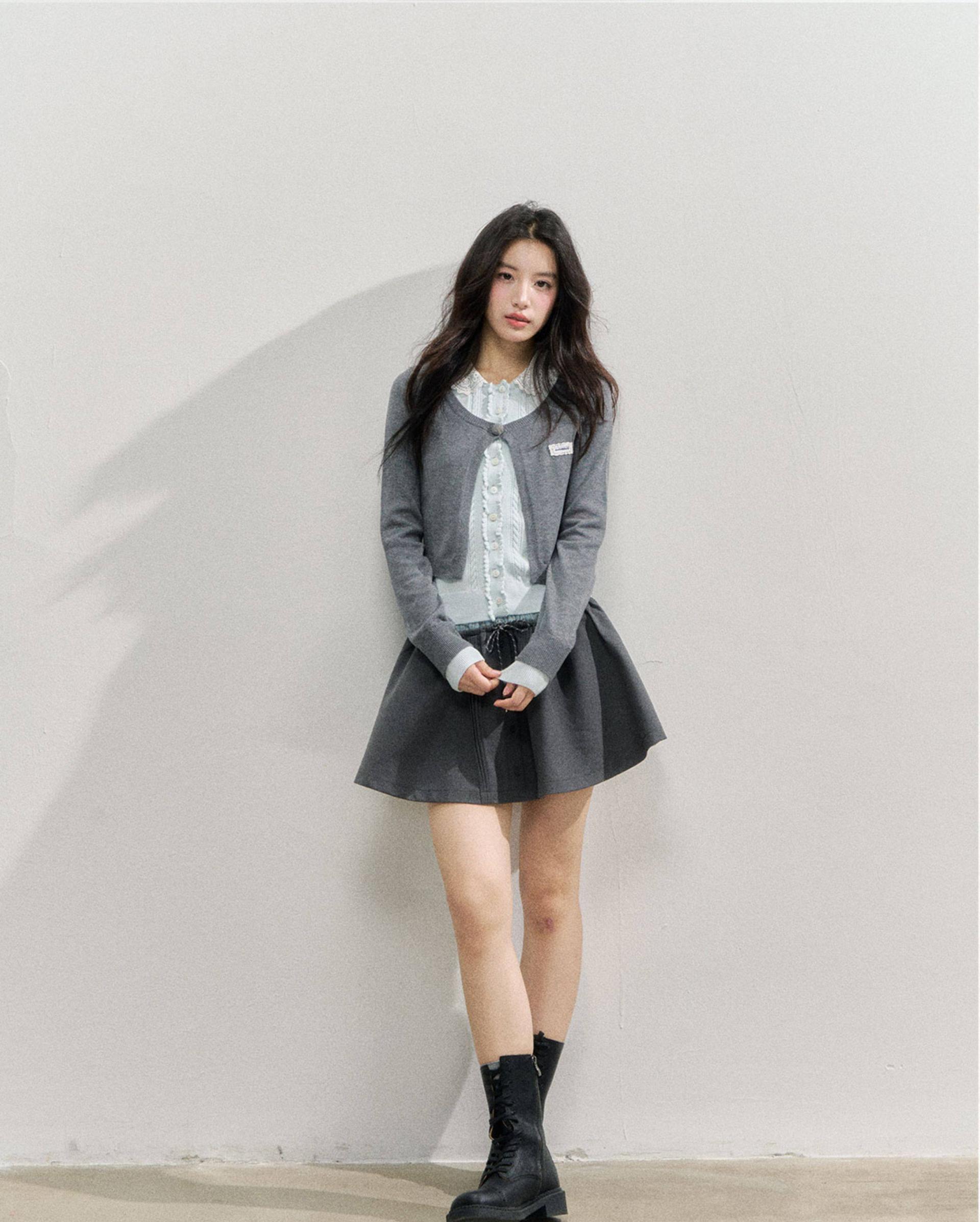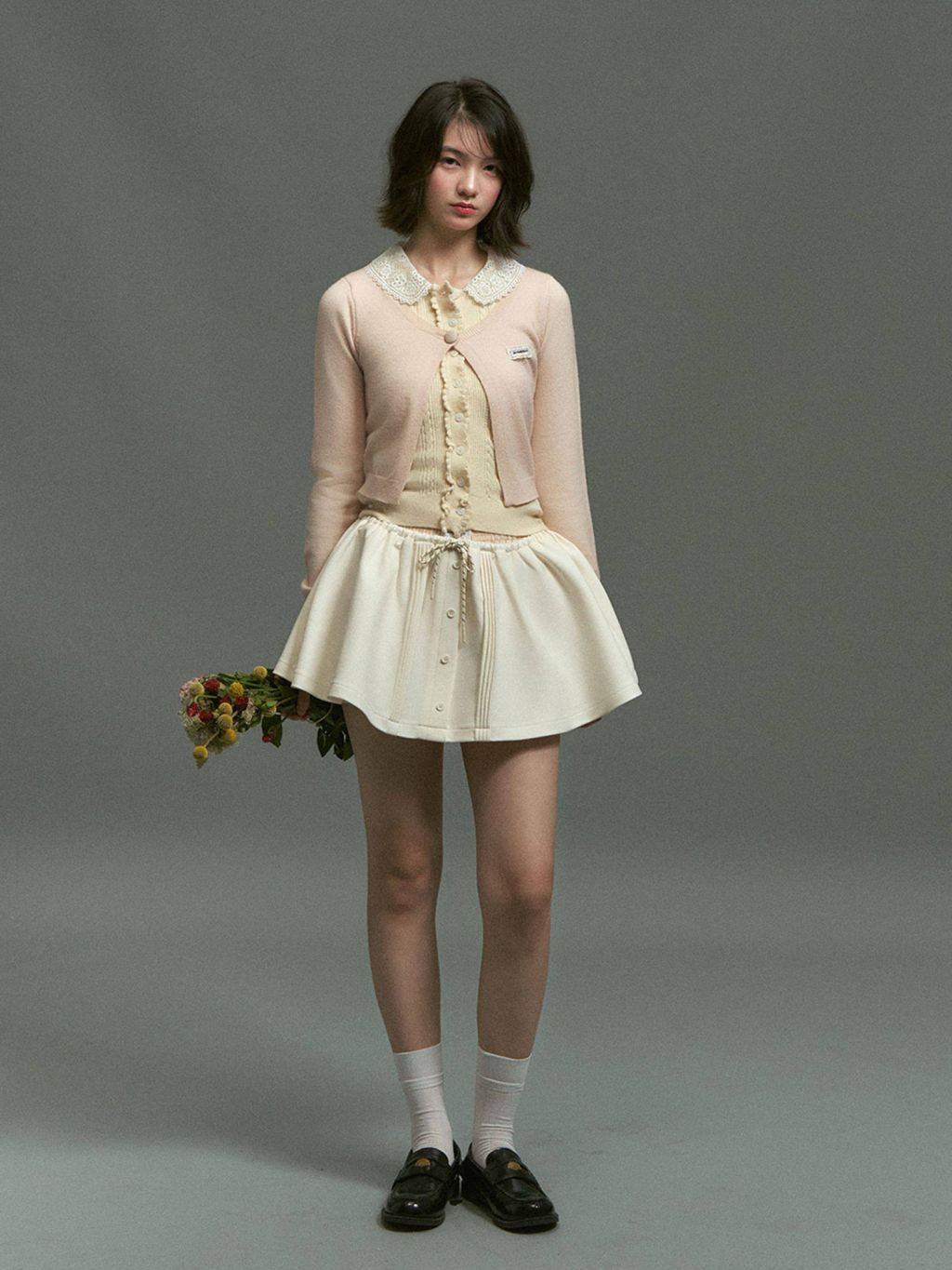 레이스 카라 블라우스를 레이어드한 듯한 ‘페이크 투피스’ 디자인으로, 단정한 프레피 무드를 한 번에 완성하는 가디건입니다. 슬림한 바디핏과 짧은 기장감이 스커트/하이웨이스트와 특히 예쁘게 떨어집니다.