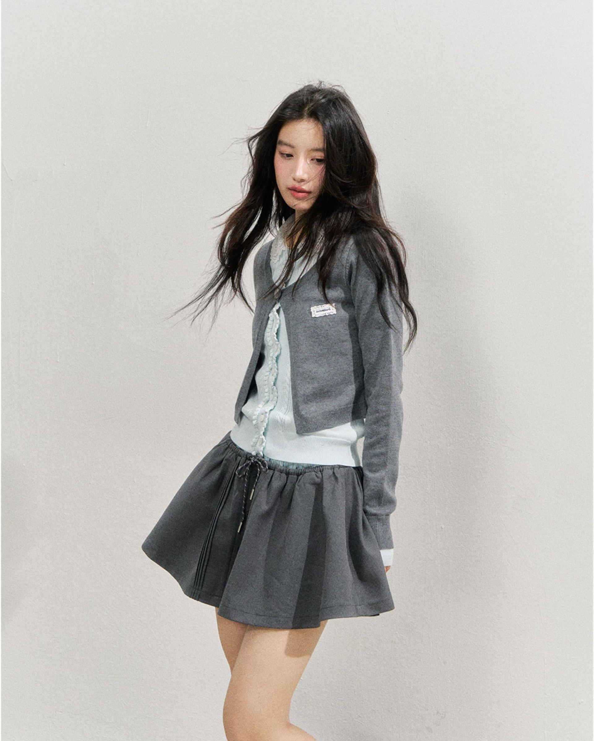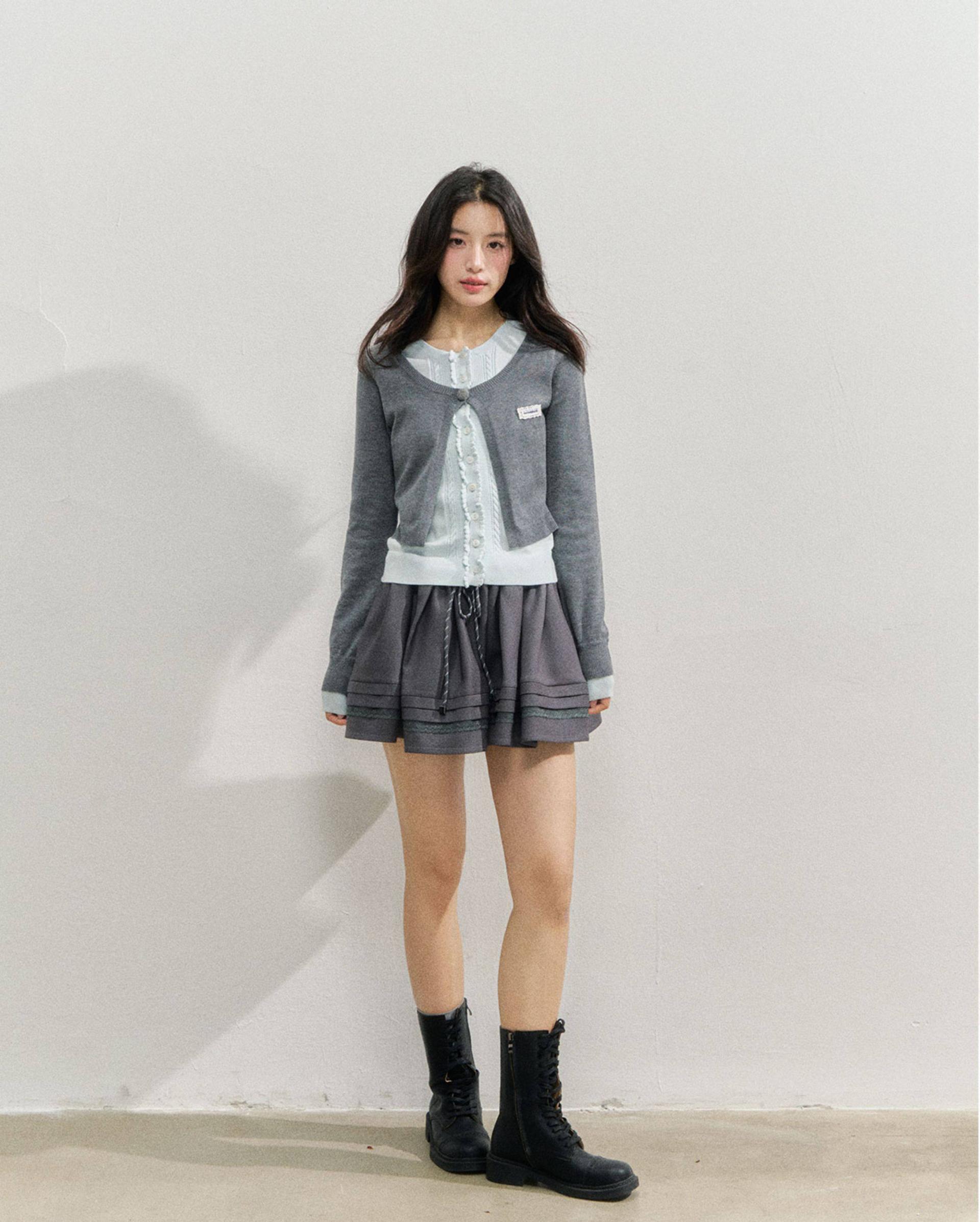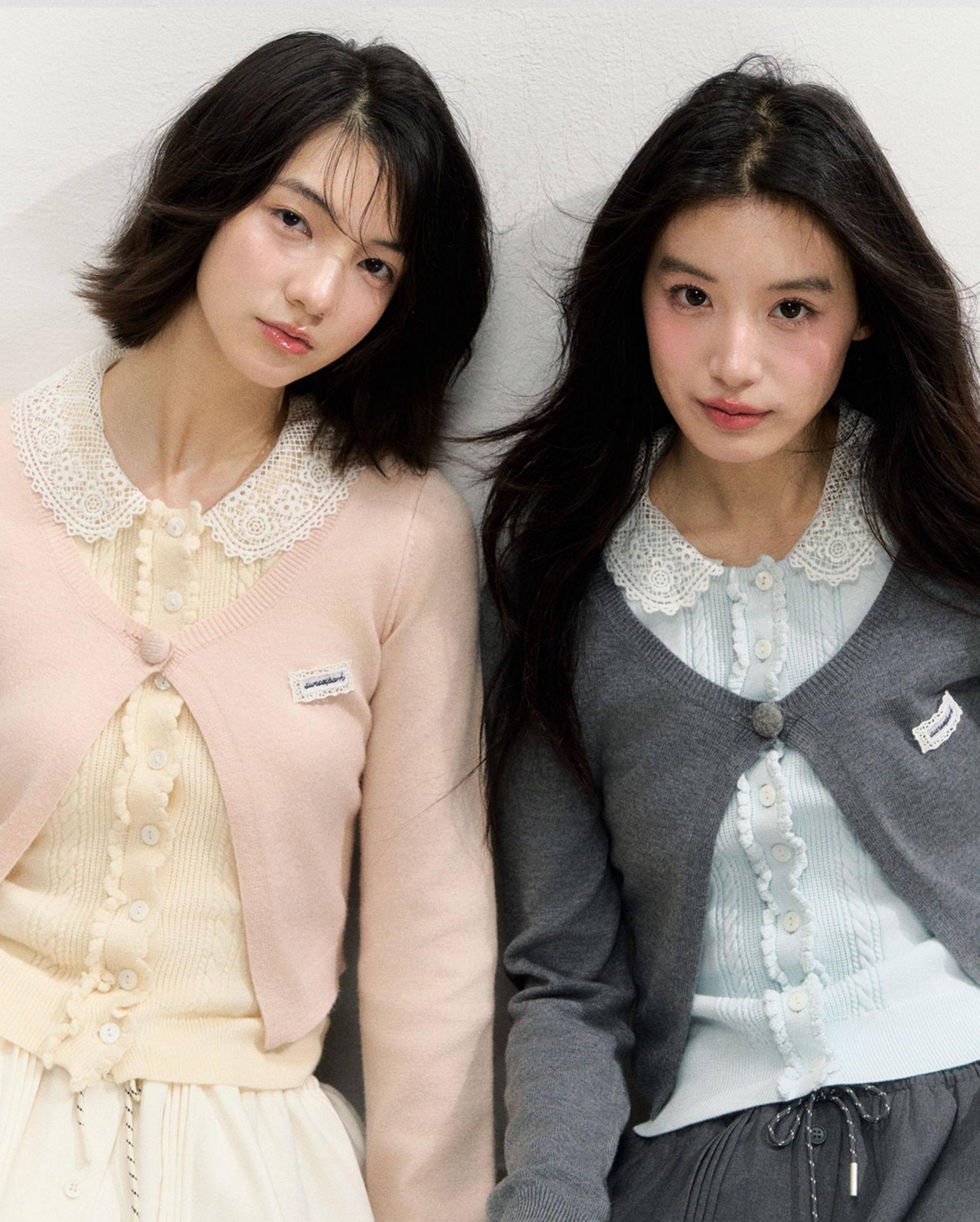 - 레이스 카라 + 프릴 플라켓 레이어드 디테일로 블라우스/가디건을 함께 입은 듯한 효과