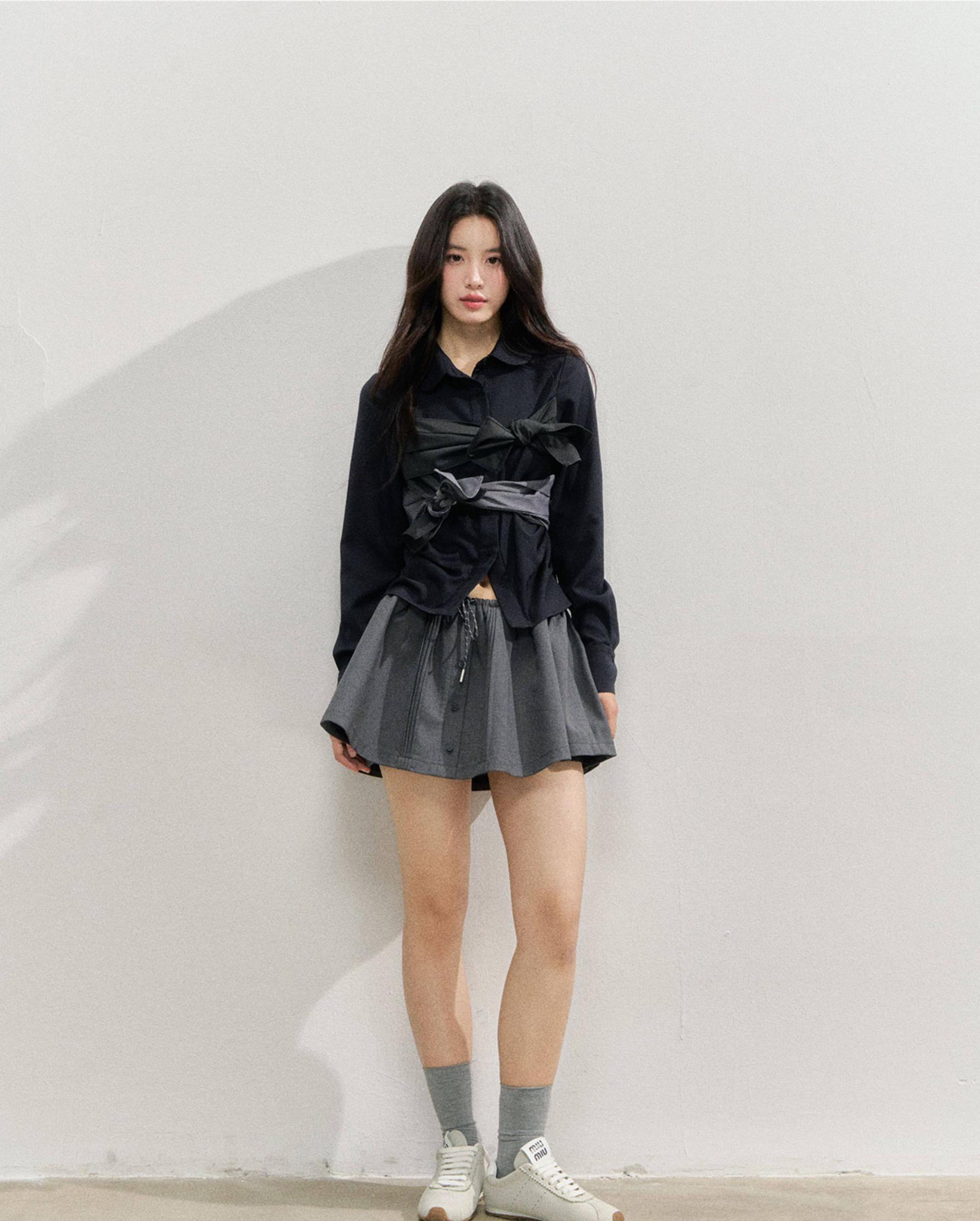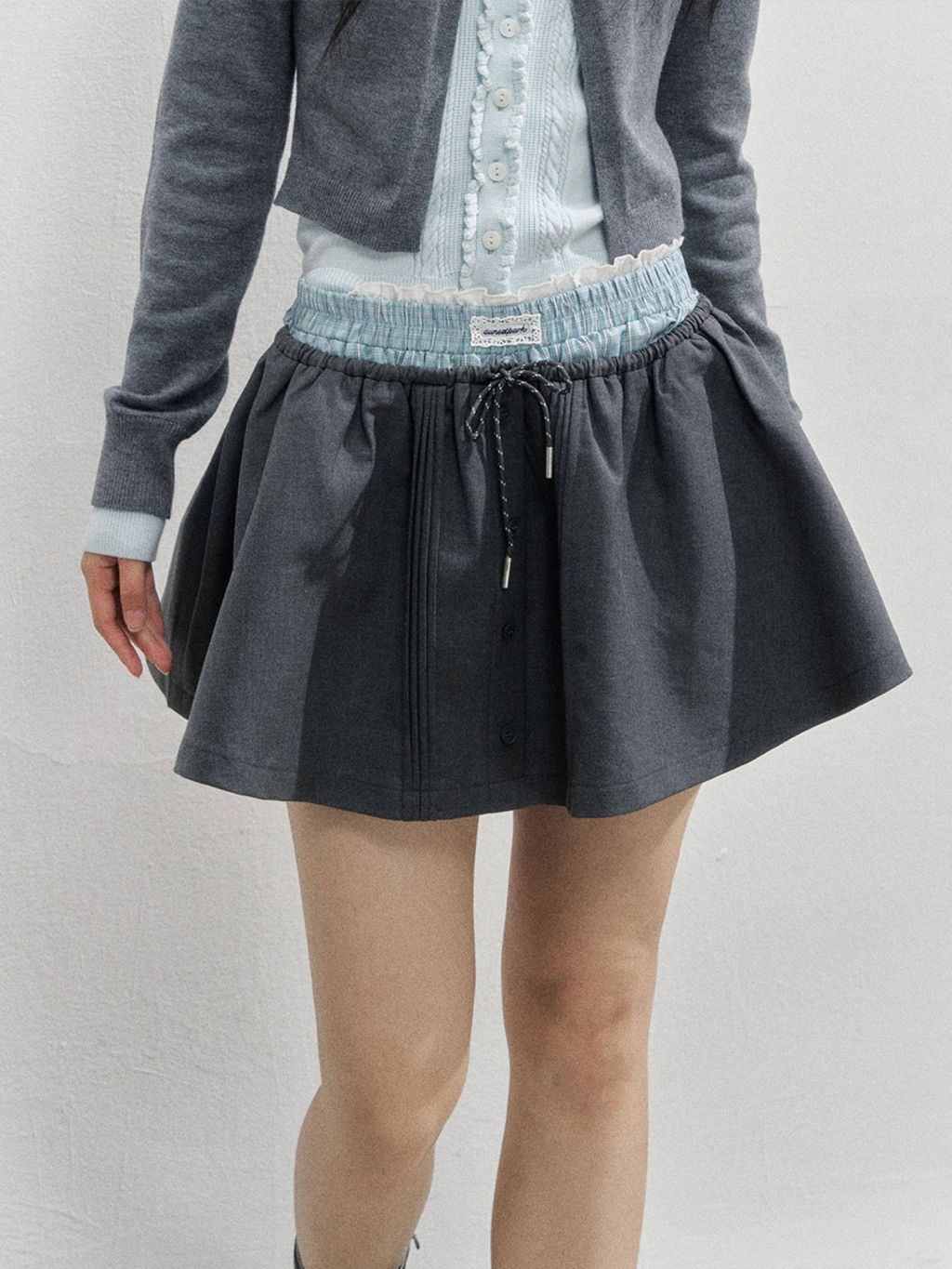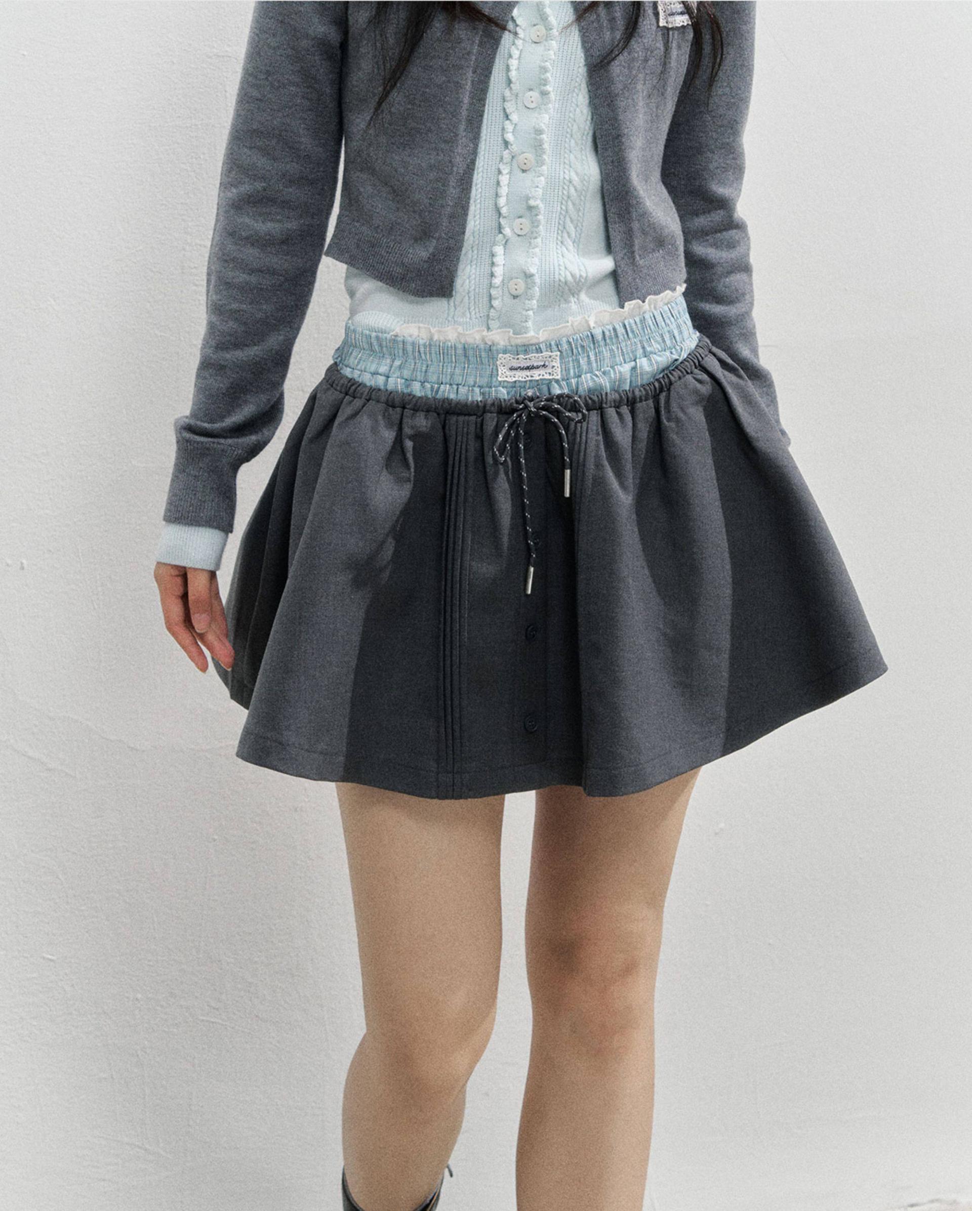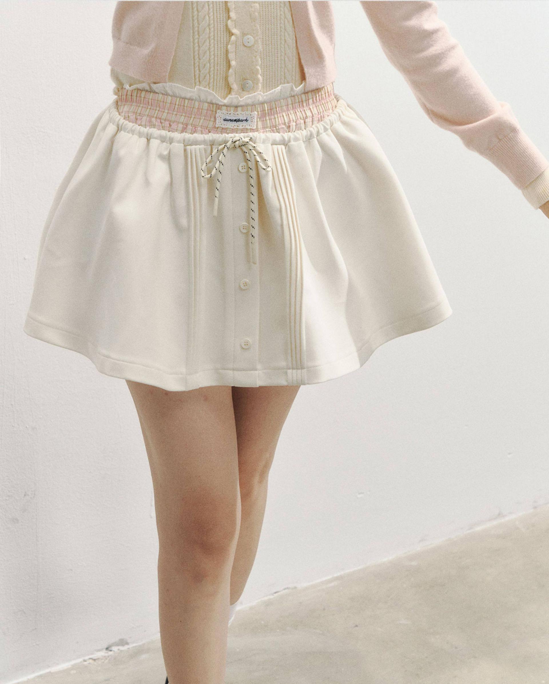 플레어로 퍼지는 스케이터 실루엣에 드로스트링 허리와 버튼 플라켓 디테일을 더해, 편하면서도 ‘프레피 걸’ 무드가 확 살아나는 스커트입니다. 허리 배색/패턴 밴드가 포인트가 되어 상의는 심플해도 코디가 완성됩니다.