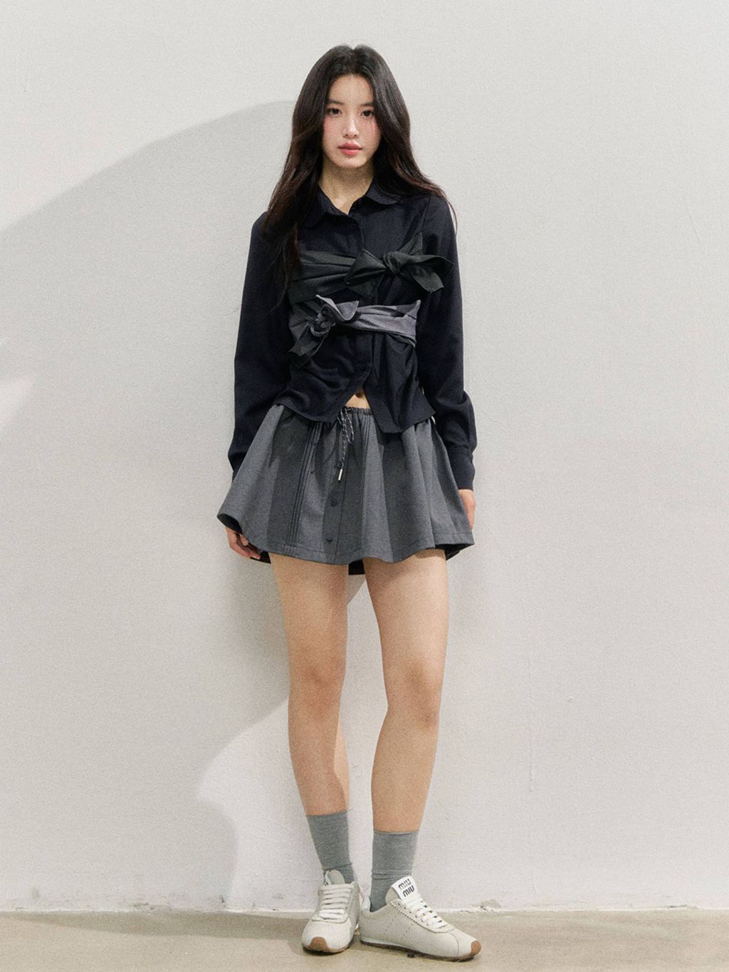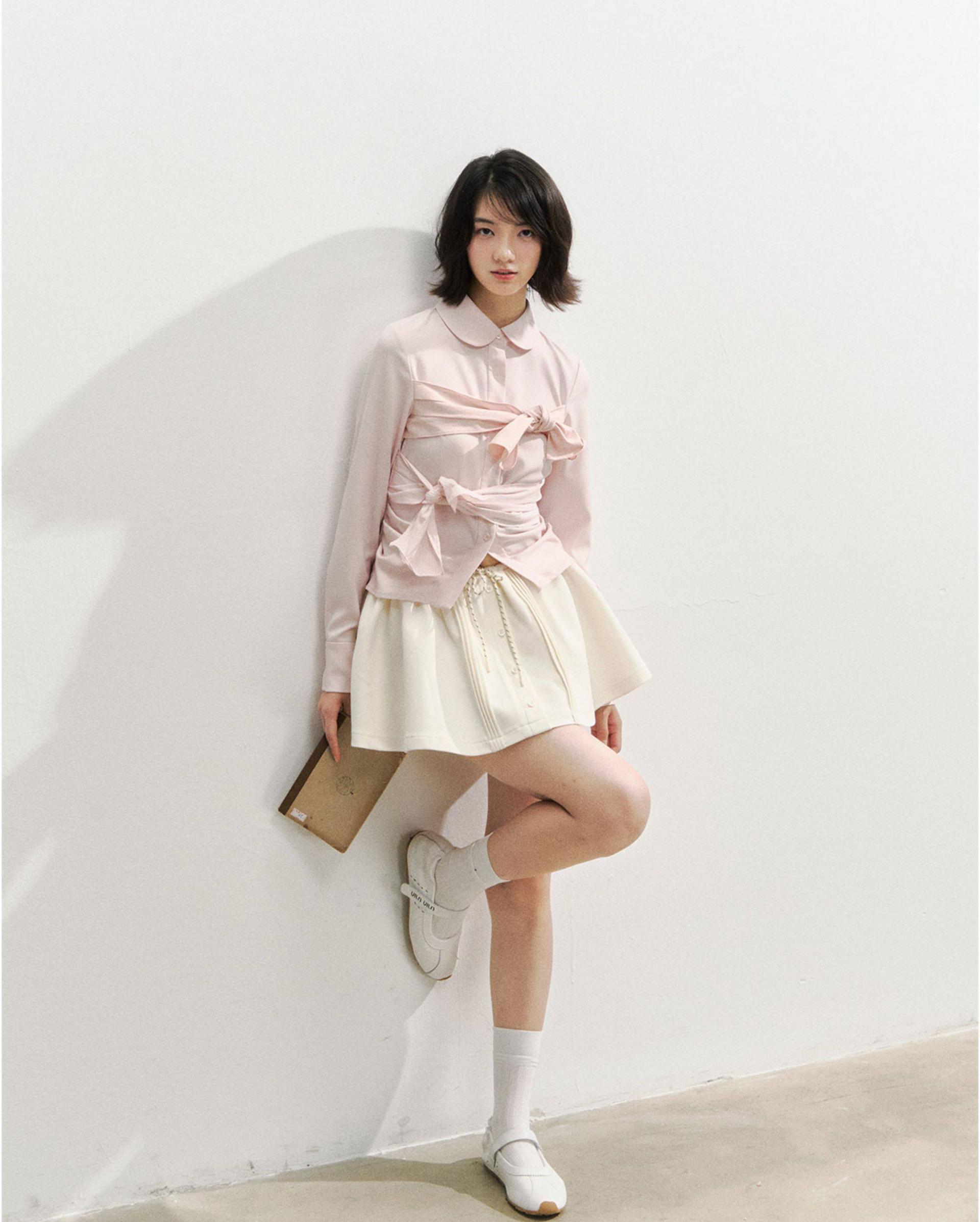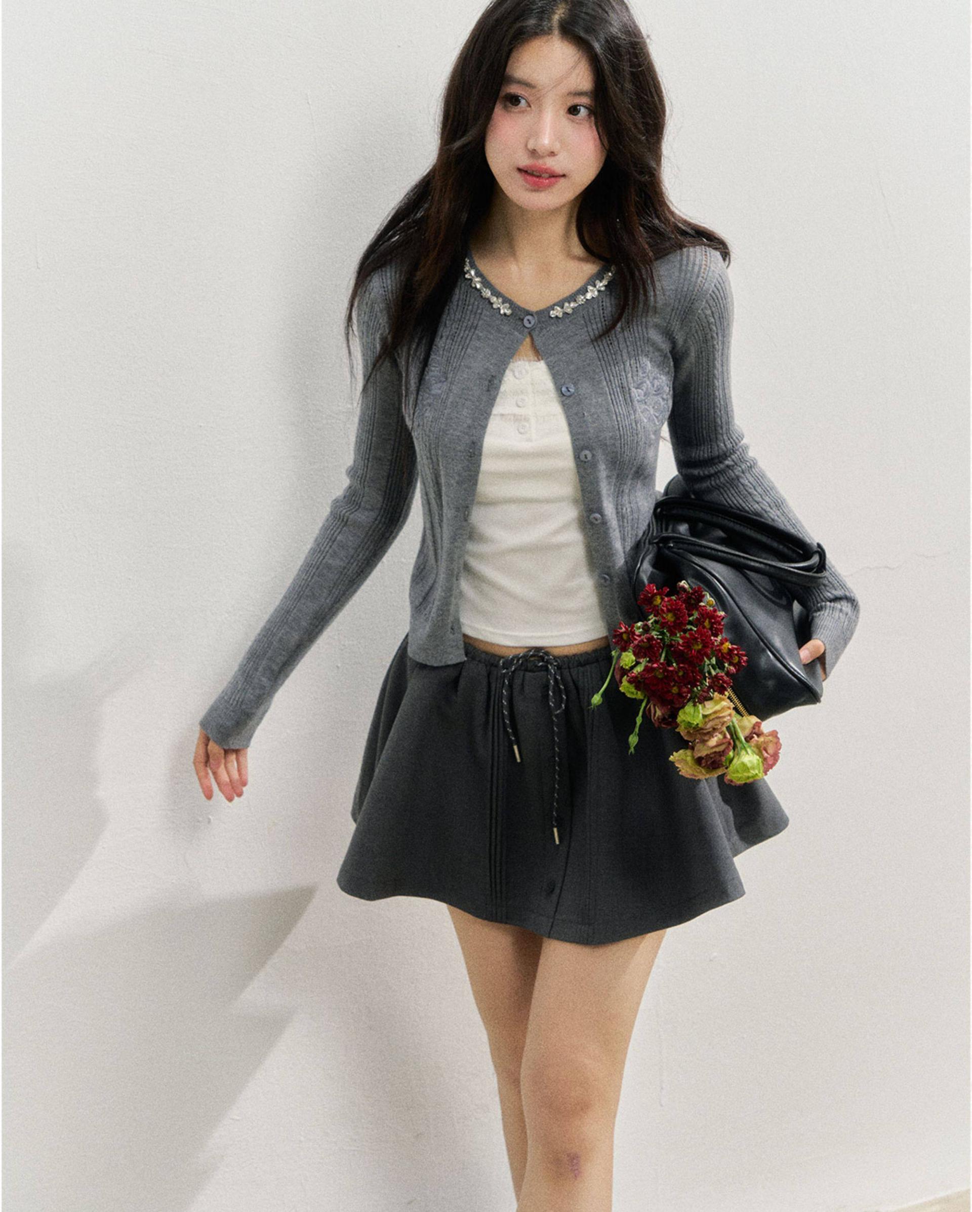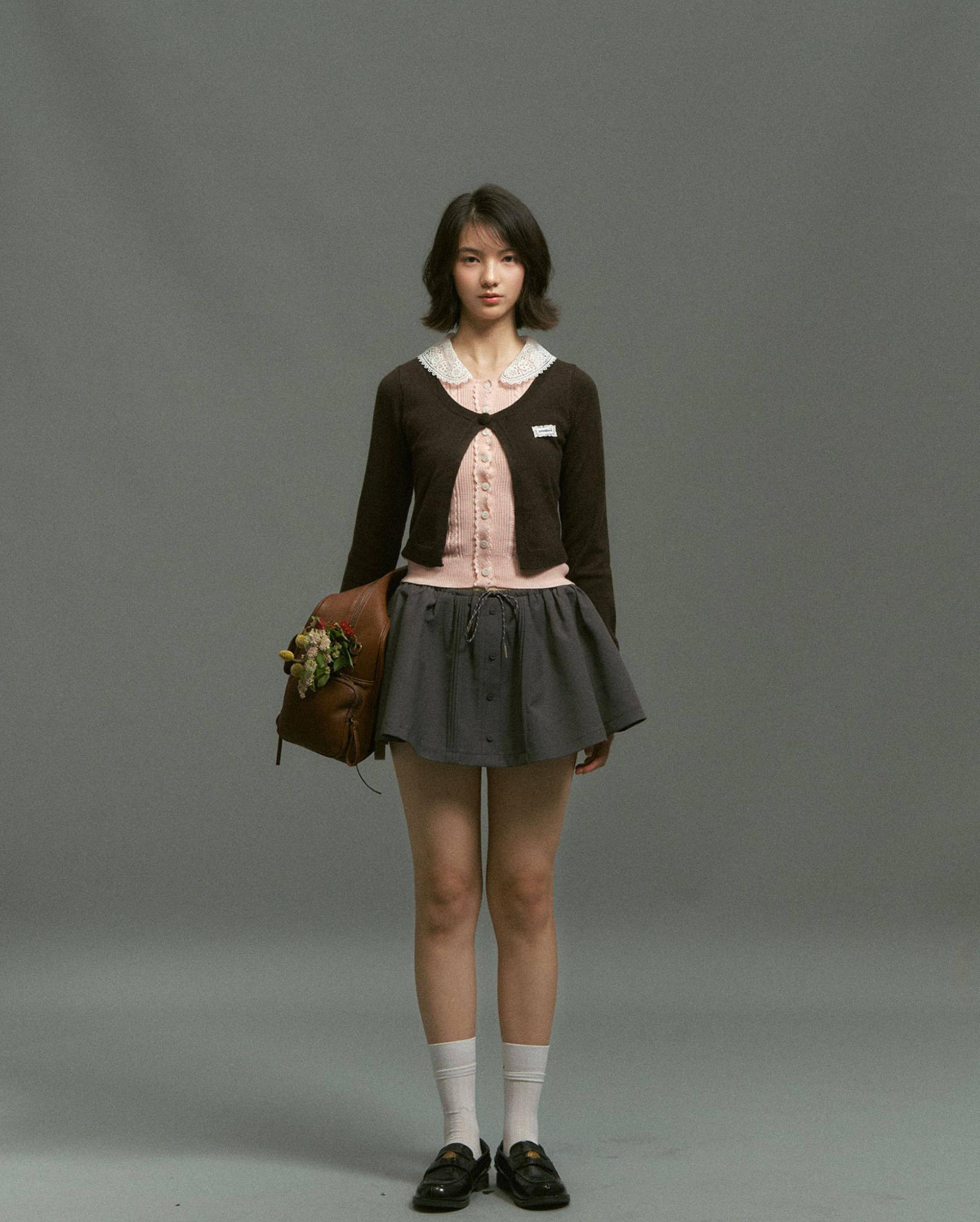 플레어로 퍼지는 스케이터 실루엣에 드로스트링 허리와 버튼 플라켓 디테일을 더해, 편하면서도 ‘프레피 걸’ 무드가 확 살아나는 스커트입니다. 허리 배색/패턴 밴드가 포인트가 되어 상의는 심플해도 코디가 완성됩니다.