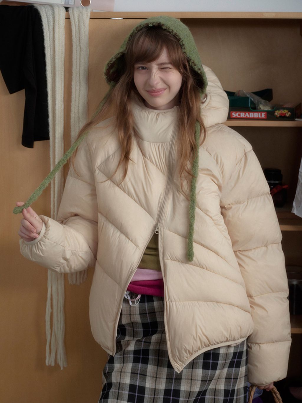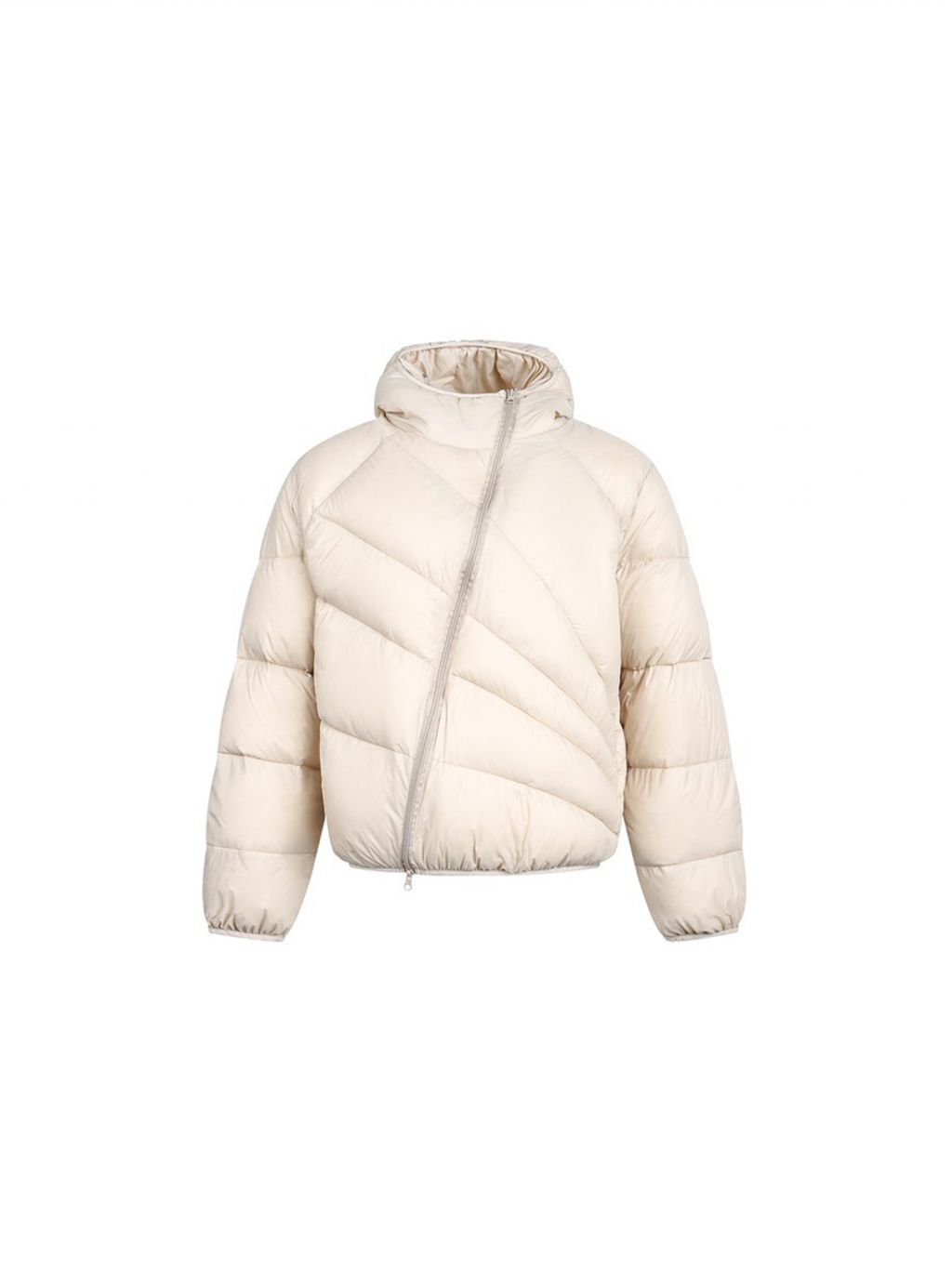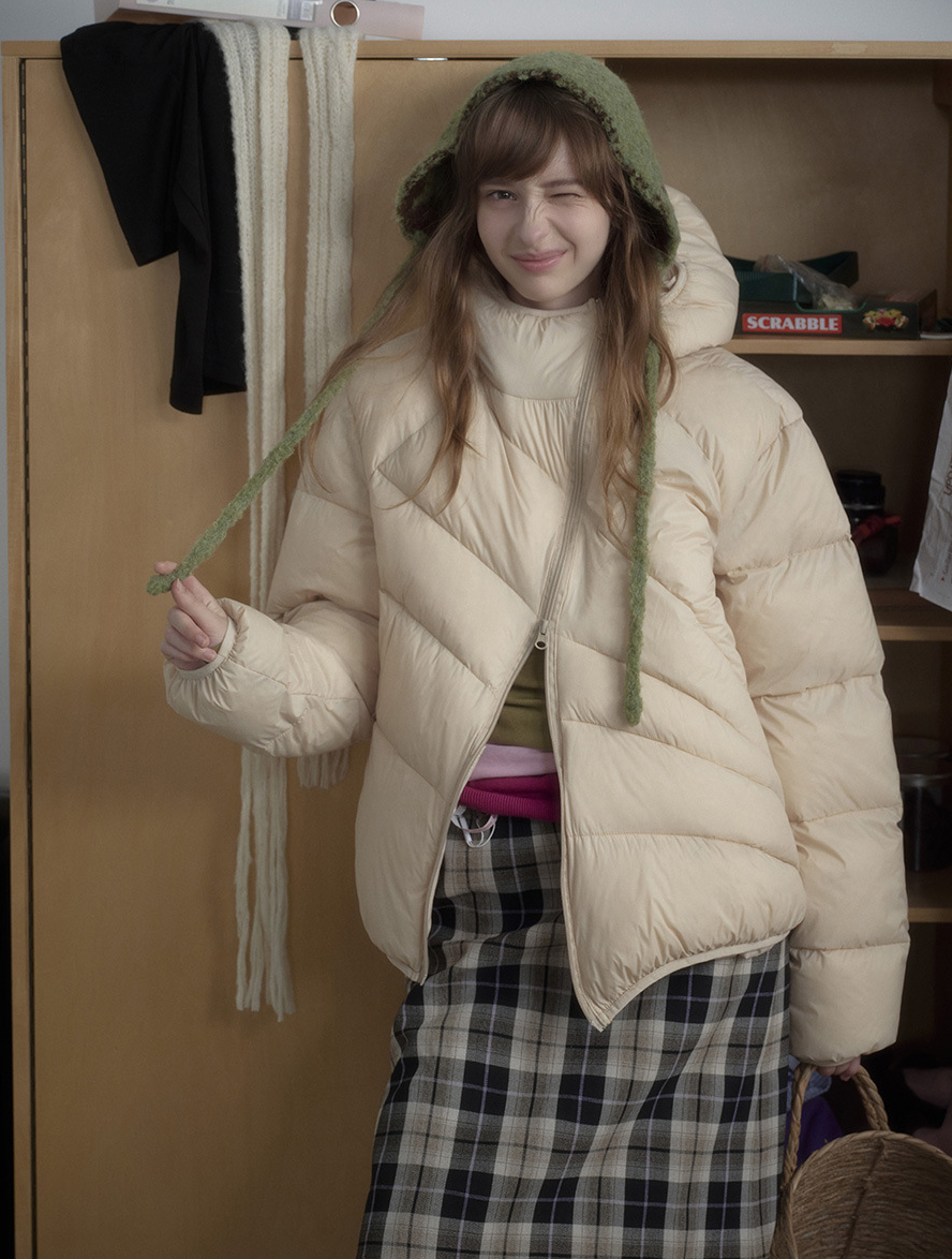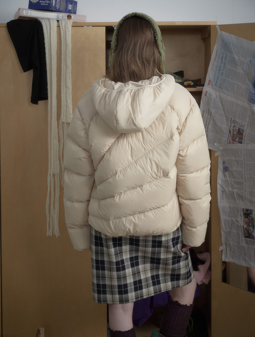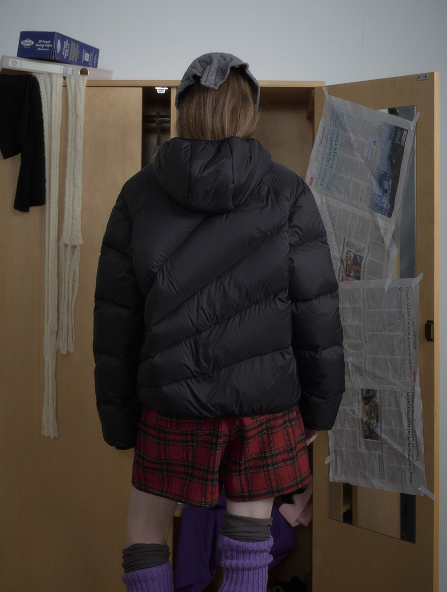 사선 지퍼 라인으로 한눈에 실루엣이 살아나는, 볼륨감 좋은 후드 다운 자켓 입니다. 툭 걸쳐도 키치한 스쿨 무드가 완성됩니다.