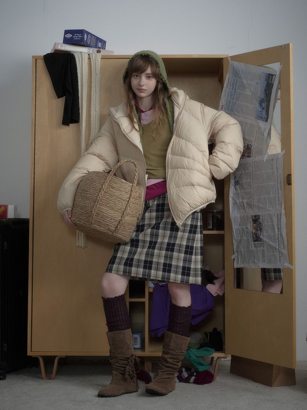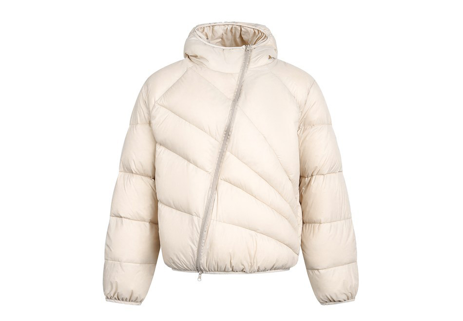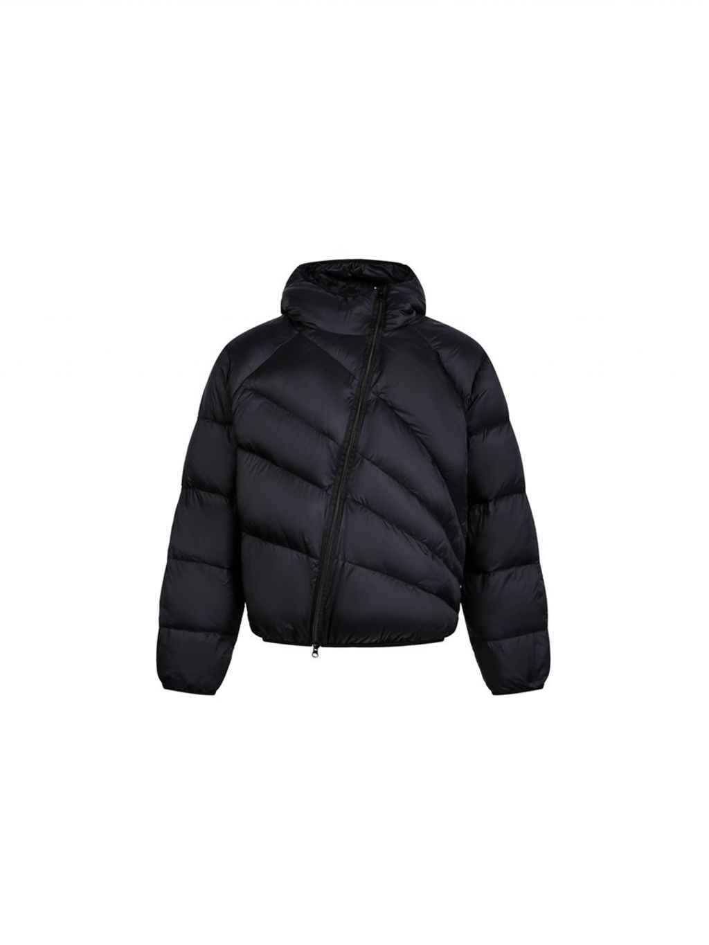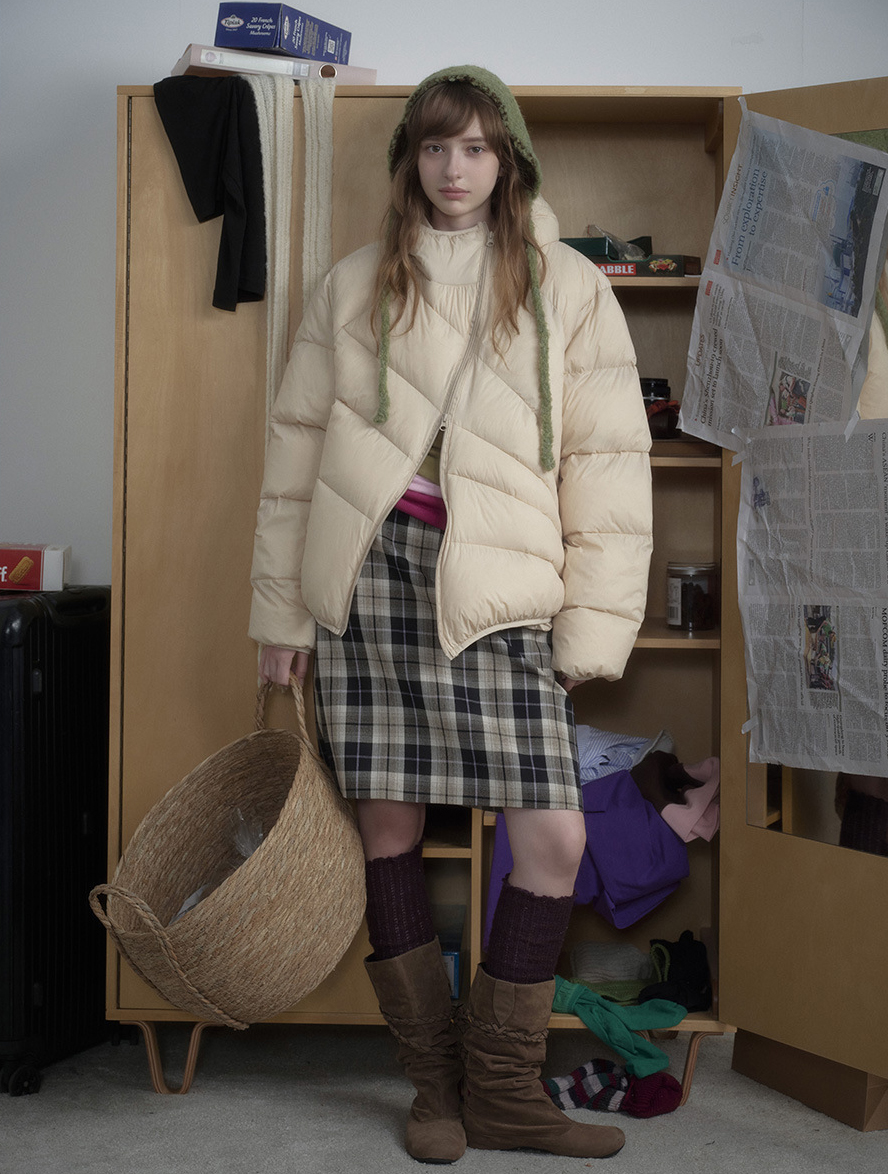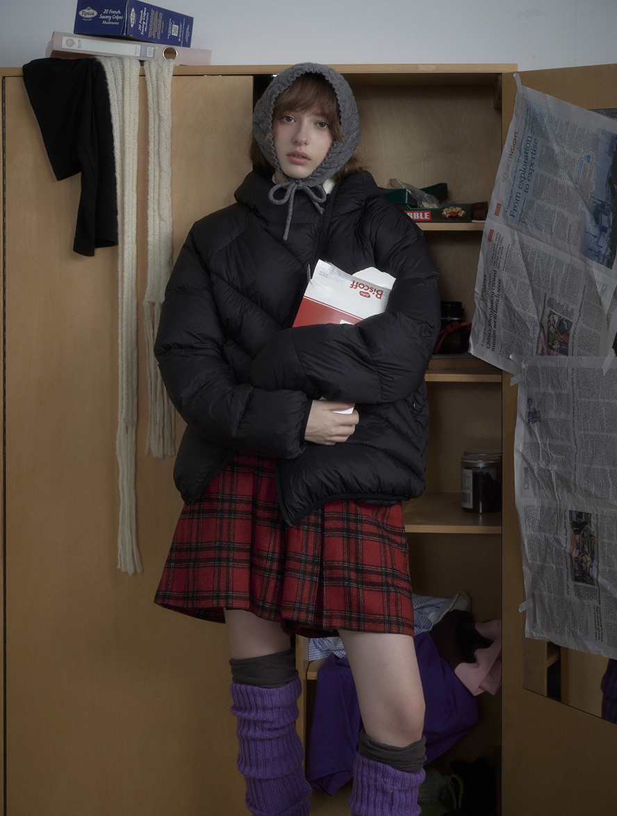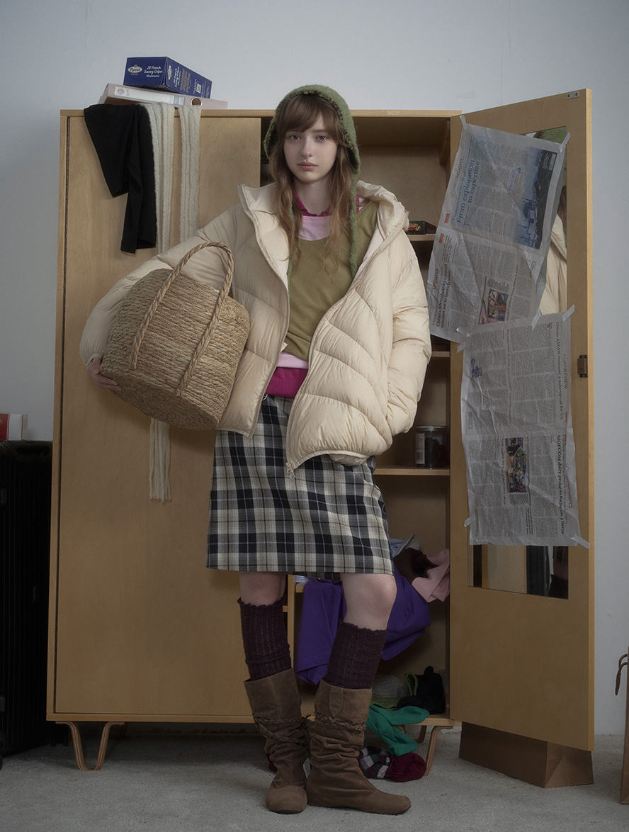 사선 지퍼 라인으로 한눈에 실루엣이 살아나는, 볼륨감 좋은 후드 다운 자켓 입니다. 툭 걸쳐도 키치한 스쿨 무드가 완성됩니다.
