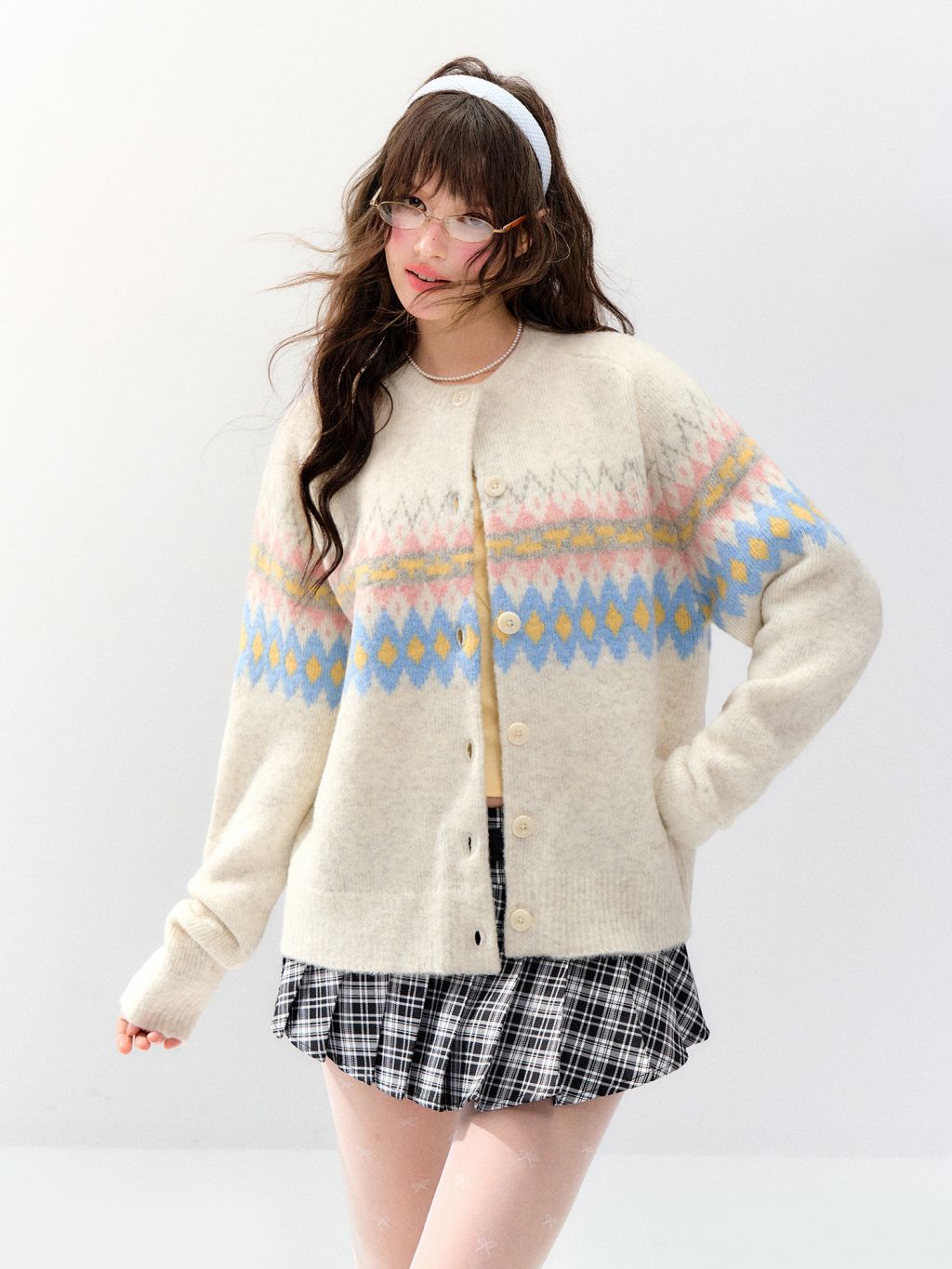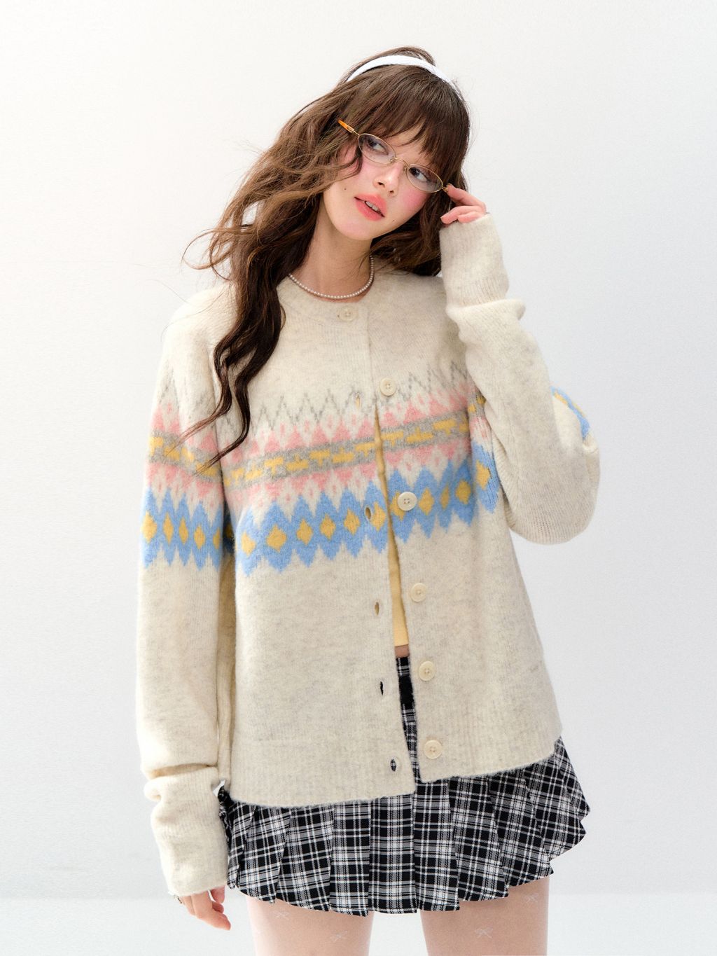 파스텔 페어아일 패턴이 한 번에 ‘겨울 러블리 무드’를 완성해주는 포근한 니트 가디건이에요. 여유 있는 루즈핏이라 티셔츠·셔츠 위에 툭 걸치기만 해도 스타일이 살아납니다.