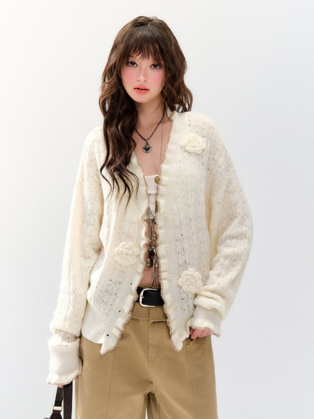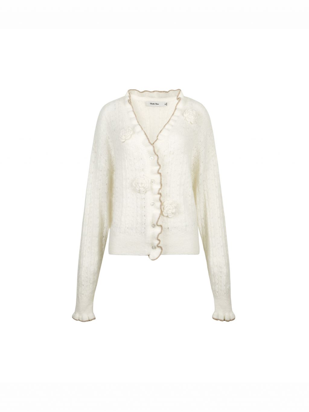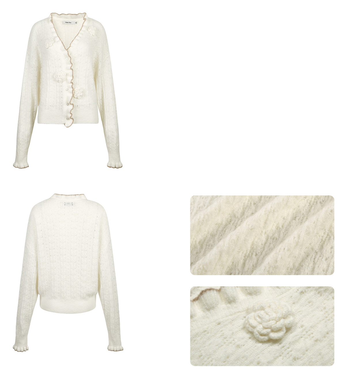 보송한 헤어리 텍스처의 아이보리 니트에 오픈워크 짜임과 프릴 레이스 엣지를 더해, 걸치는 순간 빈티지 스윗 무드가 완성되는 가디건이에요. 입체 플라워 포인트와 진주 버튼 디테일이 러블리한 포인트가 됩니다.