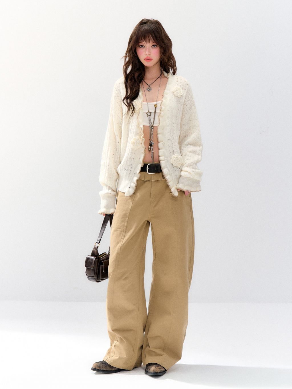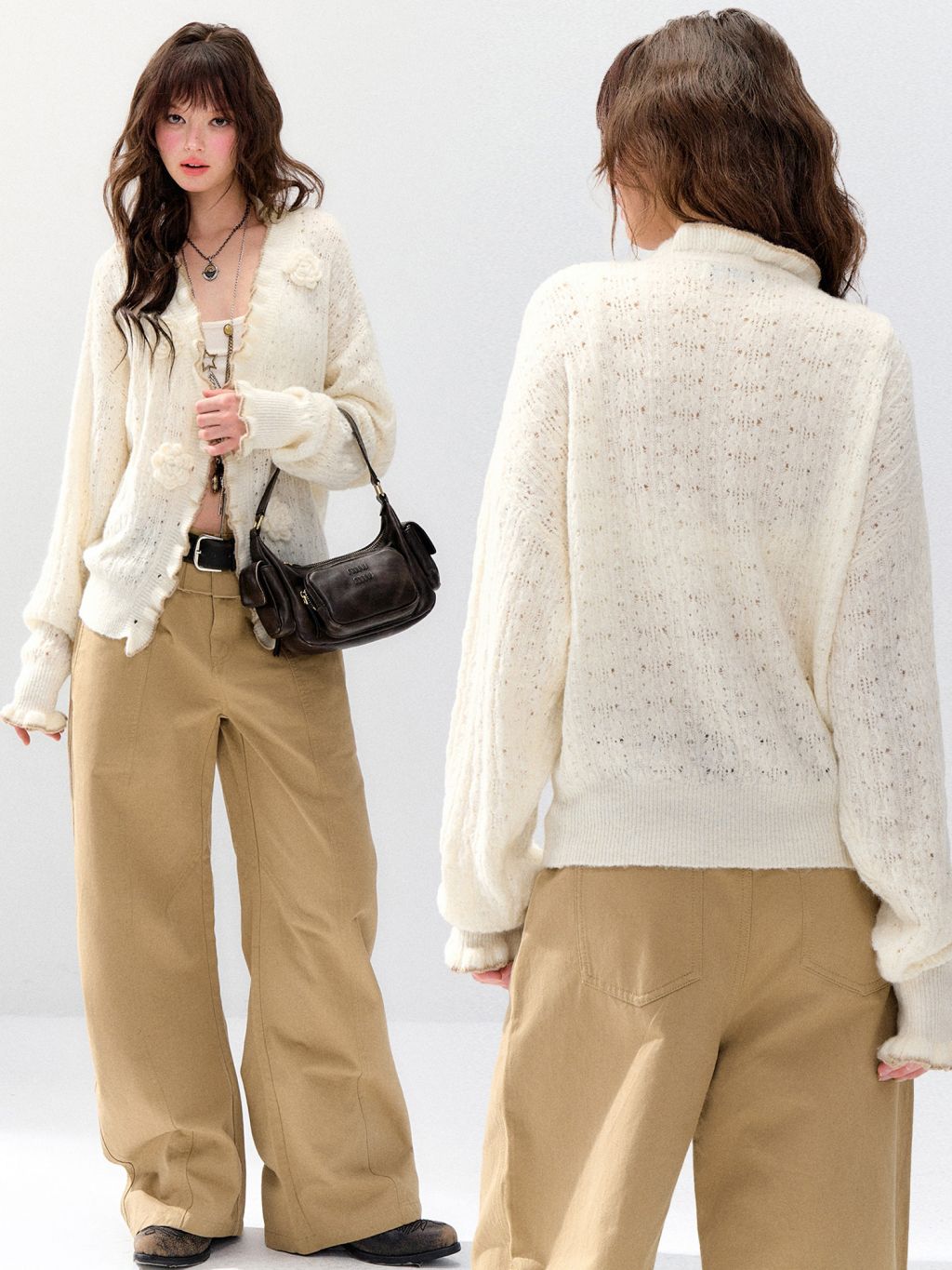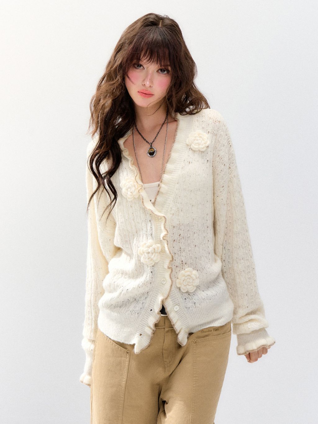 보송한 헤어리 텍스처의 아이보리 니트에 오픈워크 짜임과 프릴 레이스 엣지를 더해, 걸치는 순간 빈티지 스윗 무드가 완성되는 가디건이에요. 입체 플라워 포인트와 진주 버튼 디테일이 러블리한 포인트가 됩니다.