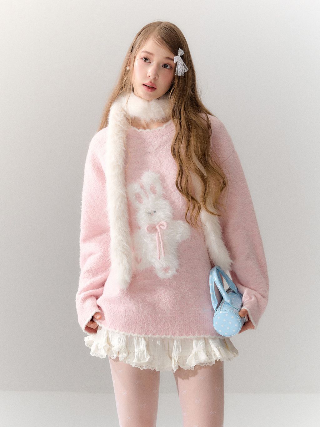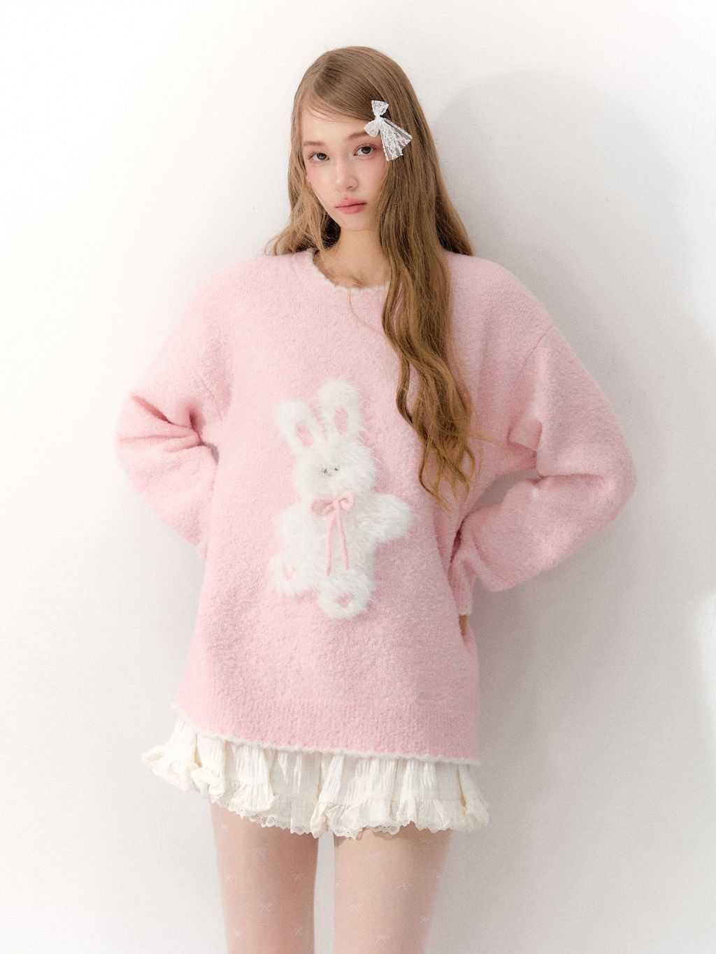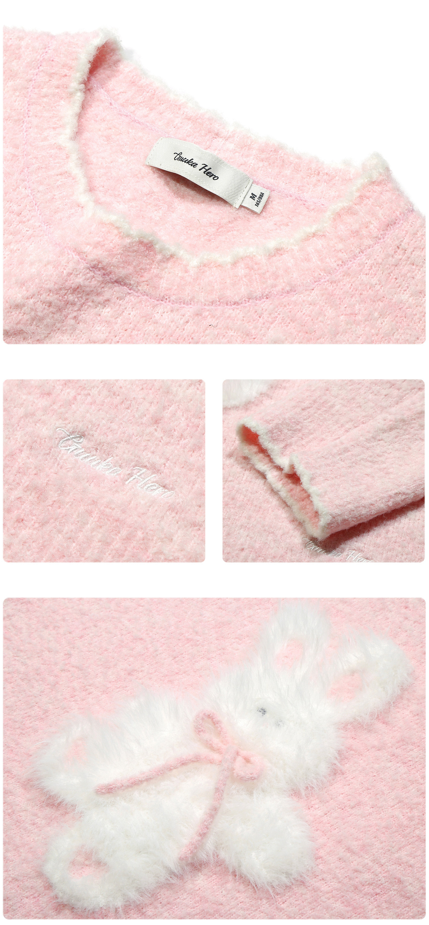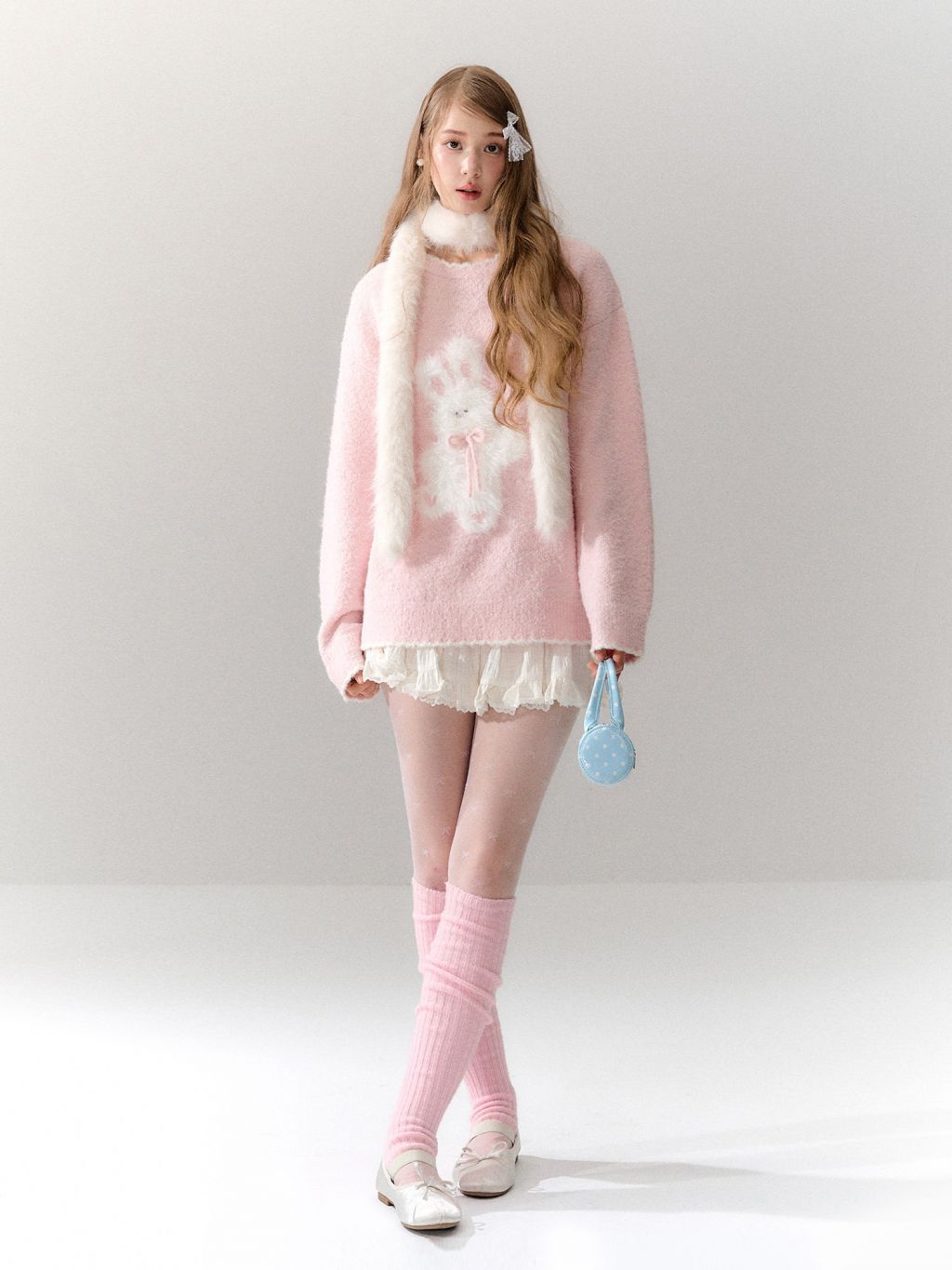 파우더 핑크 퍼지 니트 위에 복슬복슬 토끼 아플리케 + 리본 디테일이 올라가, 한 벌만으로도 ‘달달한 겨울 무드’가 완성되는 스웨터입니다. 여유 있는 핏에 넥·소매·밑단 프릴 라이닝이 더해져 더 귀엽고 사랑스럽게 떨어집니다.