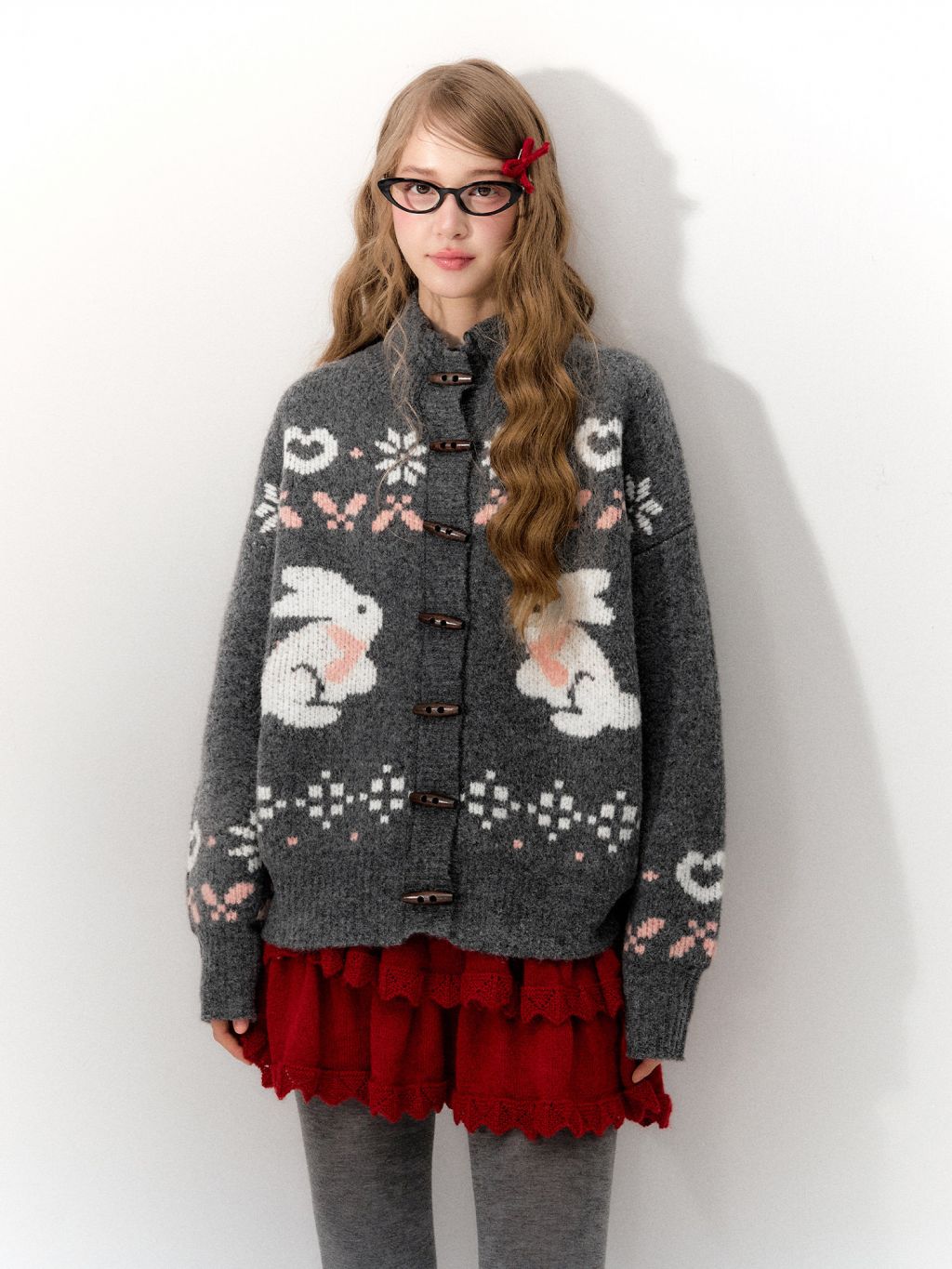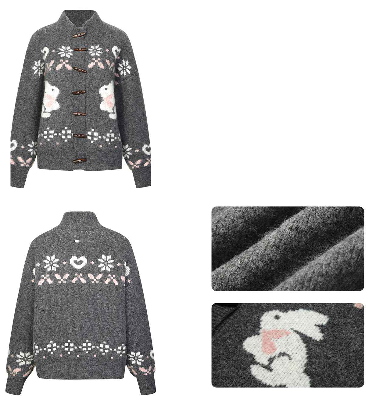 토끼 페어아일 패턴에 토글 버튼을 더해, 걸치기만 해도 클래식한 영국 무드가 살아나는 니트 가디건 입니다. 하프 하이넥 + 드롭 숄더 루즈핏이라 목까지 따뜻하고 실루엣은 자연스럽게 여리해 보여요.